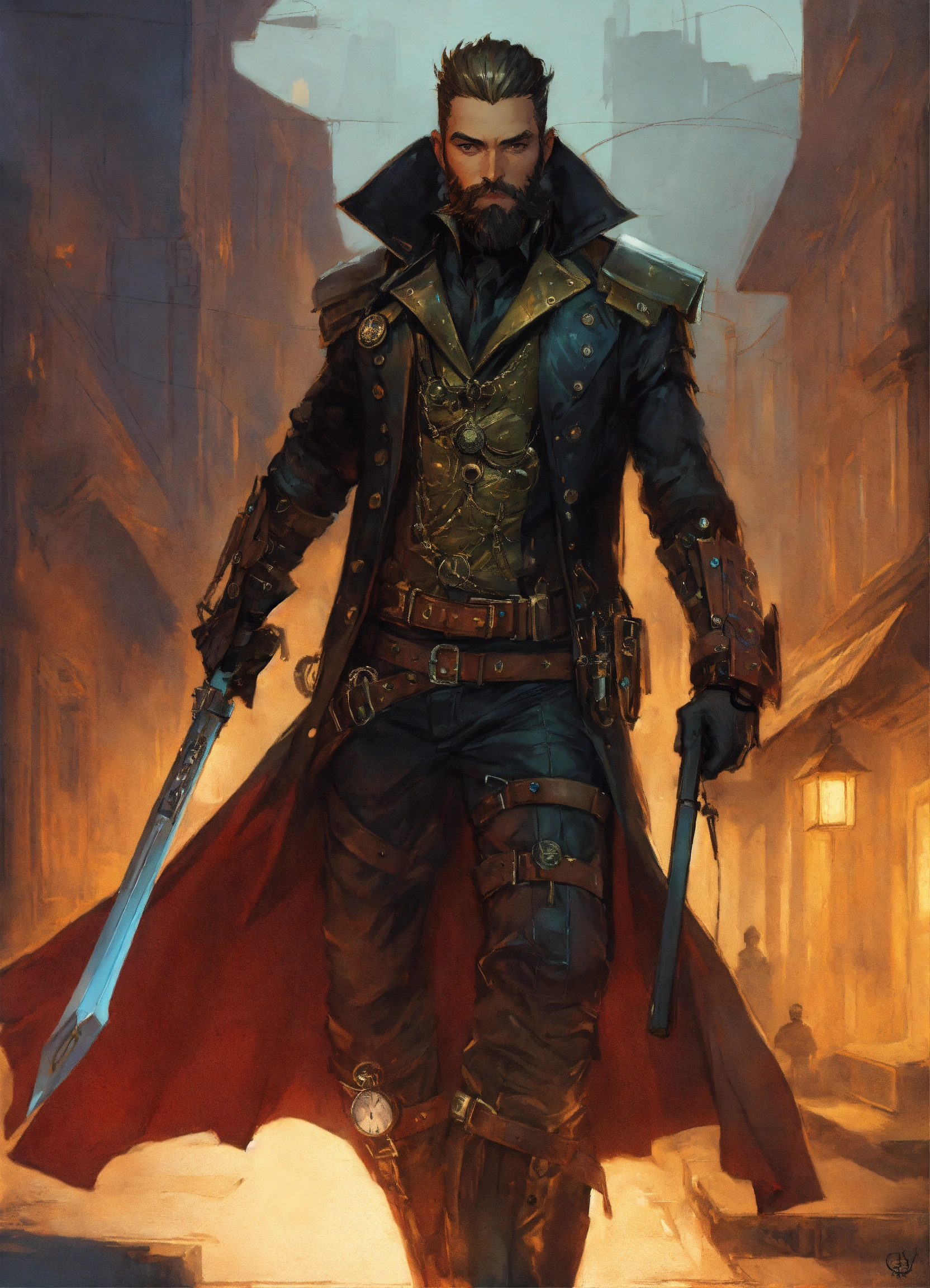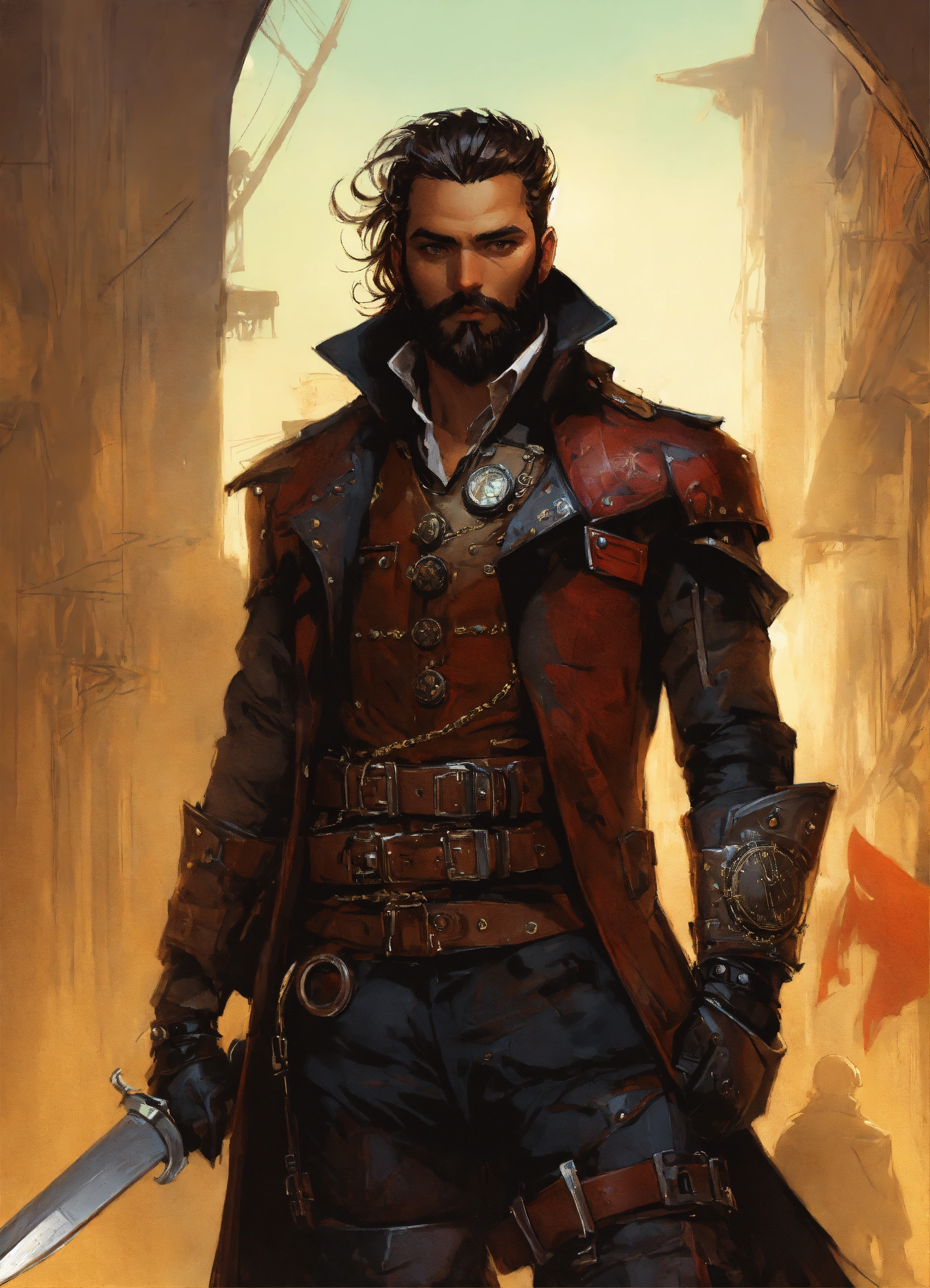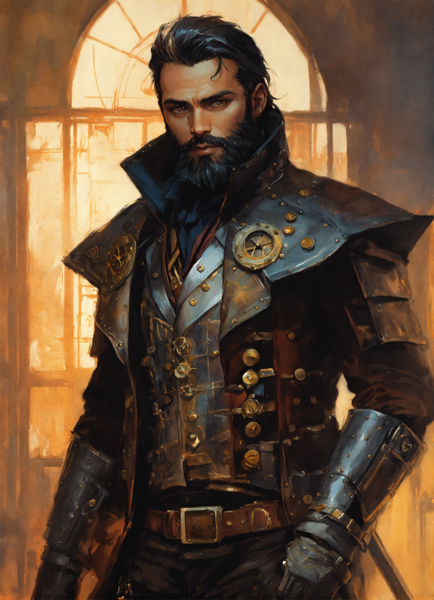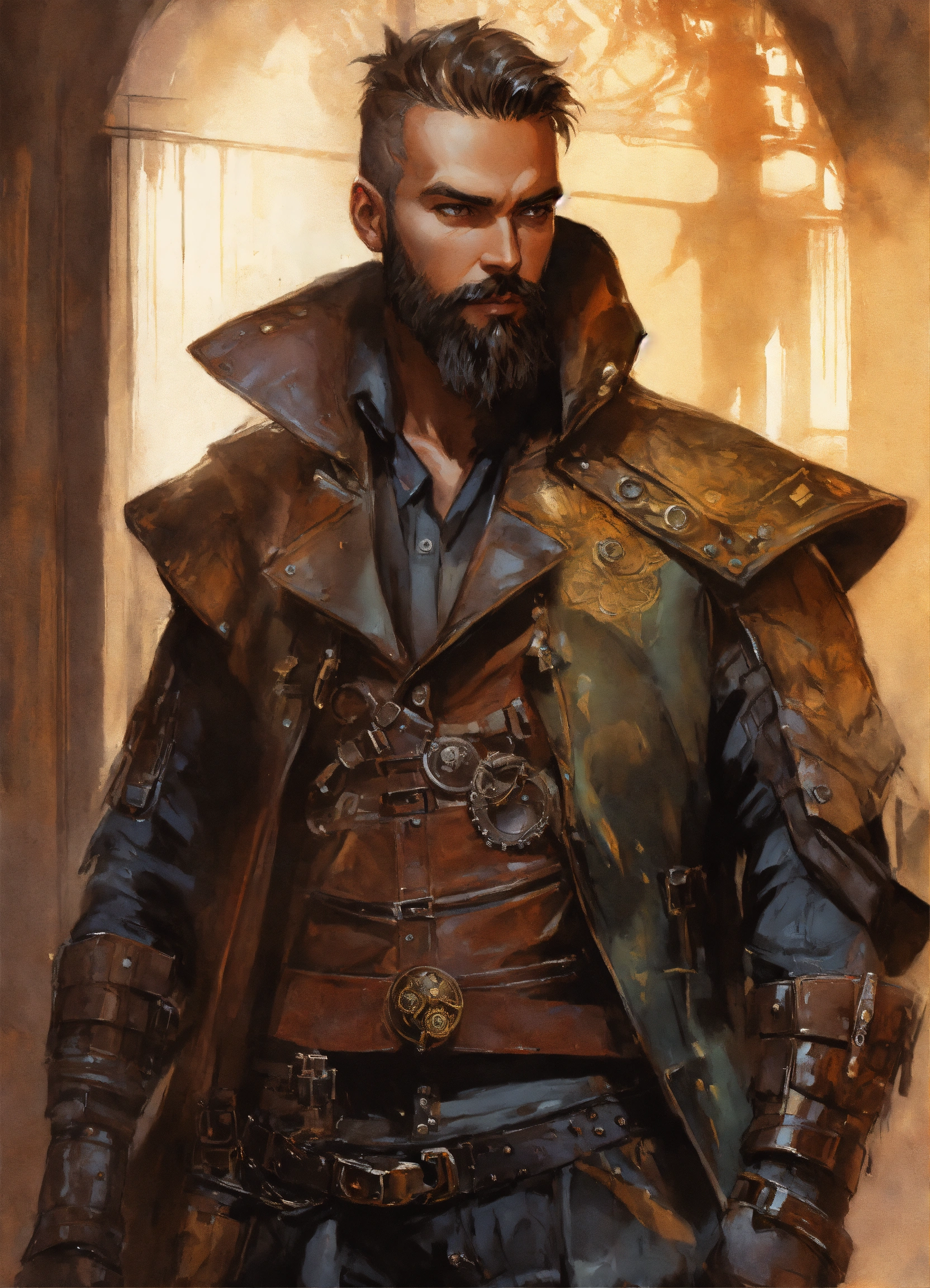 Male steampunk vampire bounty hunter wearing studded leather armor with a full beard, comic style, by artgerm, guy denning, jakub rozalski, magali villeneuve and charlie bowater