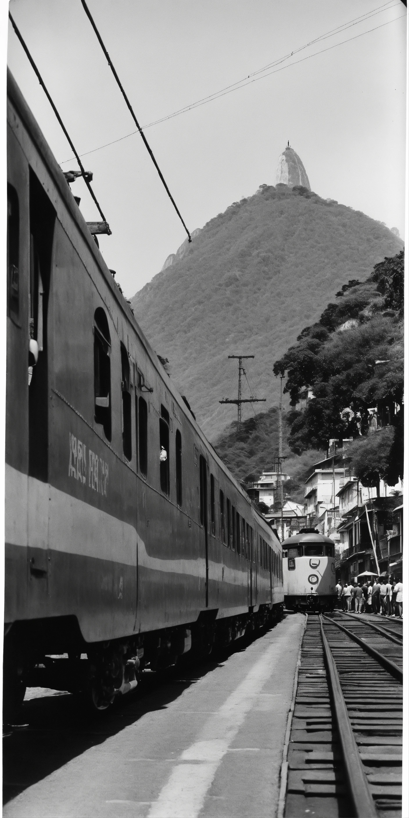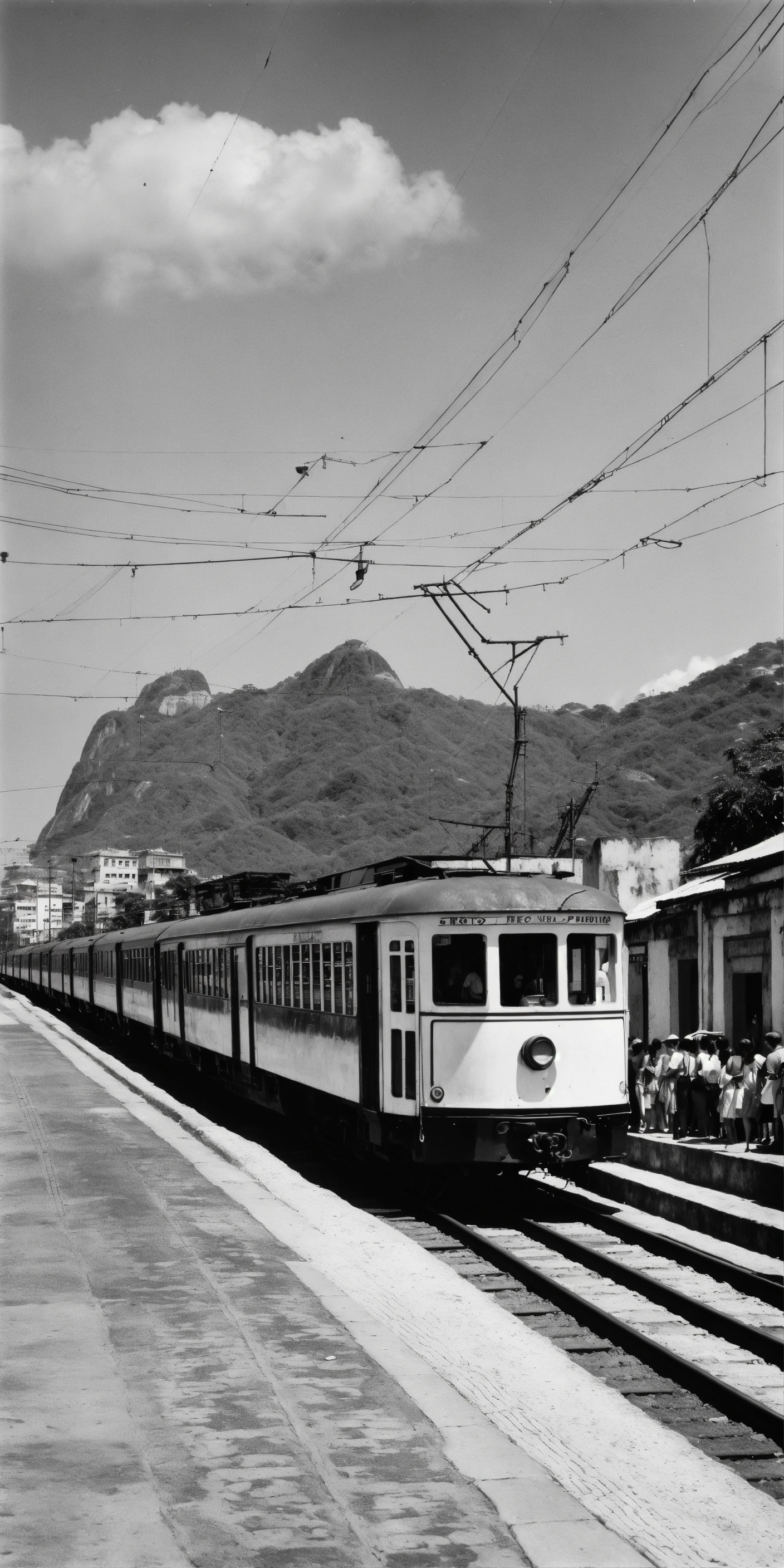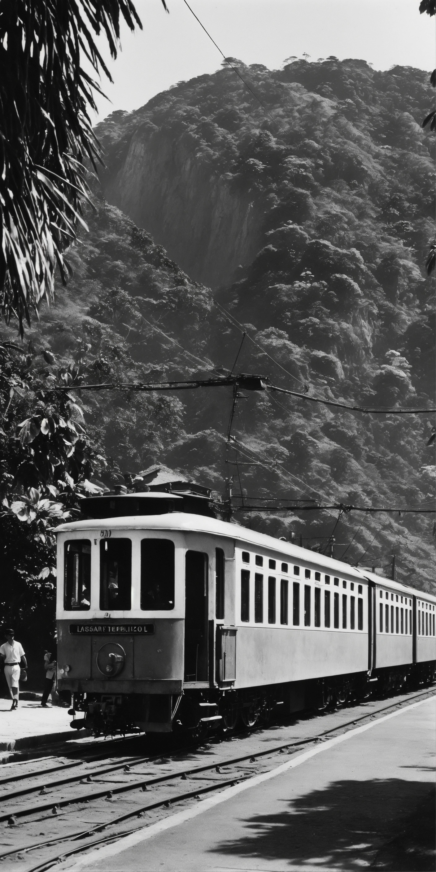 Photograph of rio de janeiro in ancient brazil, high quality black and white photography, 50s, santa tereza train