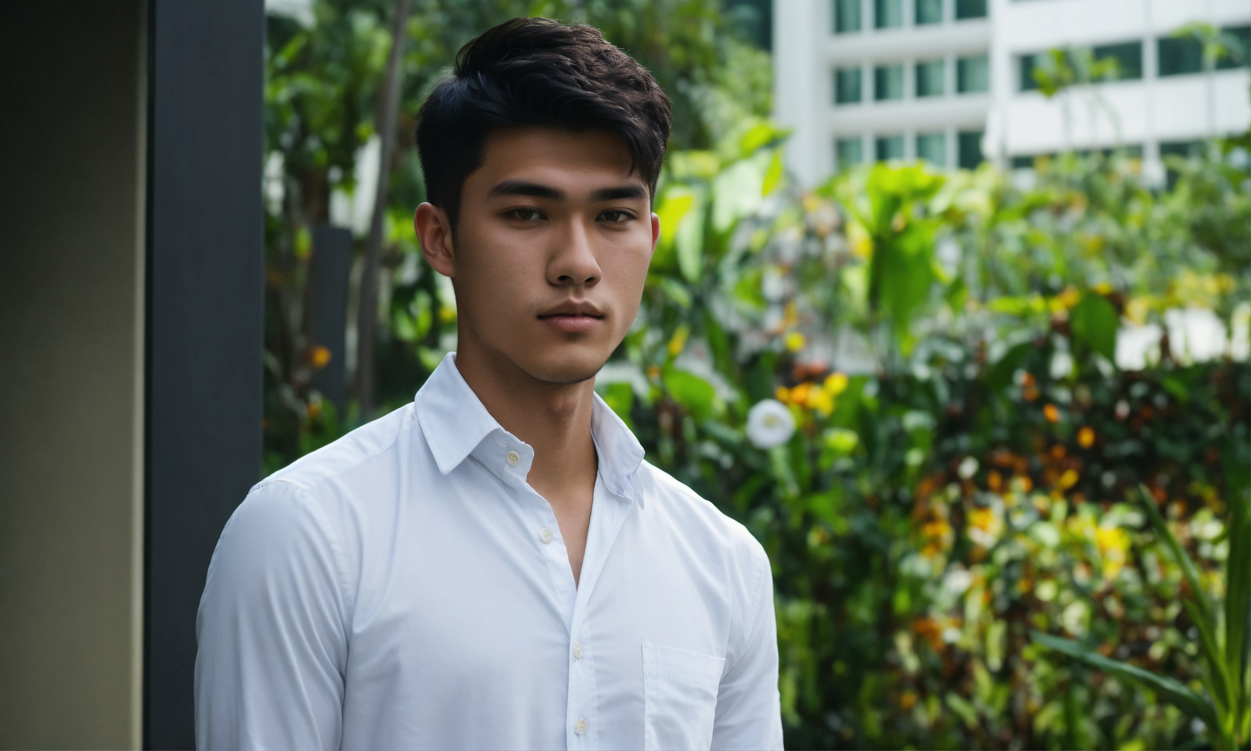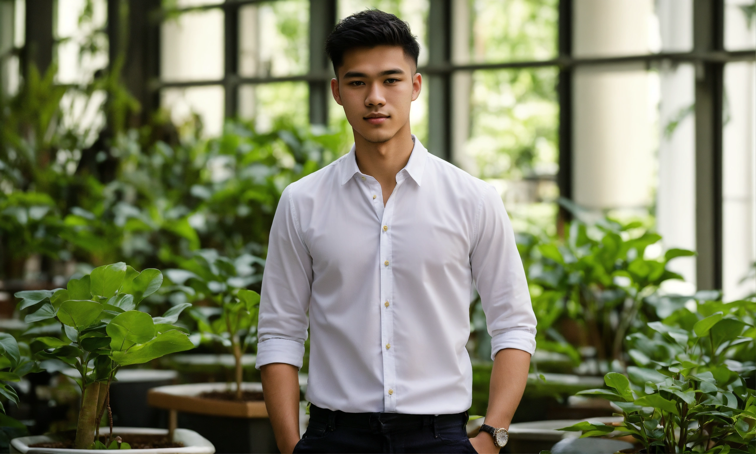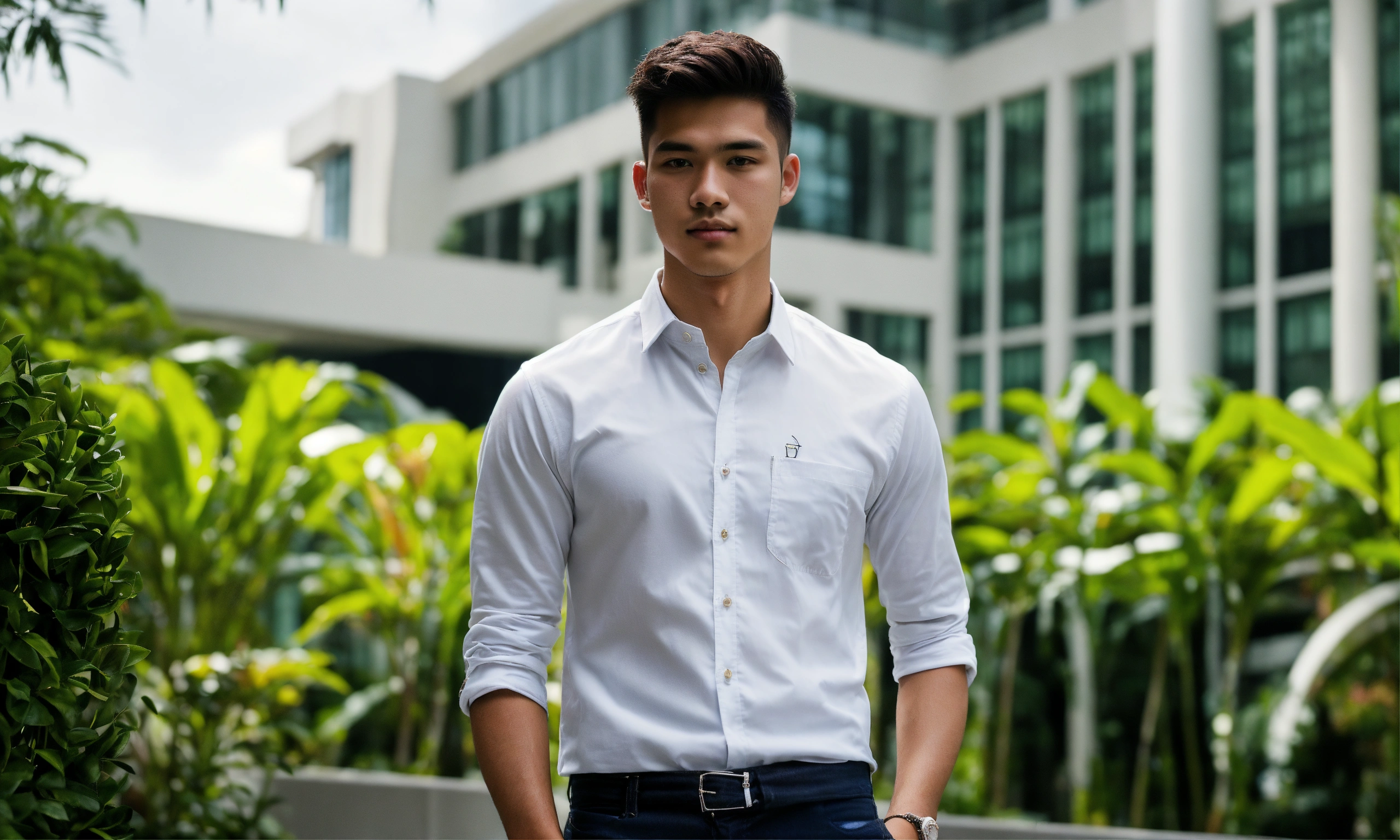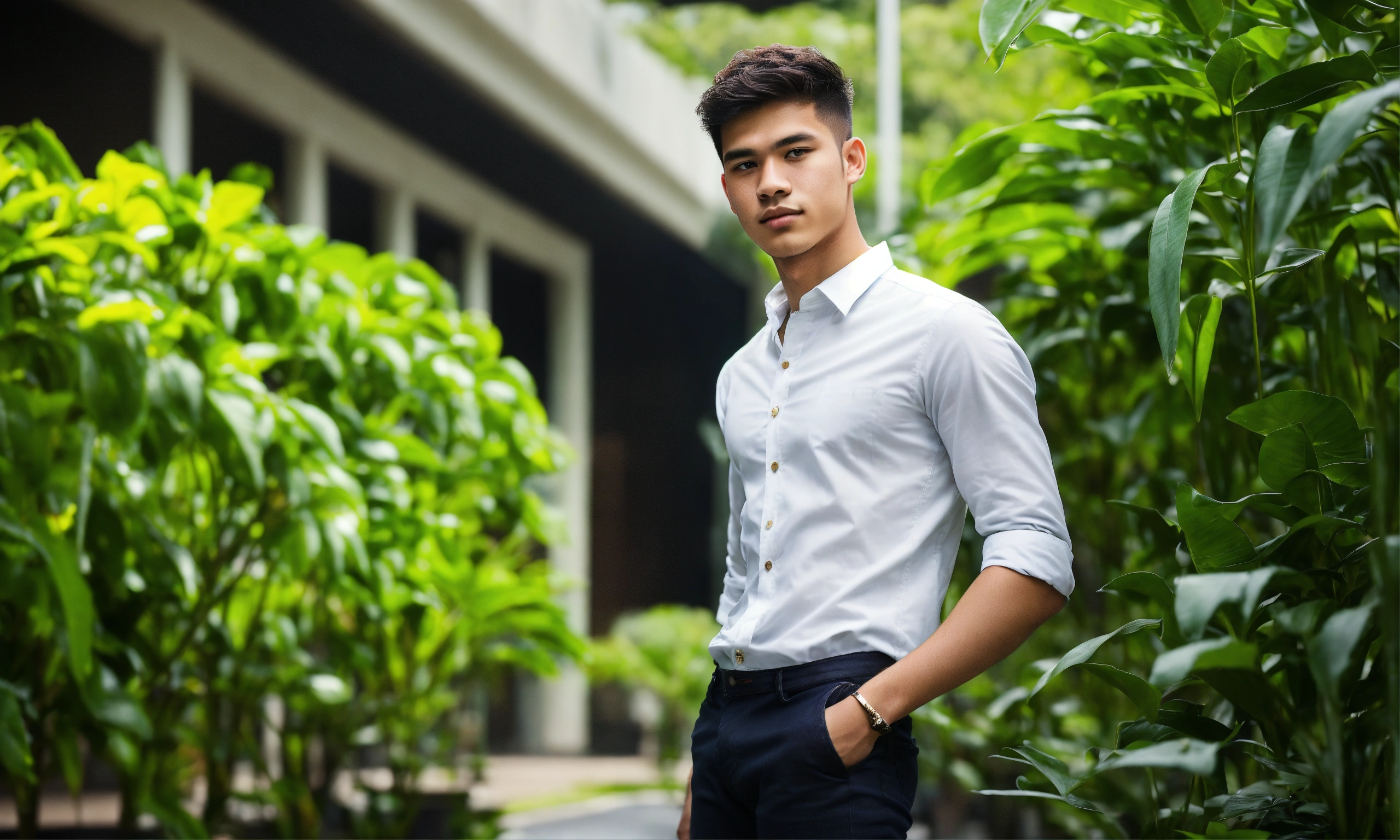A 21 year old handsome man, in a long white button down shirt, sleeves slightly rolled up, black jeans, against the background of singapore management university and plants as the background, cleaning his hands