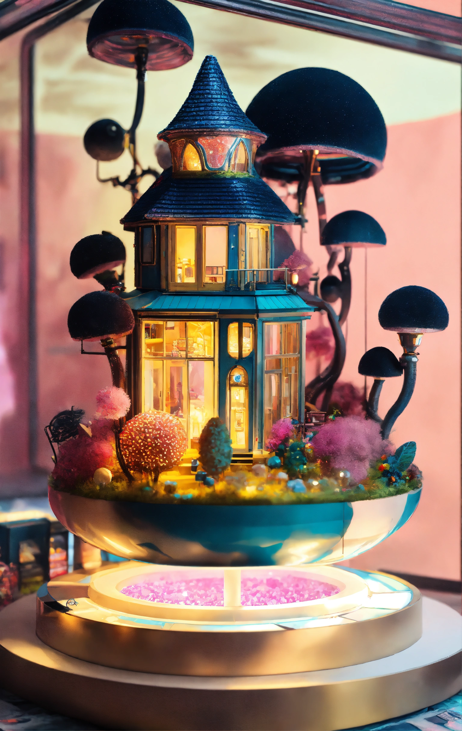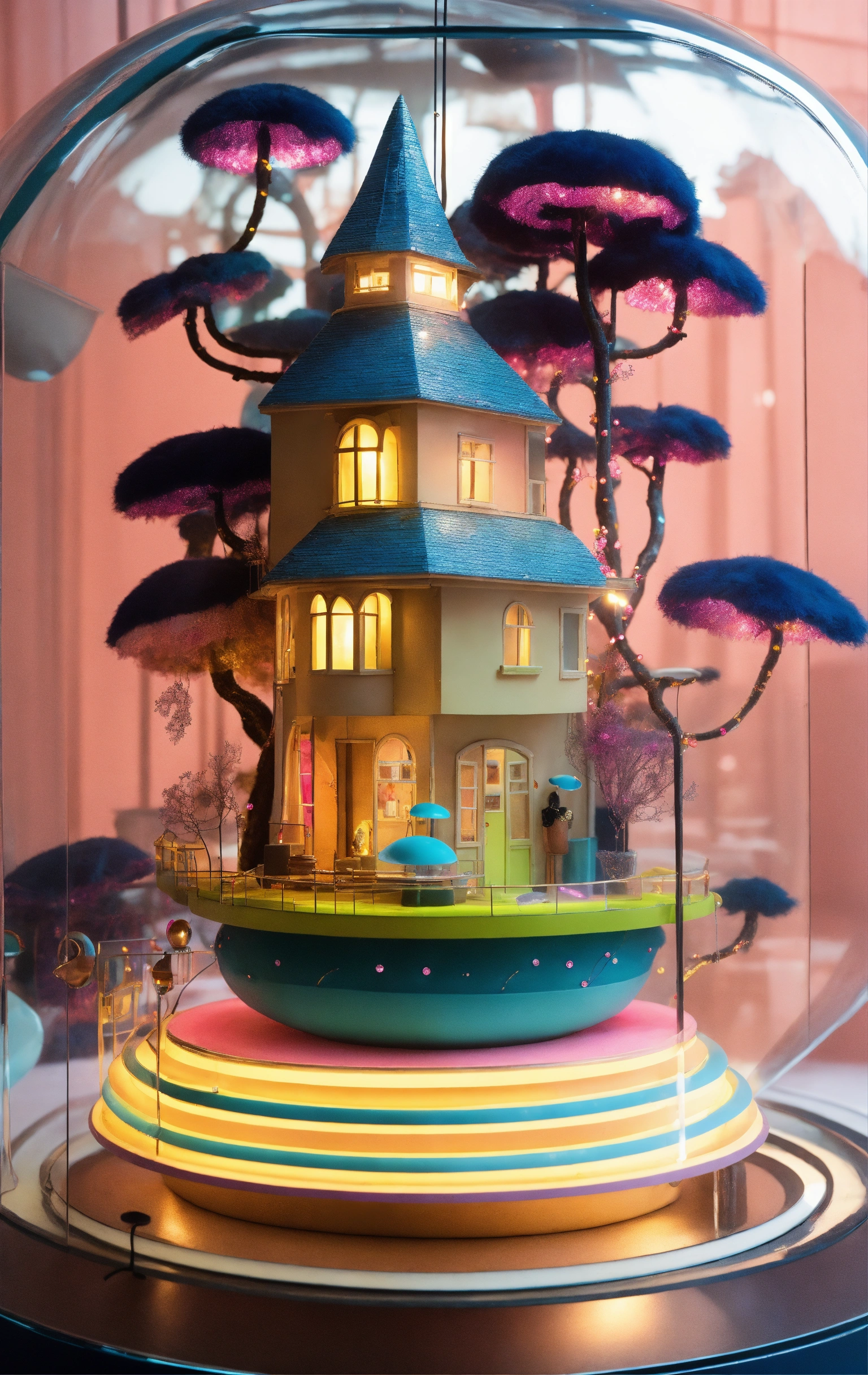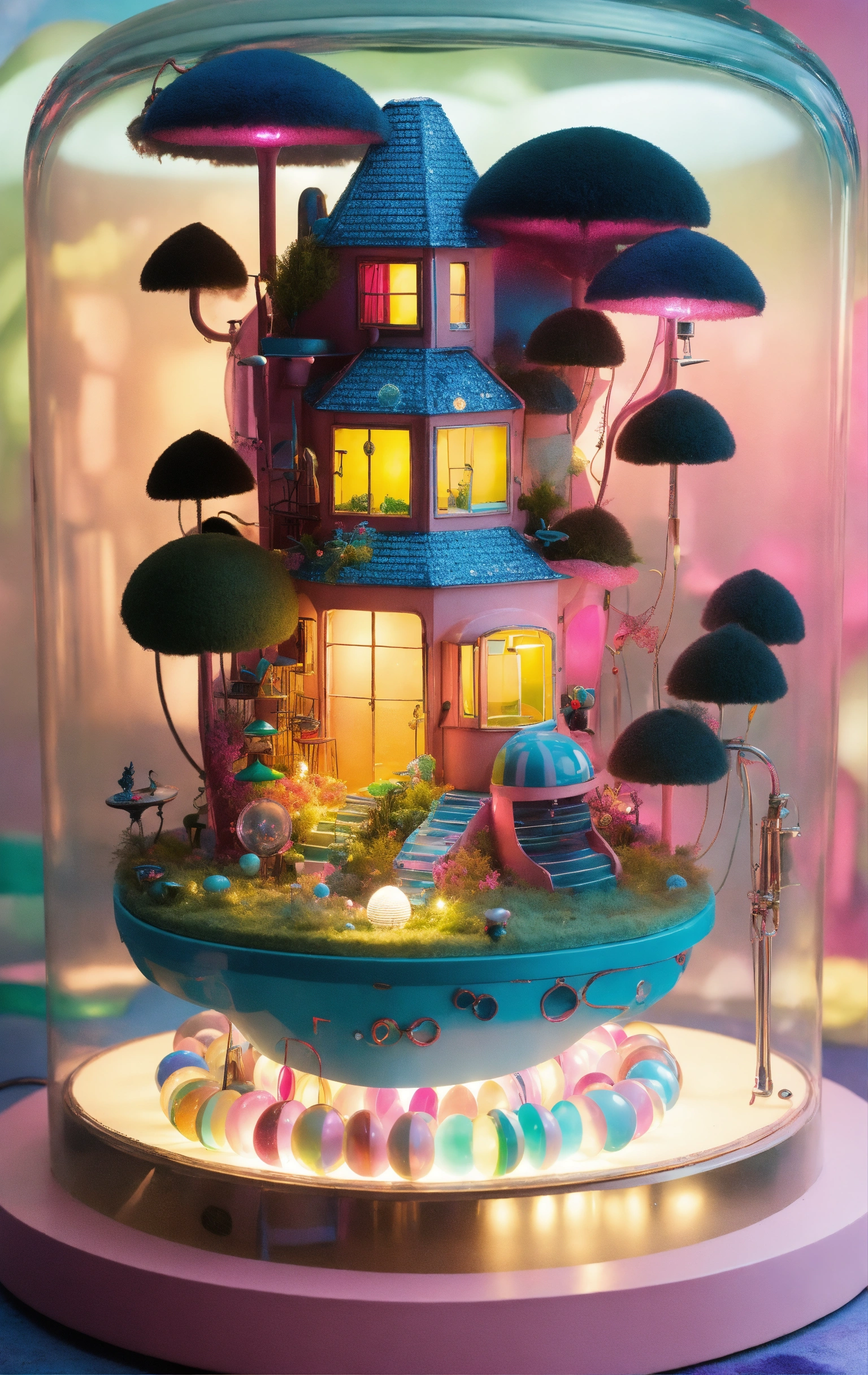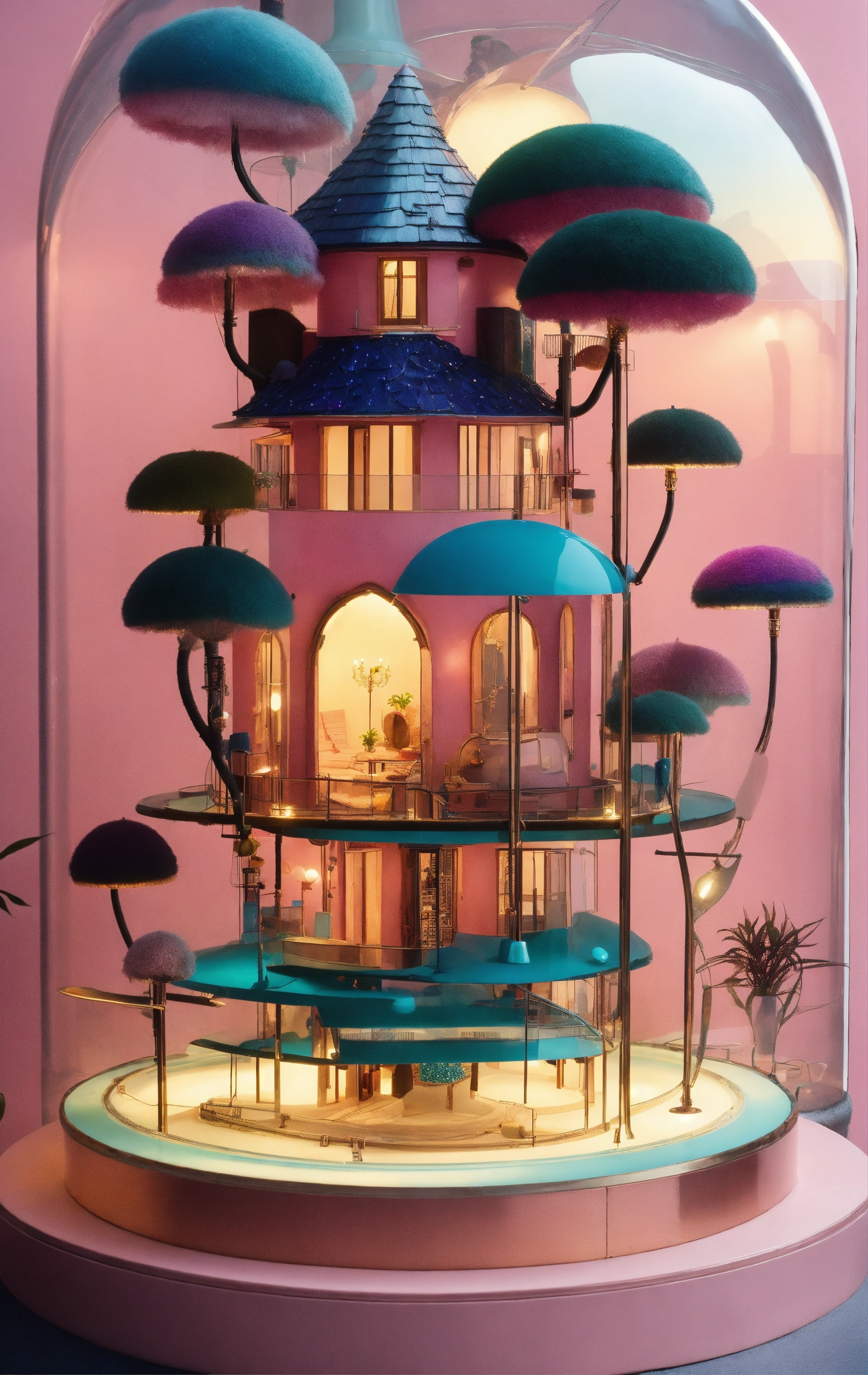 Maison conçue par tim burton, collection, inspiration. rendu moteur 8k, bel éclairage futuriste, maison sous dôme verre, laine cardée, strass colorés, fourrure, lampe bleue, led pink, socle plusieurs étages