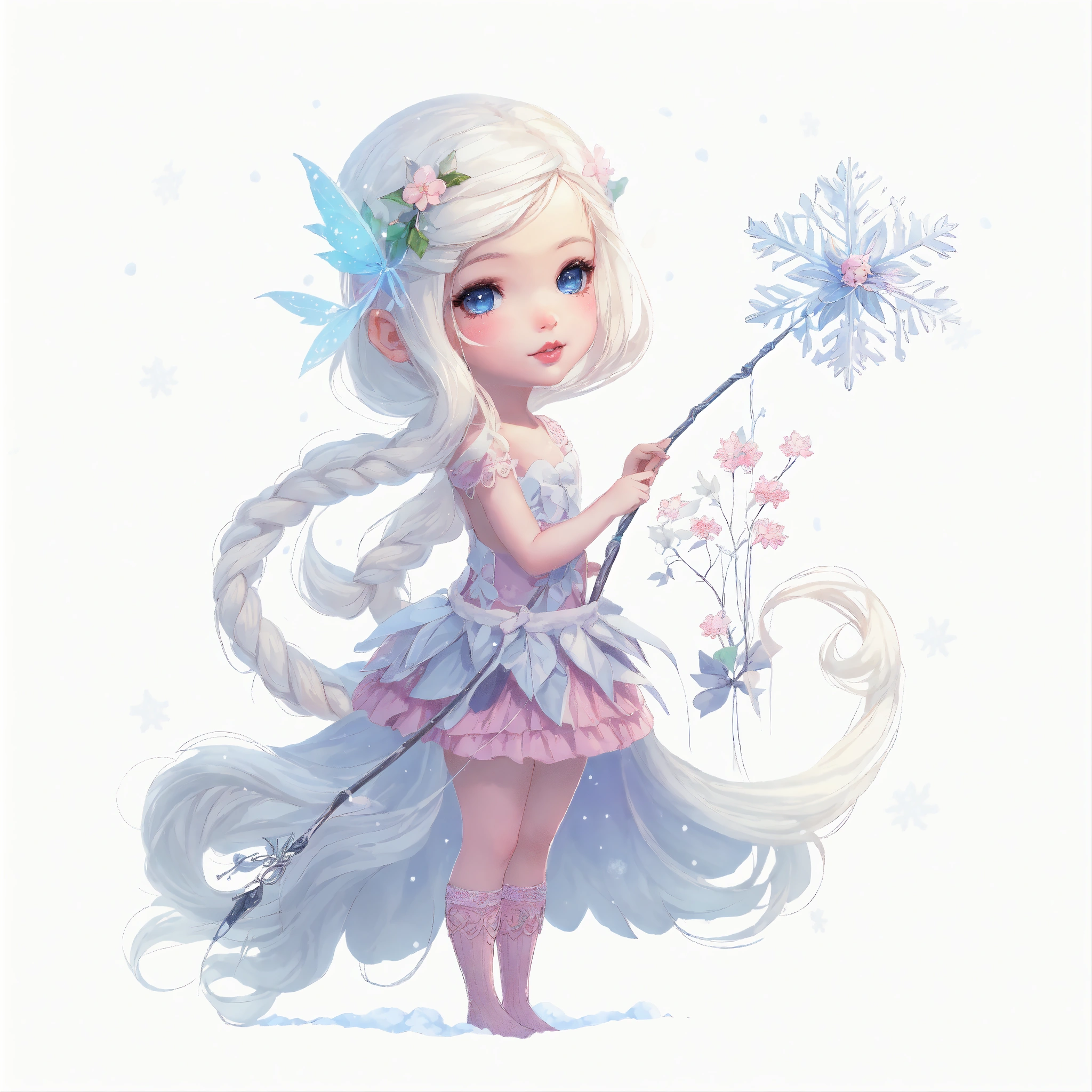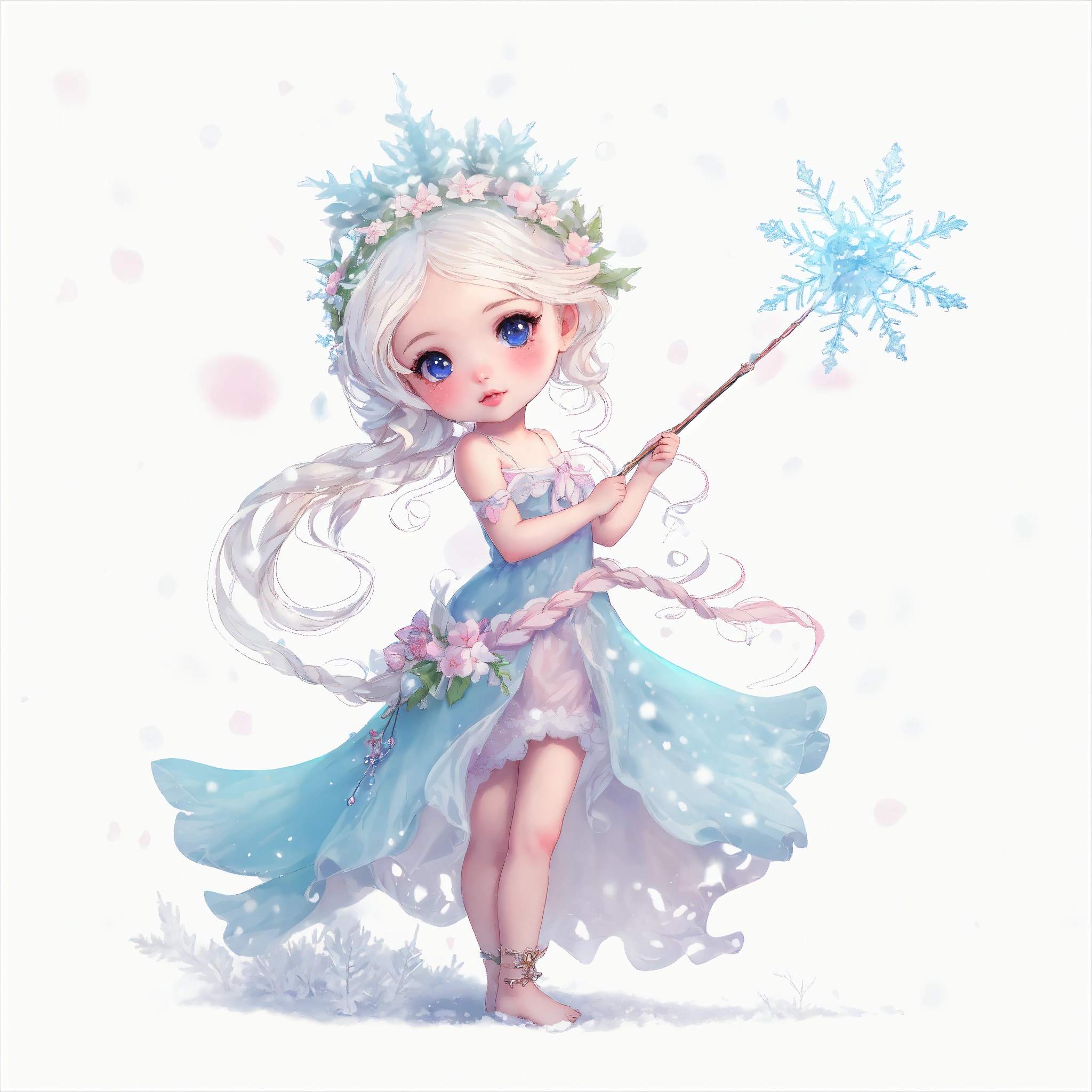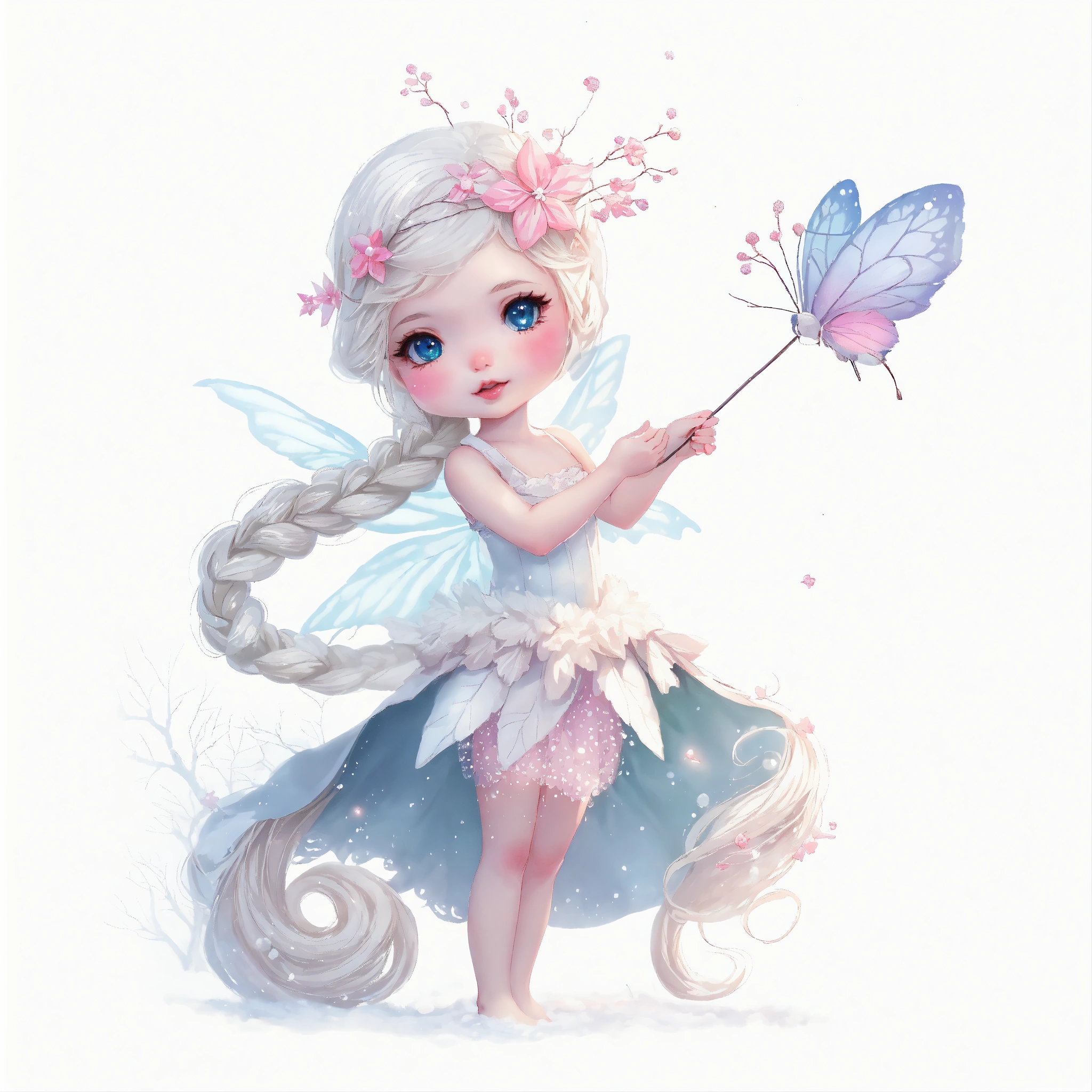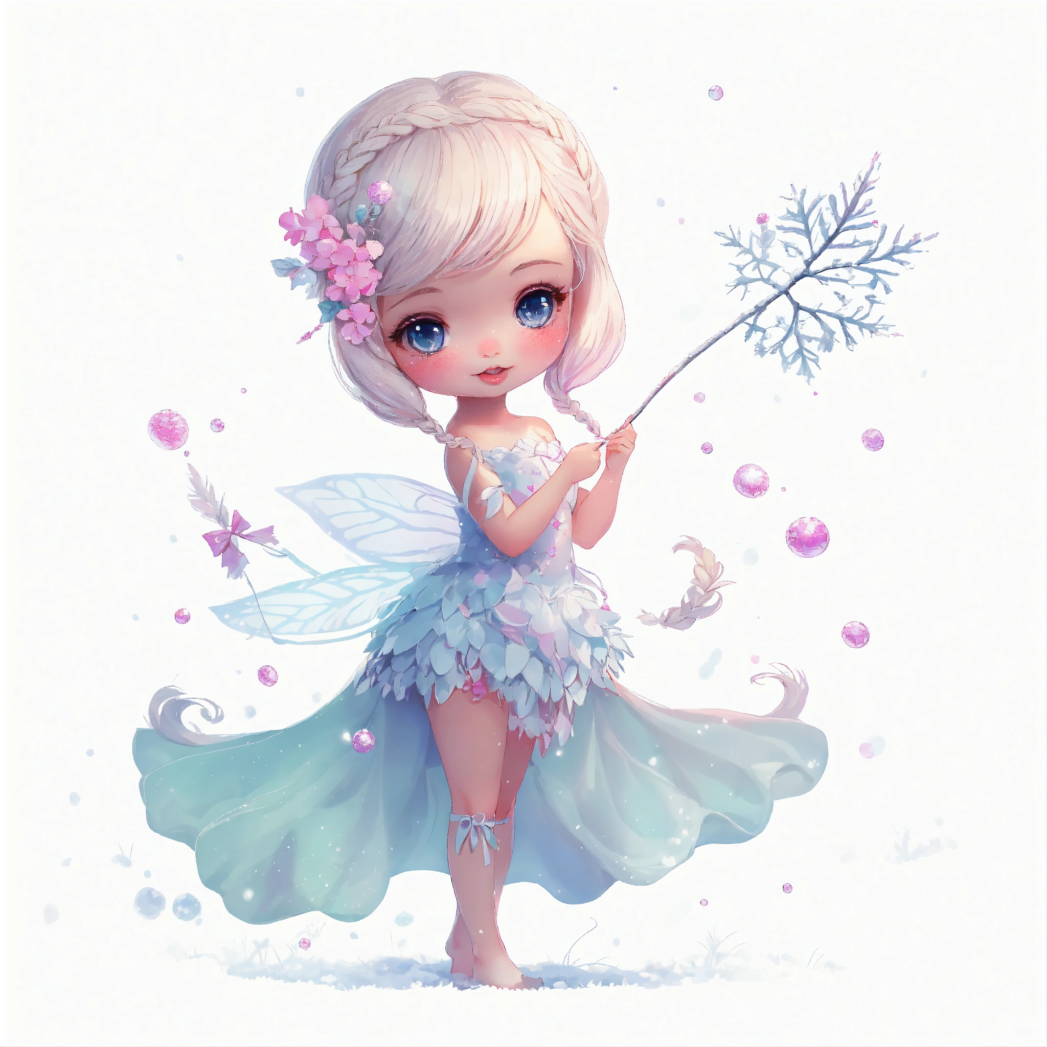 Full body of a realistic sweetness baby chibi snow fairy girl winter freckled two braids in her long white blonde hair she is playing in a enchanted winter magic garden, clipart digital art style, pink colors, very detailed, by stanley artgerm and tom bagshaw, 32k