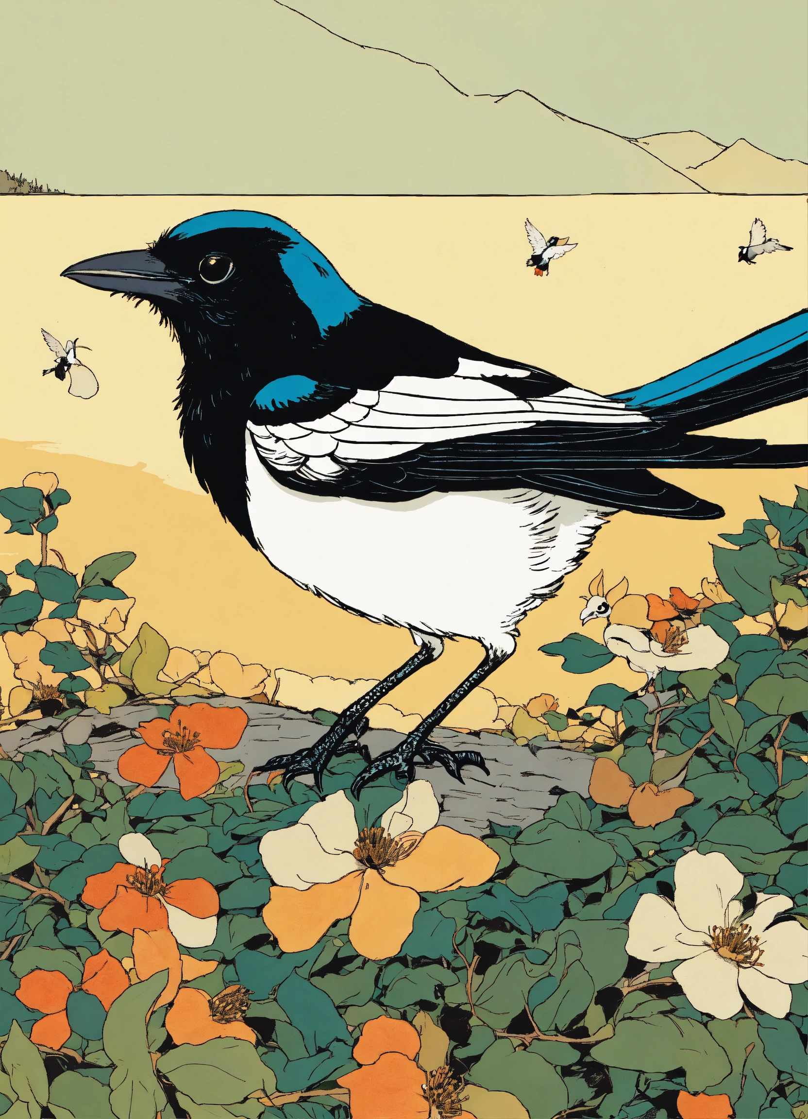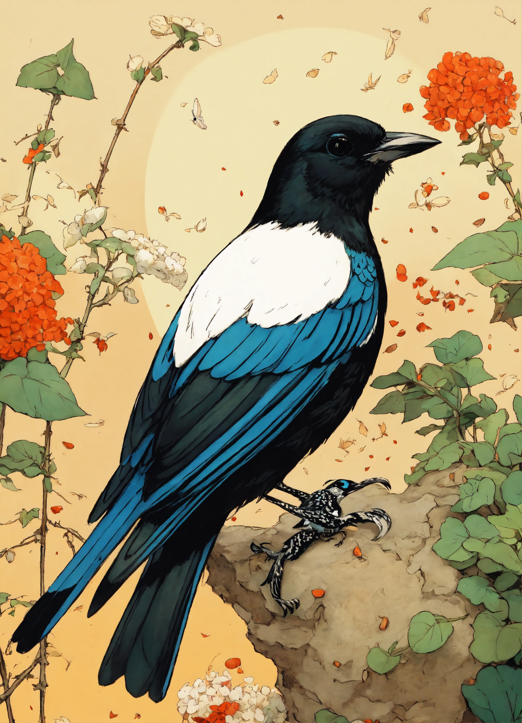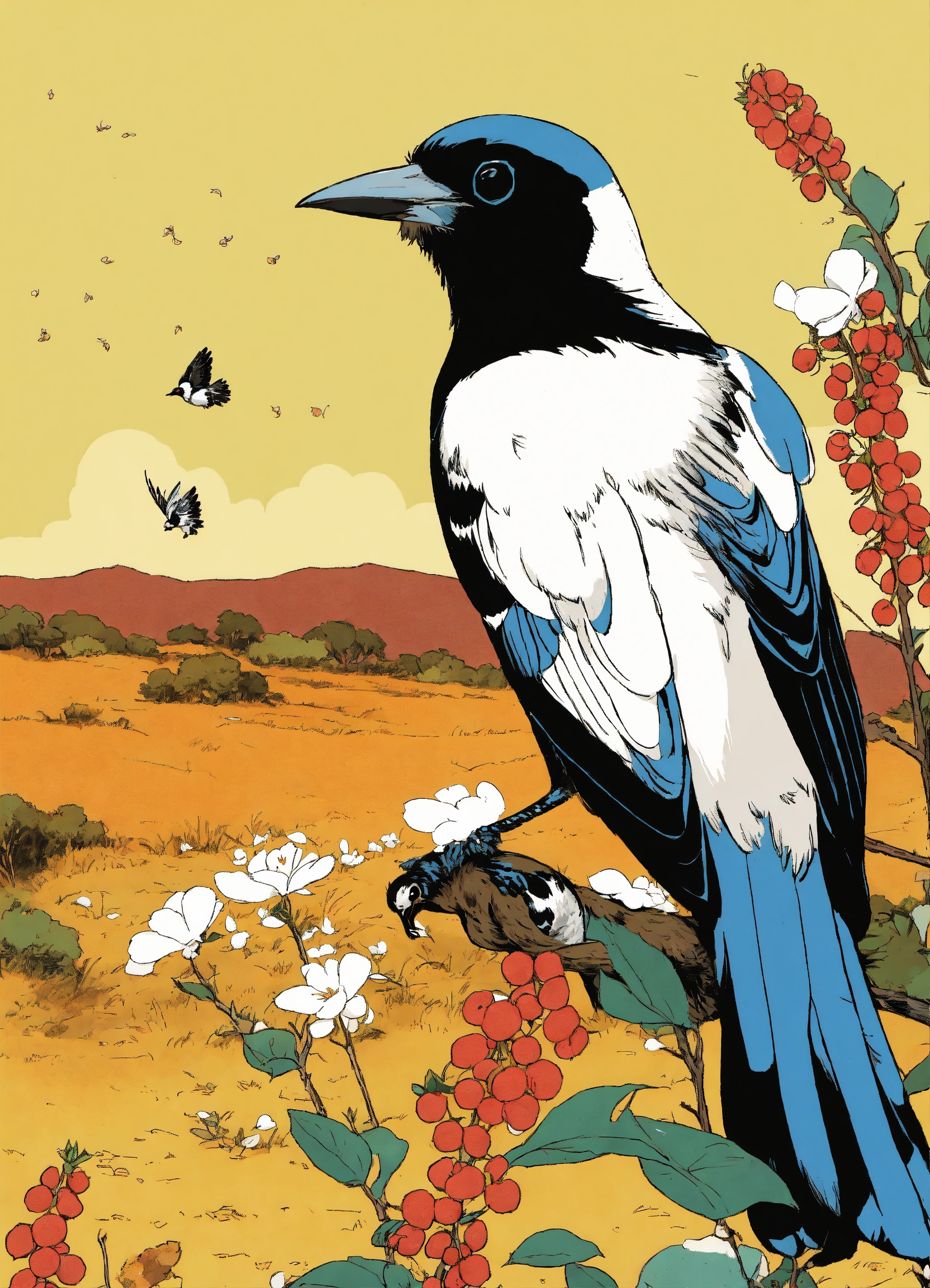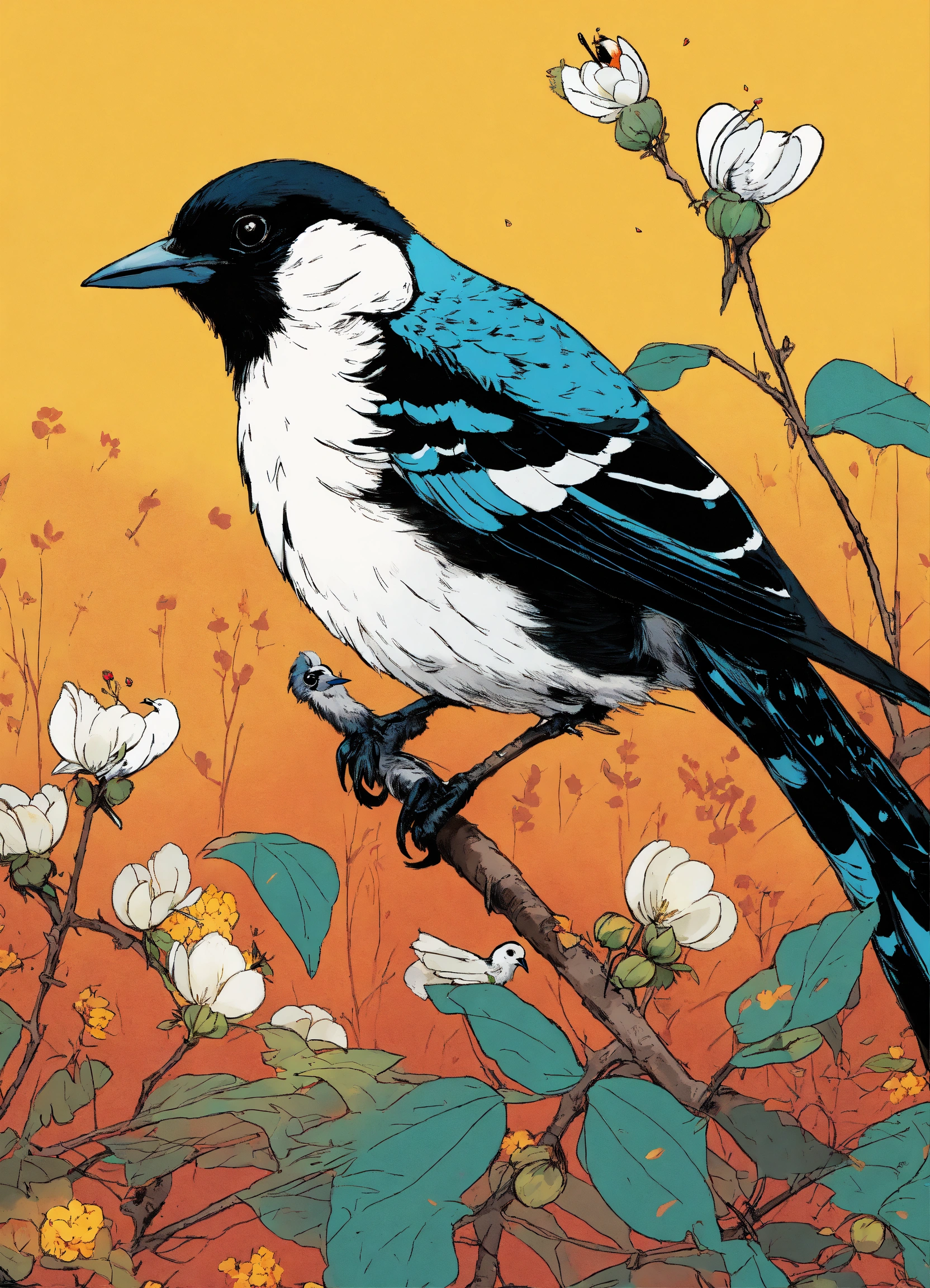 A cute white with black magpie eating seeds, illustration by hergé, stunning color scheme, masterpiece, manga style