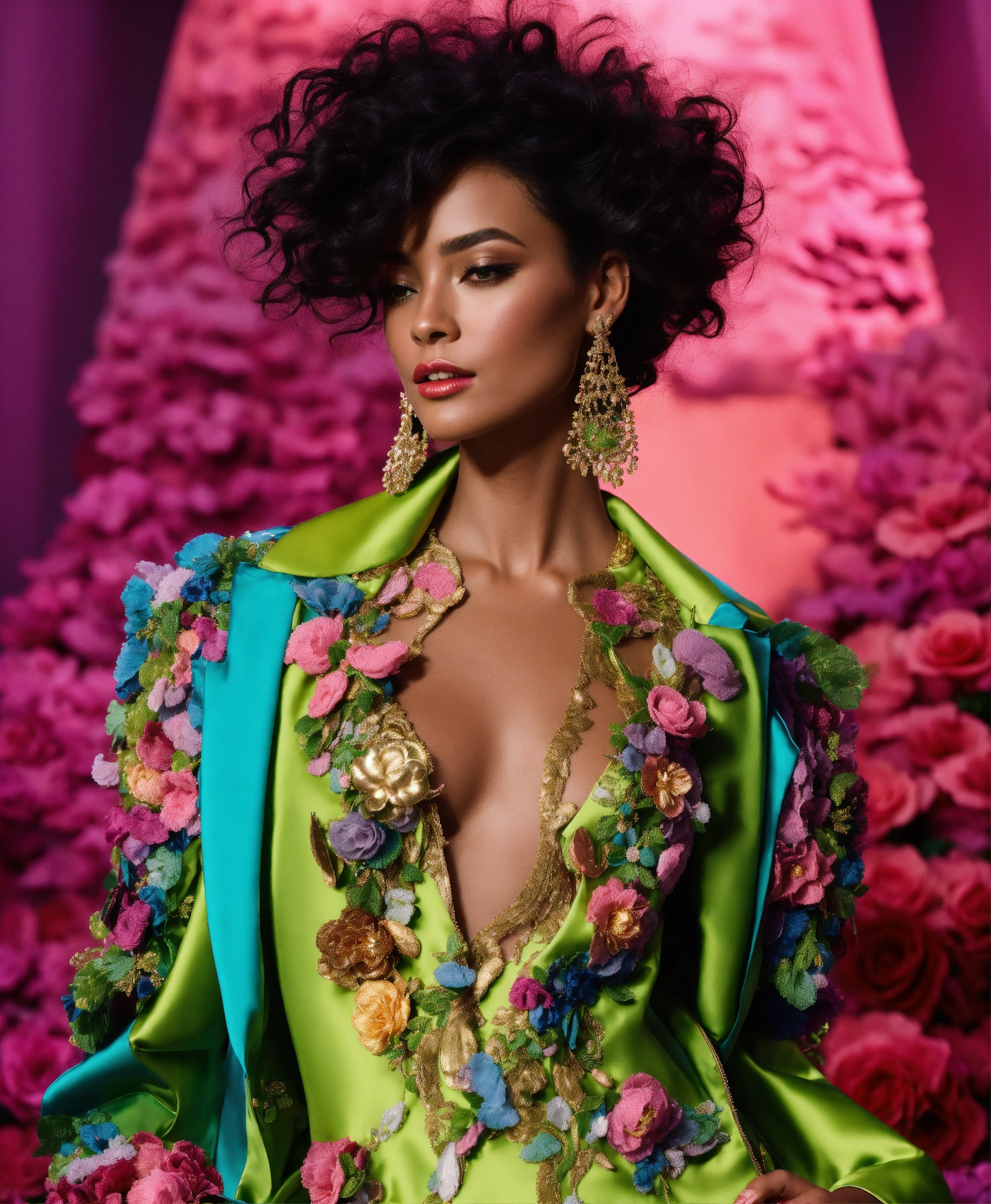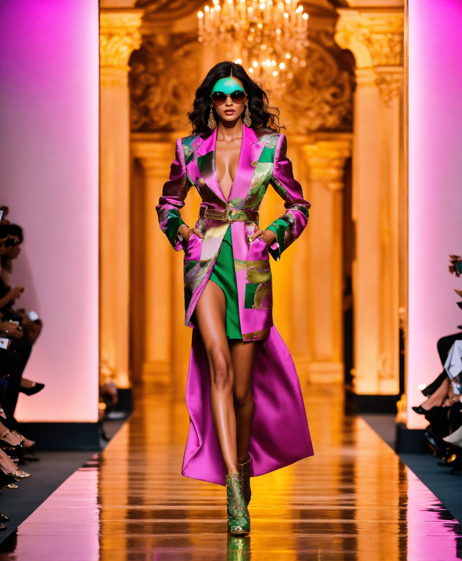 Ultra realistic full body photo of a stylish beautiful elegant european supermodel voluminous wavy hair walking the runway modeling summer cruise designer wear brave, paris versailles details cutouts and gold geometric pattern floral structured tailored jacket pink gold green lilac peridot silver magenta lime fuchsia yellow blue black gray copper mauve bronze haute couture embroidered contrasting colors vivid intricate bold vibrant glamorous ultimate elegance beautiful luxurious awesome wealthy opulent exquisite resplendent sheen magnificent sublime 12k