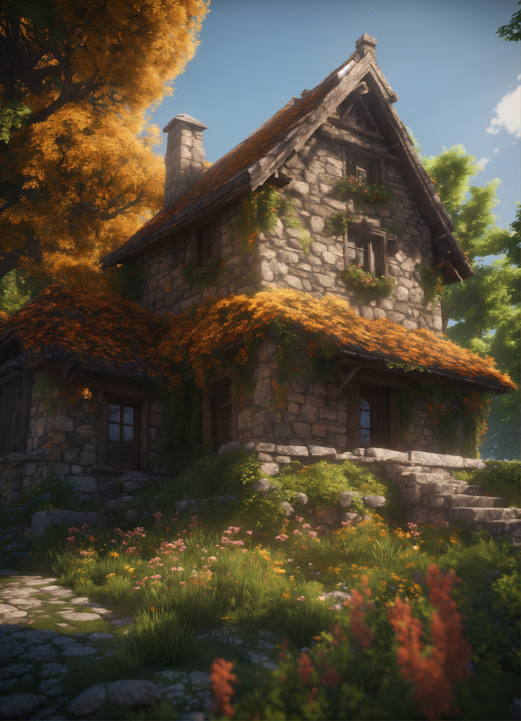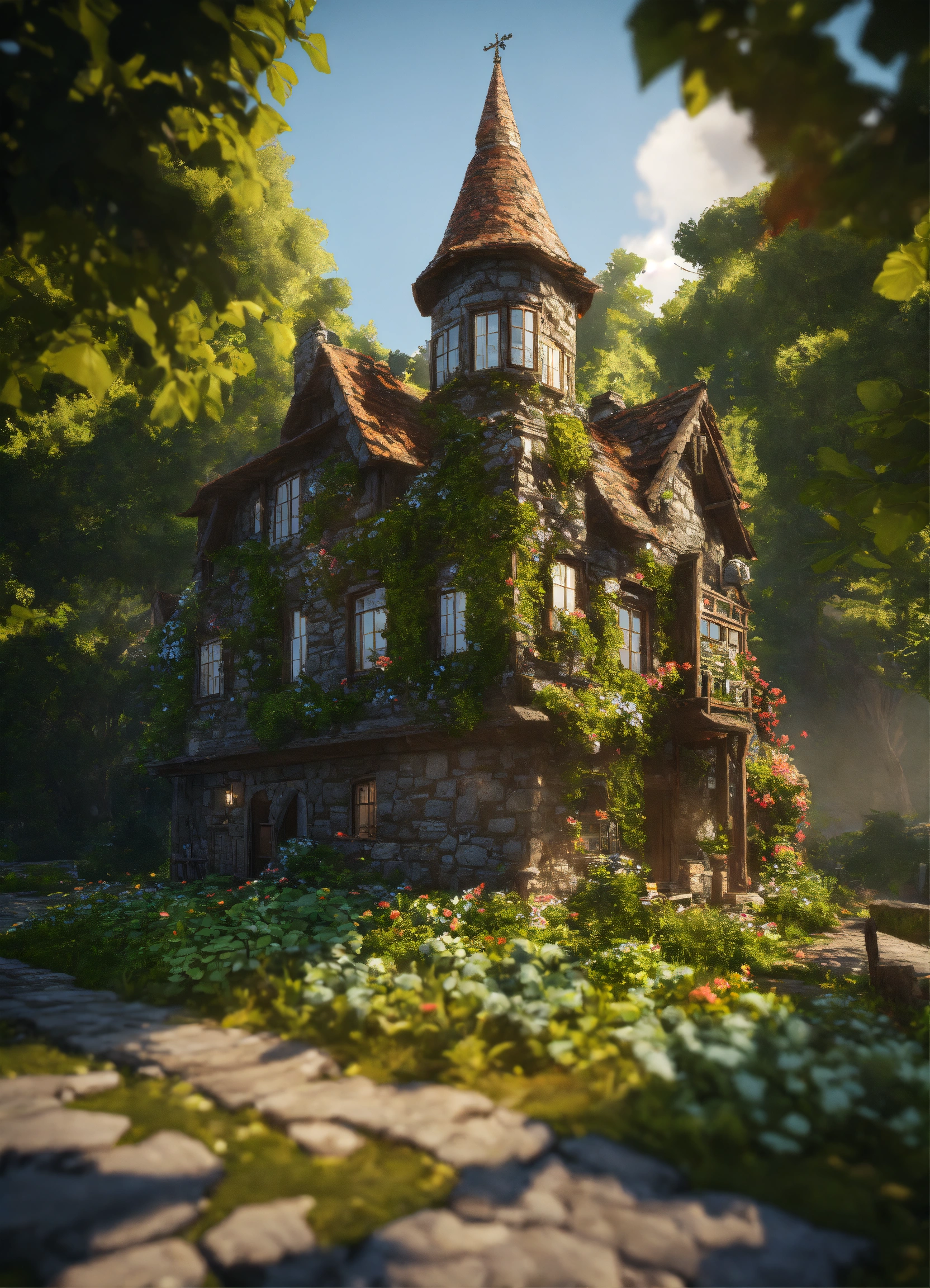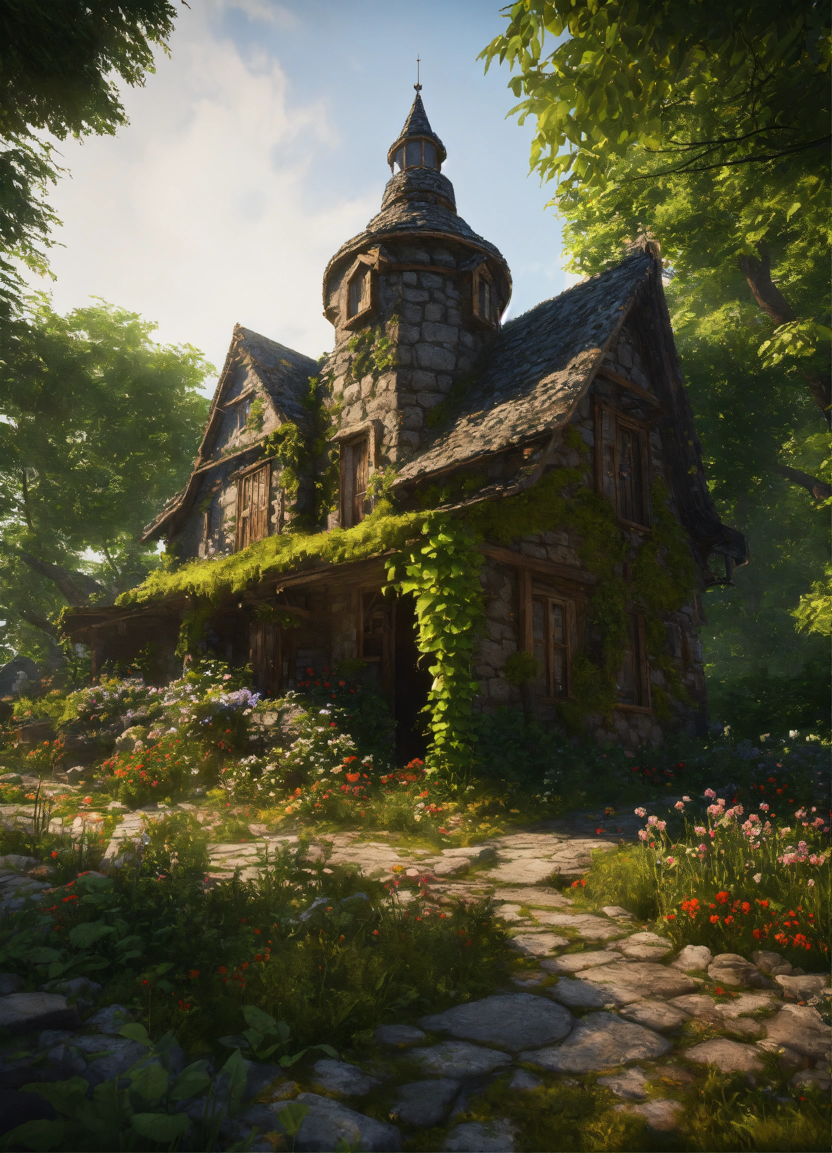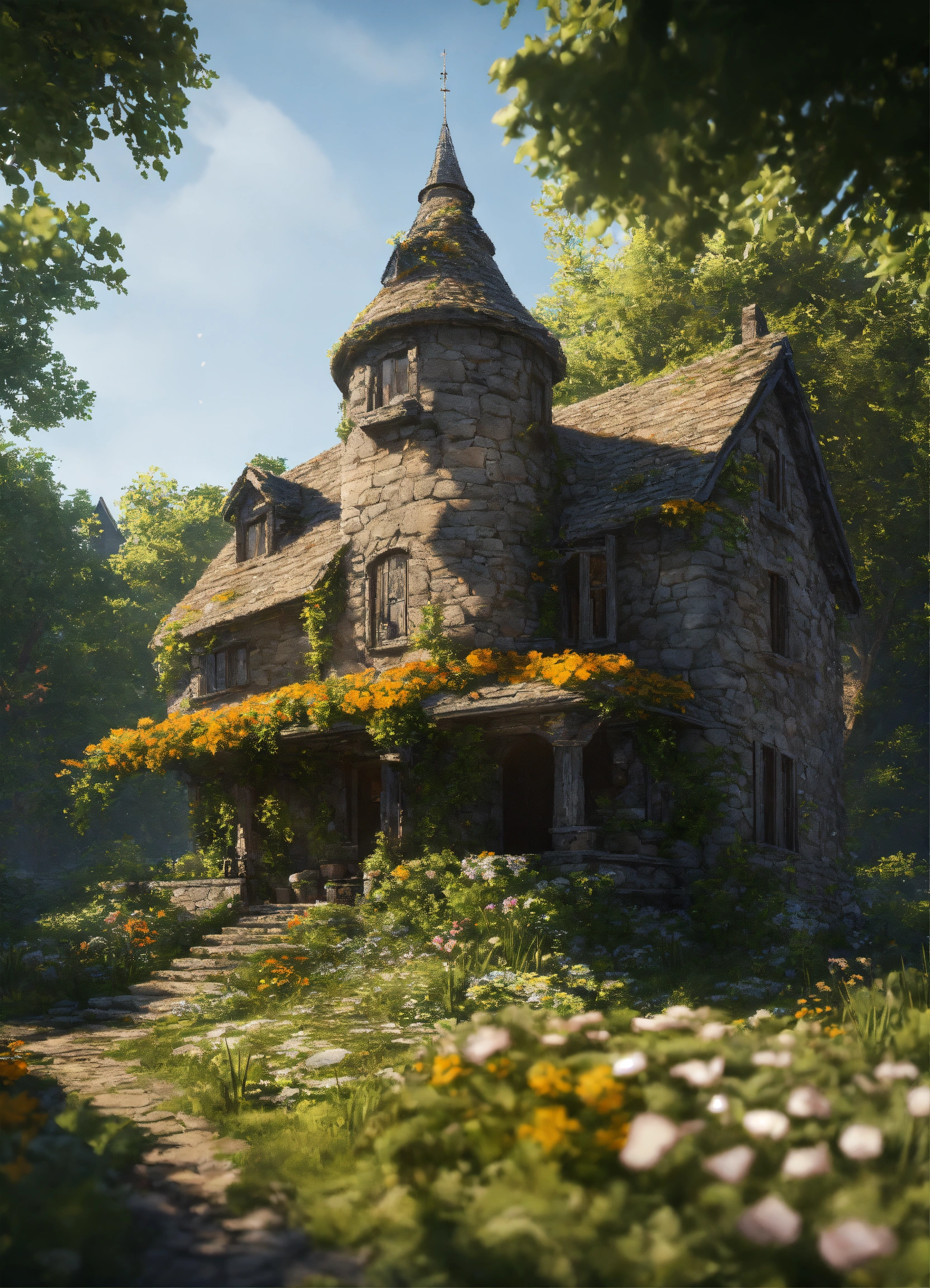 "old stone house with turret", covered with plantss, 8k resolution, hyperdetailed intricately detailed splash art trending on artstation unreal engine 5 volumetric lighting