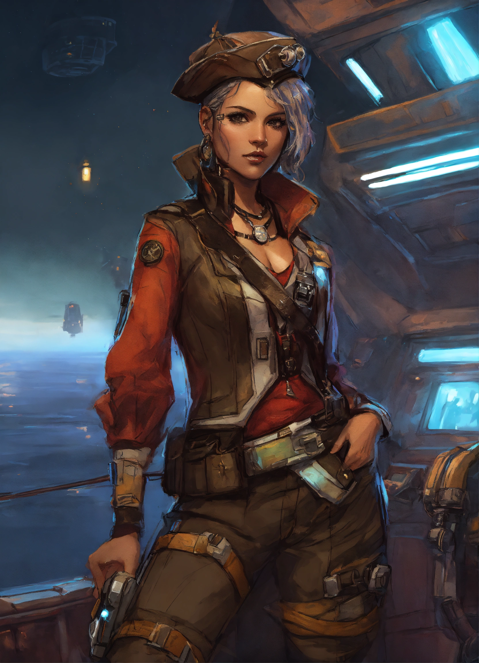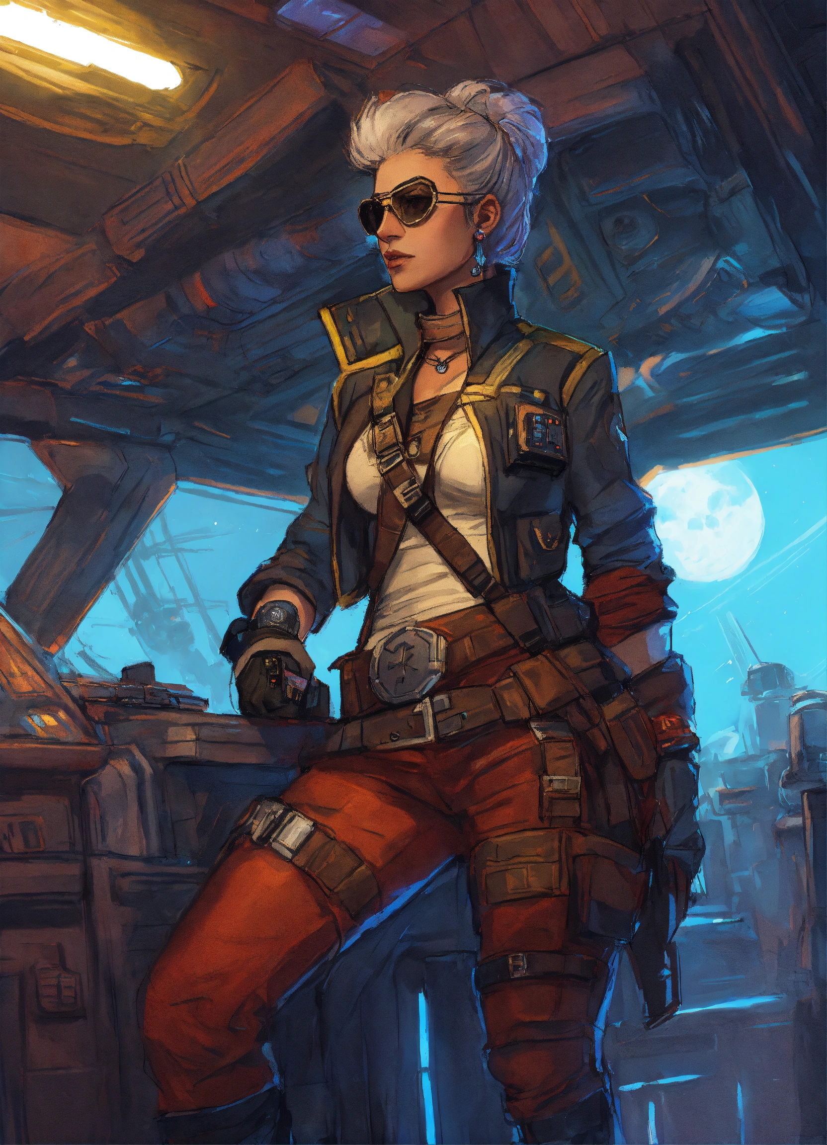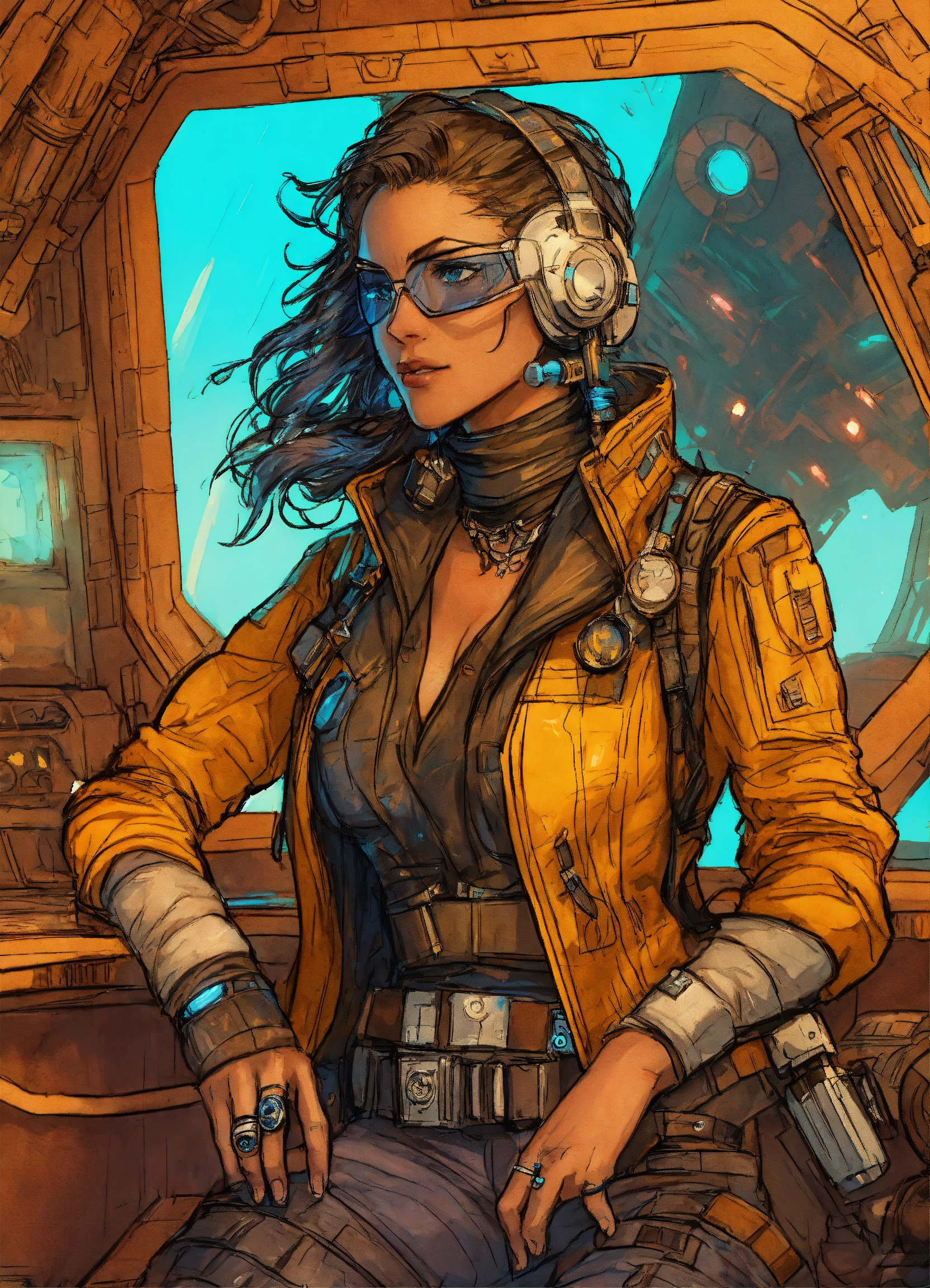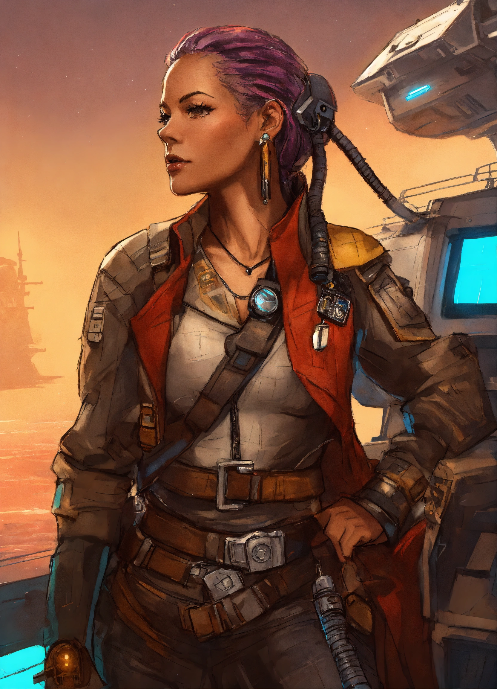Sketched character art of a cyberpunk female pirate in her fifties on a star wars ship