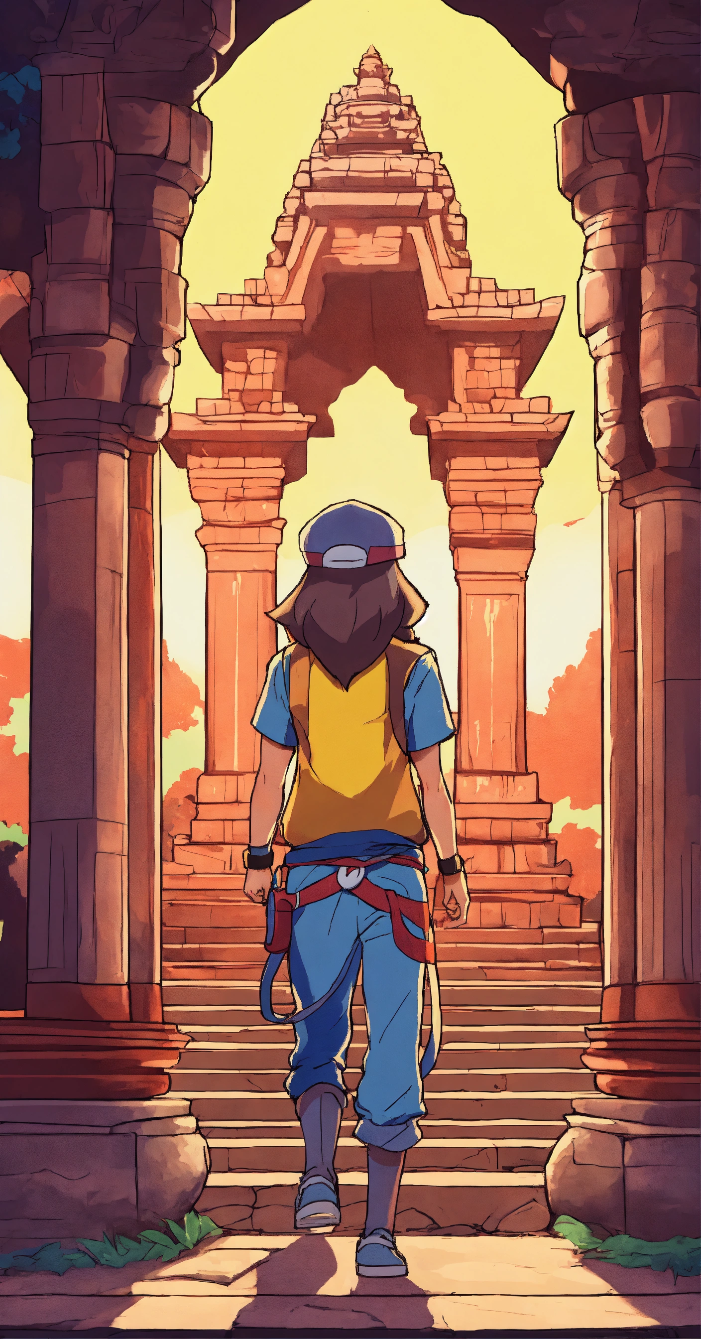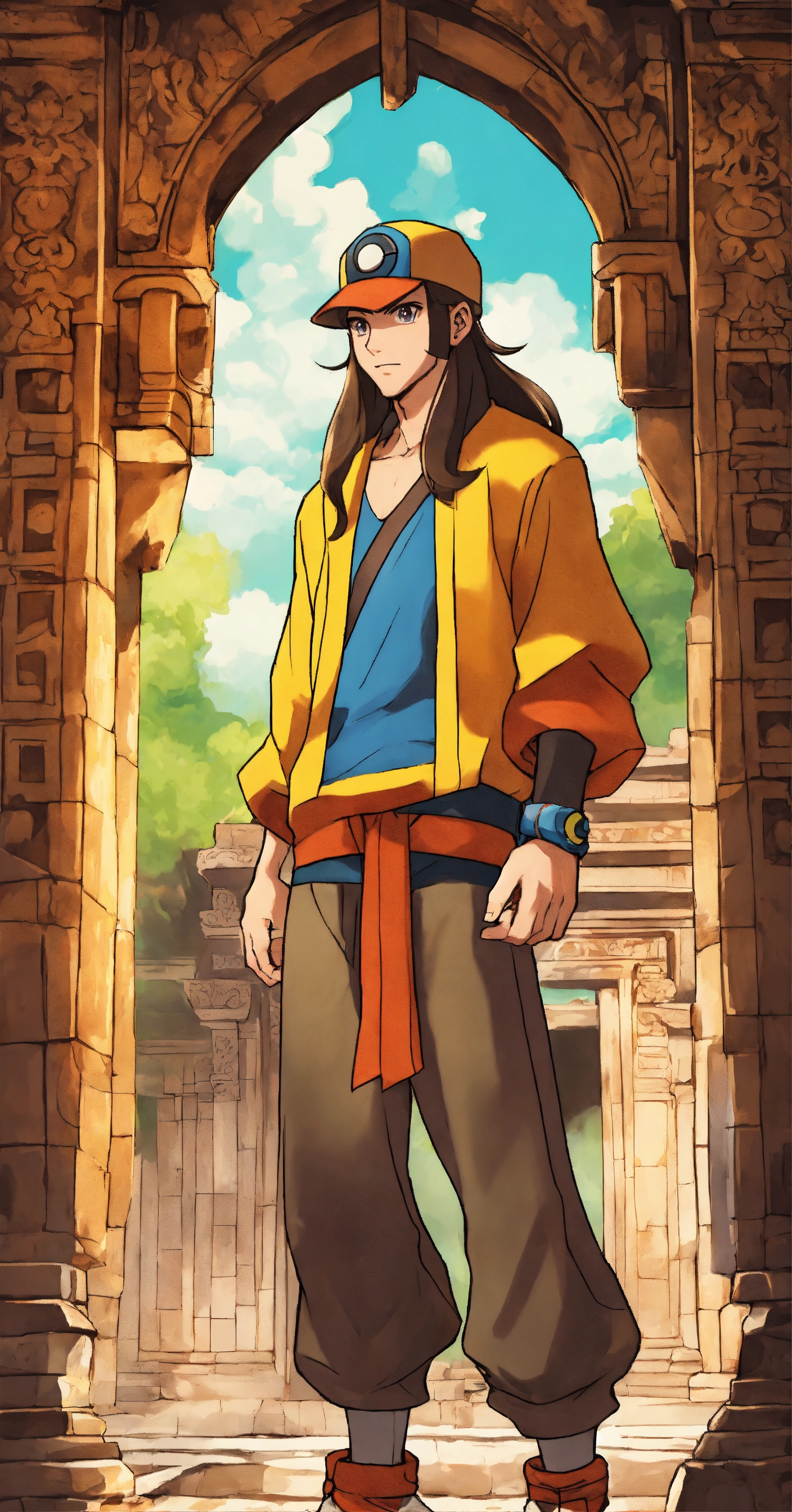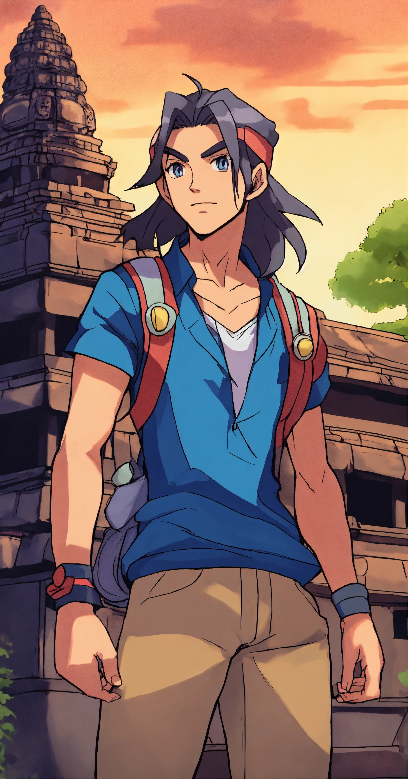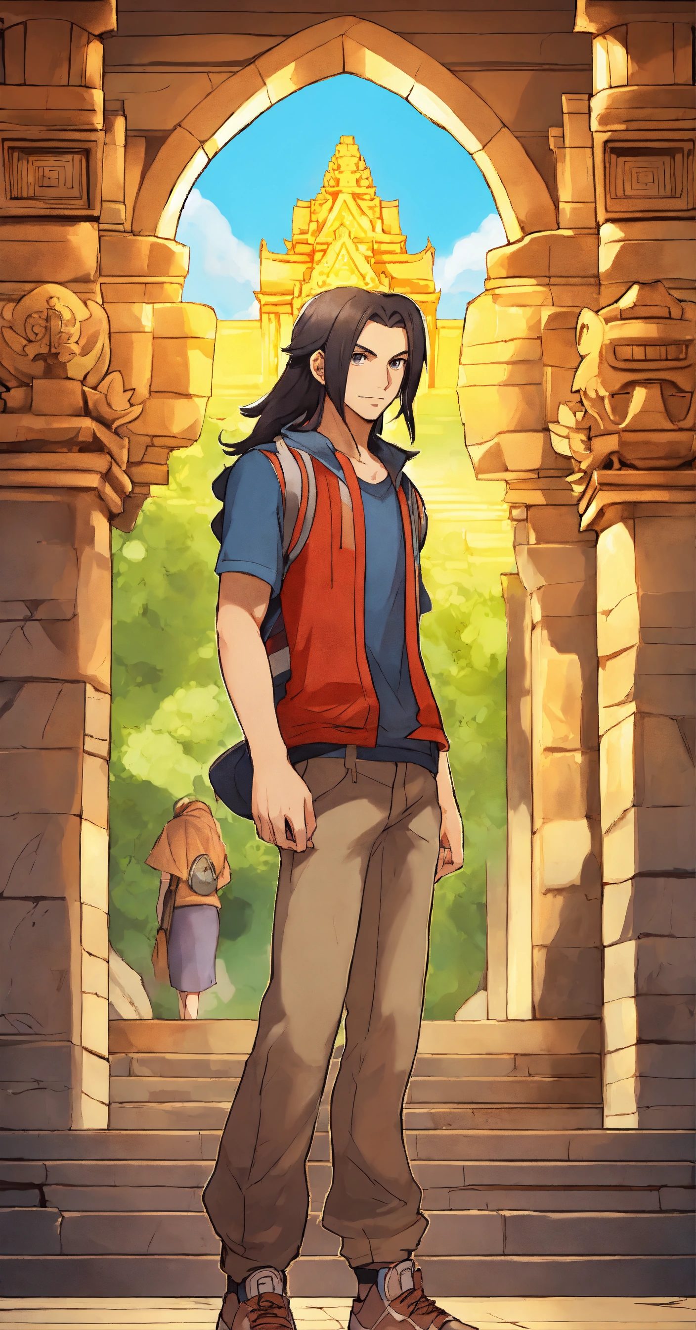 A pokemon trainer guy 30 years old with long hair in angkor temple