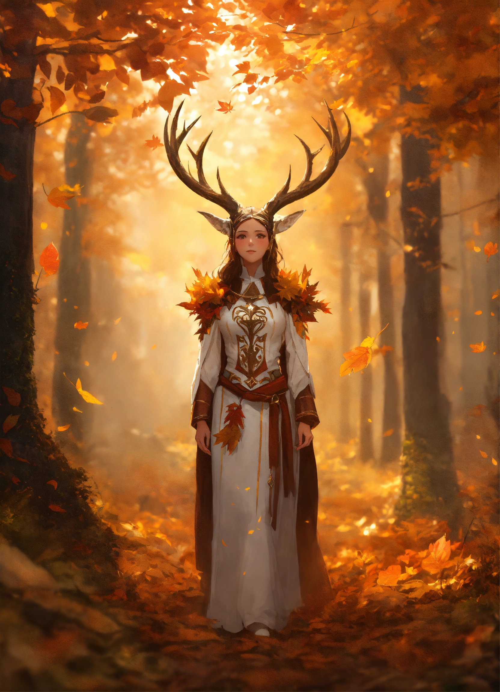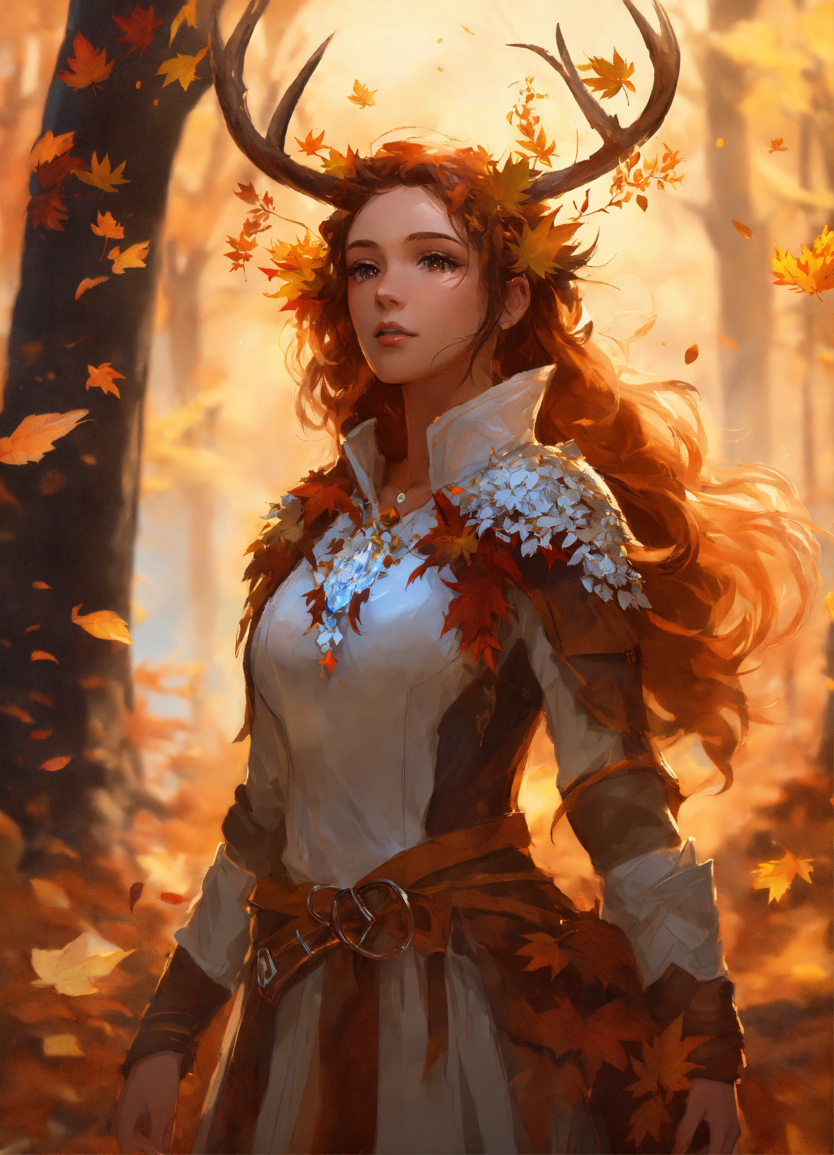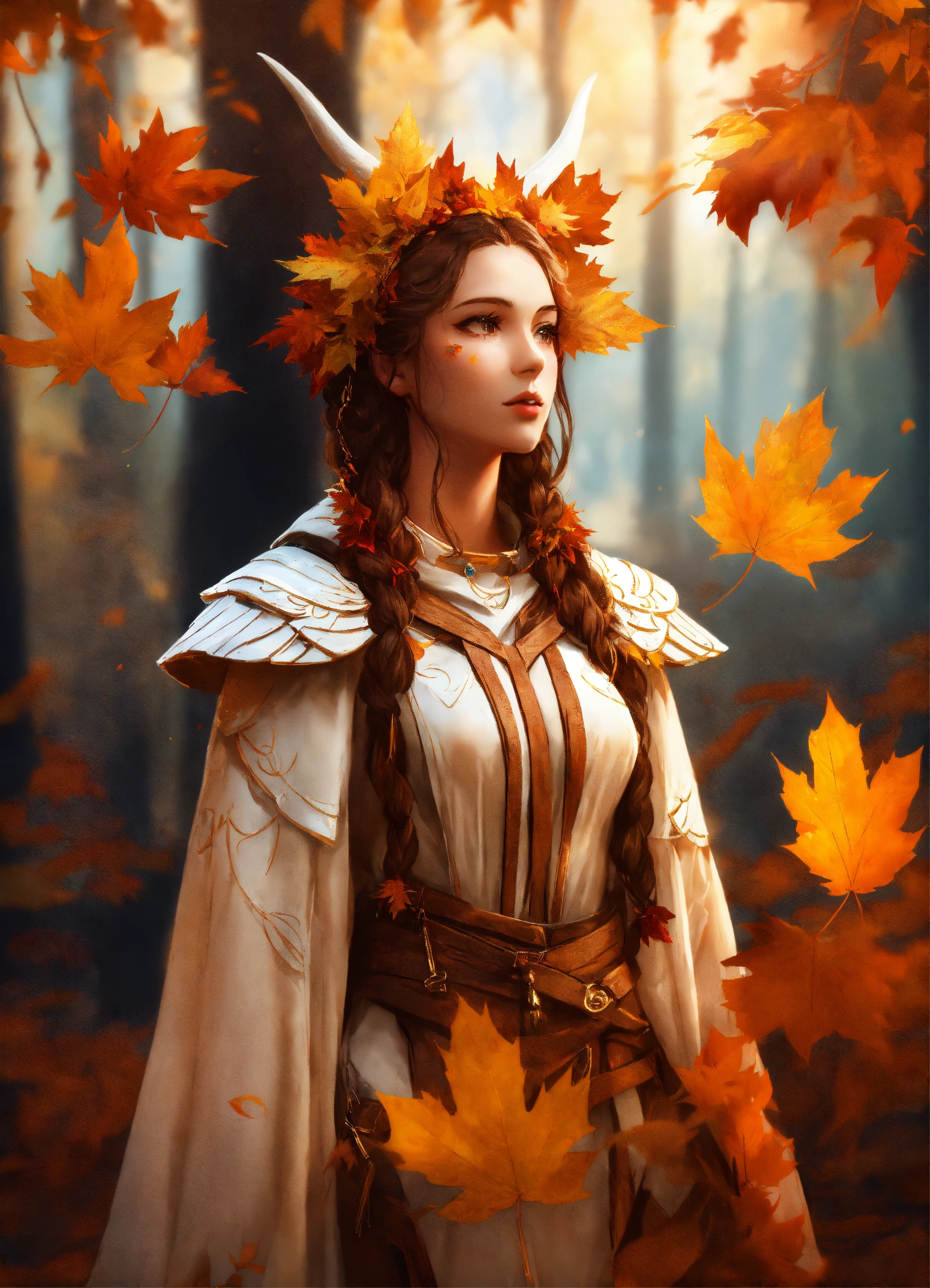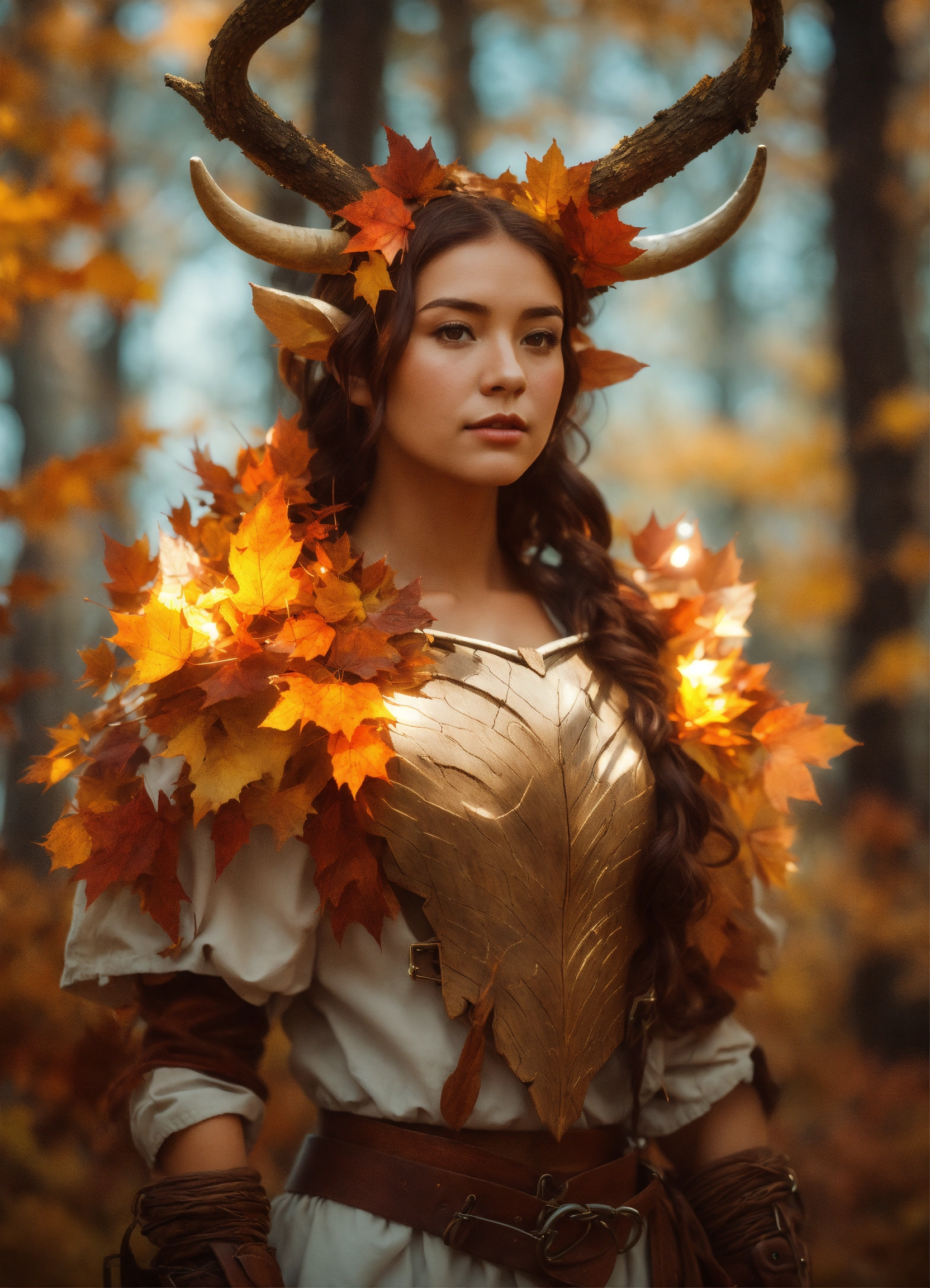 A girl with wooden shoulder pads and magical autumn glowing leaves on her shoulders and white wooden horns, druid, concept art style