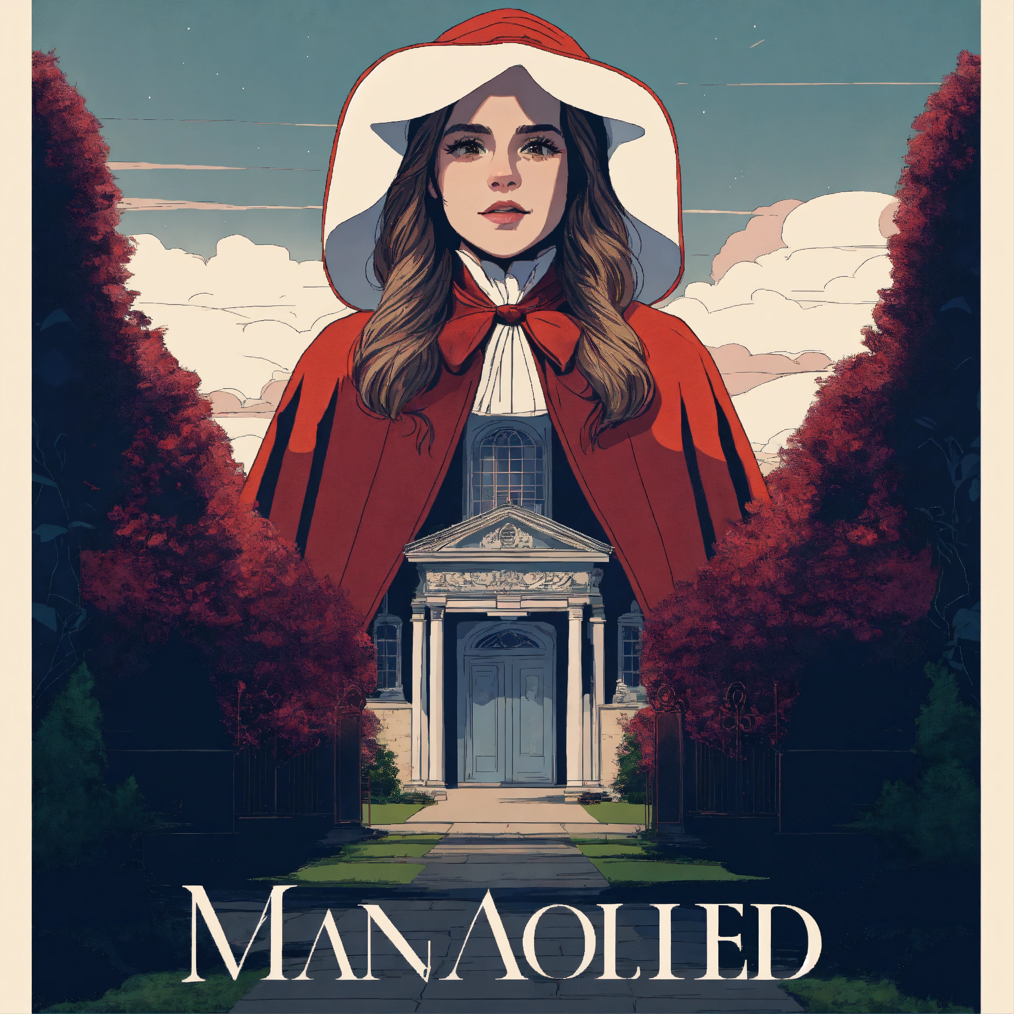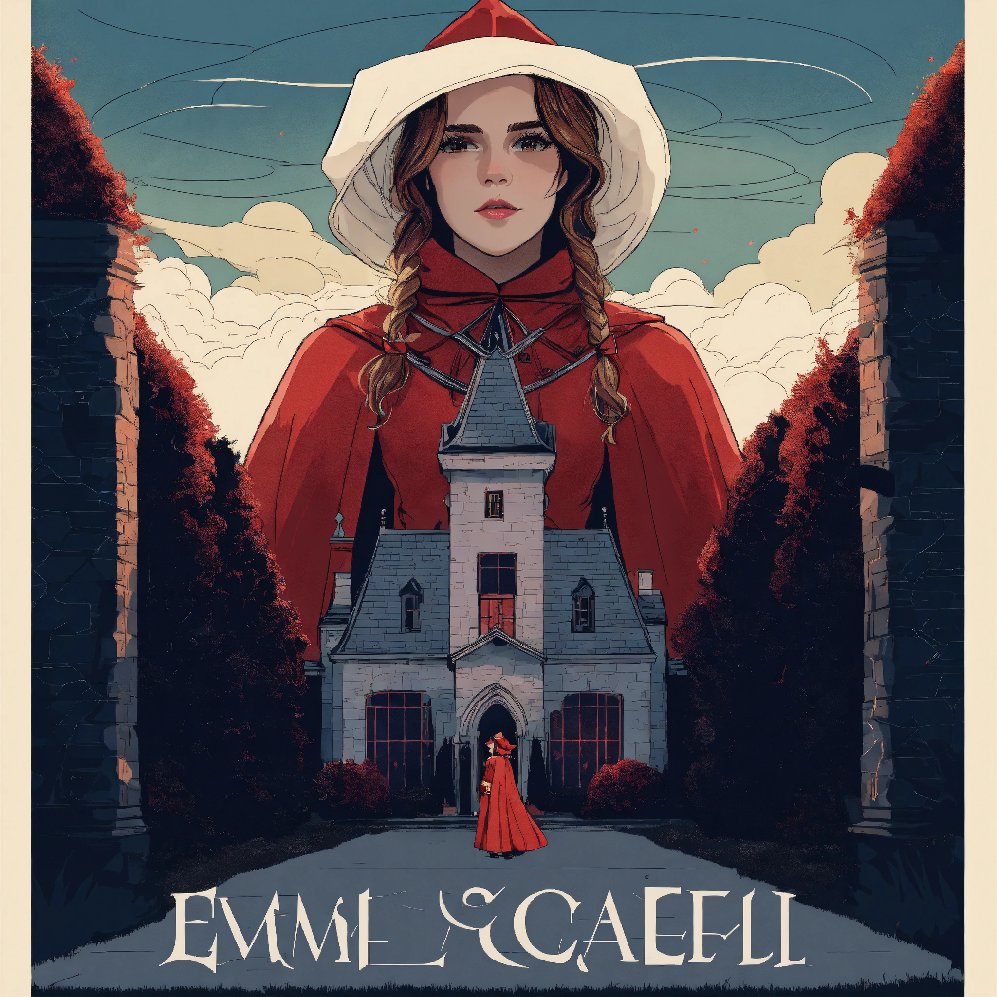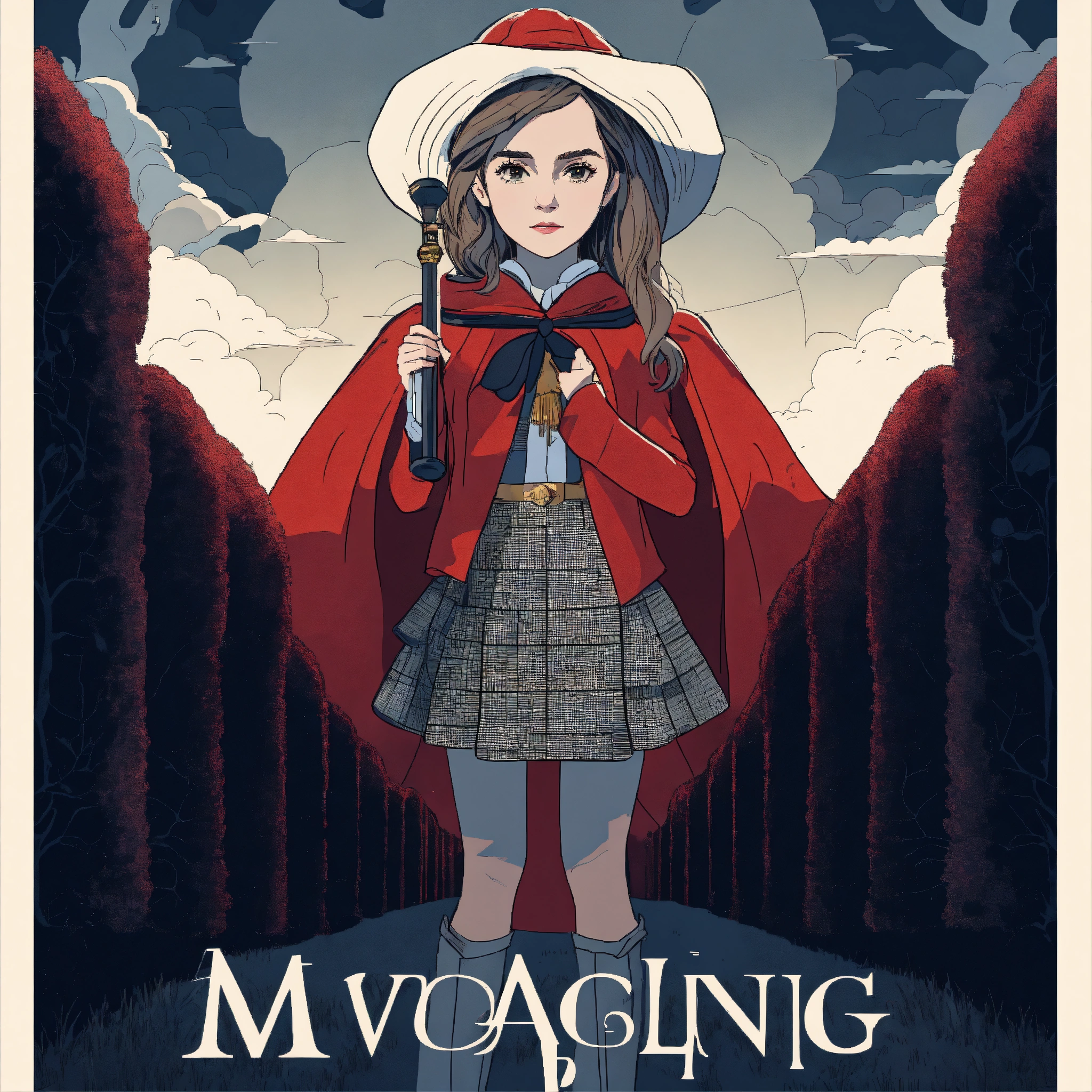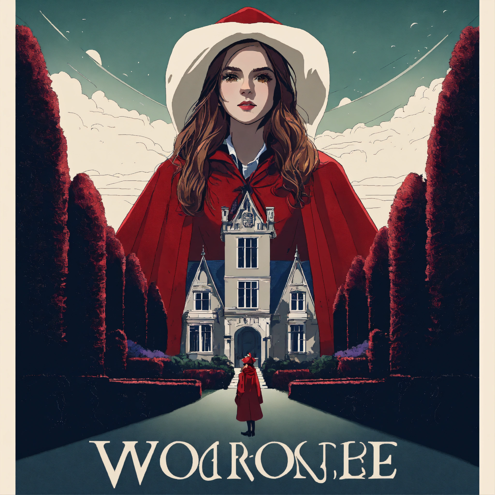 Emma watson as hermione granger in a red cloak and white bonnet outside of a gothic manor, schematic line illustration, flat colors, flat design poster, not too complex, modern, 4k, epic composition, flat vector art illustration, vibrant colours, big shapes
