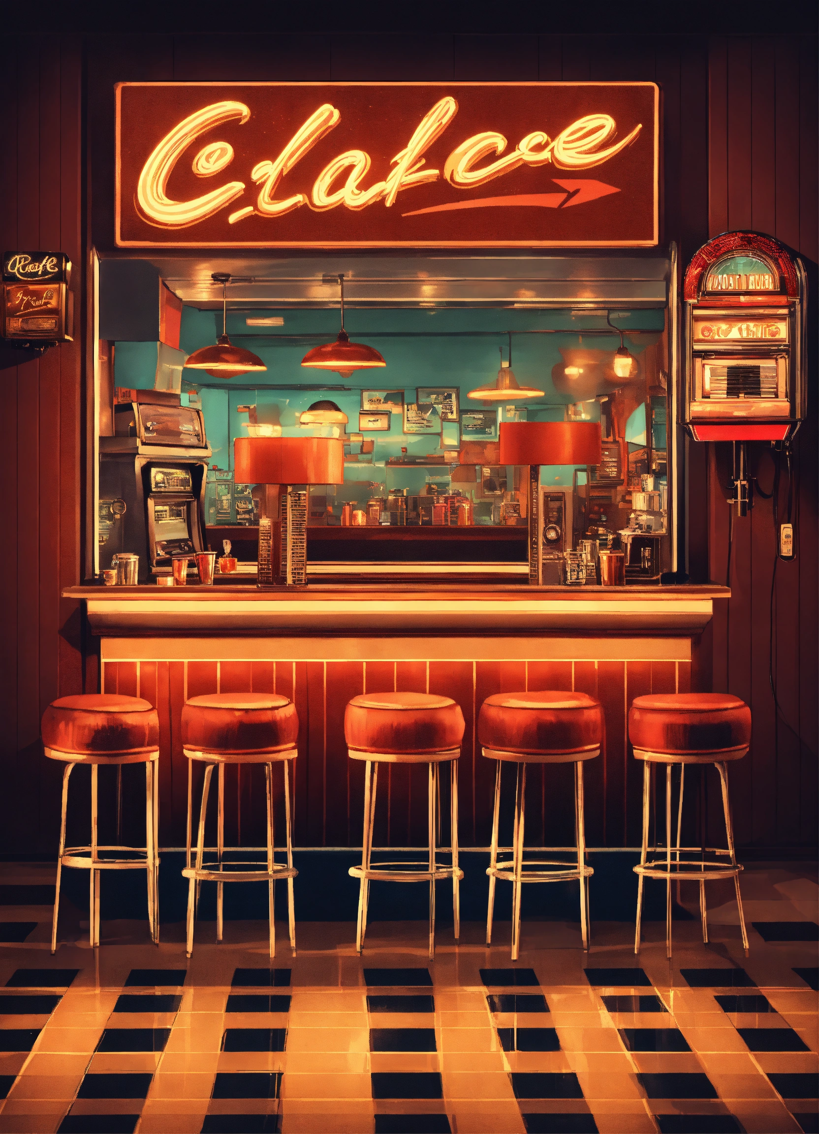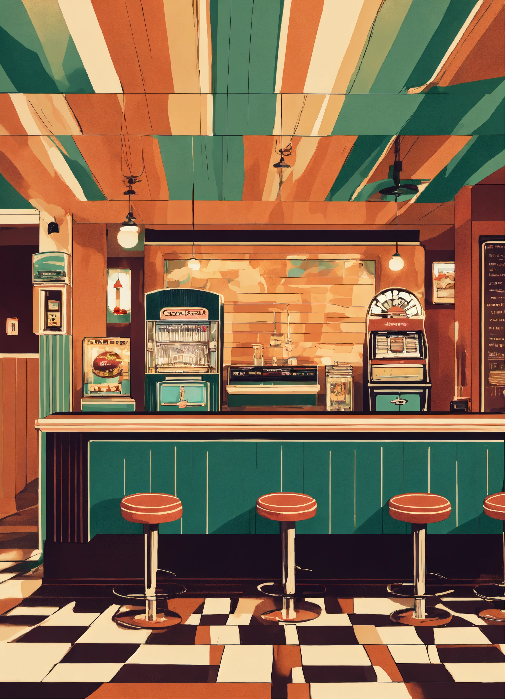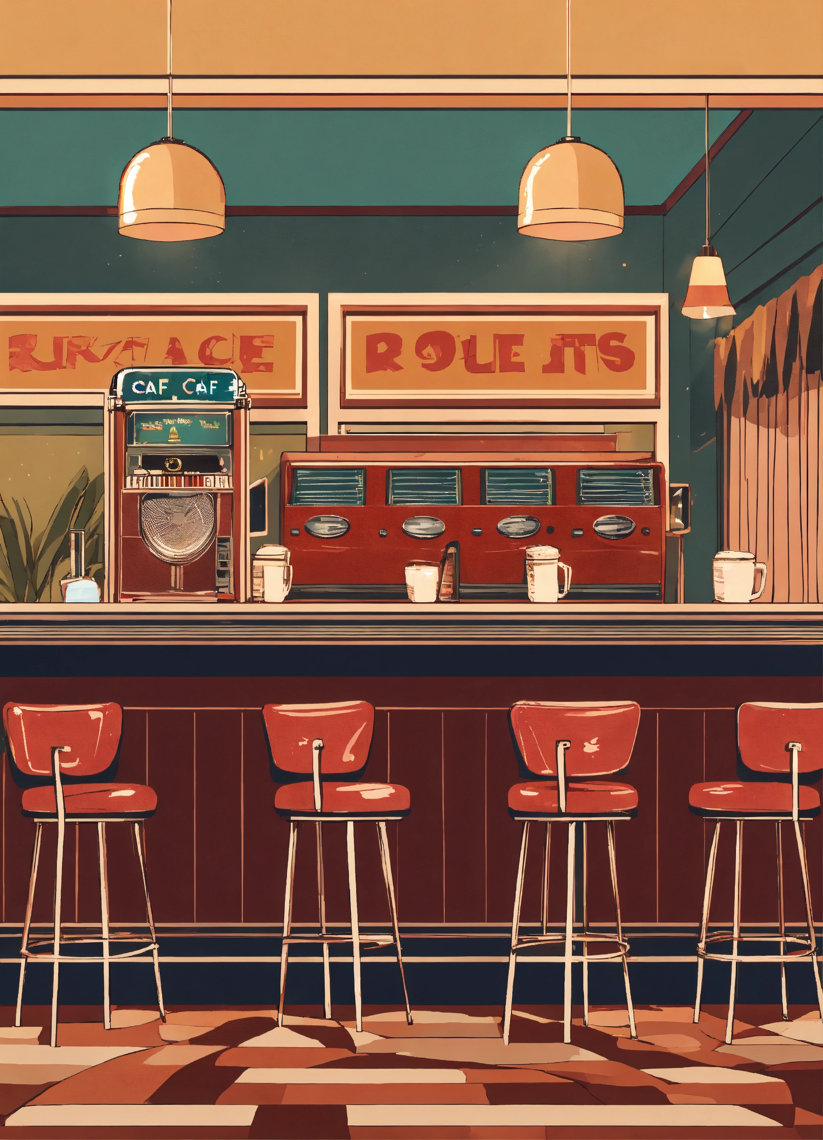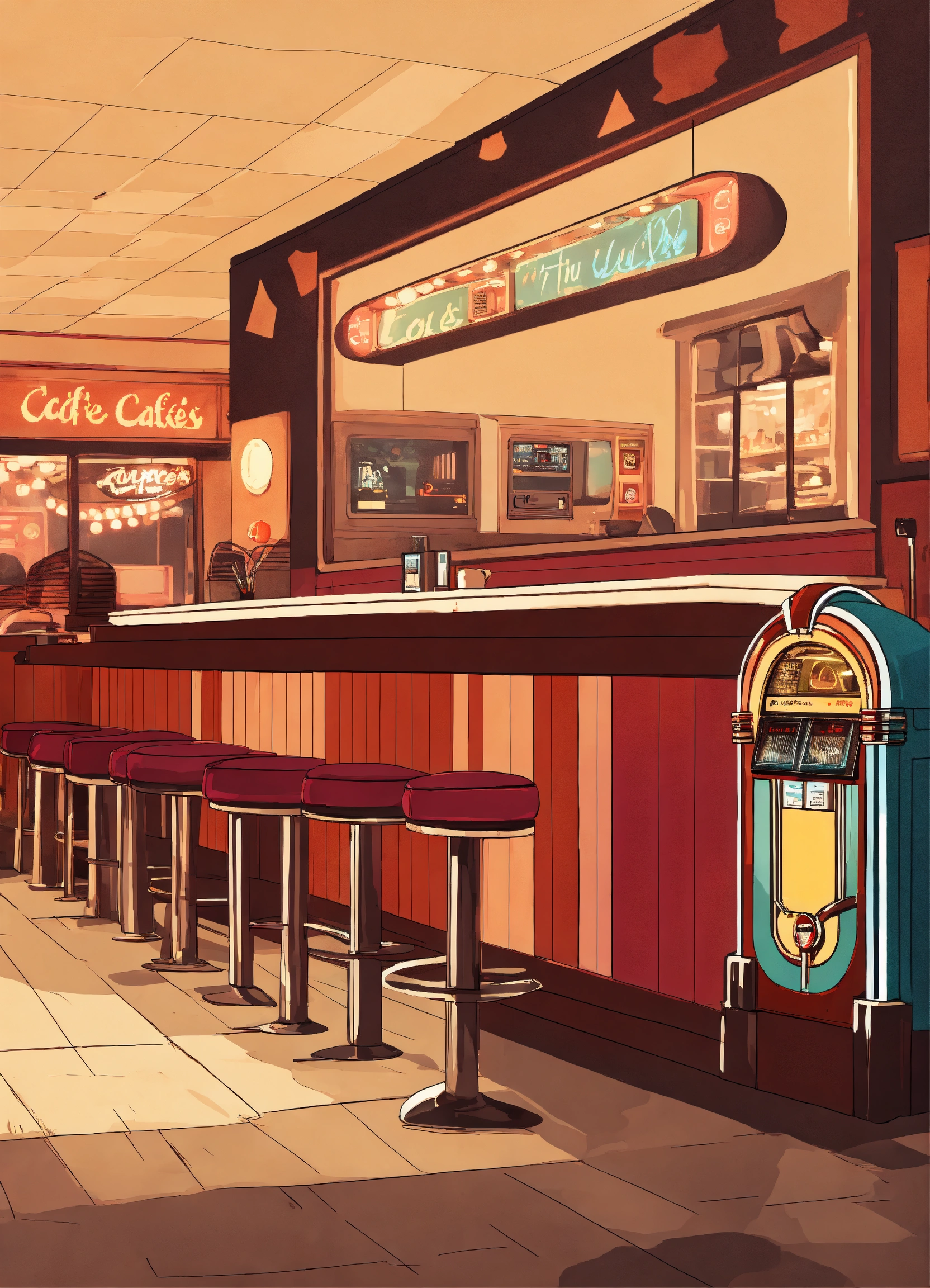 A retro cafe with cozy booths, vinyl bar stools, and a jukebox playing oldies nostalgic ambiance vintage aesthetics illustration.