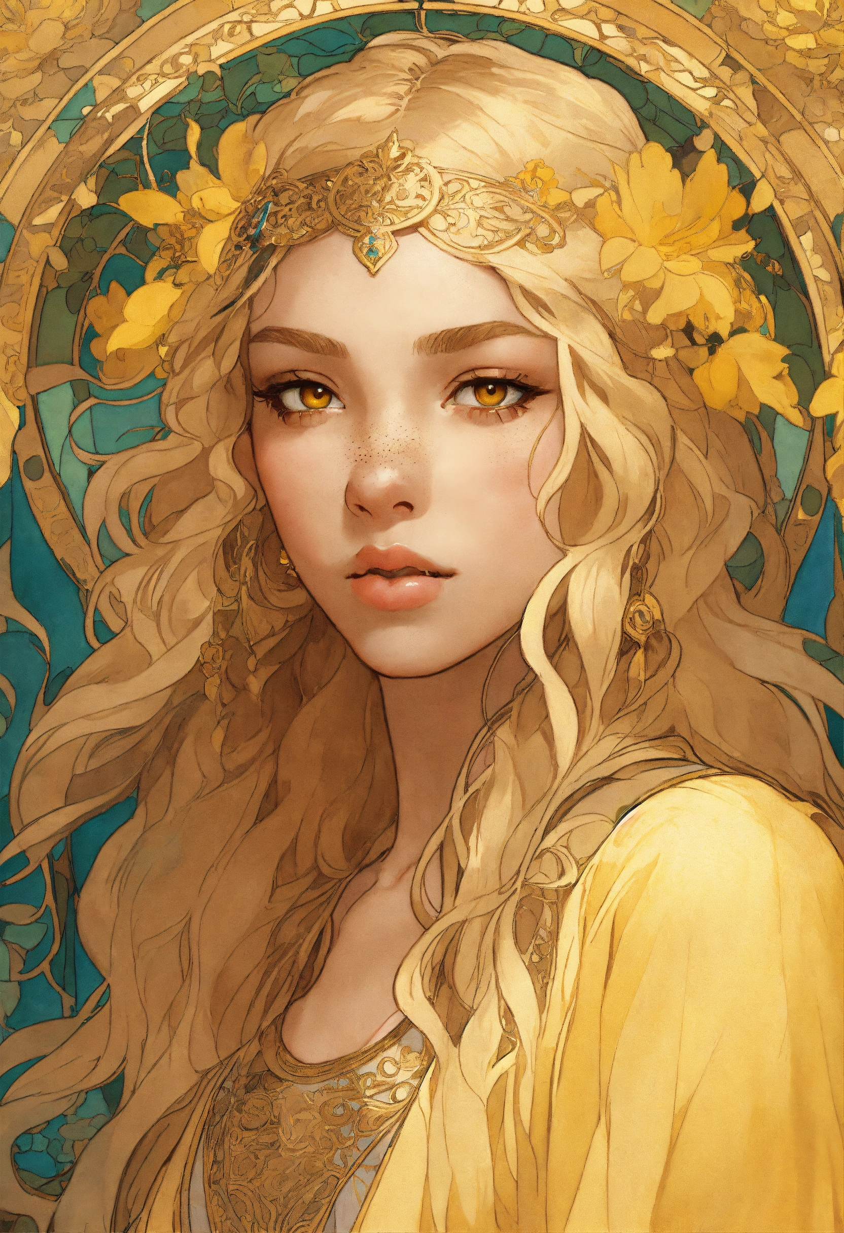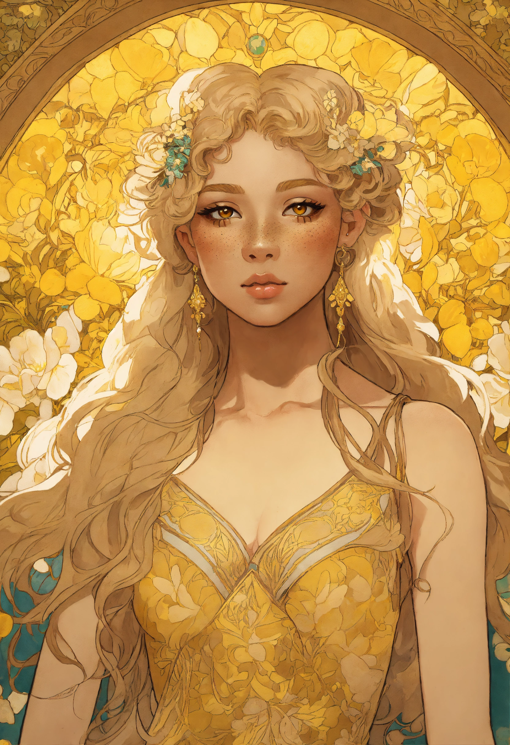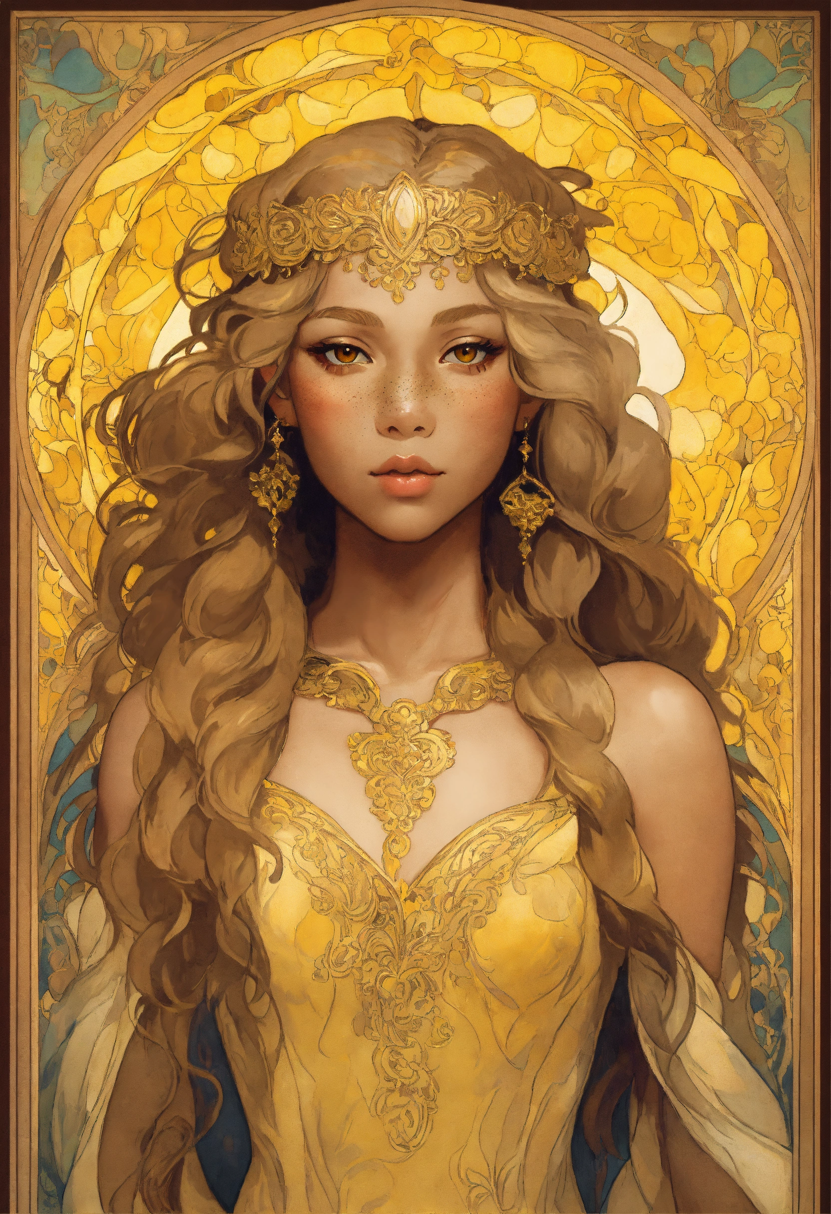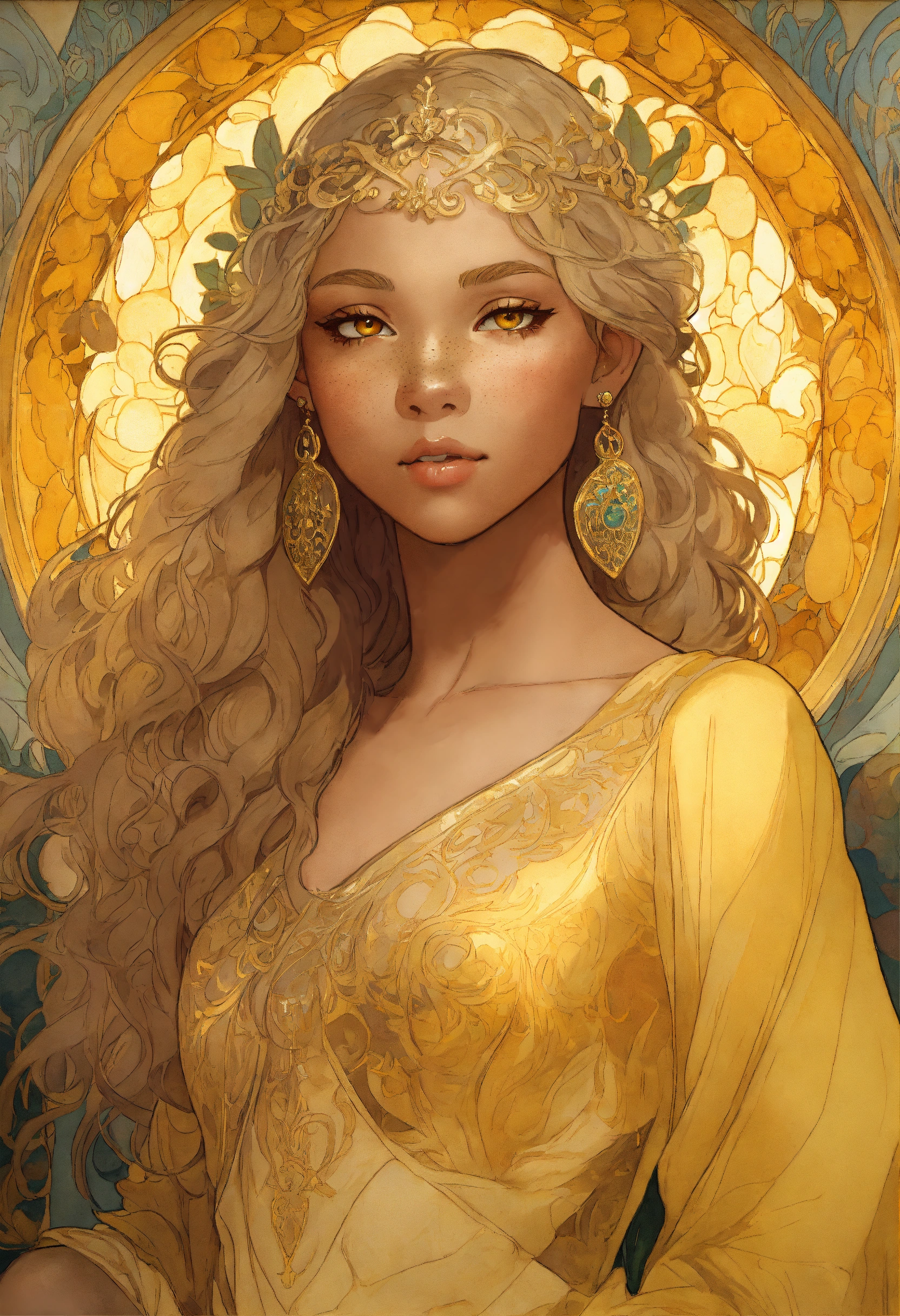 Portrait of a young elf biracial princess with tan bronze skin, bright yellow eyes, freckles, round face, high cheekbones, long curly yellow blonde hair, wearing a light gold expensive dress, stylized, intricate, delicate, princess, art by alphonse mucha