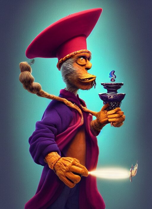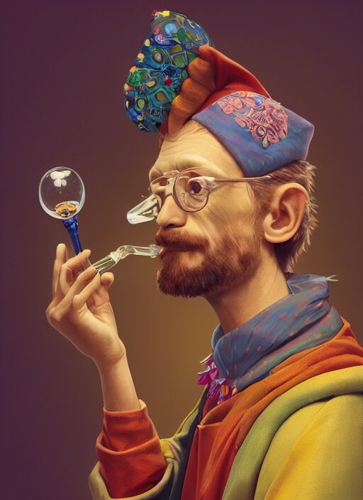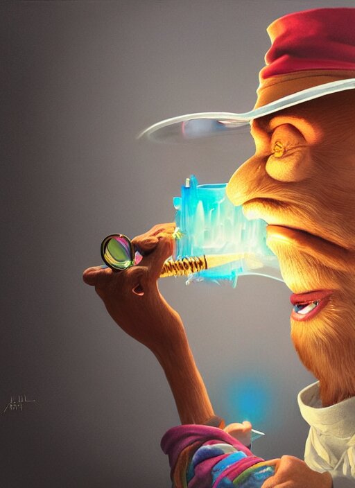 An anthropomorphic beautiful male wizard portrait blowing a bong wearing colourful robe, perfect square glasses, fine art, wizard hat, award winning, intricate, elegant, sharp focus, octane render, hyperrealistic, wizard hat cinematic lighting, highly detailed, digital painting, 8 k concept art, art by jamie hewlett and z. w. gu, masterpiece, trending on artstation, 8 k