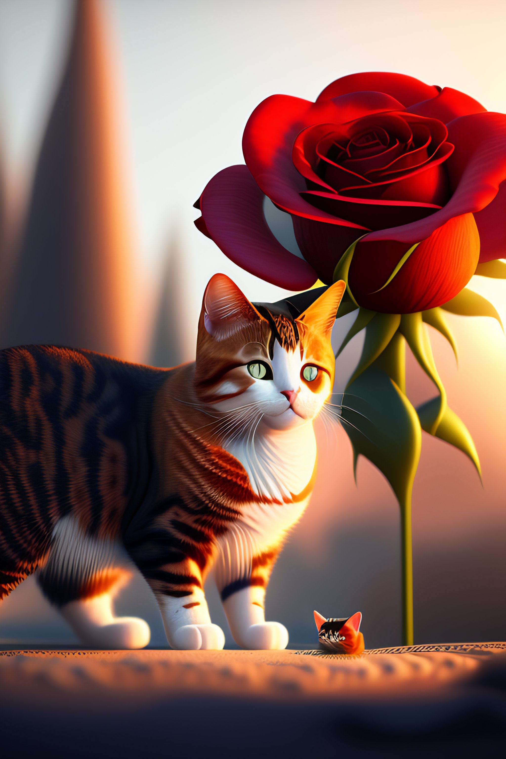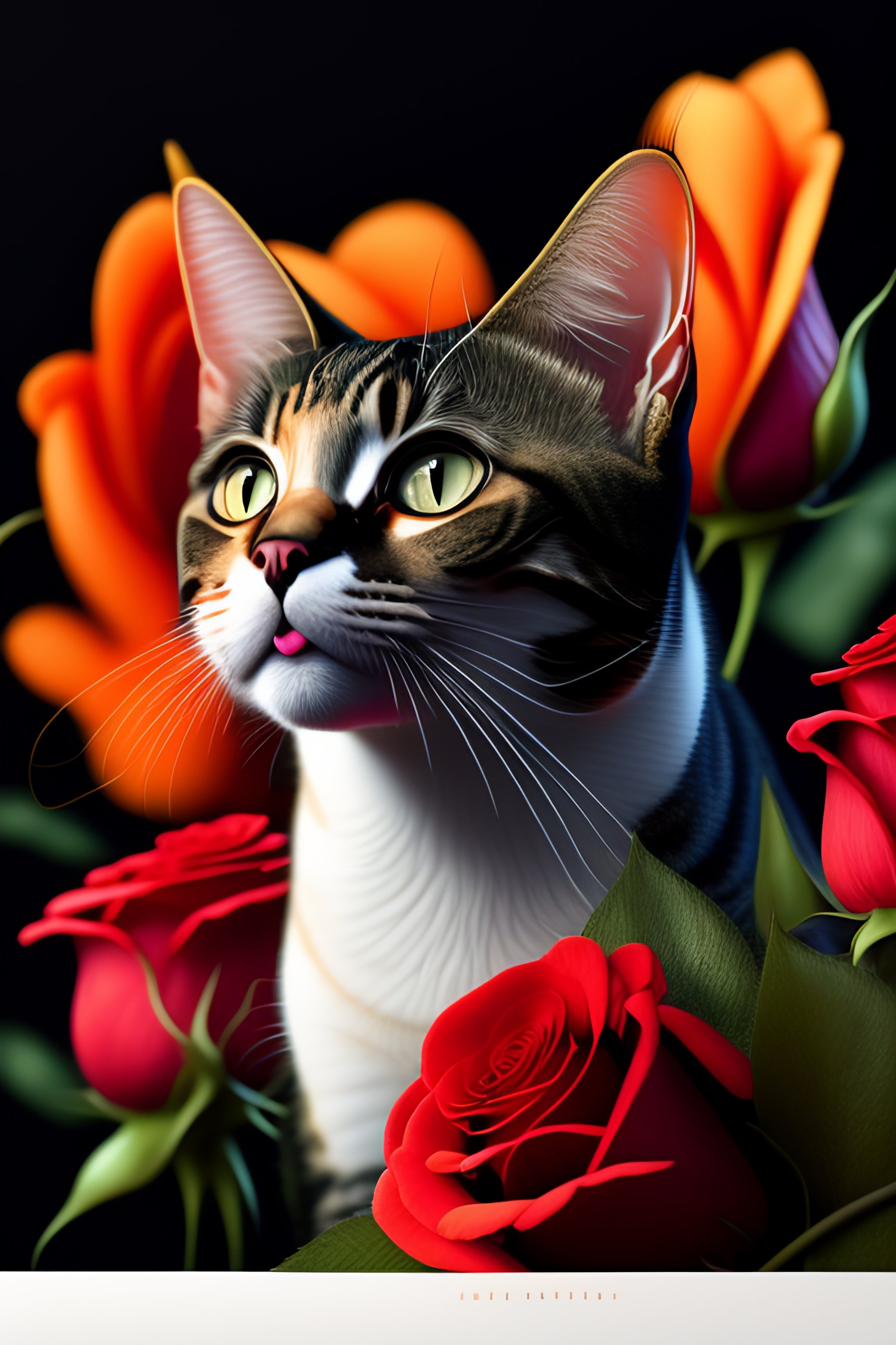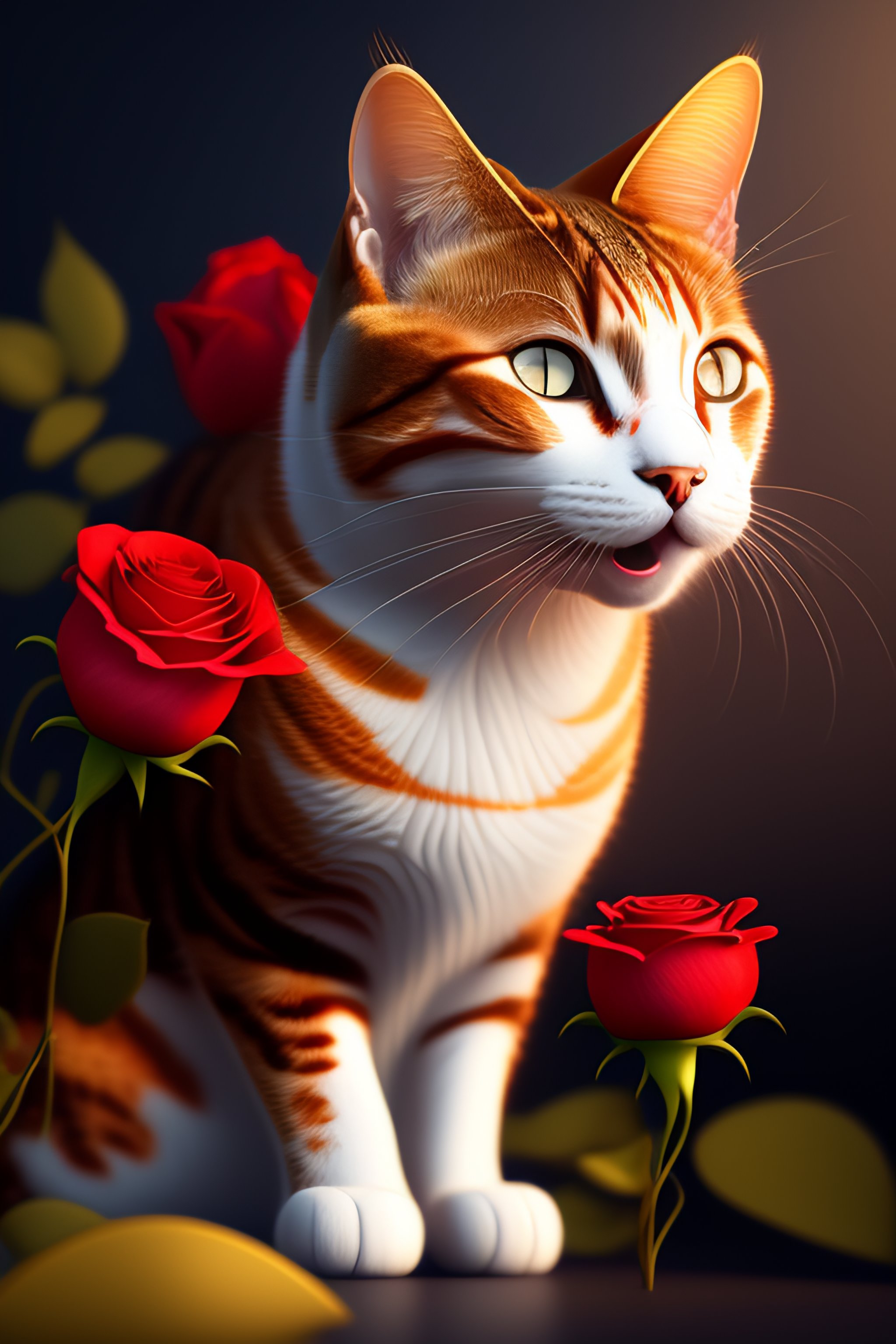 Cat brings a red rose into her mouth with a smiley face, isolated on a black background, front view, hand drawn pencil sketch, 4k, an ultrafine detailed illustration by james jean, final fantasy, intricate linework, bright colors, behance contest winner, vanitas, angular, altermodern, unreal engine 5 highly rendered, global illumination, radiant light, detailed and intricate environment