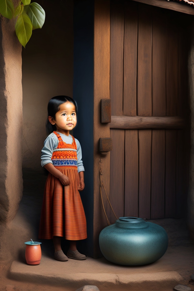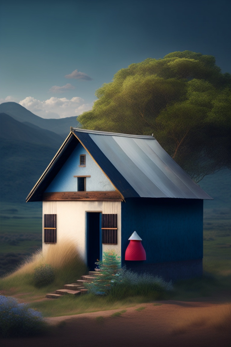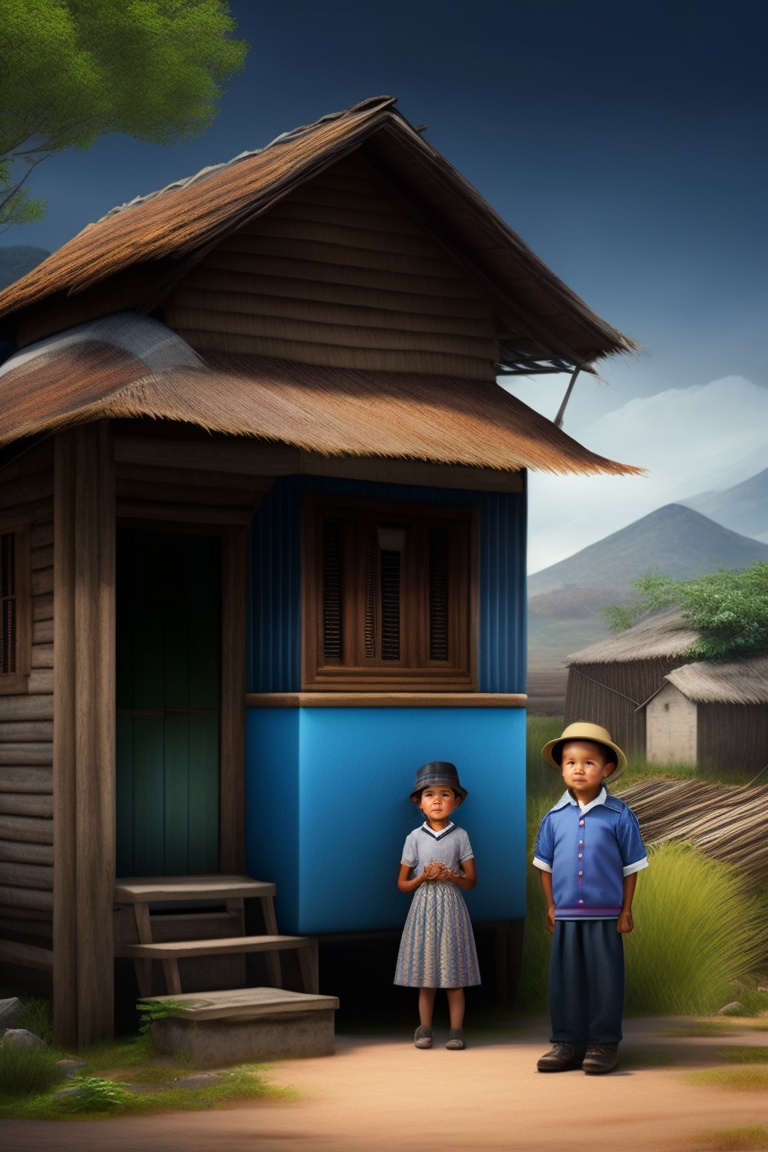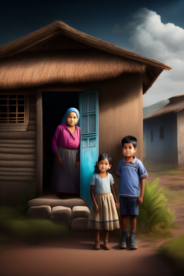 Poor family: a small, run-down house in a rural village with a poor father, mother, and their child. the house is simple and weathered, depicting their humble living conditions.