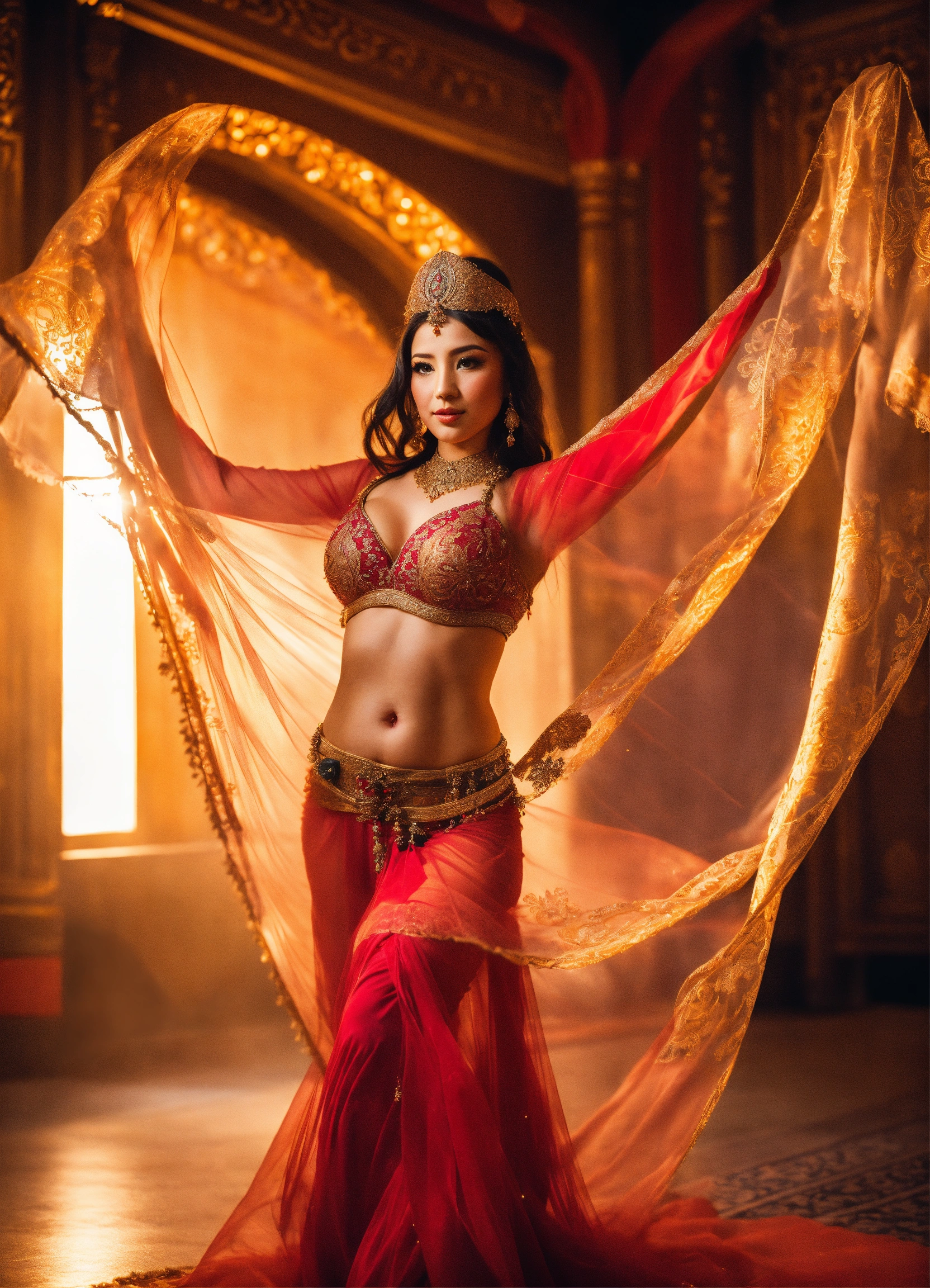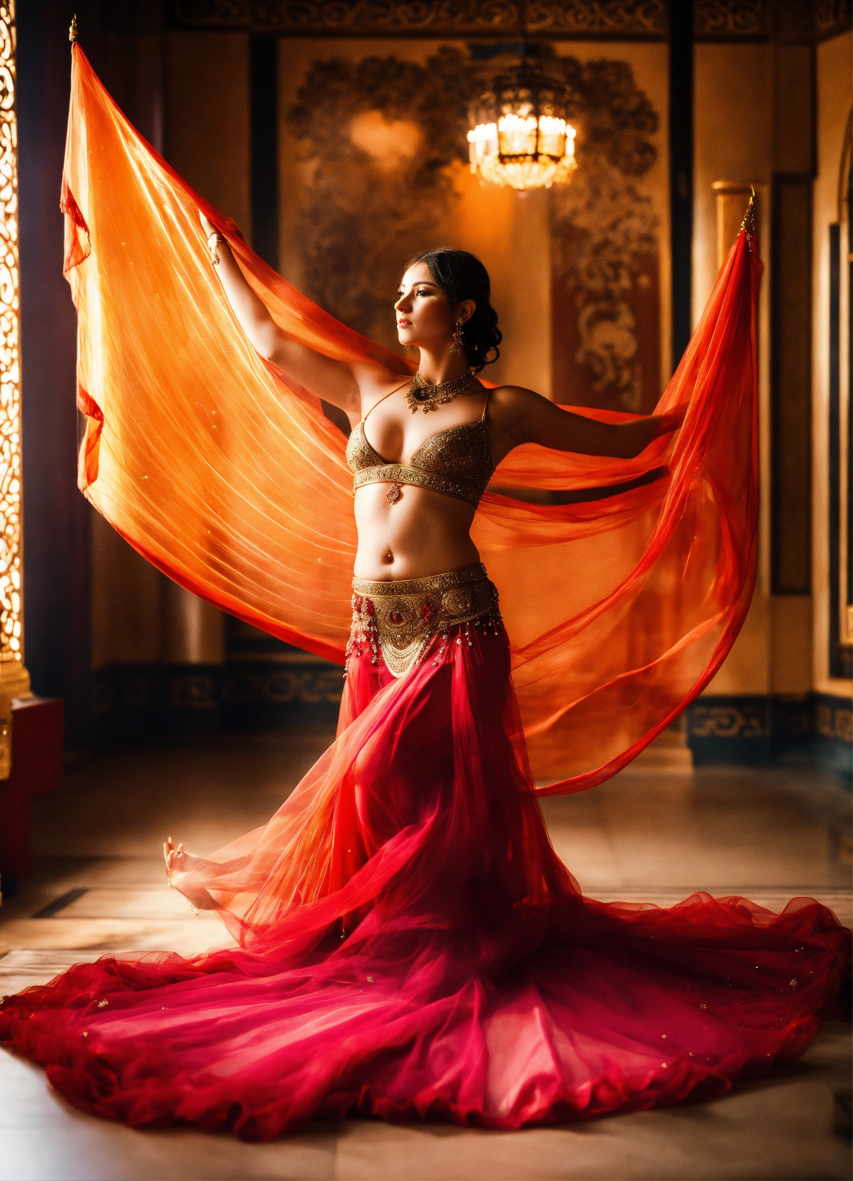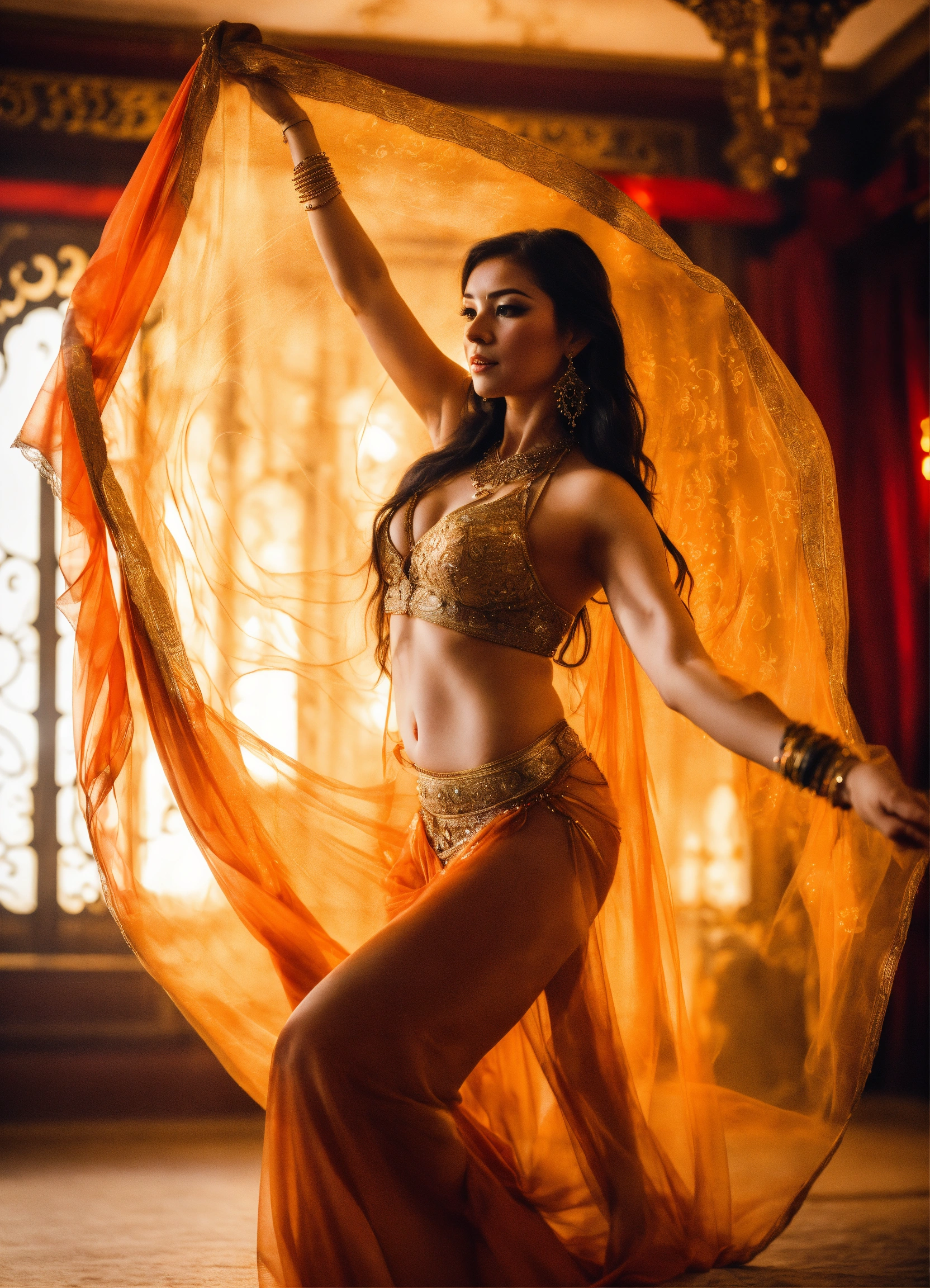 Detailed photo portrait of a small cat and a woman who is a dynamic sensuous spinning belly dancer, she is holding up a transparent veil in an oriental palace, spinning her body, lighting from upper right, chin up looking at viewer