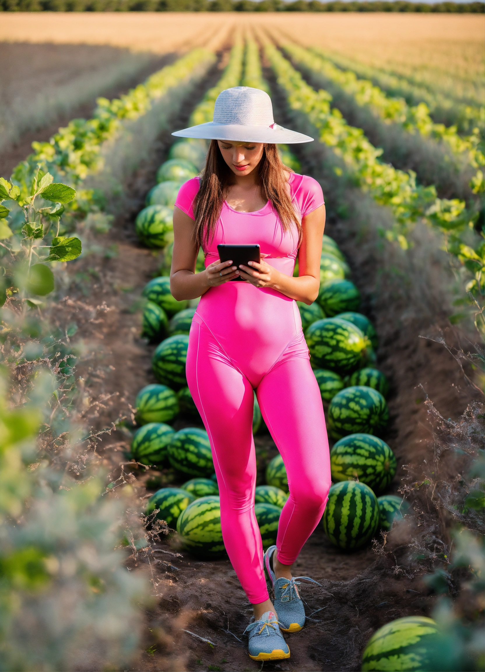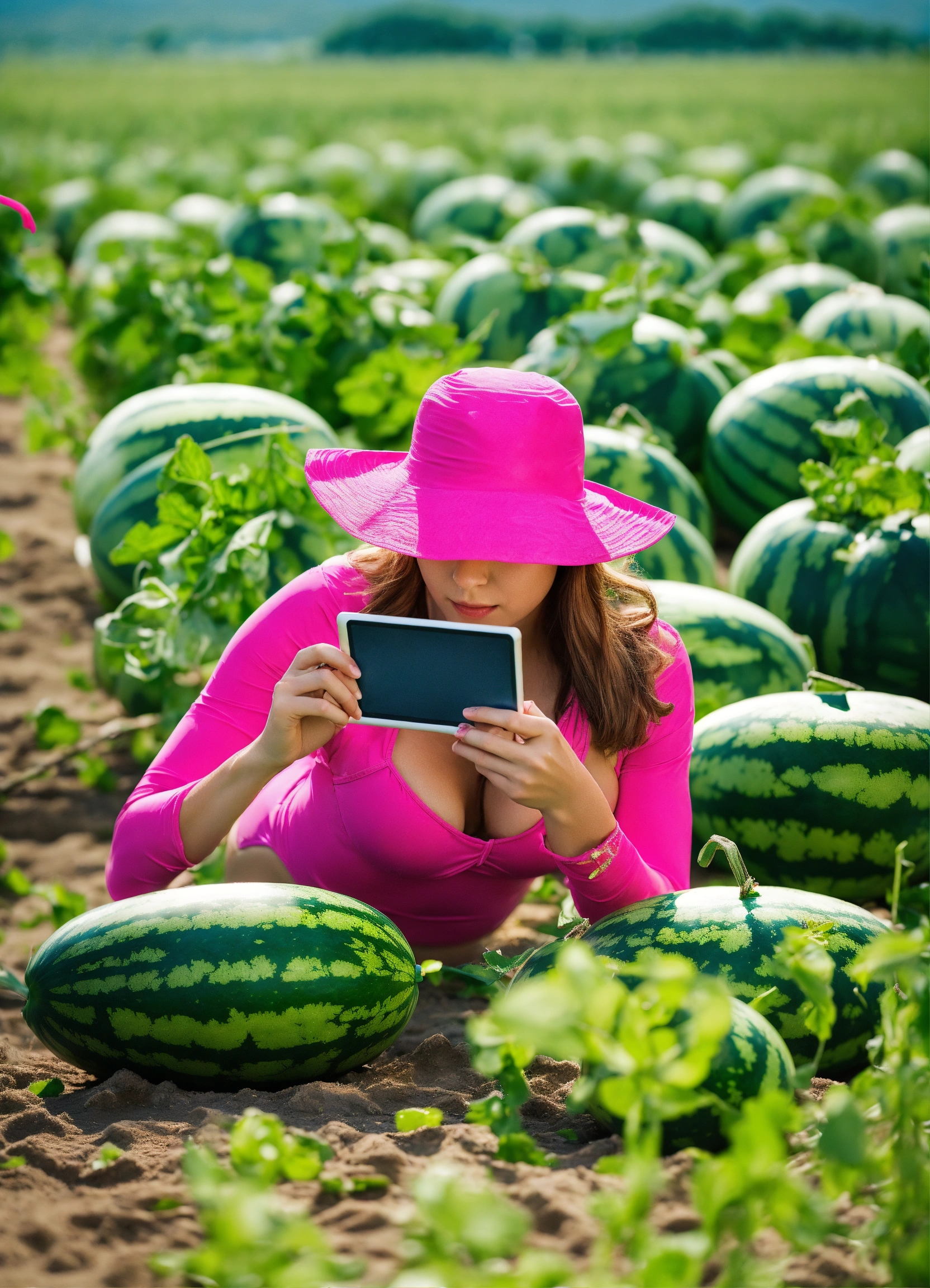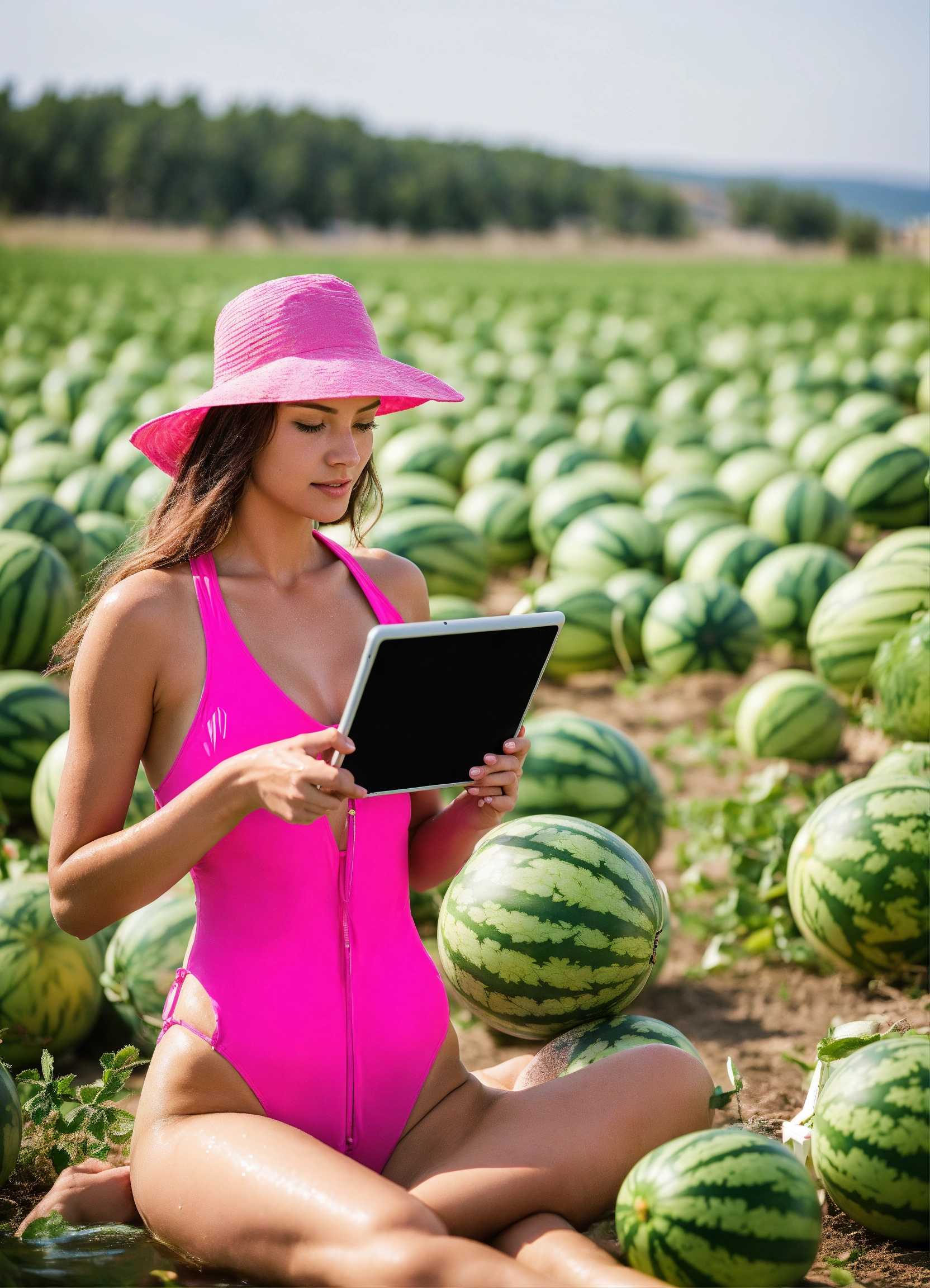 Female in a pink swimming suits in crimea counting watermelons in a field with a drone and tablet pc