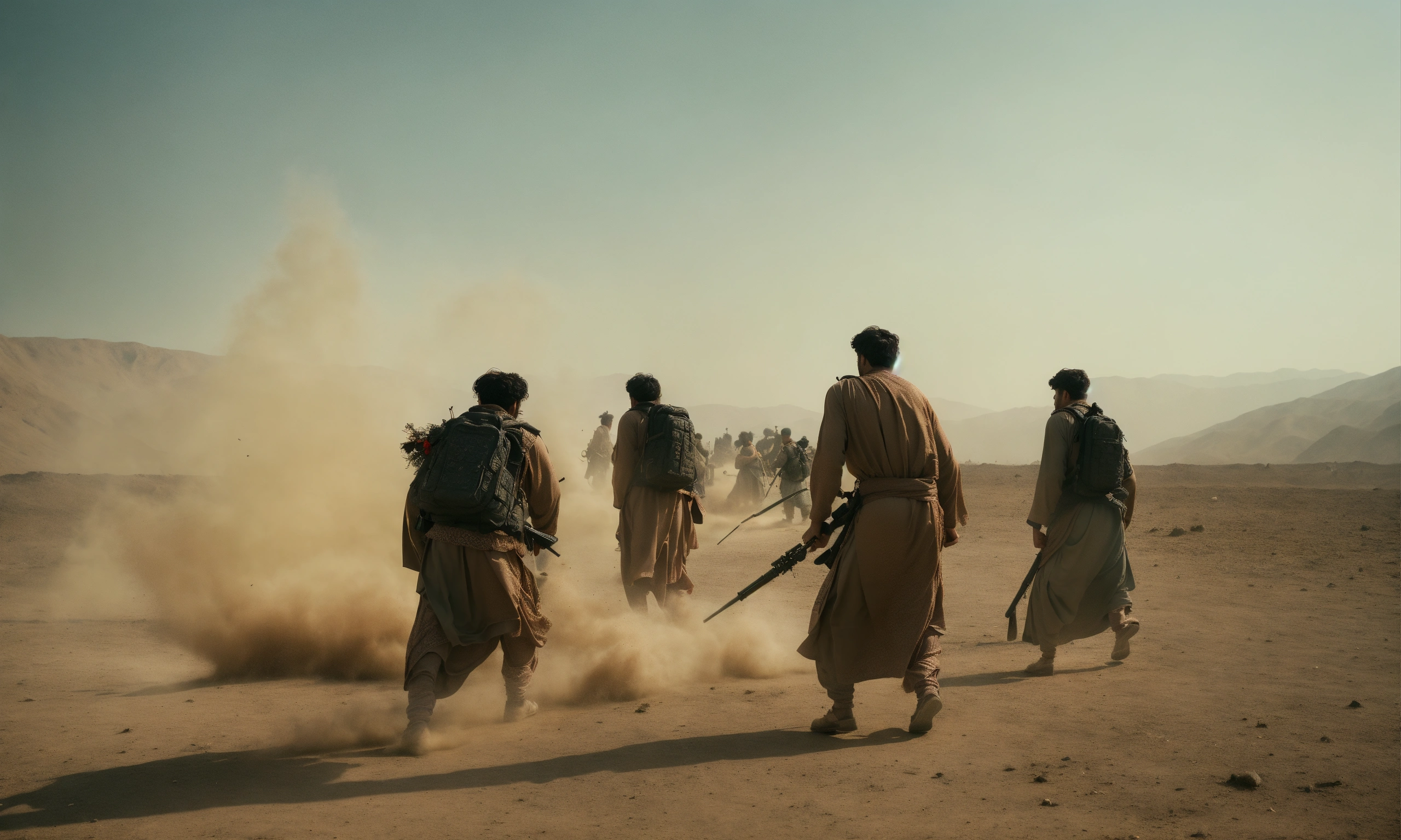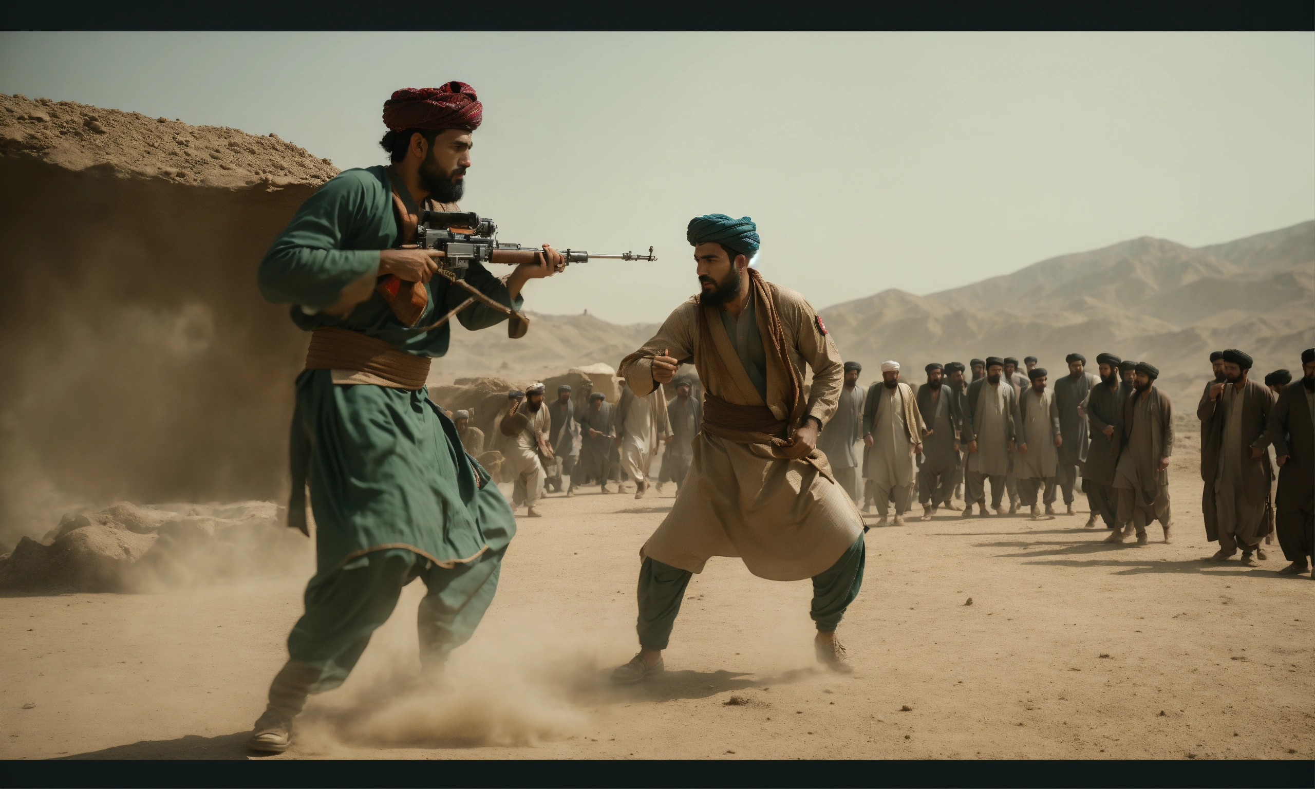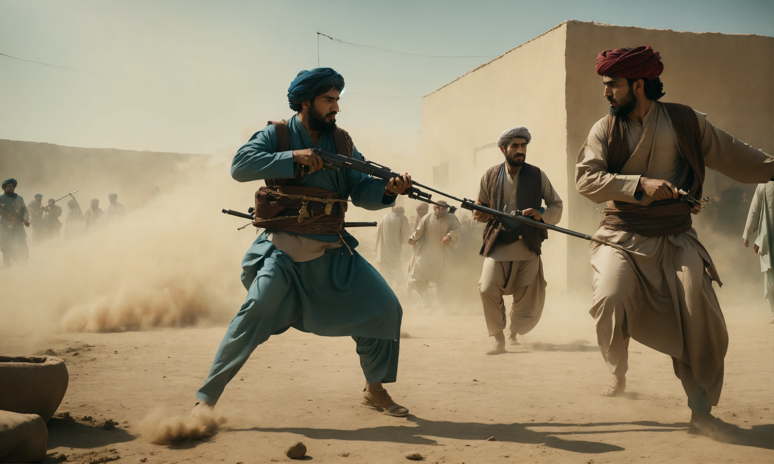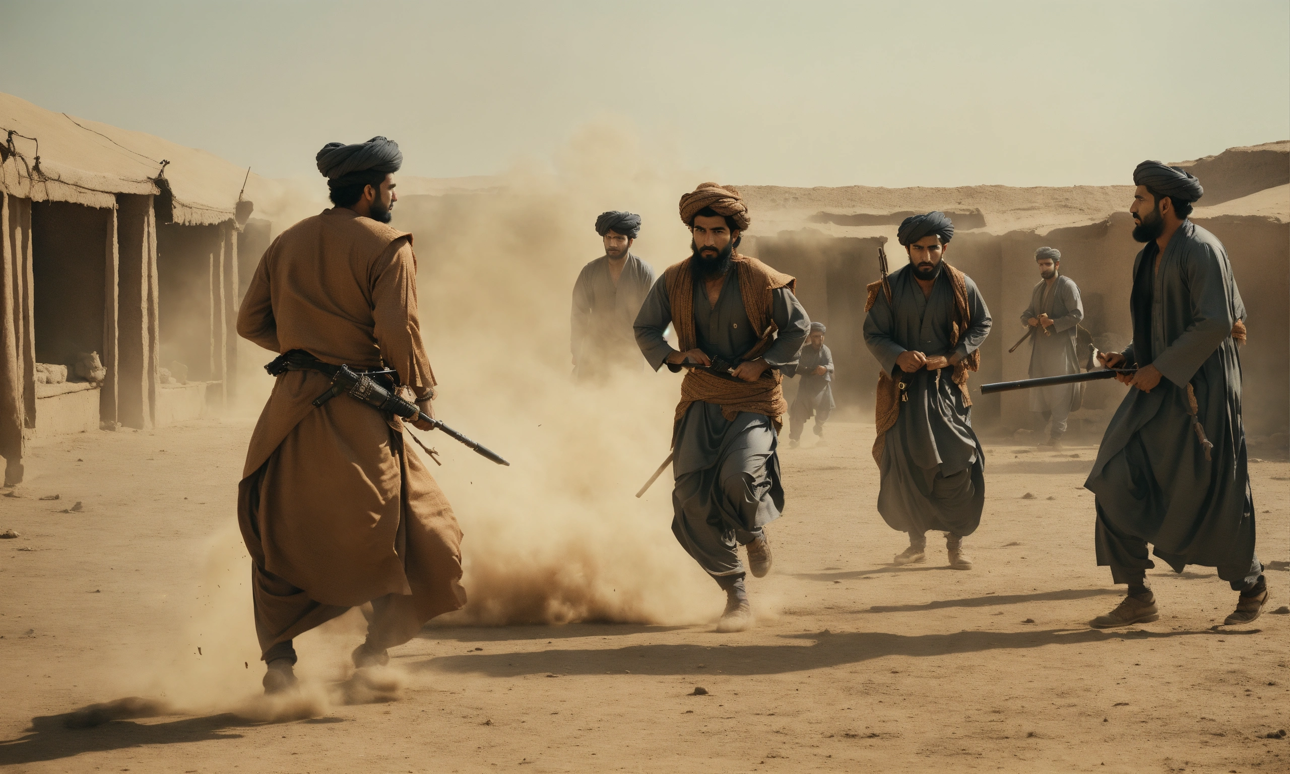 Fight of afghan men in a kotha, wide front shot, interior day time, 8k, luxcorerender, earthly colour, cinematic photography, real humans, real images, matte finish, shot on arri anamorphic, extreme wide shot, smooth, sharp focus, ornate, highly dynamic, particulate, hyperreal, wide shot.