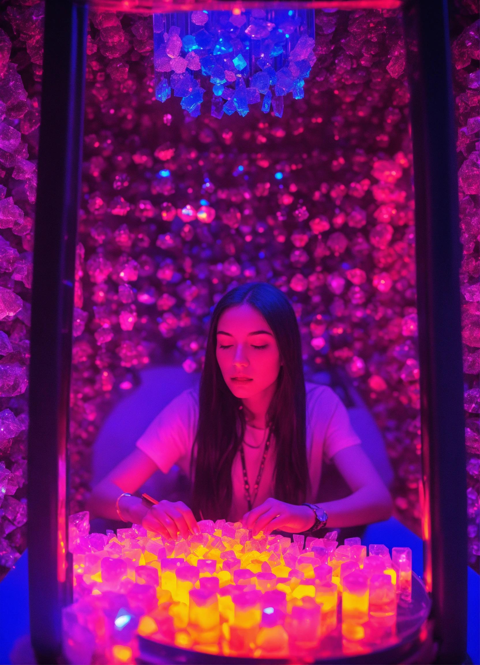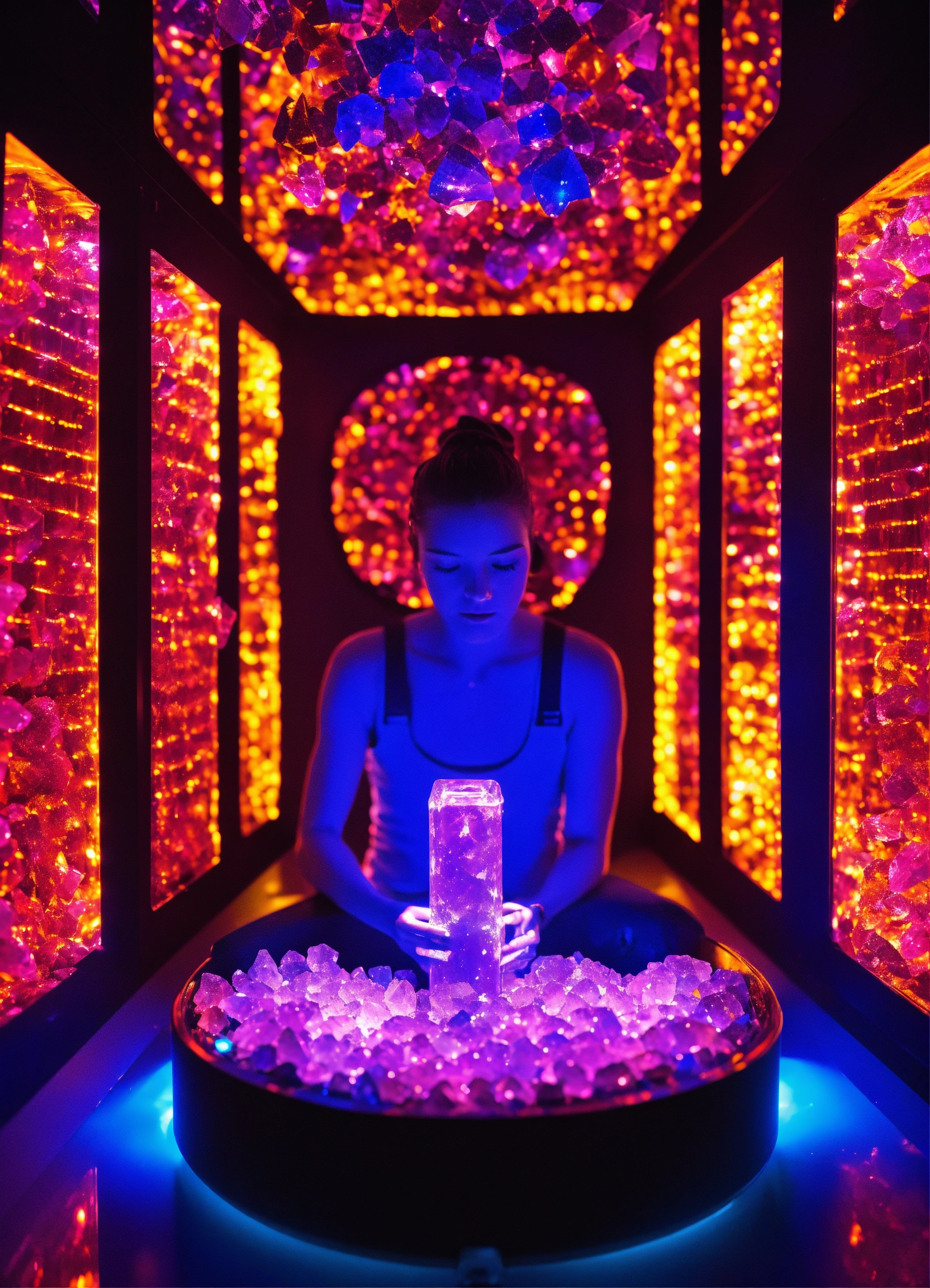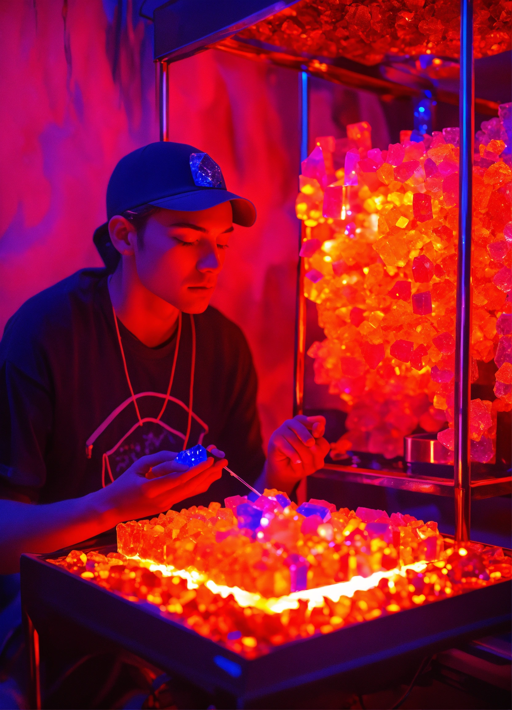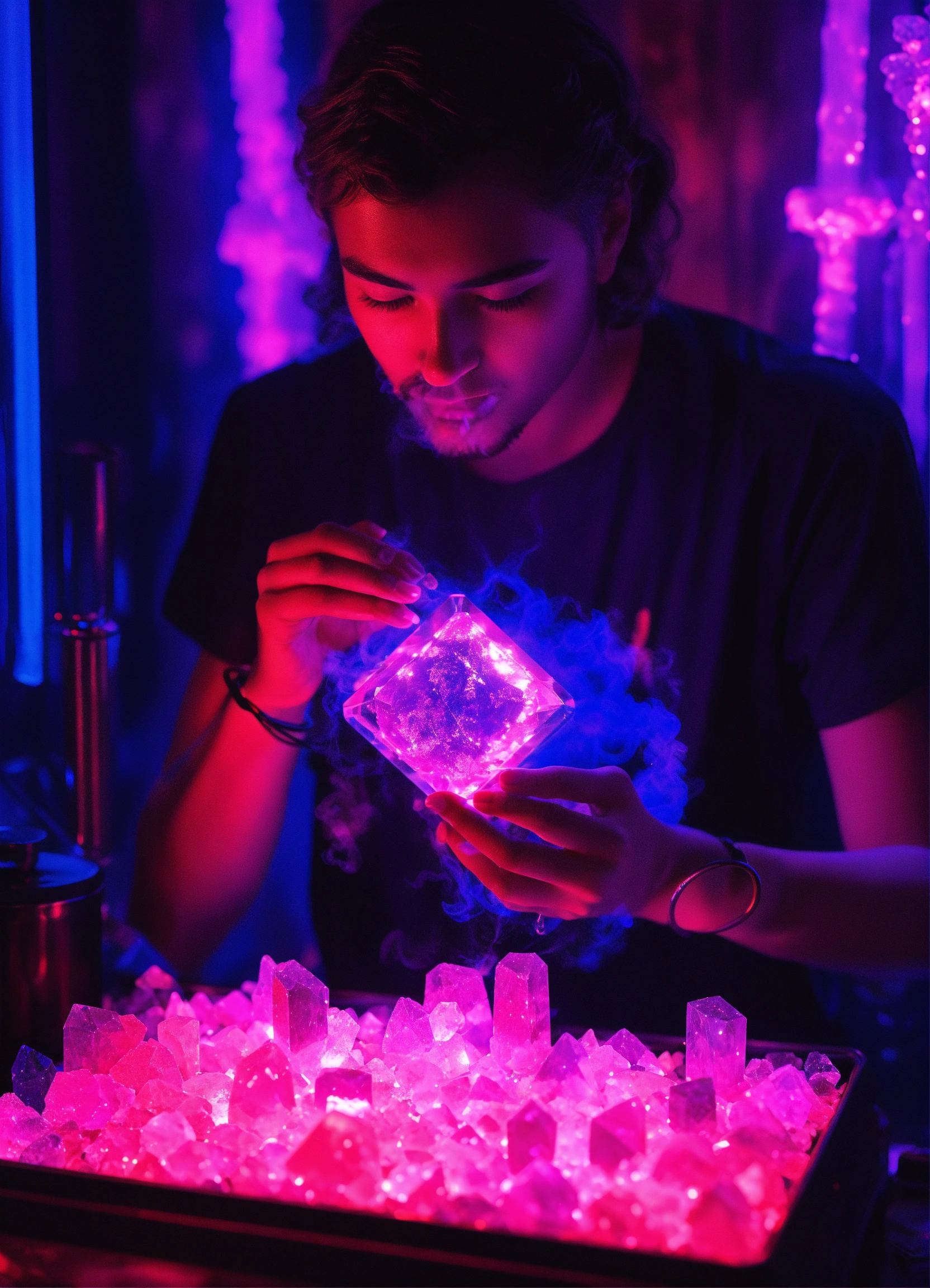 A sapphire individual consuming dmt crystals in a metal vaporizer in a dmt black light neon room experiencing crystal dmt neon ascension