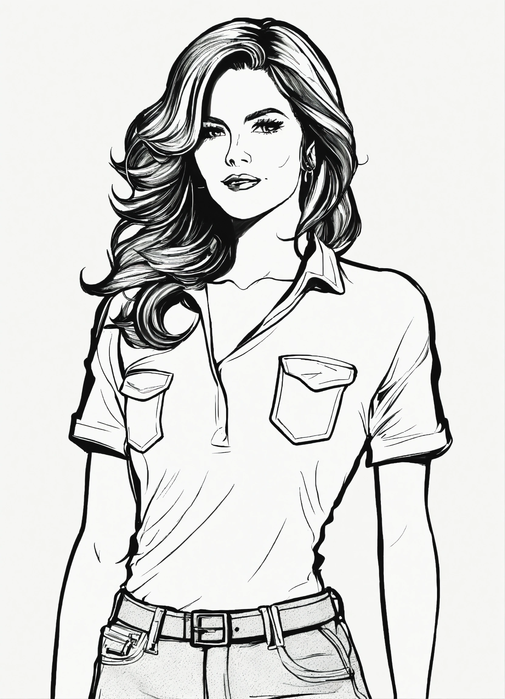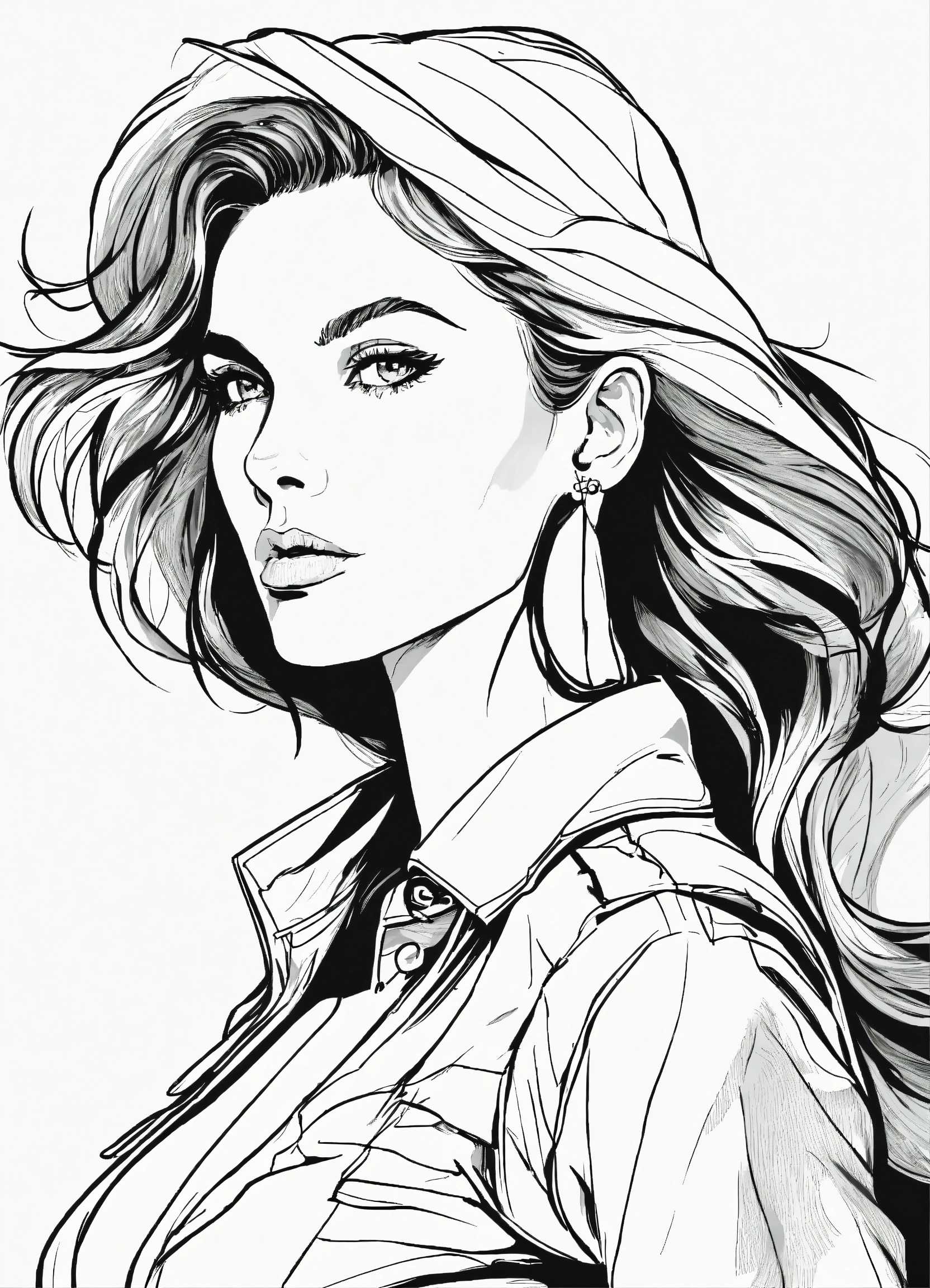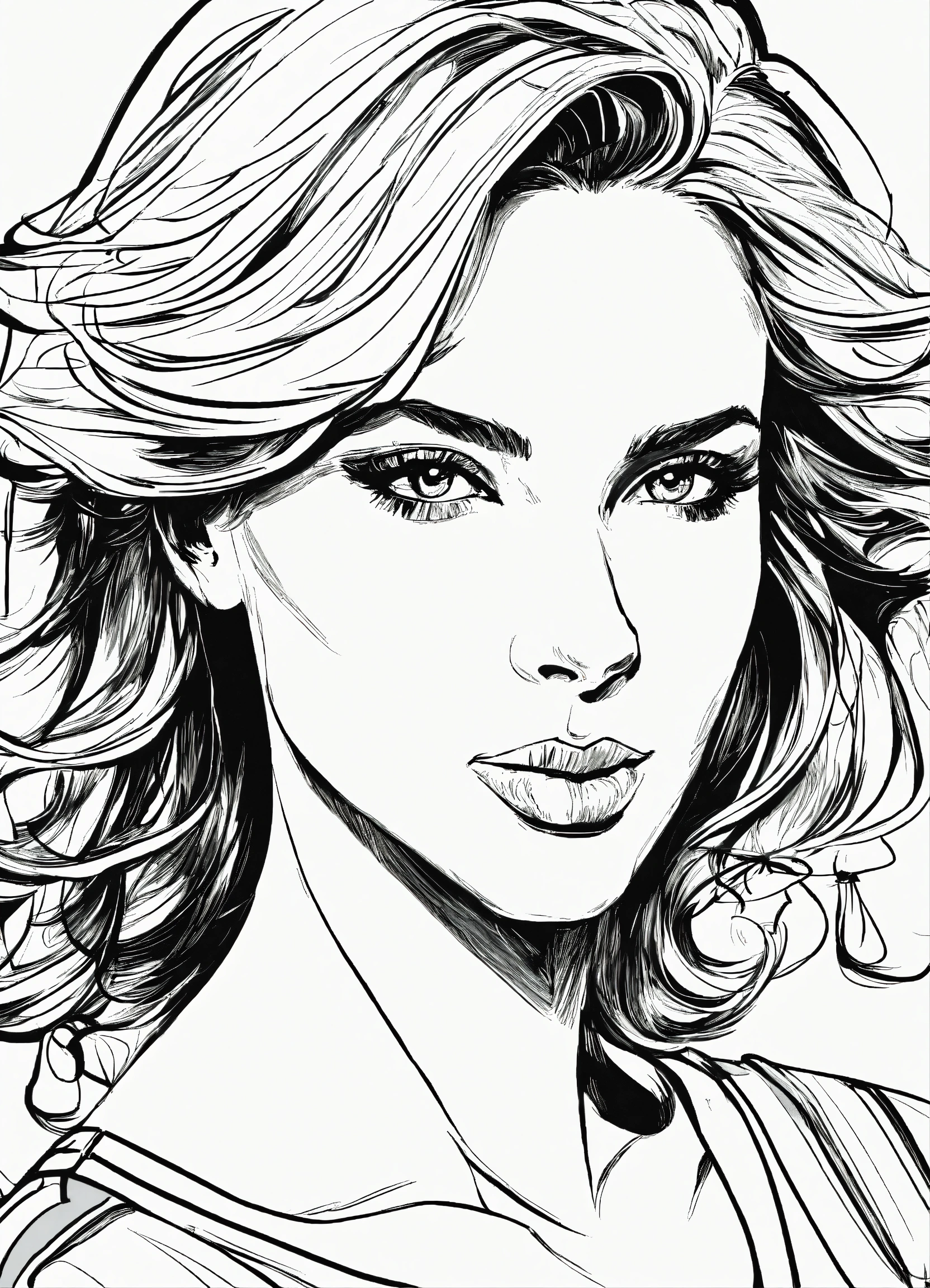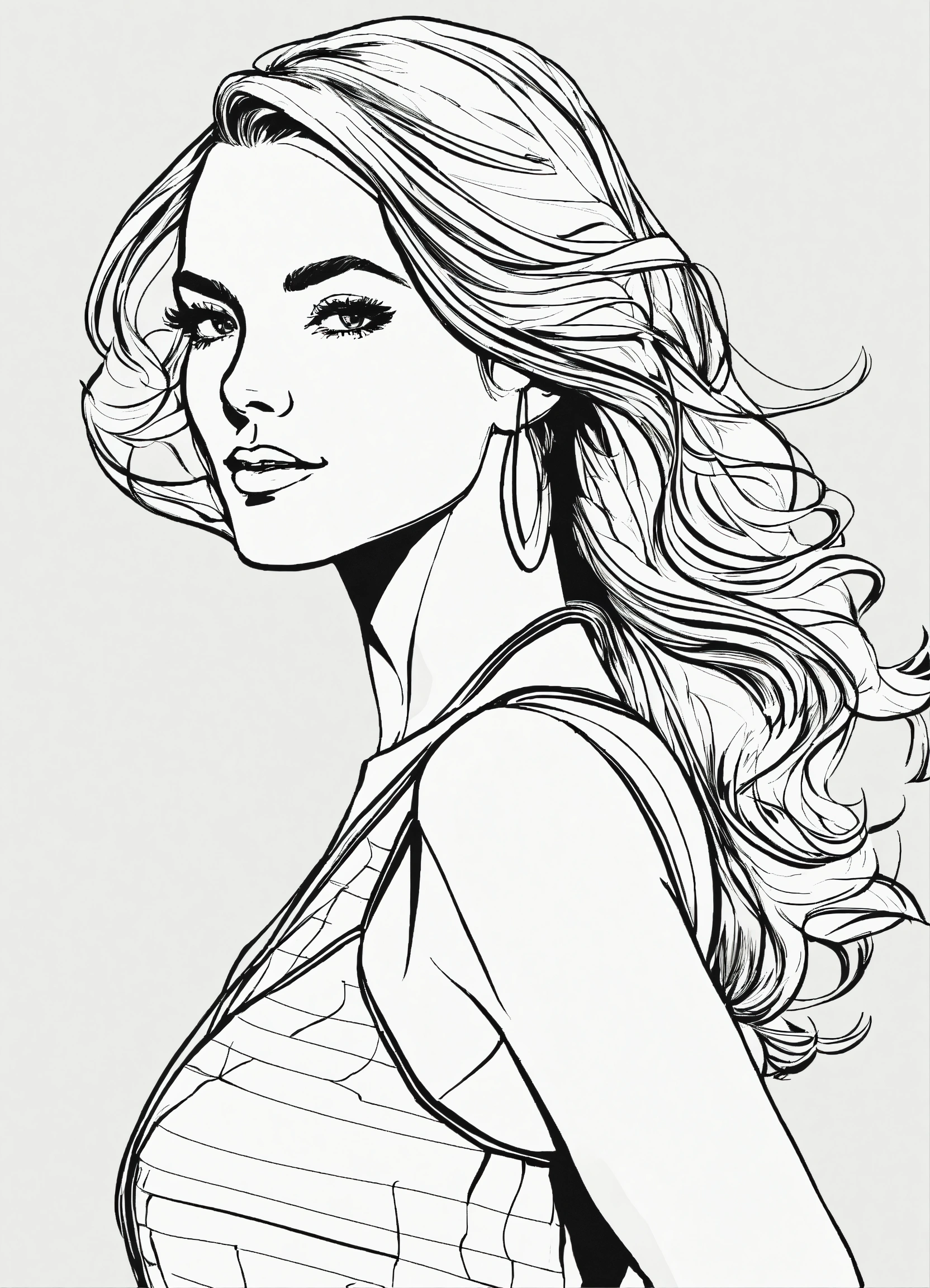 Black and white line drawing, soccer mom, glamorous, upper body, lines, shoulders, white background, clip art