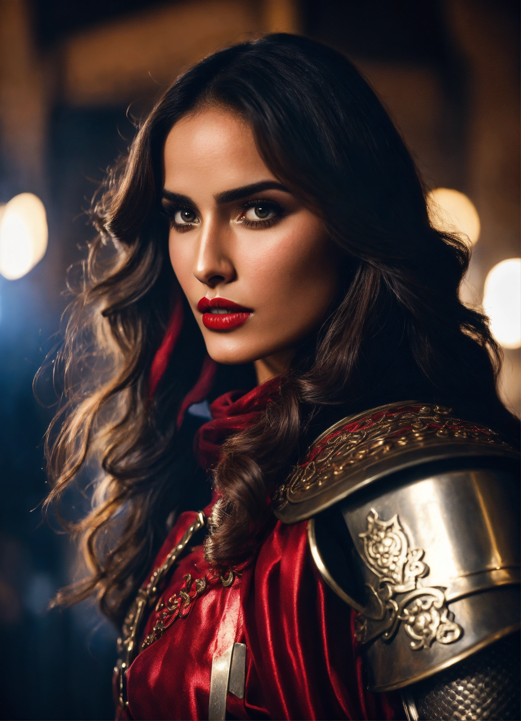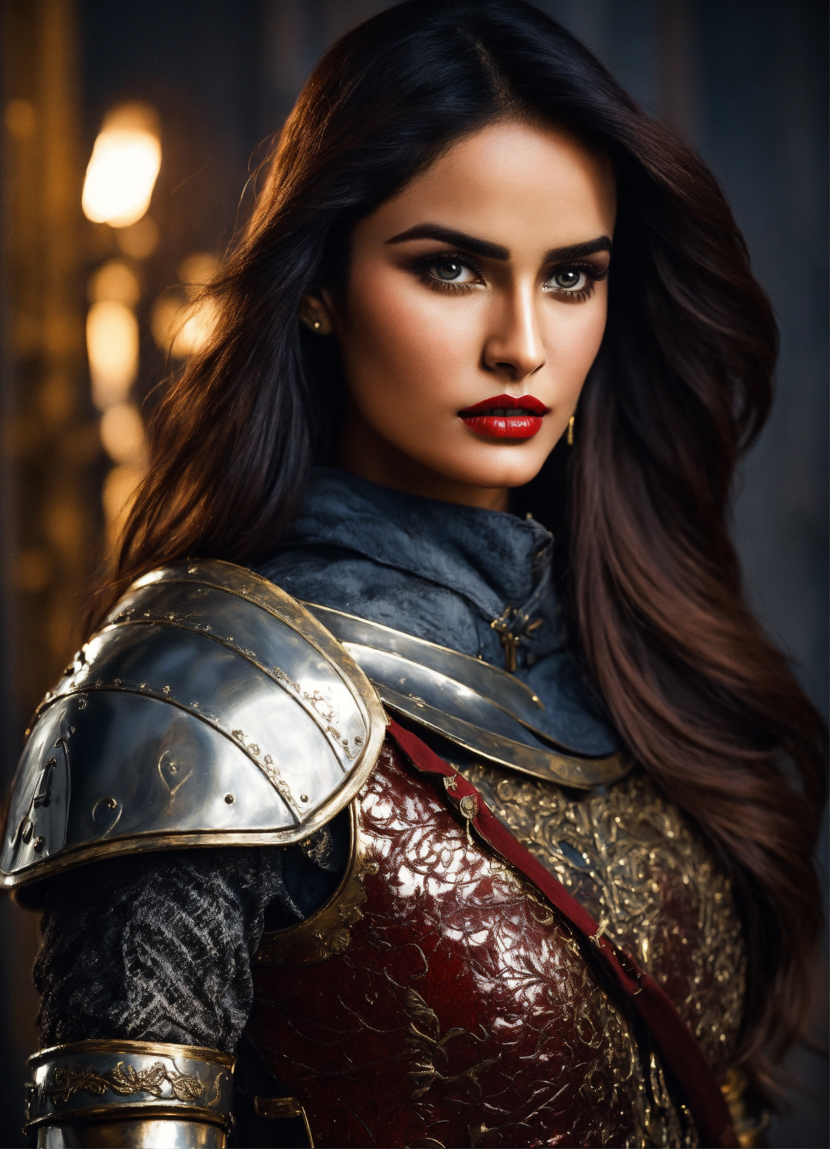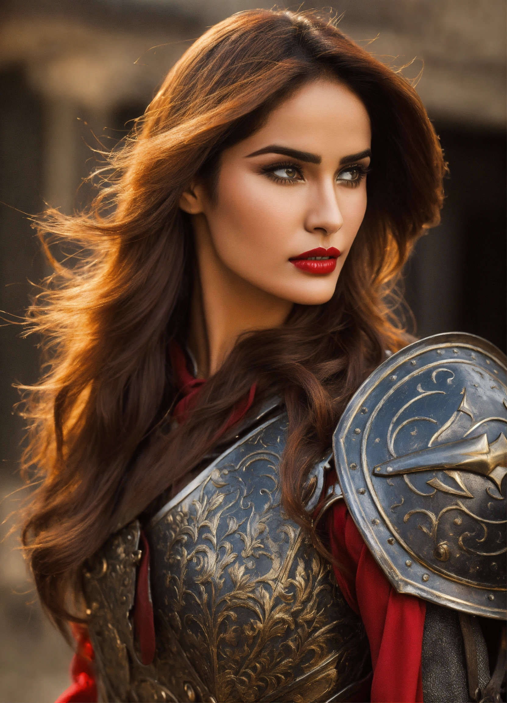 Photo quality color portrait of young beautiful mehreen syed as a assassin knight in armor with flowing hair and red lips and stern expression
