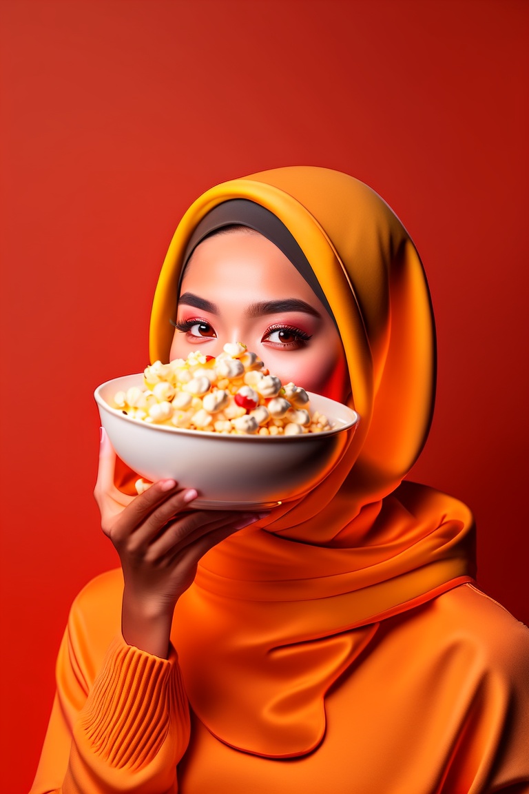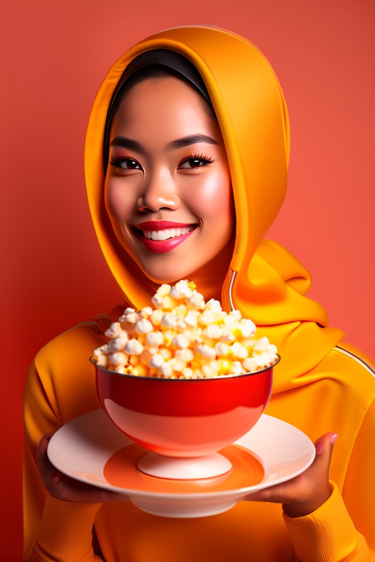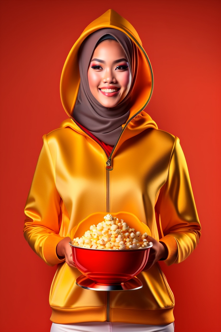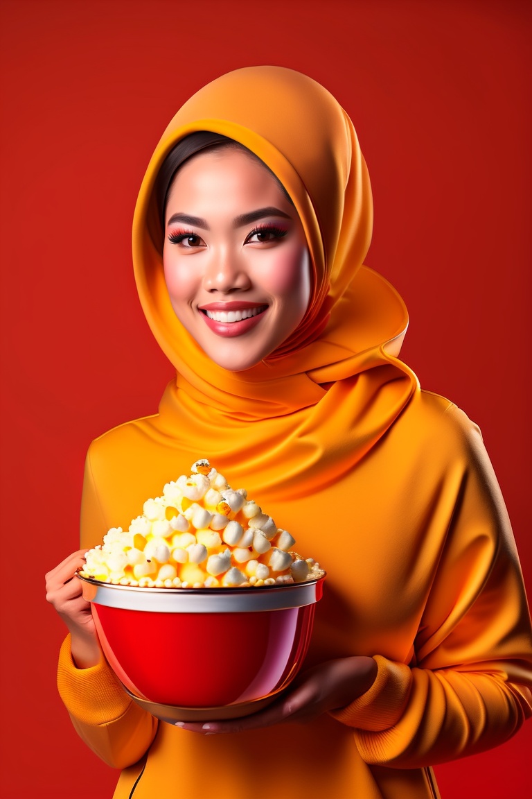 Cute malay woman wearing hijab holds bowl of popcorn, with casual yellow hoody, isolated in red color background --ar 3:2 --style raw
