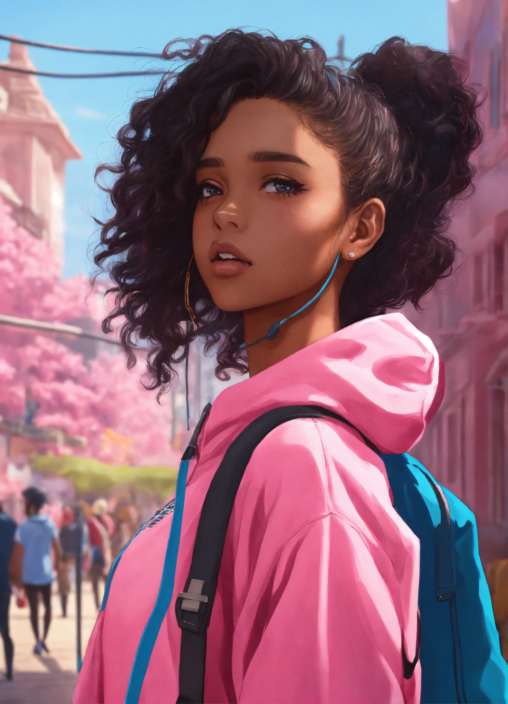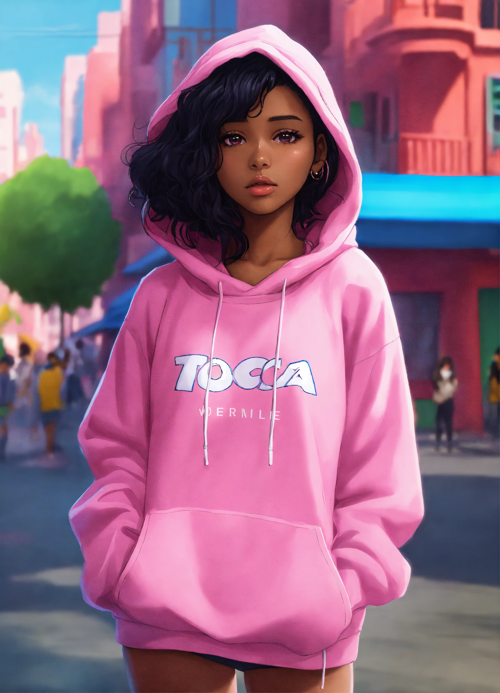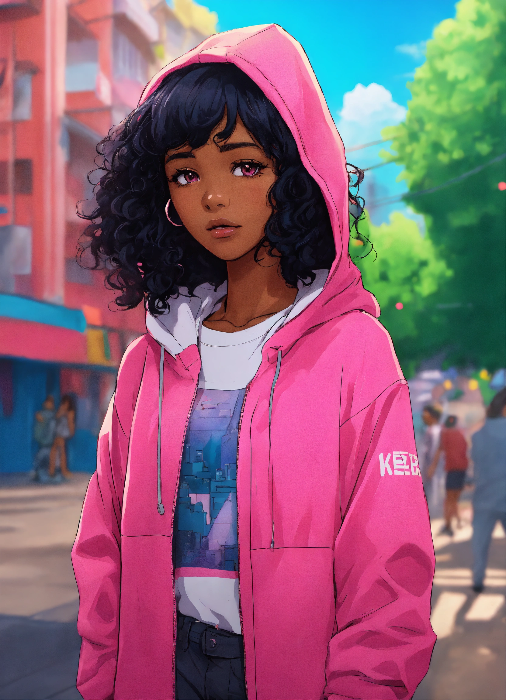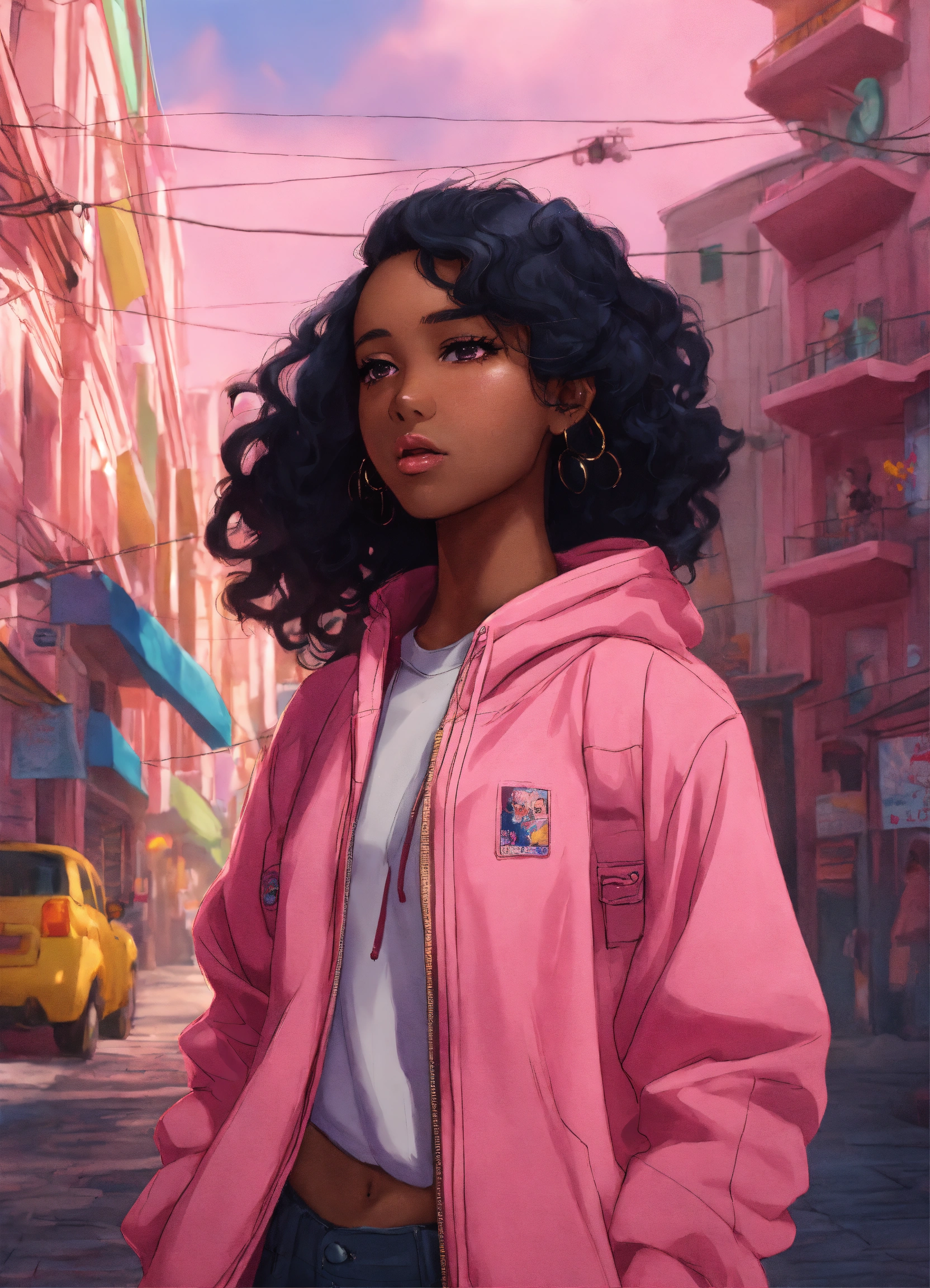 Anime; cartoon; ultra realistic; pink city, young afican girl mixed race, named laura rijo, wearing pink hoodie, wavy black hair; in a anime city, ultra realistic, toca boca life world perfect, no imperfection, 4k, sad, chocked