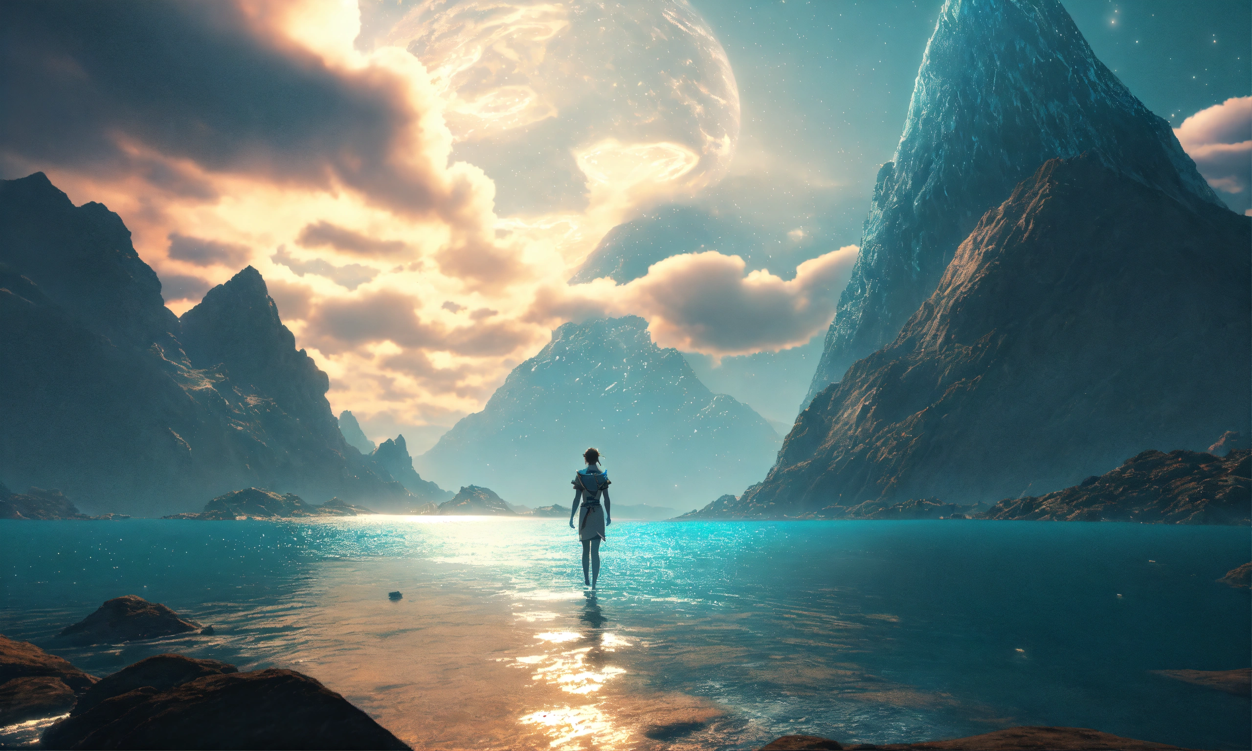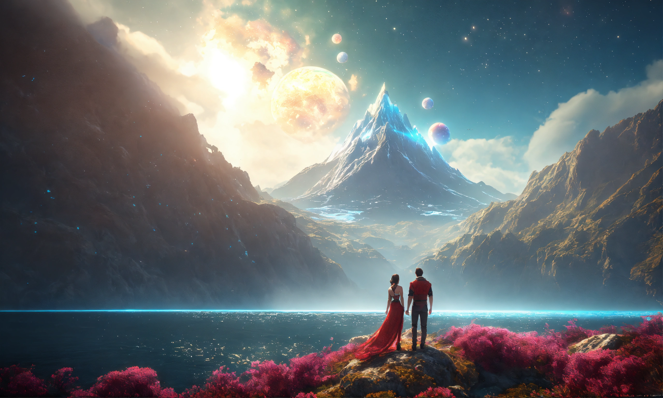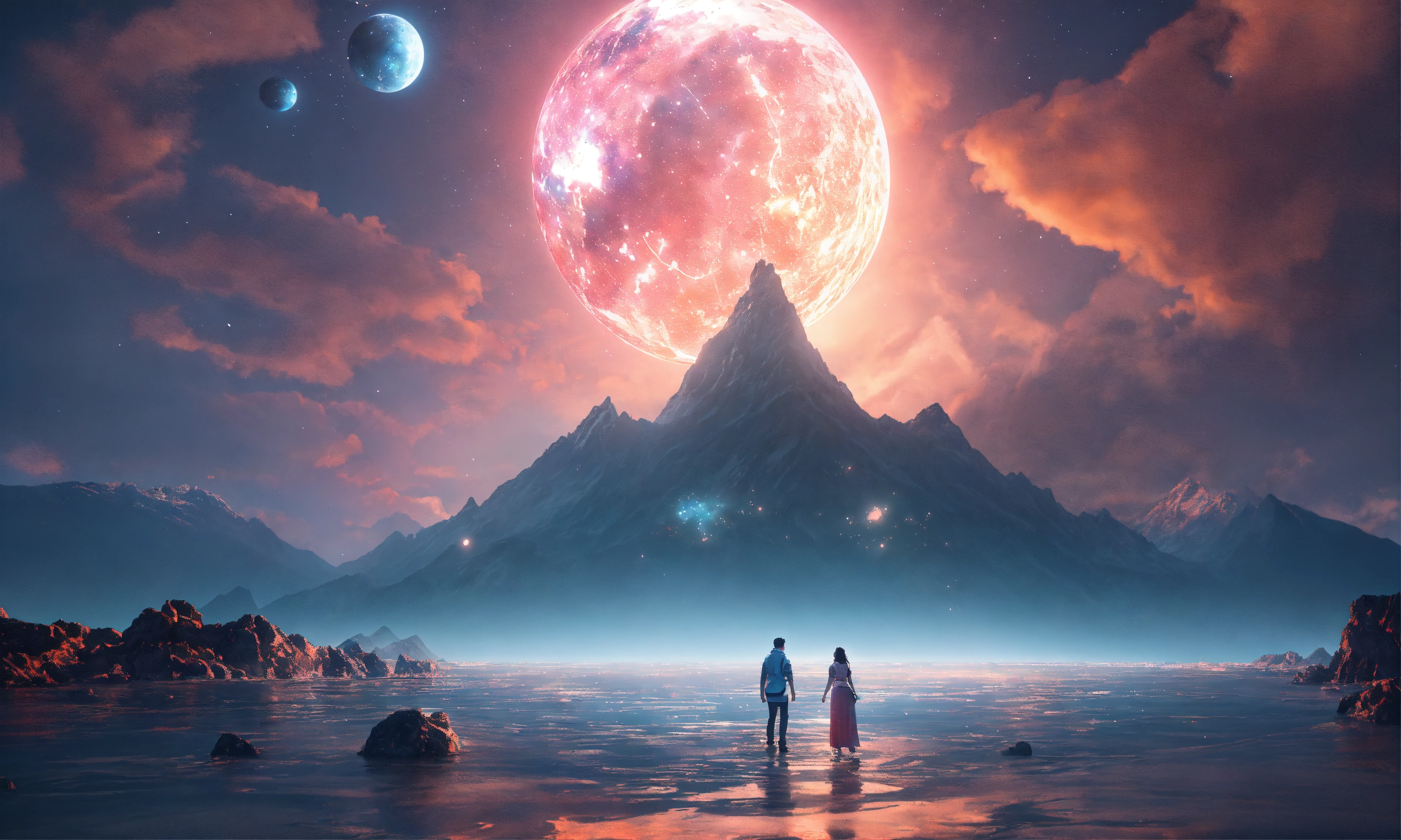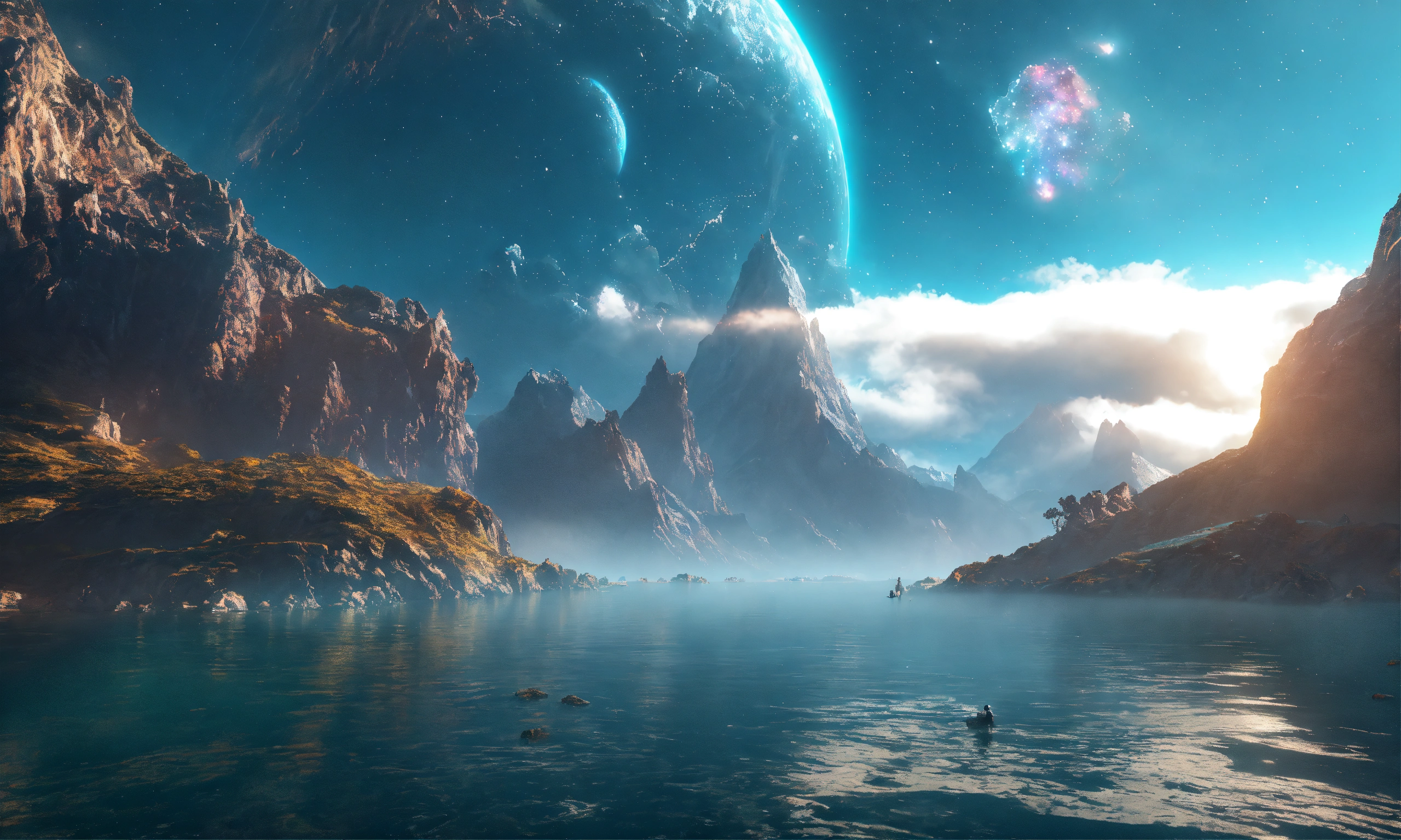 God and goddess in love foreground, being reincarnated into a ocean world, sky nebula, artstation scifi 3d scene of a showing mountains, maximalism, ambient occlusion, atmospheric haze, unreal engine, hyper realism, realistic shading, cinematic composition, realistic render, octane render, detailed textures, photorealistic, wide shot