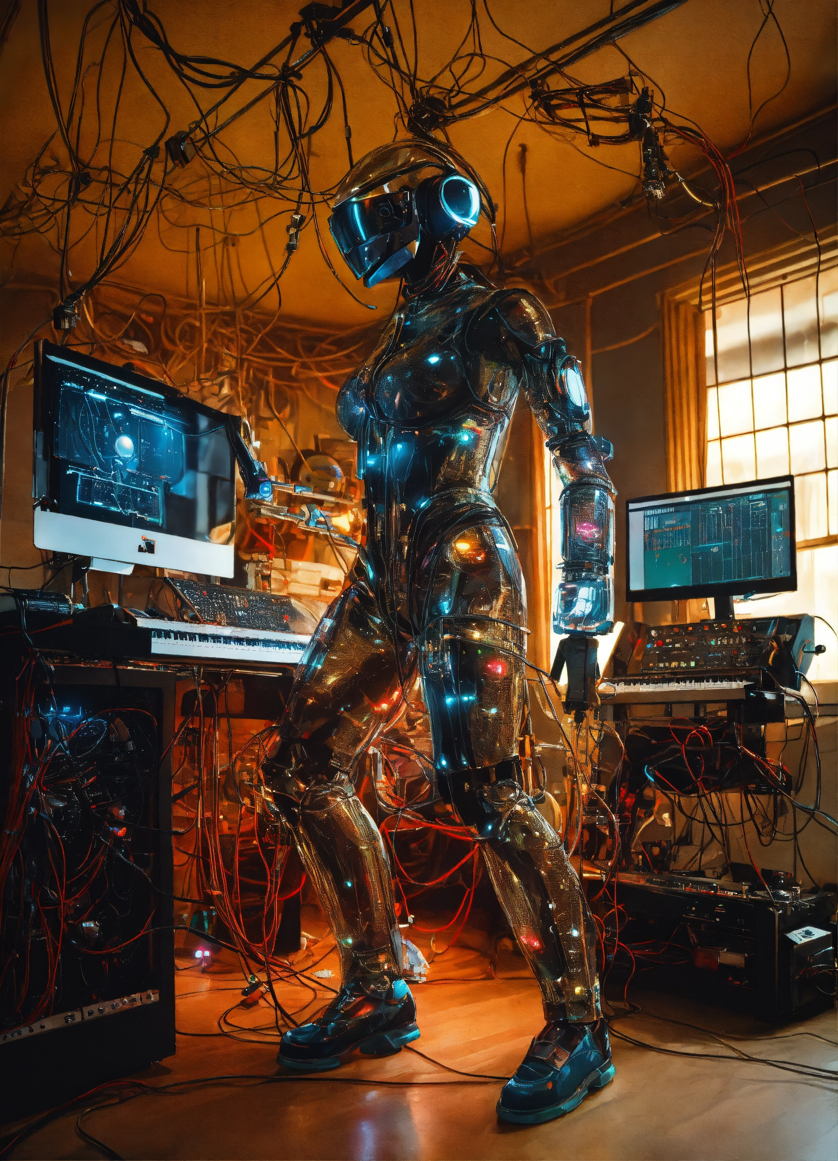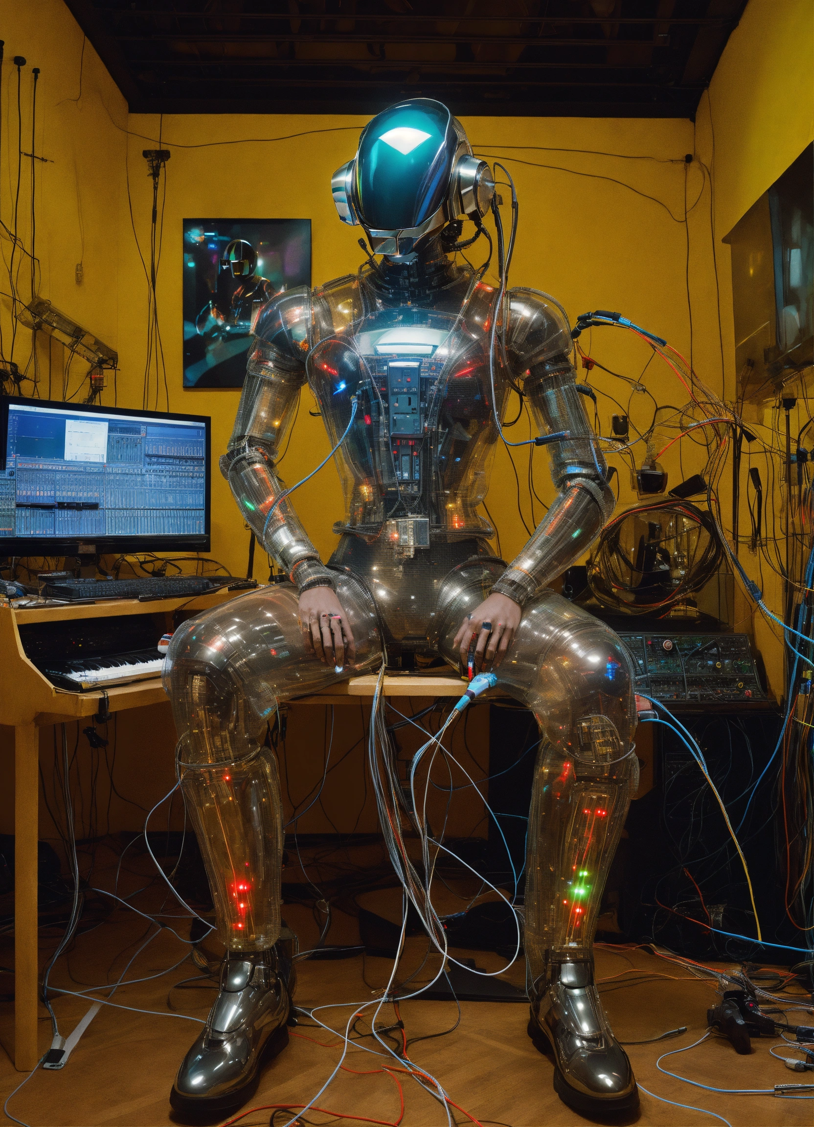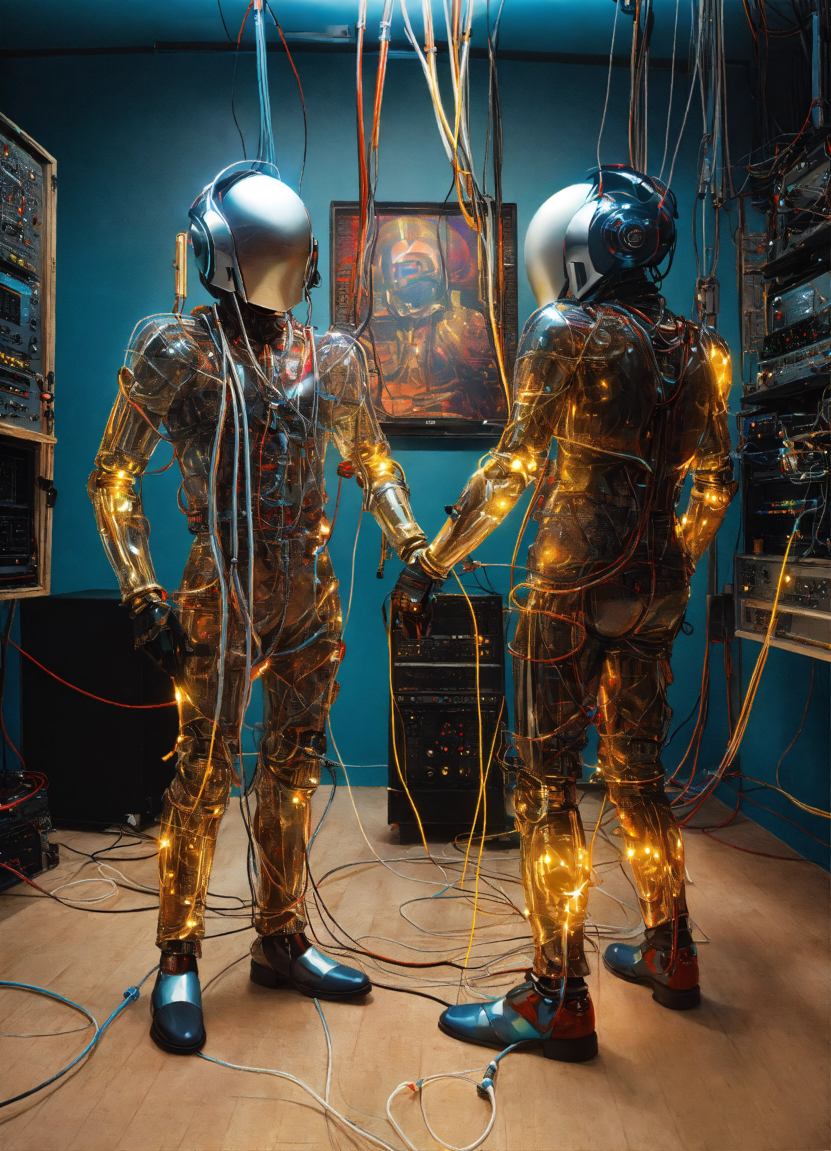 Body portrait photography, transparent daft punk robots in a music studio full of cables and wires and led, 80 degree view, art by sergio lopez, natalie shau, james jean and salvador dali