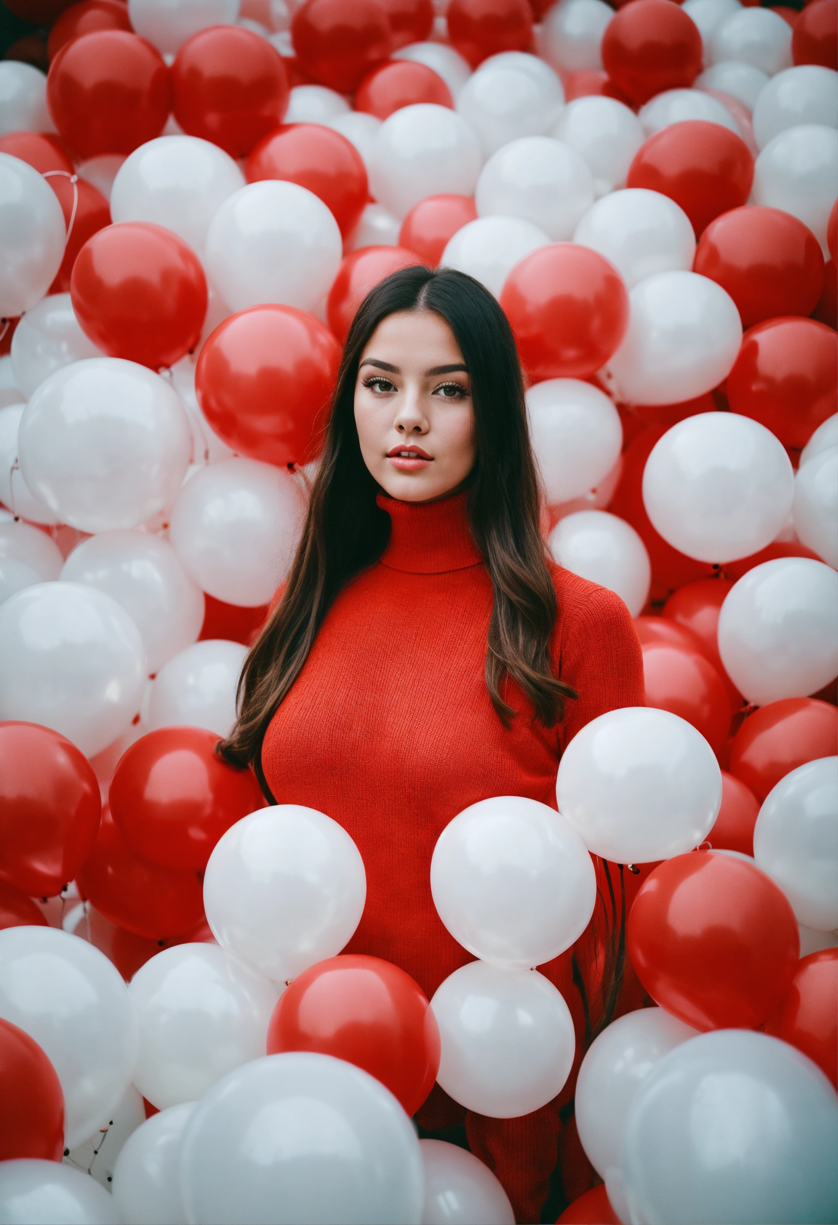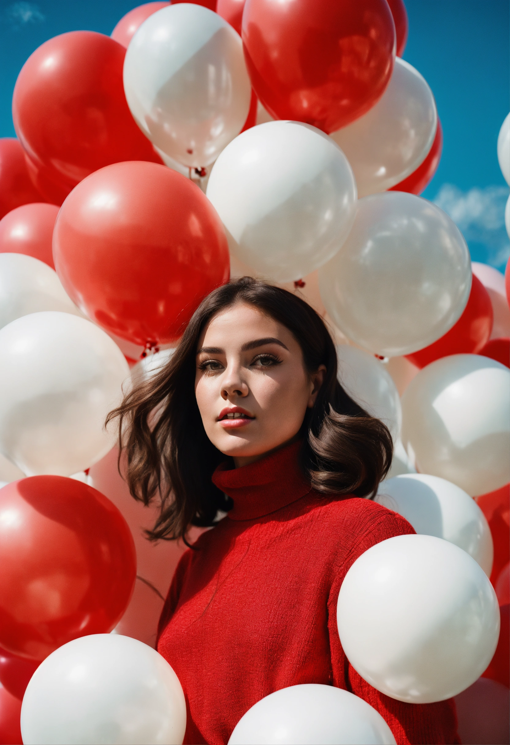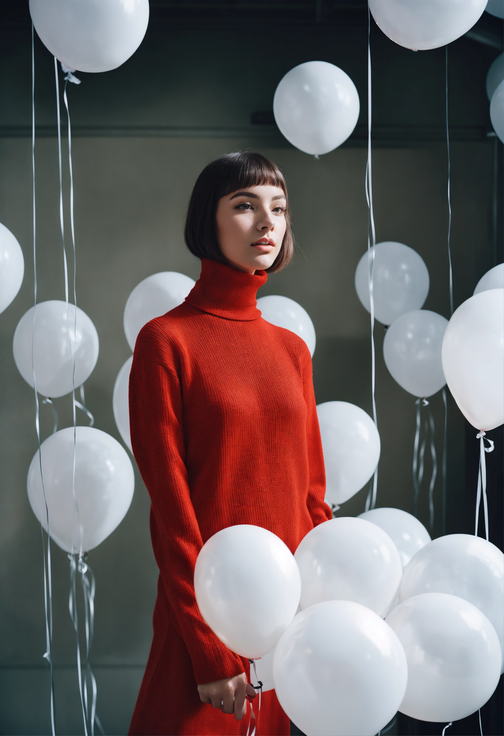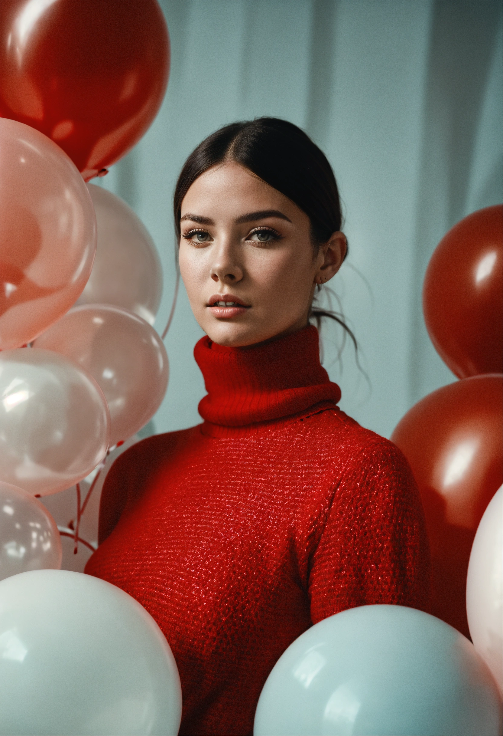 Fashion portrait photo of beautiful young woman from the 60s wearing a red turtleneck standing in the middle of a ton of white balloons, taken on a hasselblad medium format camera, model, 8k resolution, hyper realistic, day, 35mm film, editorial, high fashion, 2023