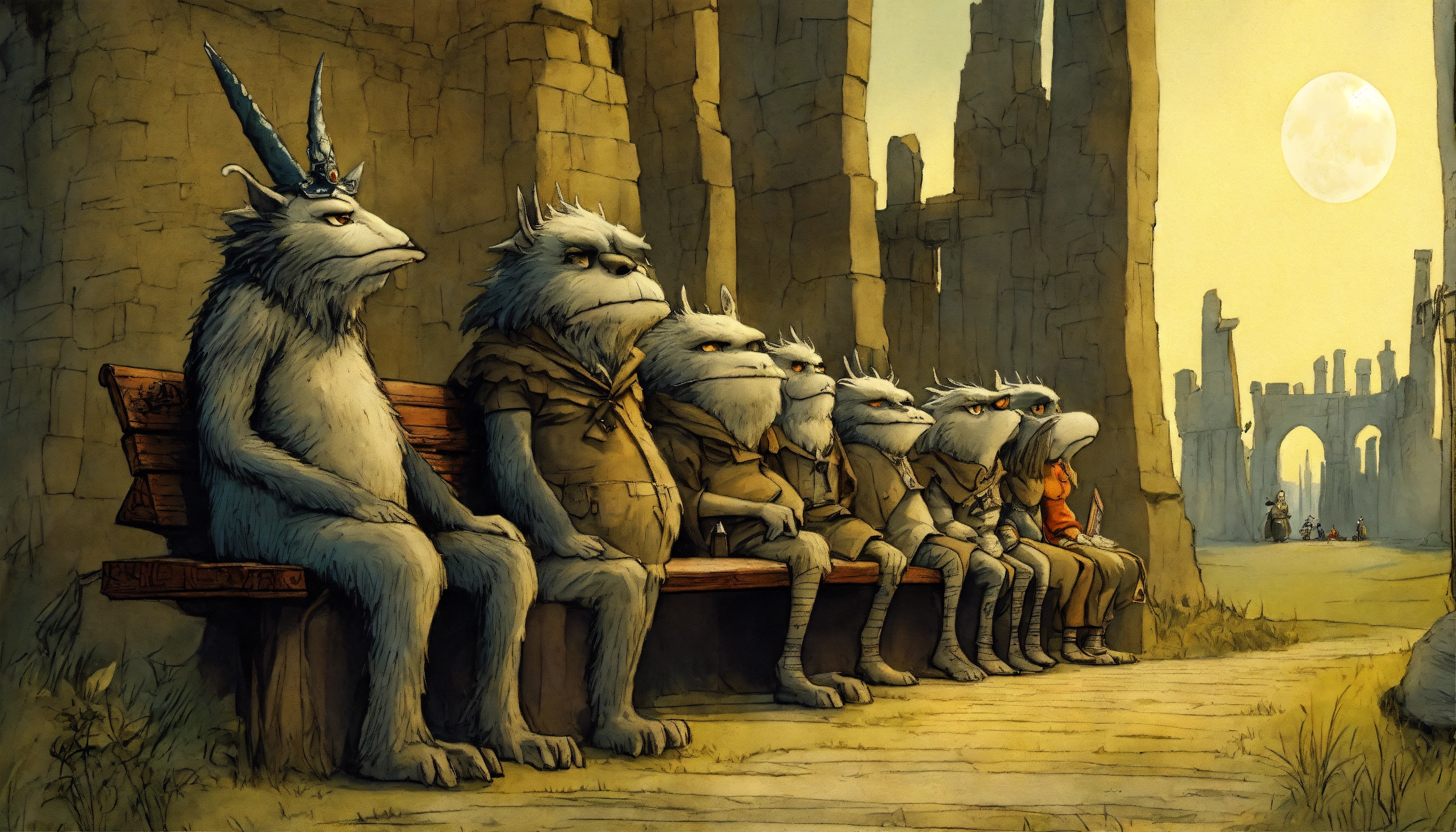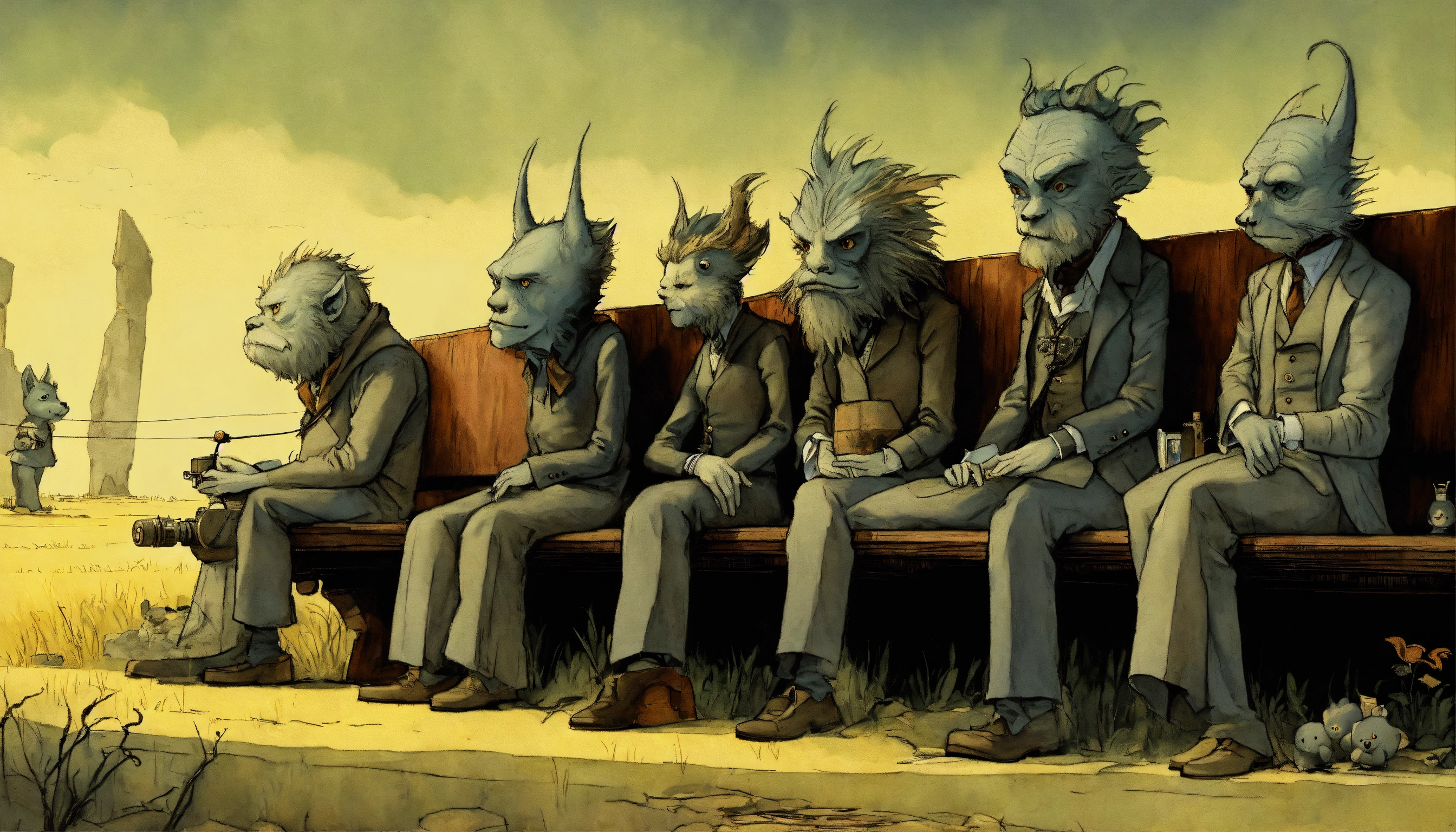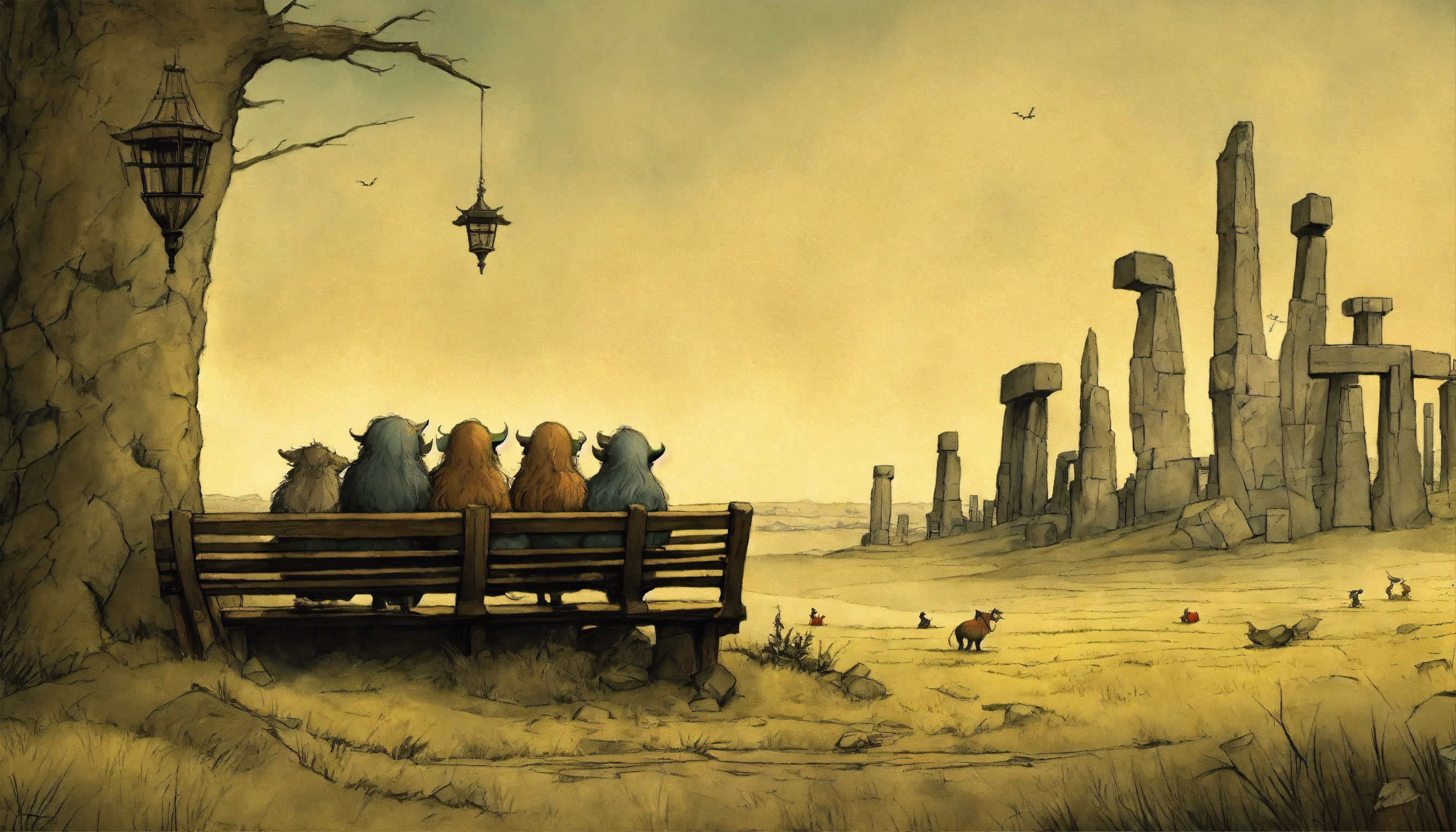 By gris grimly, maurice sendak, monsters sitting on a bench looking at stonehenge, in the style of jean-baptiste monge, tim burton, remedios varo, juni ito, giorgio de chirico 8k resolution concept art trending on artstation hyperdetailed medium shot, vignette 8k resolution hyperdetailed intricate liminal eerie precisionism dslr filmic