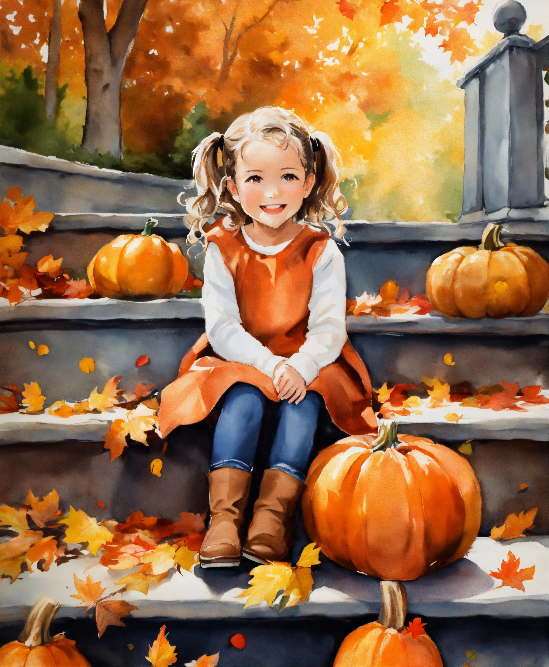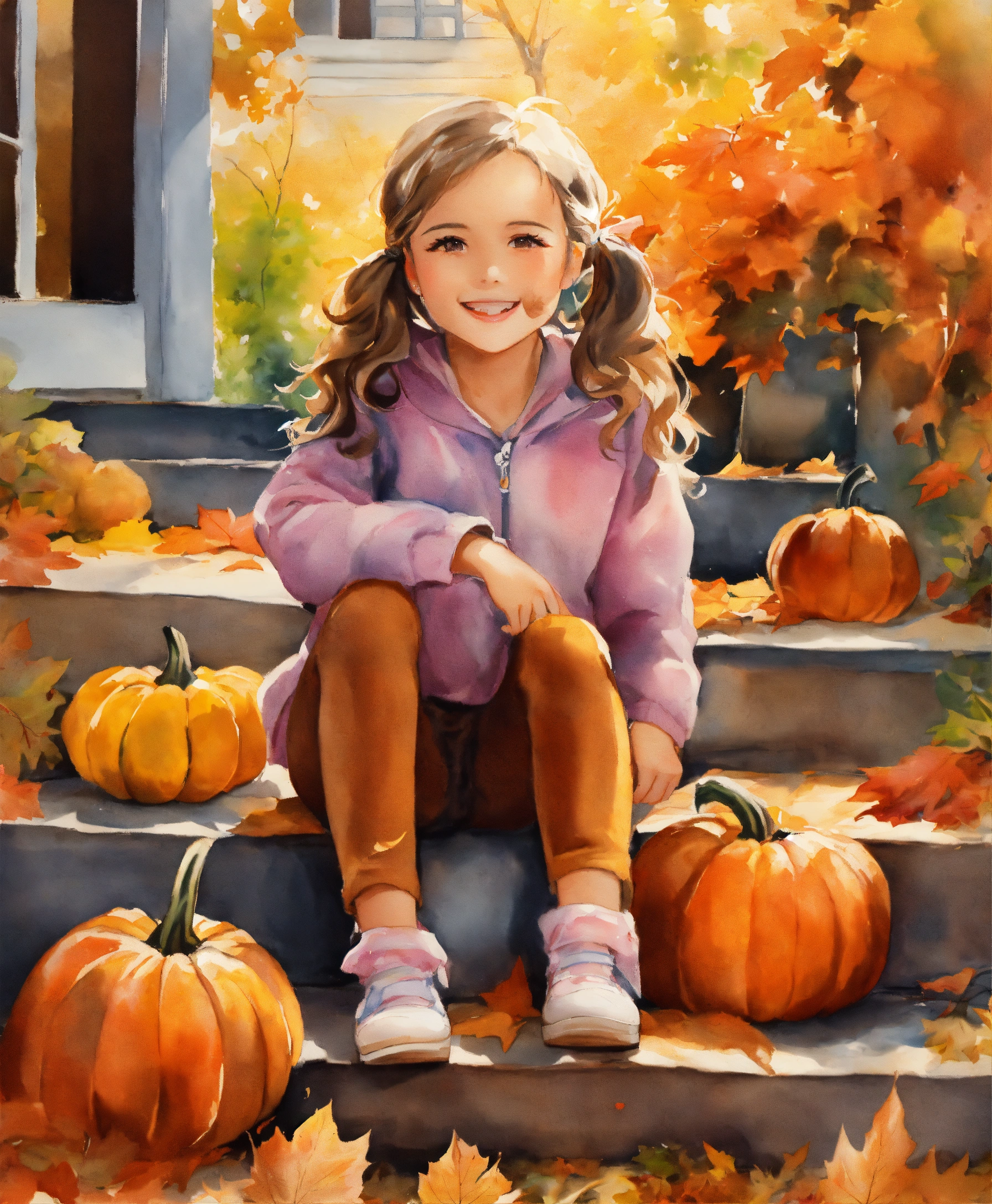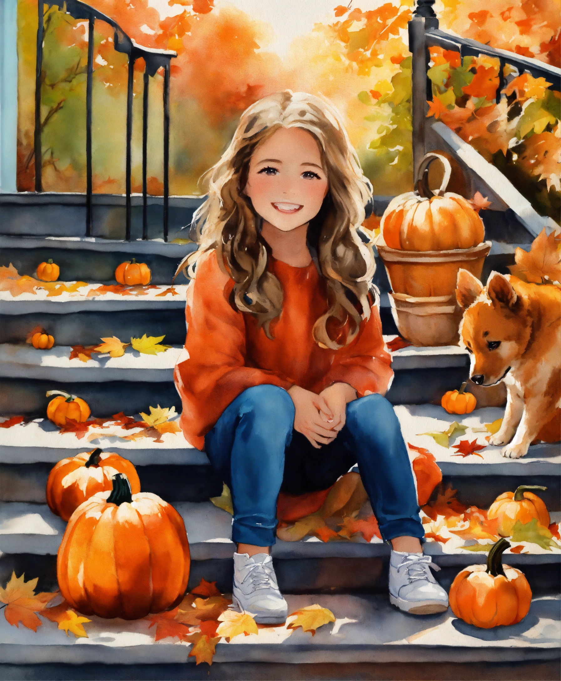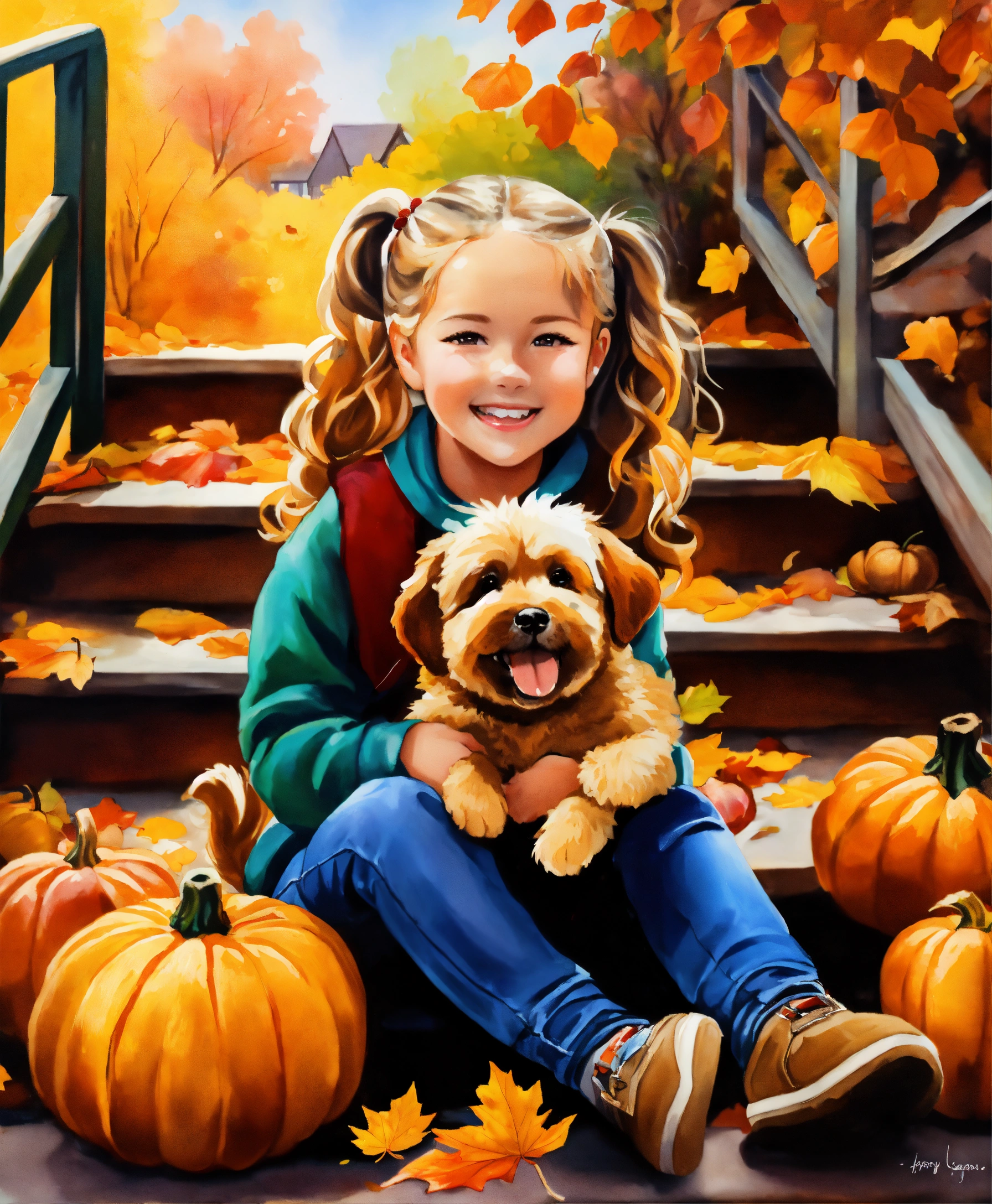 Water painting, happy beautiful little girl, hair in 2 ponytails with curls, sitting outside on steps, wearing fall colors, pumpkins on the steps, leaves falling from the trees, dog playing in the leaves
