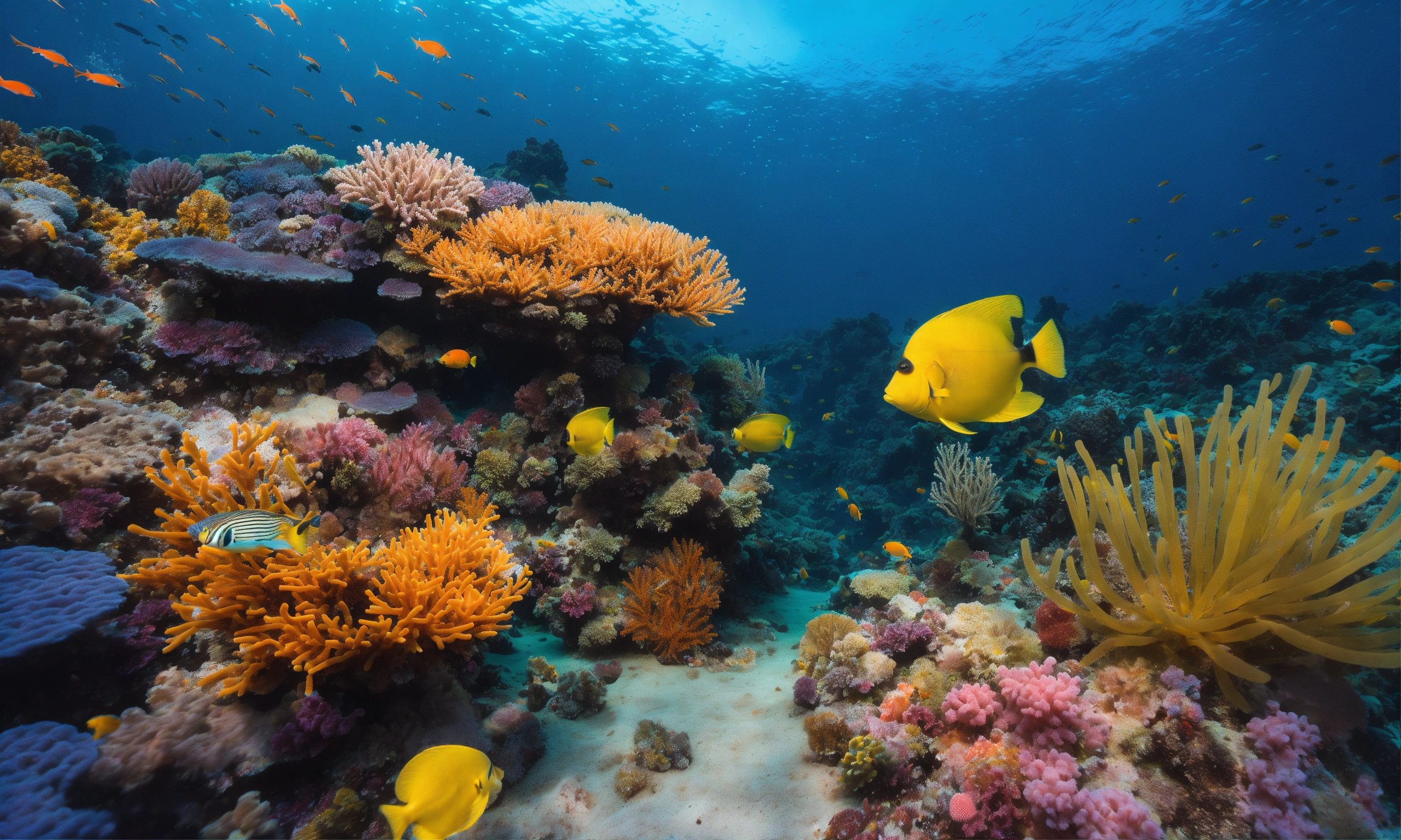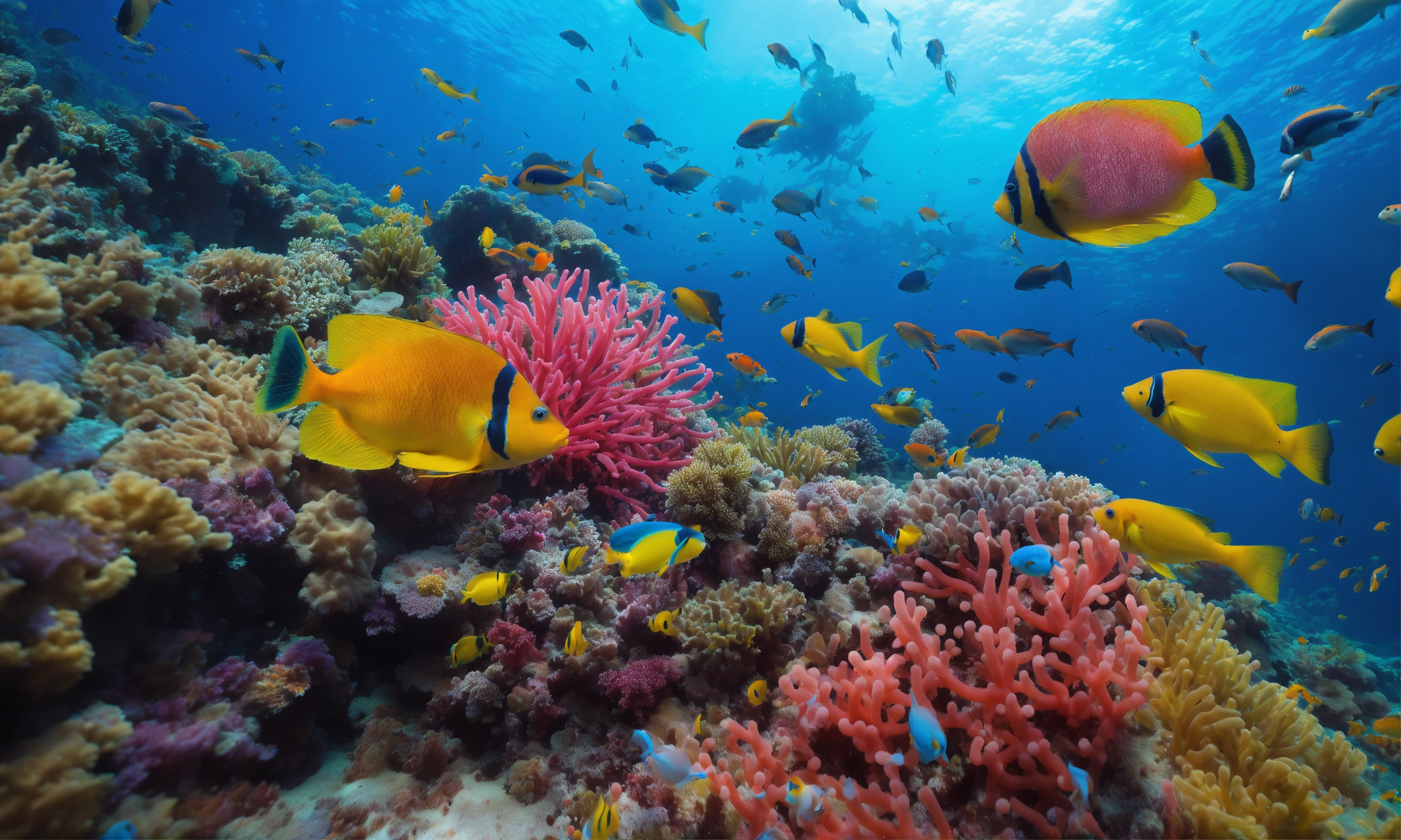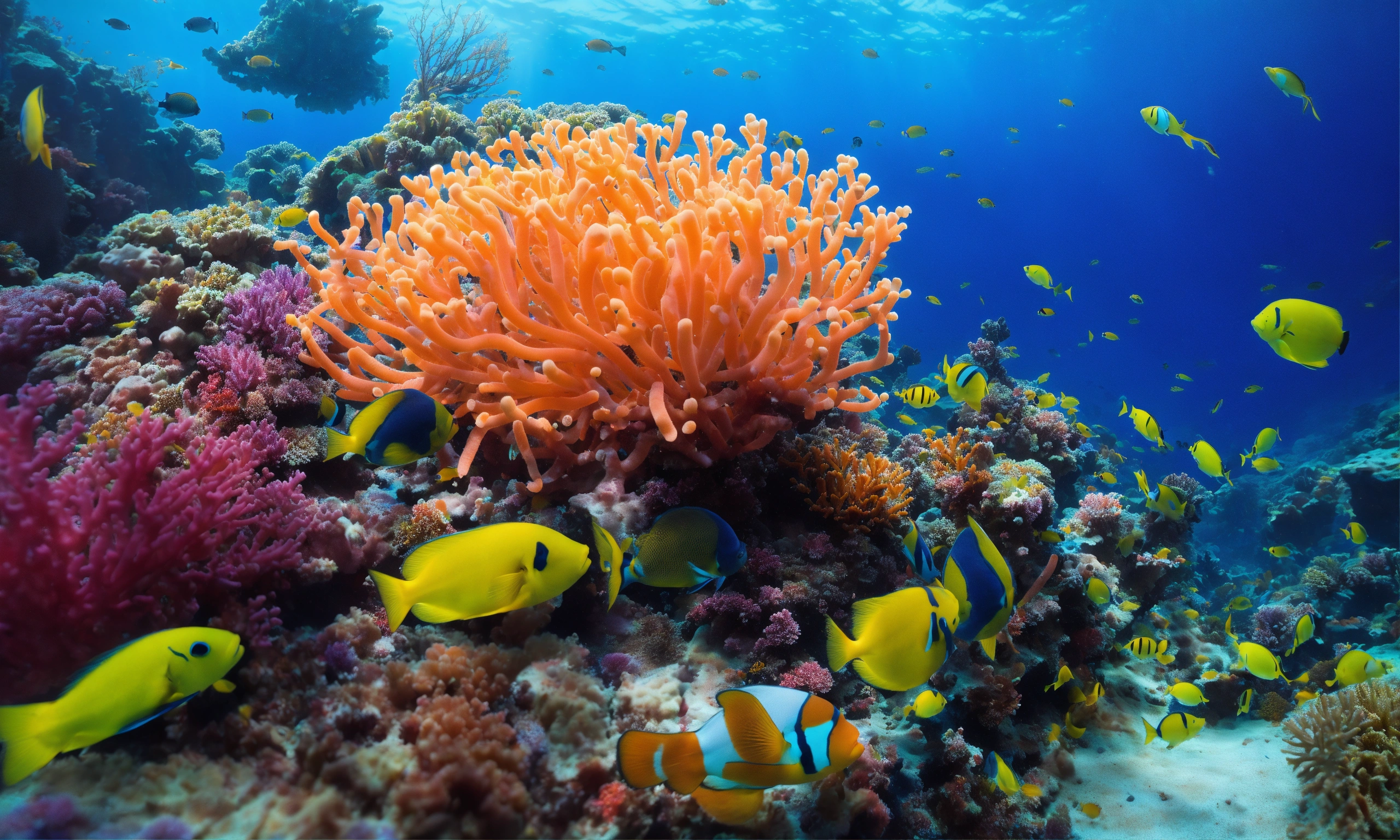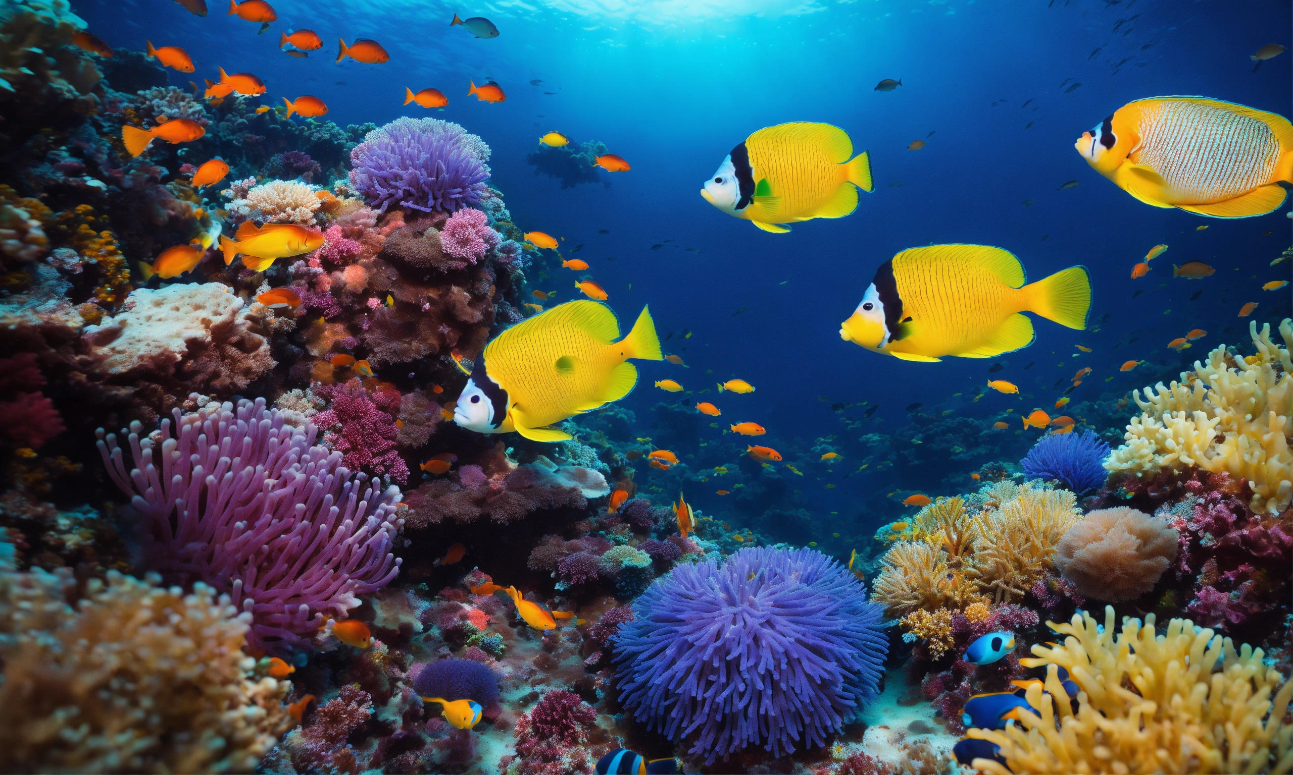 Ultra high res, deep ocean scene, vibrant coral reef, photographic realism, scuba diving perspective, colorful fishes1.8, swaying sea anemones2.1, intricate details, marine biodiversity, underwater photography, digital photography, wideangle lens, blue tones, high contrast, clear visibility, 4k resolution