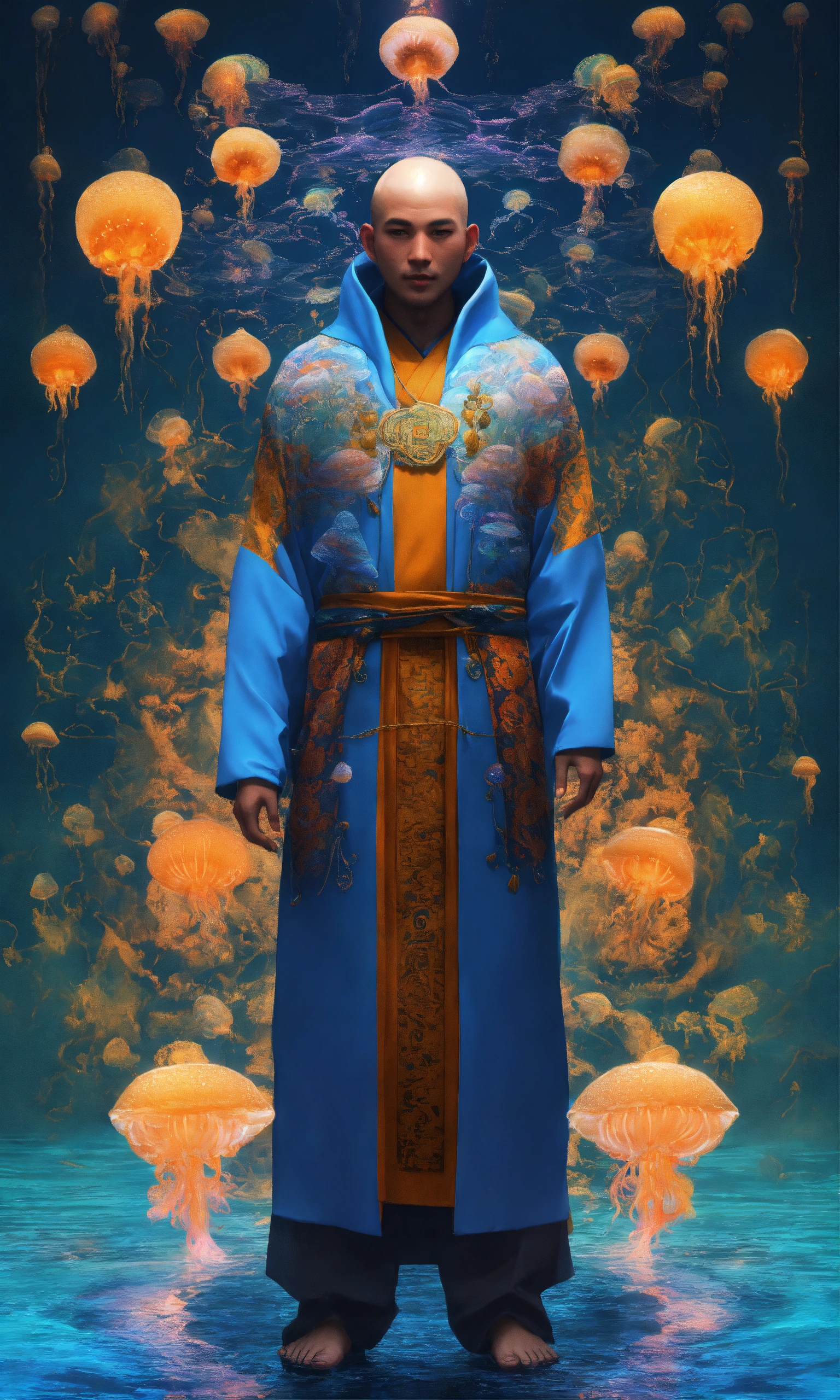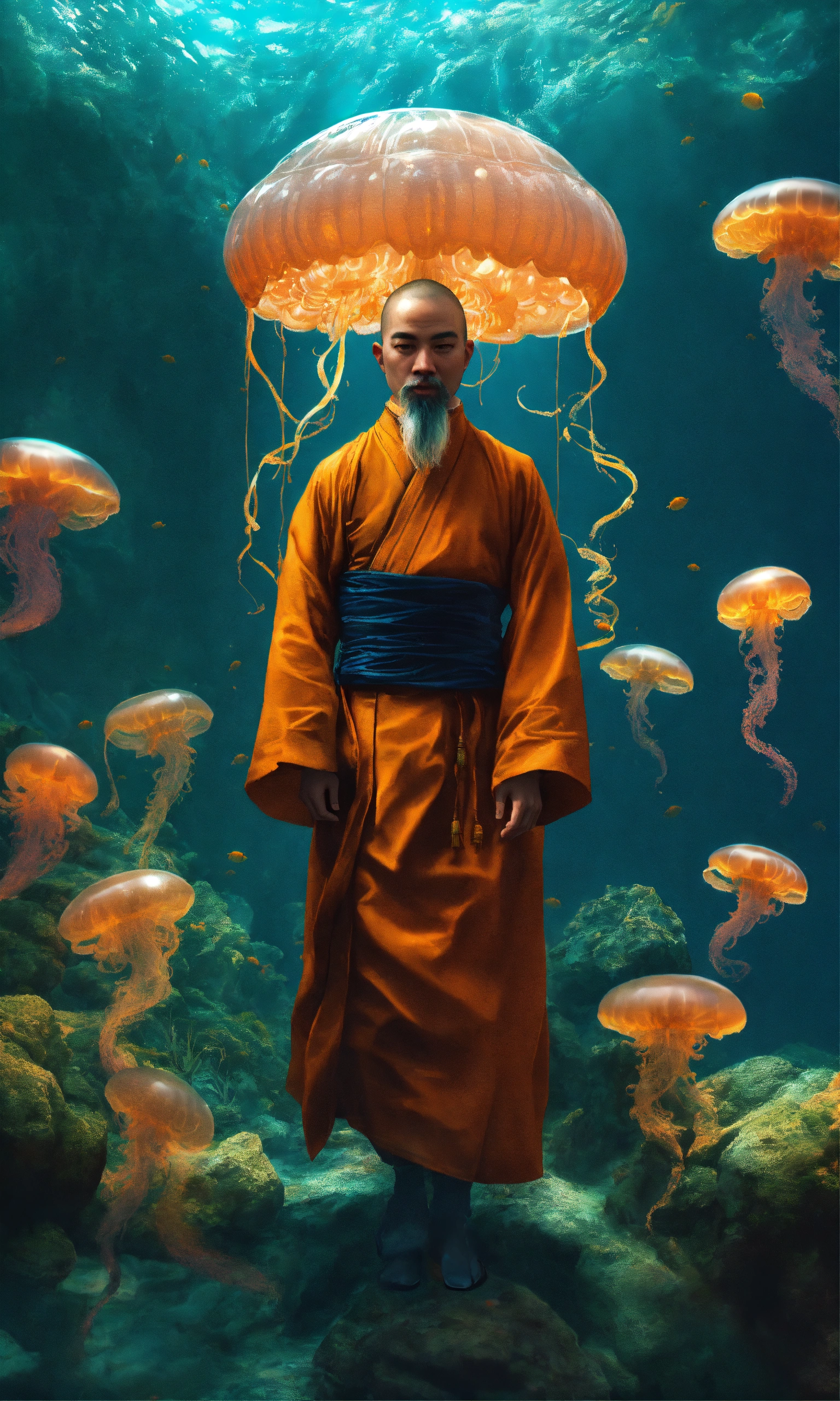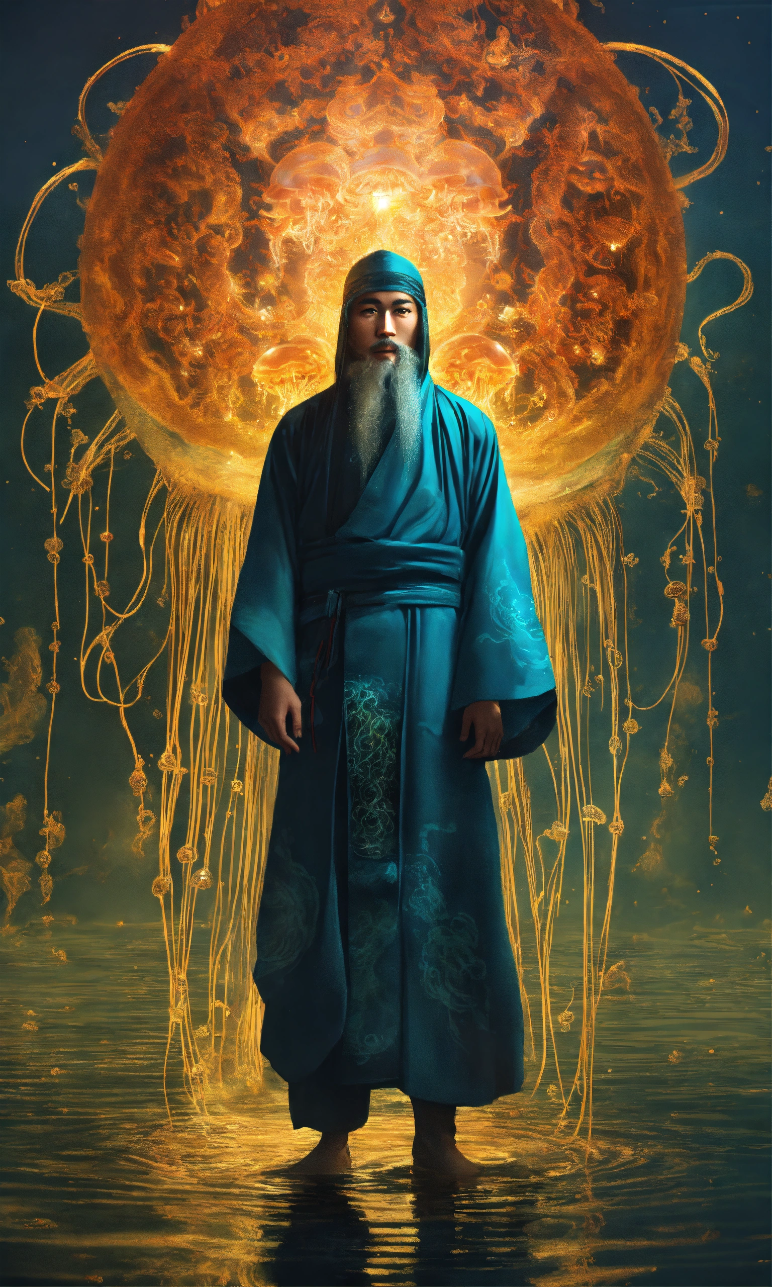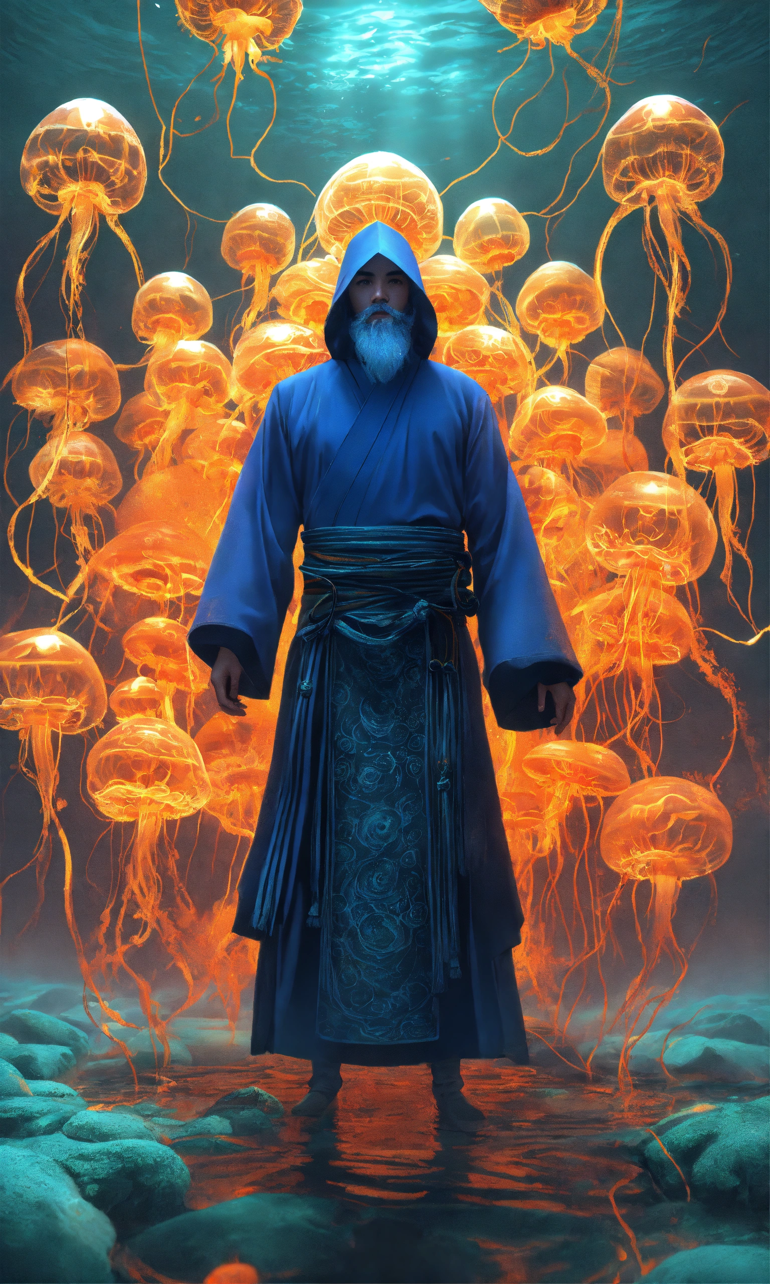 Taoist monk shaolin tesseract fractal underwater realiistic faces jellyfish wizard turkish cyborg lines, full body