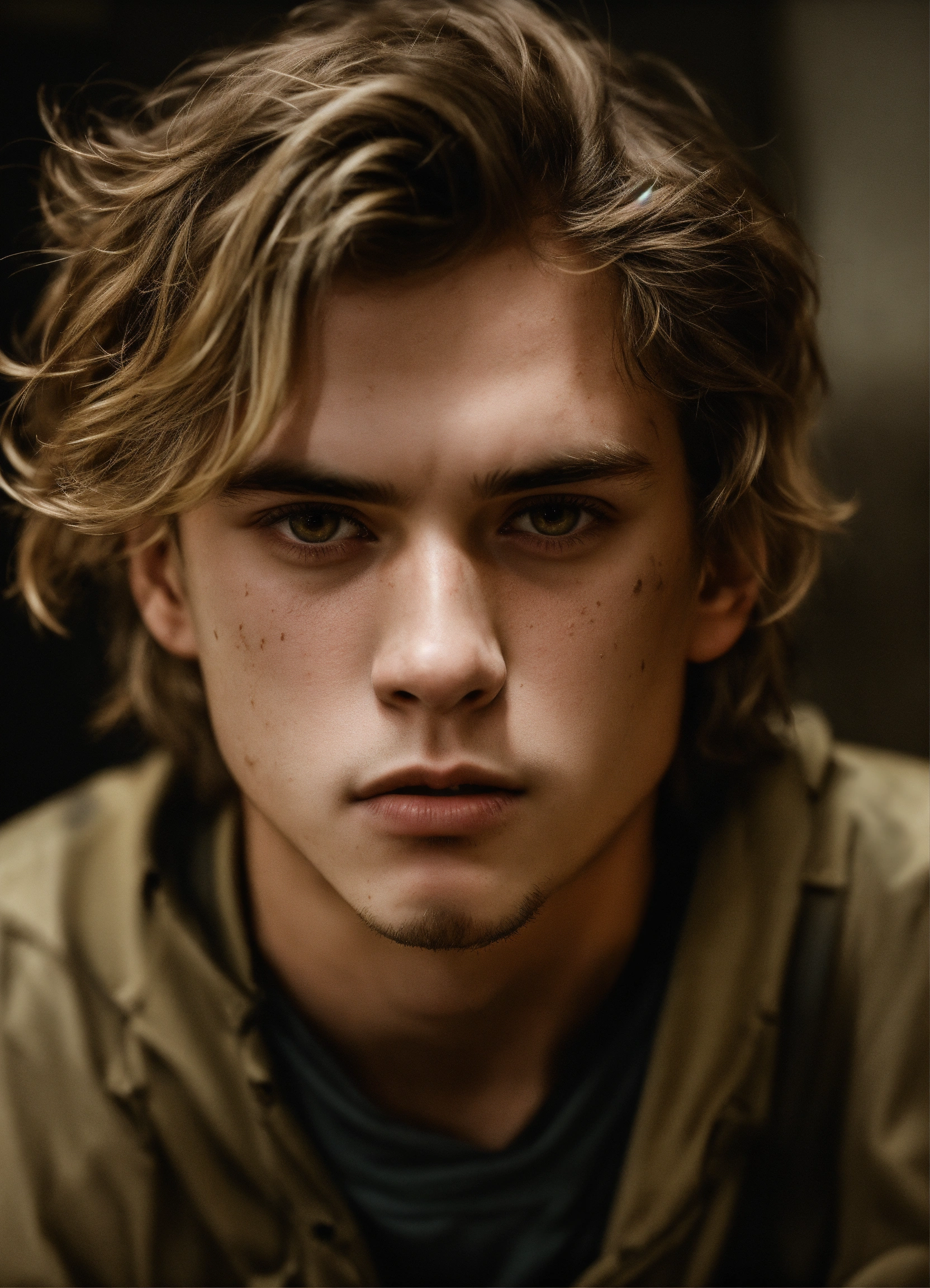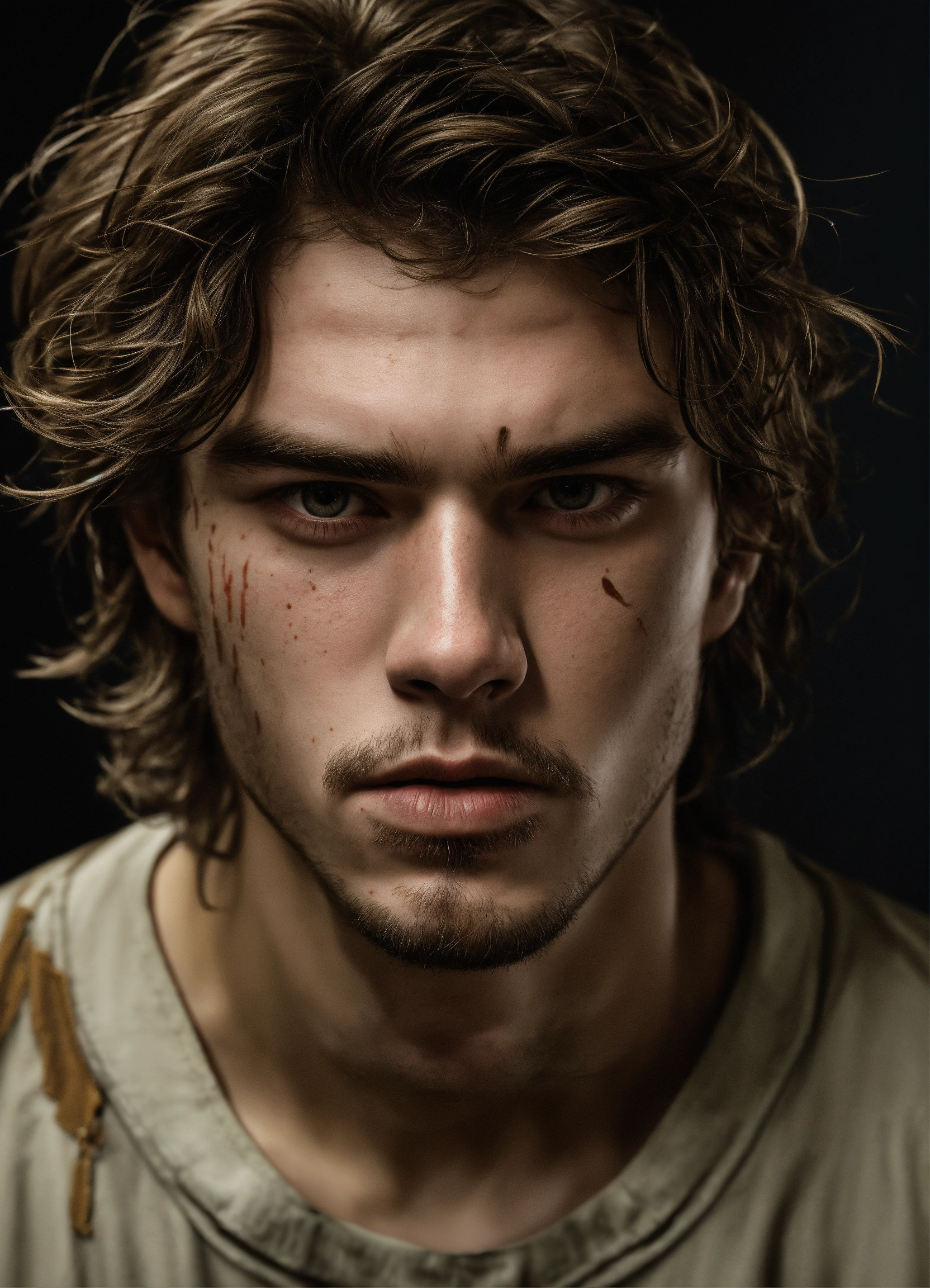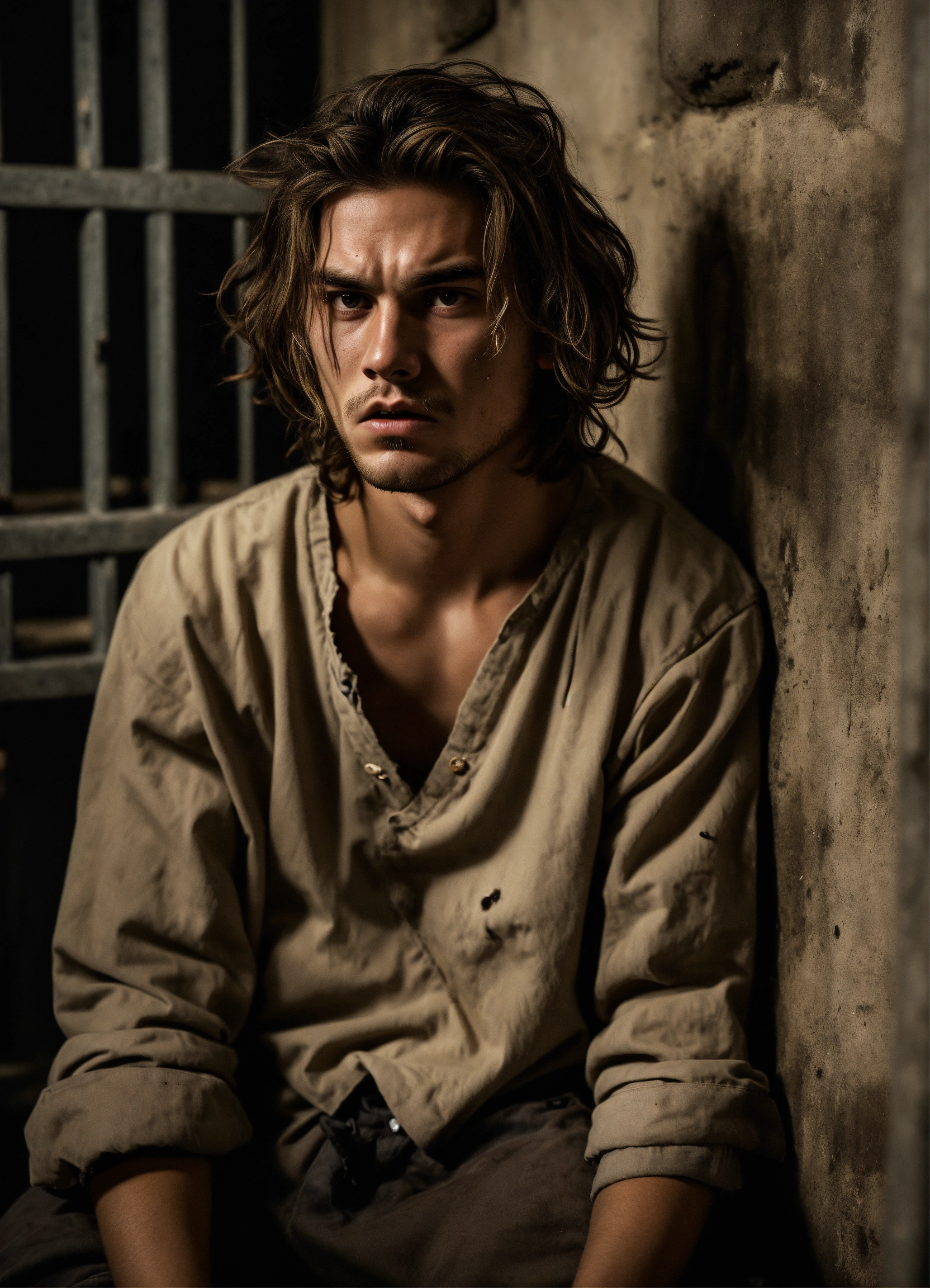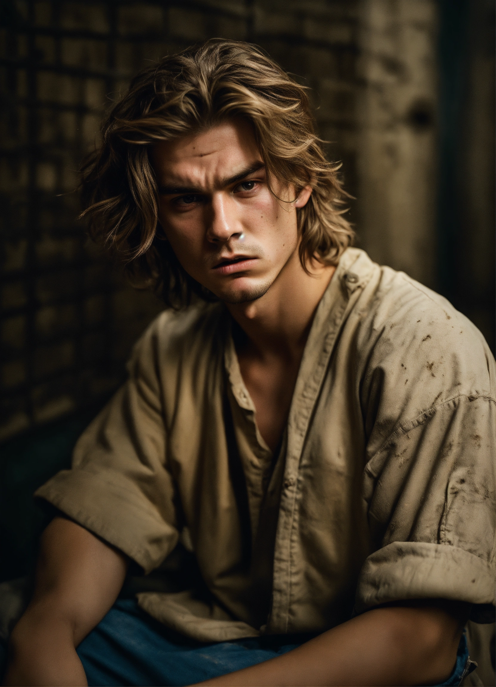 A highly realistic photograph of a white menacing 21 years old boy, with a scar on the eye, thin lips, dark blonde mid-long hair, brown slanted eyes, messy hair, with some facial hair, thin face, white skin, angry menacing expression, looking from below, wearing dirty prisoner clothes, in a very dark old prison sitting in the floor, hyperrealistic, hyperdetailed, 4k
