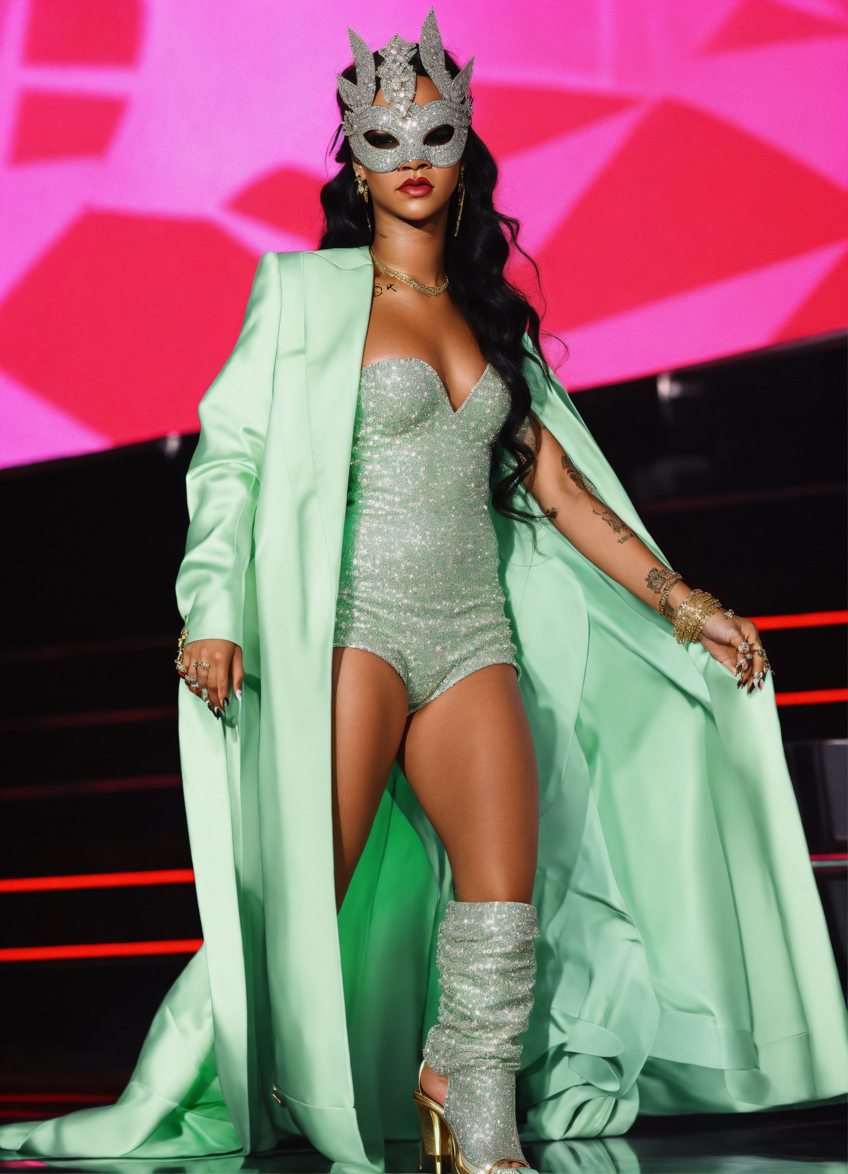 Rihanna glamorous sparkly diamond studded mint and silver and gold outfit with high heels and eye mask and long hair