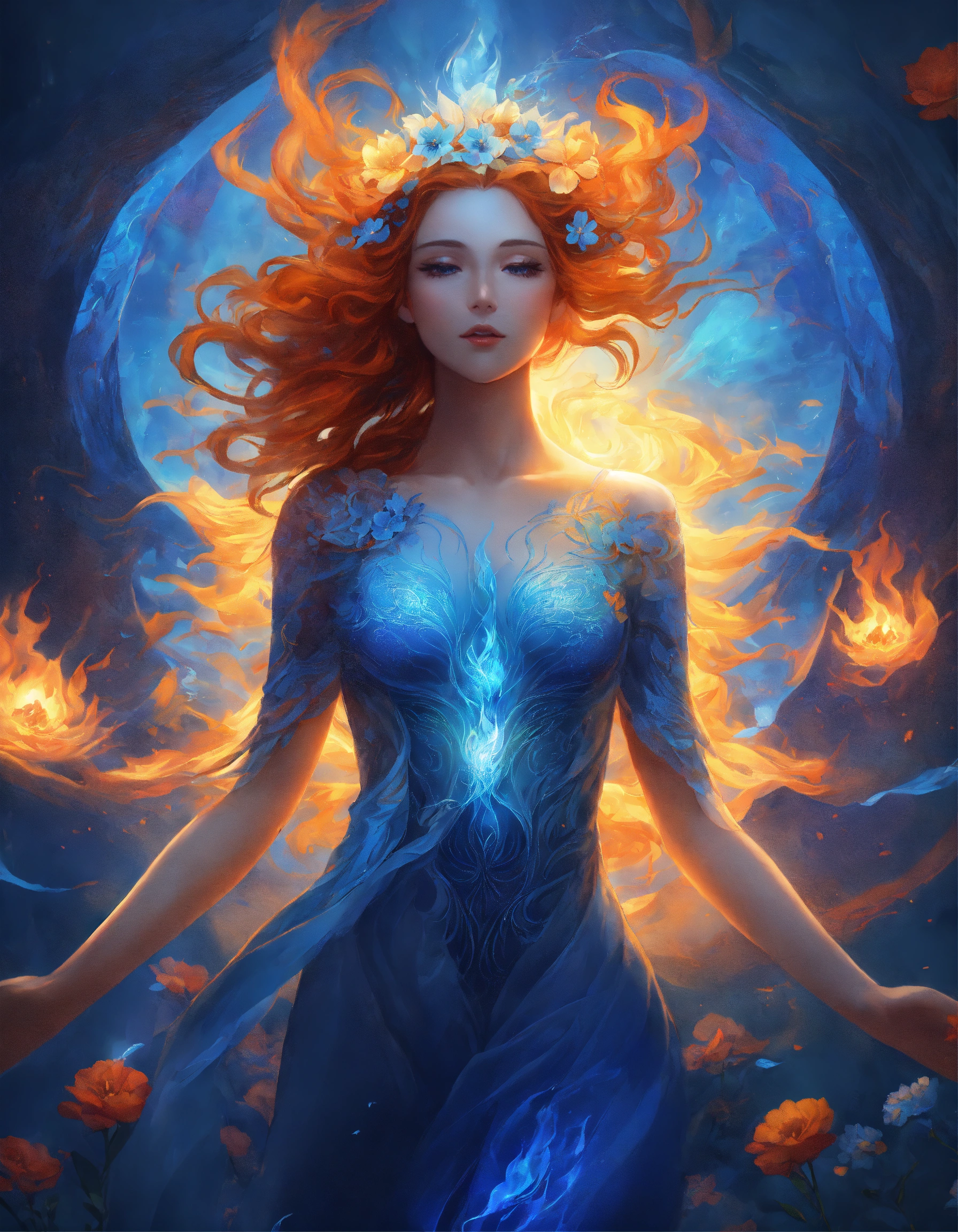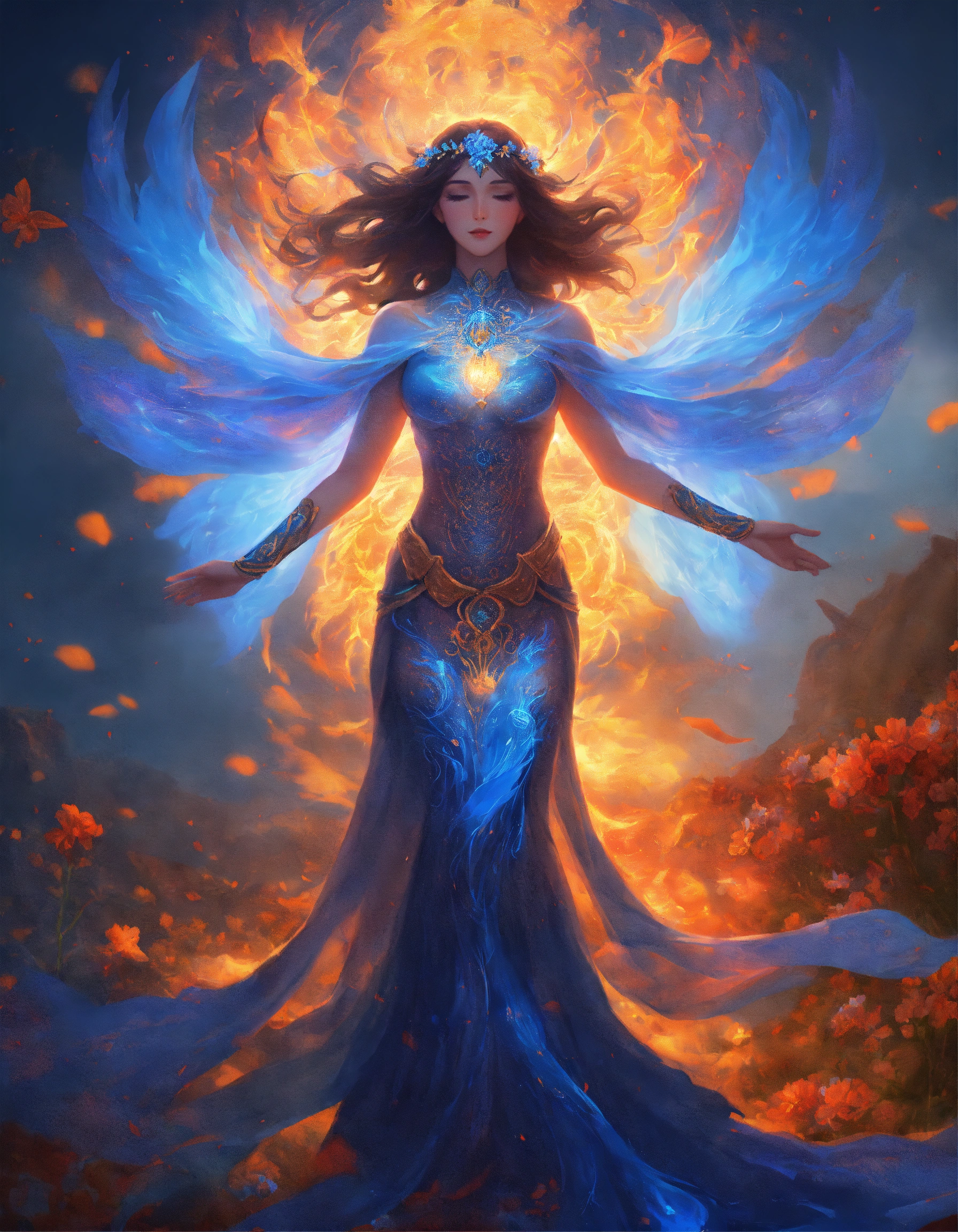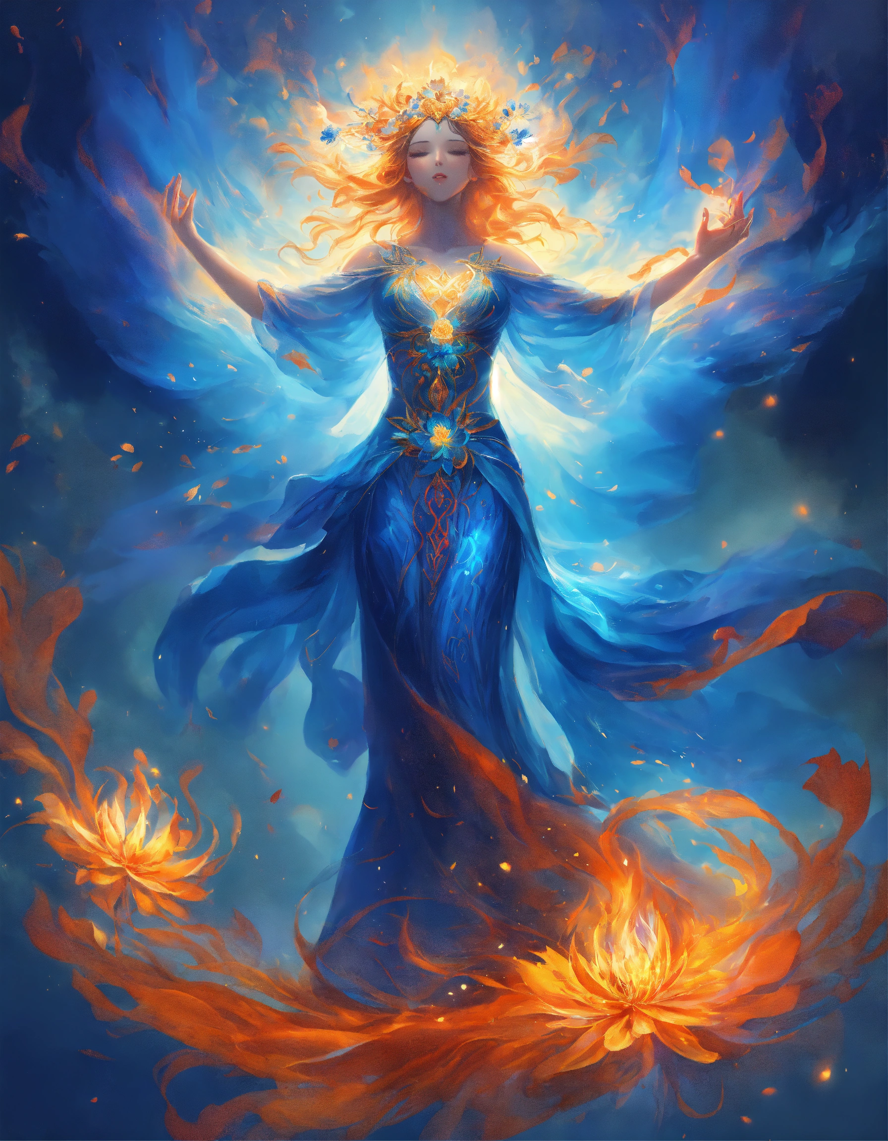 Fantasy, mesmerizing design, ascending spirit woman, spirit being's arms spread out, blue body, transparent radiant light on her body, a fiery blue flame at the end of each arm, beautiful fiery blue flowers around the perimeter