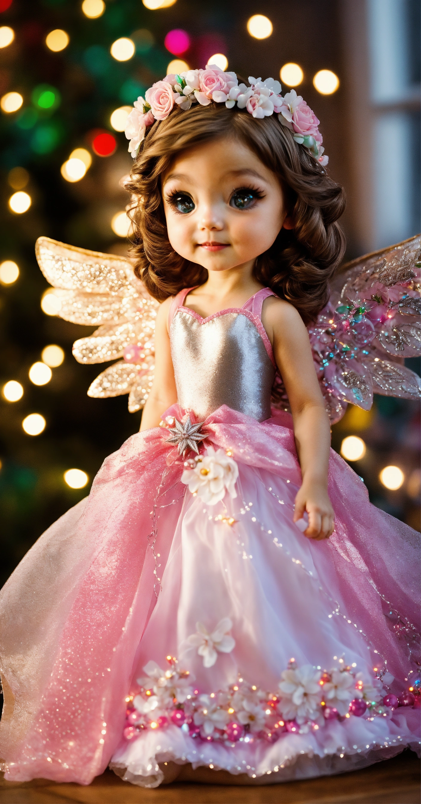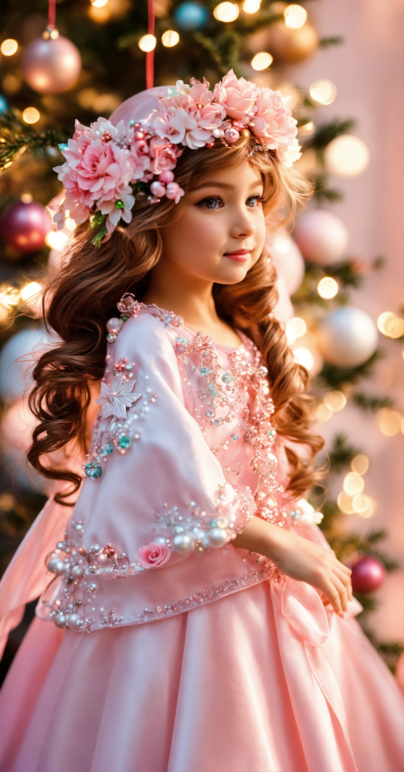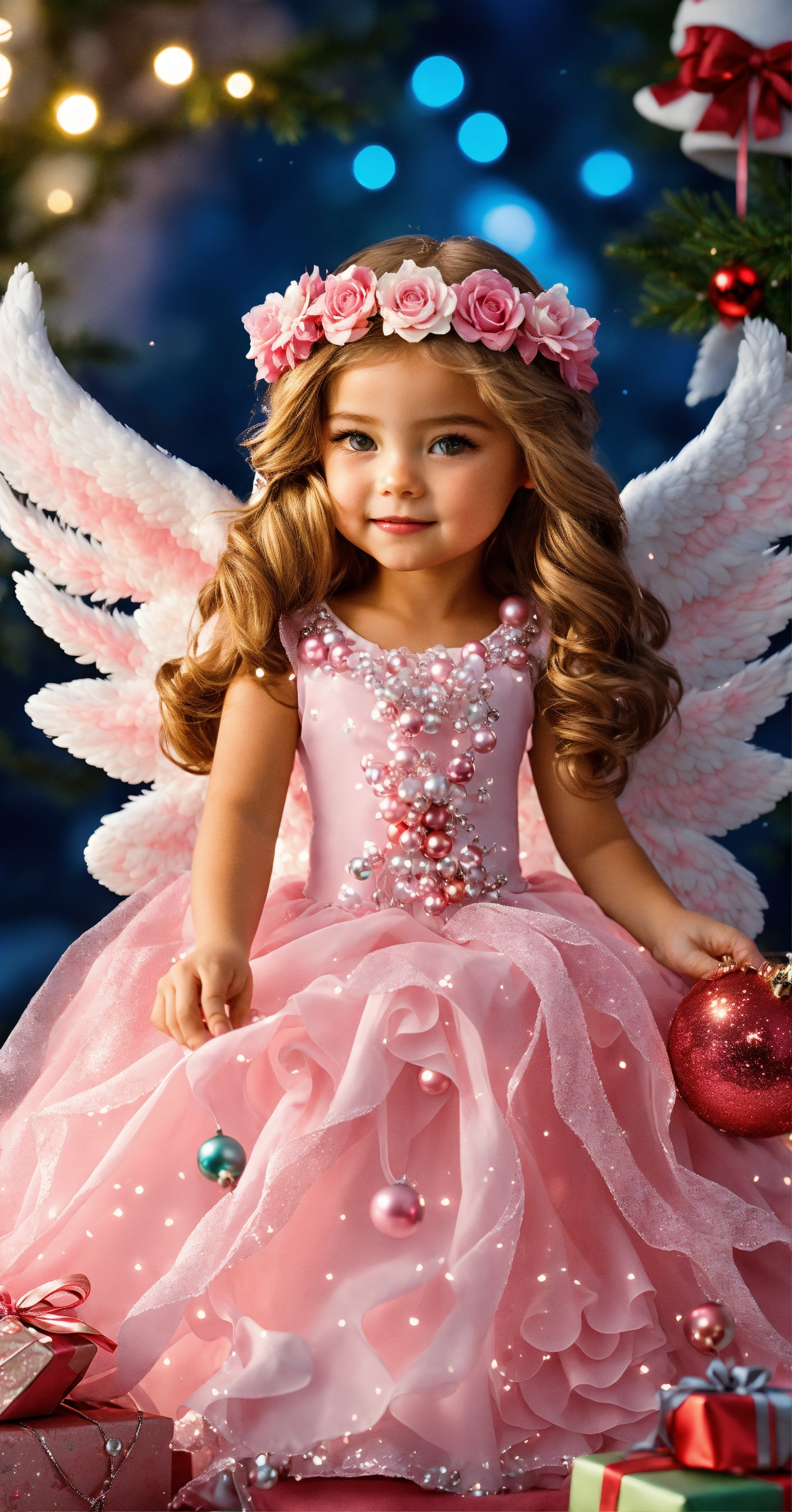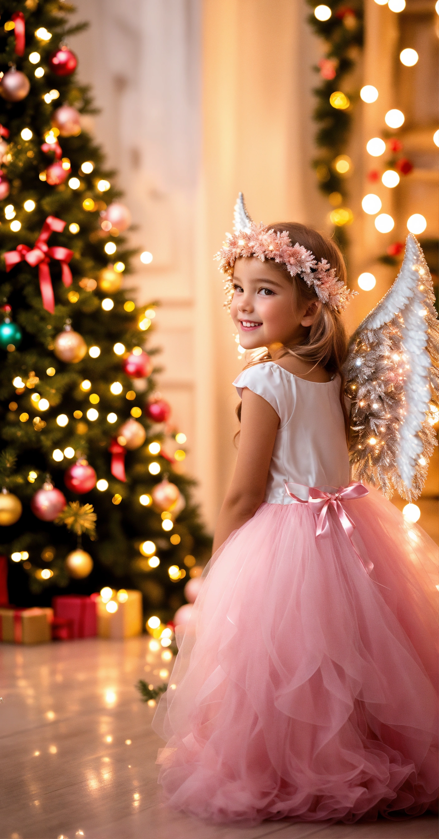 Árbol de navidad hermoso y detallado de color blanco y bolas de navidad rosadas y luces de colores rosadas y plateadas, tiene cajas de regalo de color plateado con moños rosados, al lado hay un angel niña de 12 años hermosa y perfecta con alas de angel de color rosado detalladas y luminosas, rostro hermoso y detallado, ojos claros con mirada profunda, angel sonriendo, cabello blanco, sombrero navideño de color rosado, tunica blanca con detalles rosados, obra maestra, realismo, ilustración digital, ilustración hiperdetallada, hd, alta calidad y resolución 8k