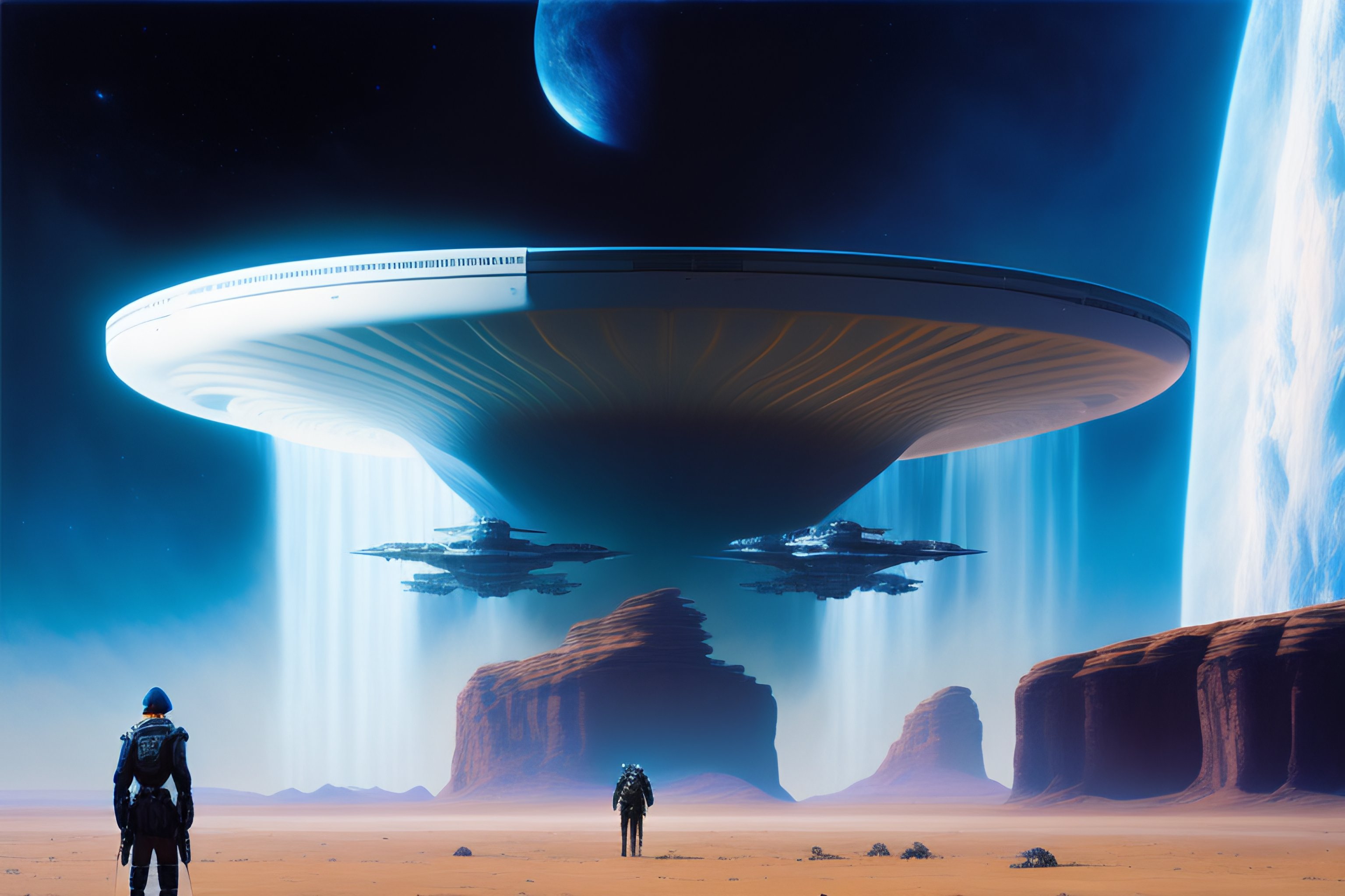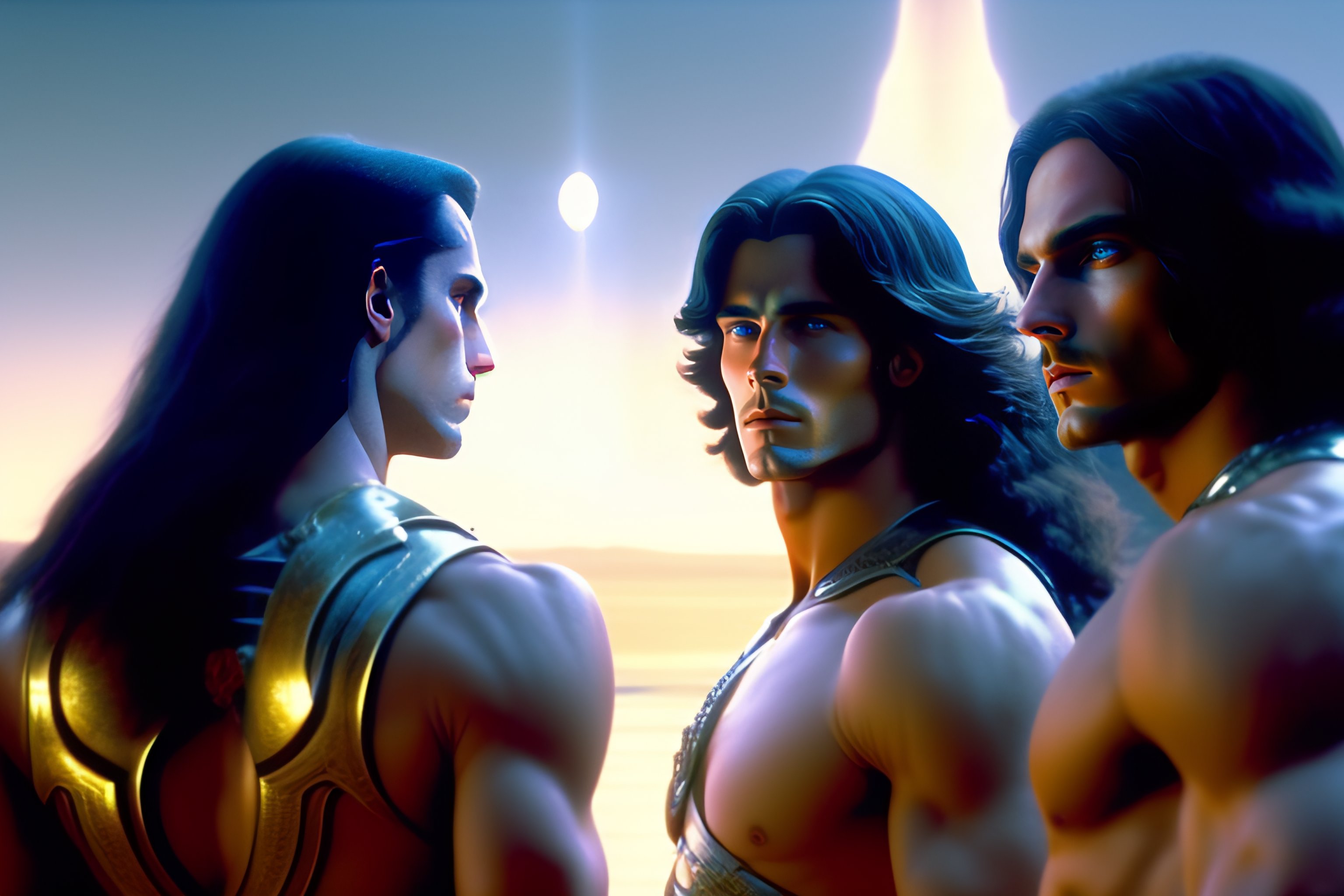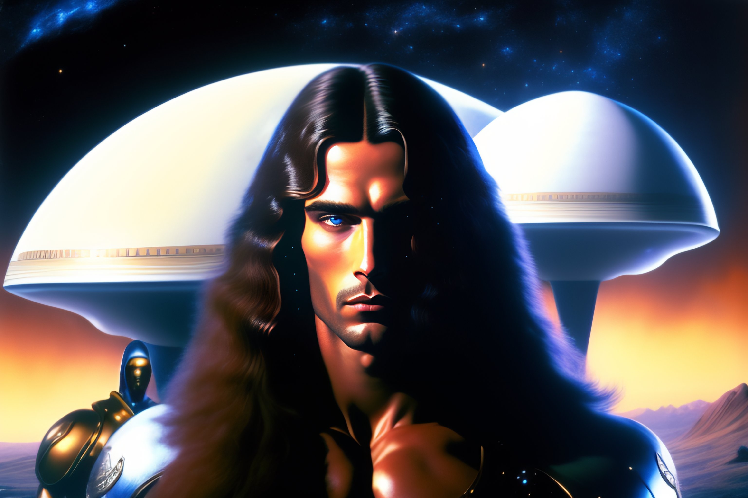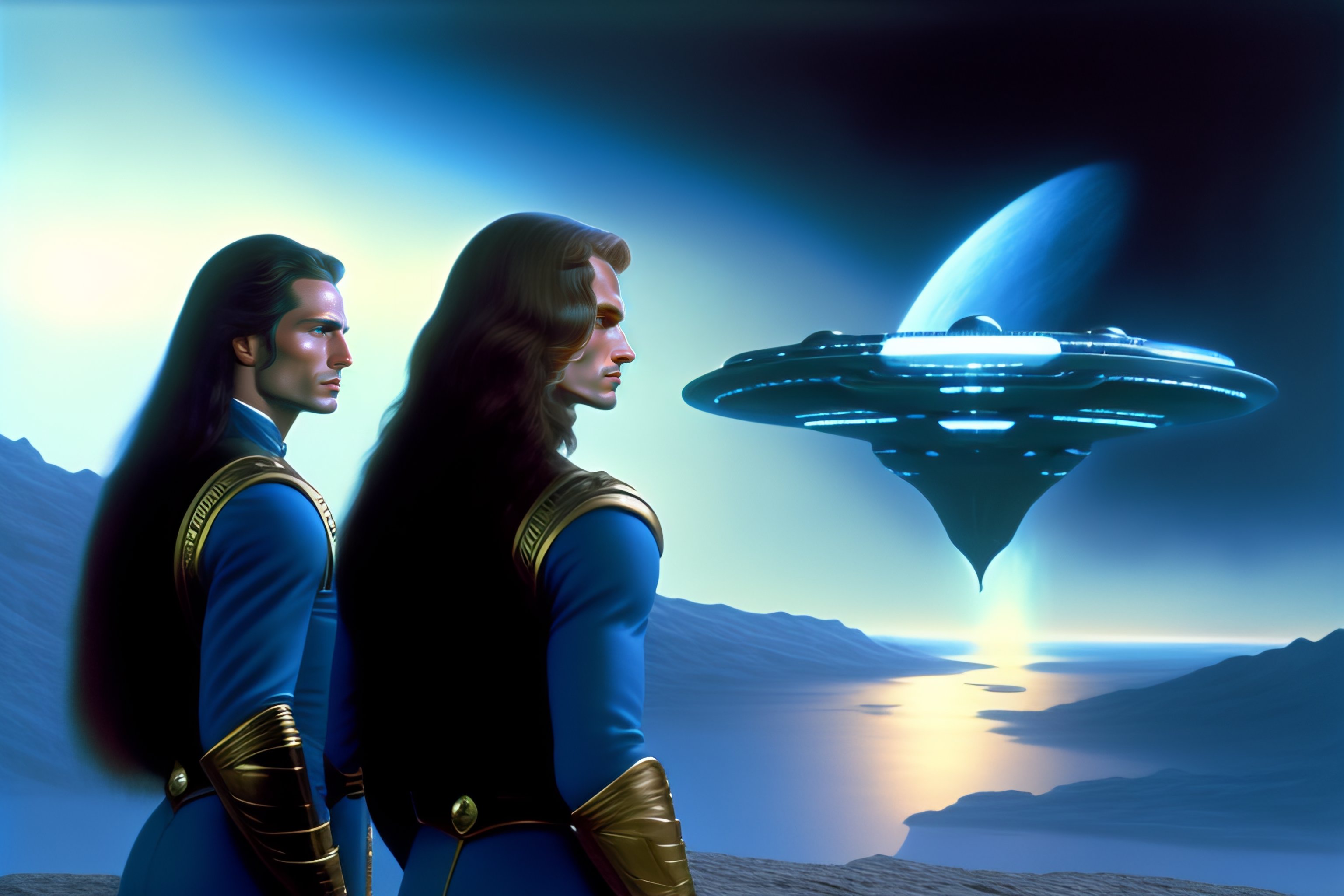 Prometheus is an angel with long hair, with other twin angels looking at each other, near an alien ship in the style of the alien movie, full blue eyes, sci fi clothing, with plasma weapons, concave earth in the background, kaspar david friedrich, james gellar and justin gerard, realism, octane rendering