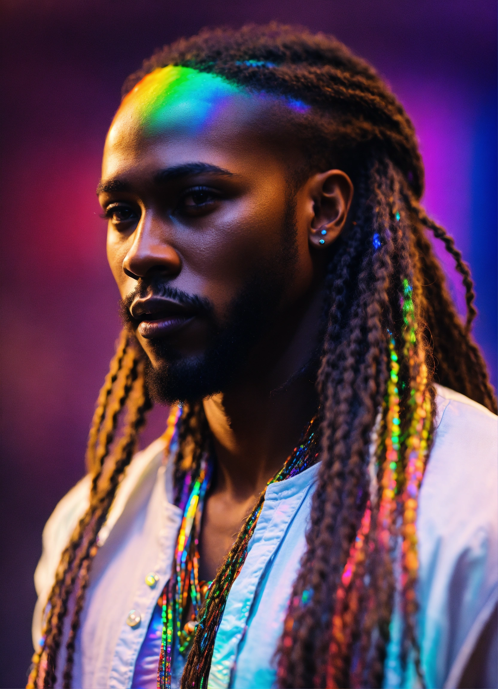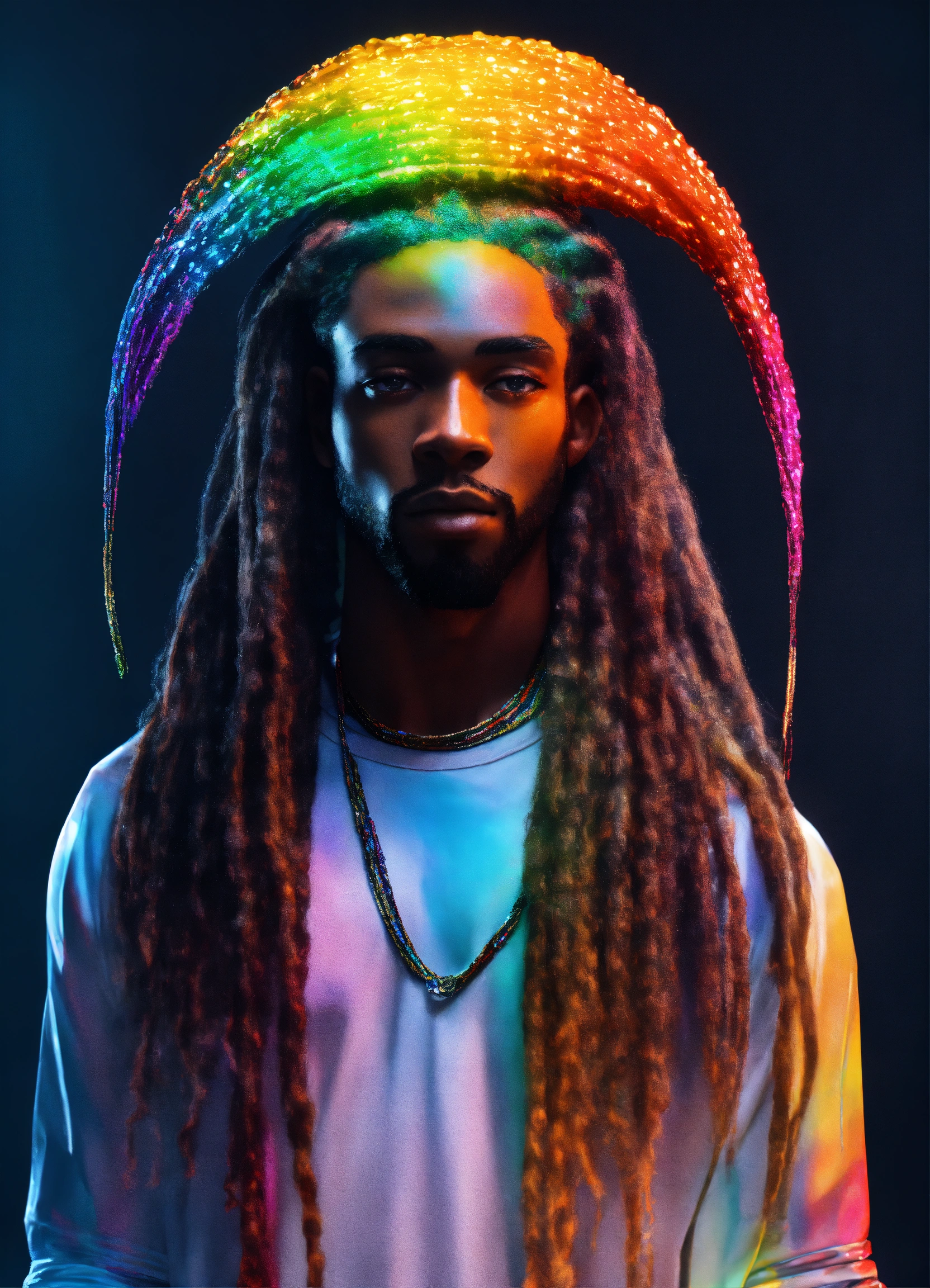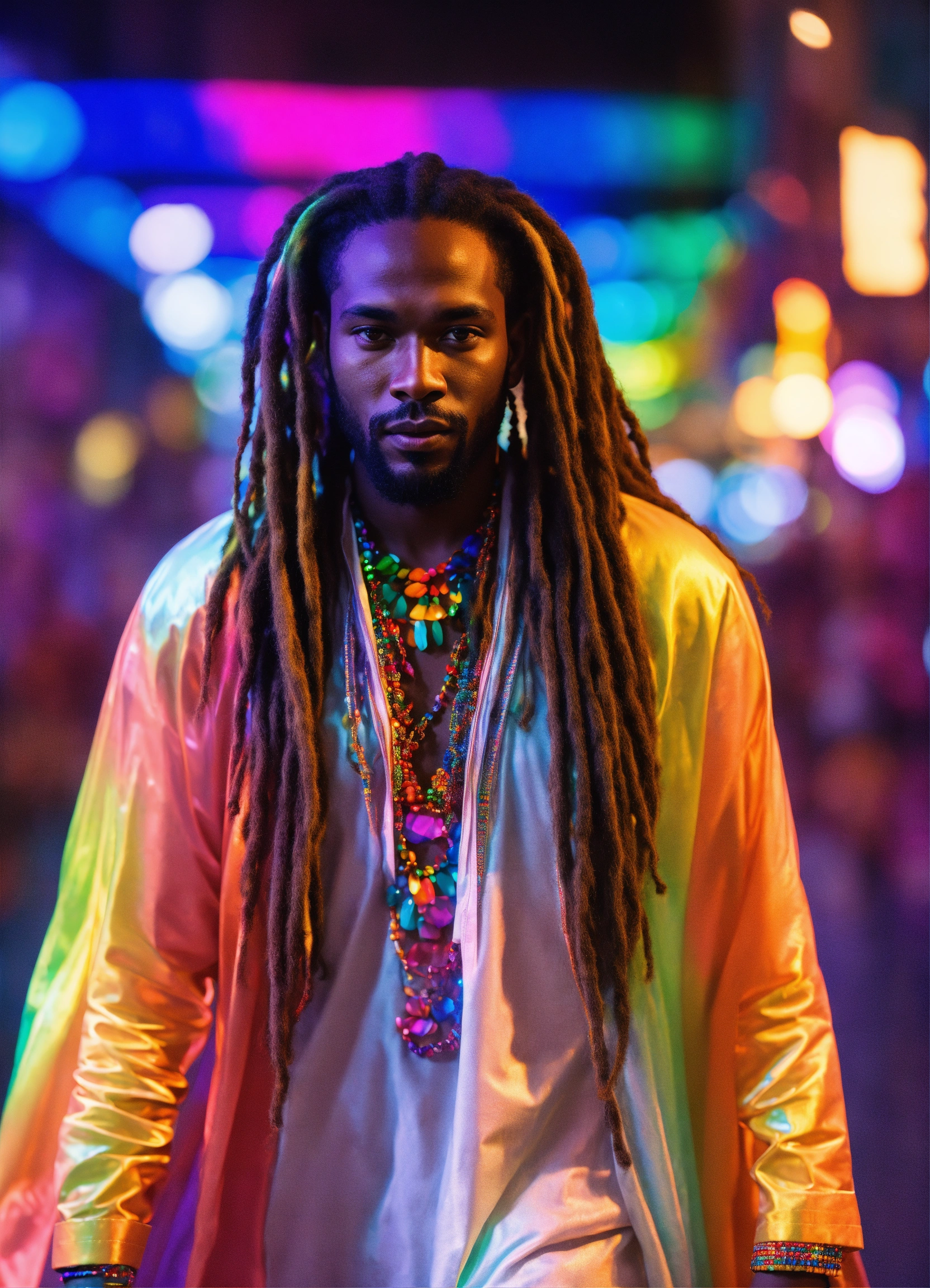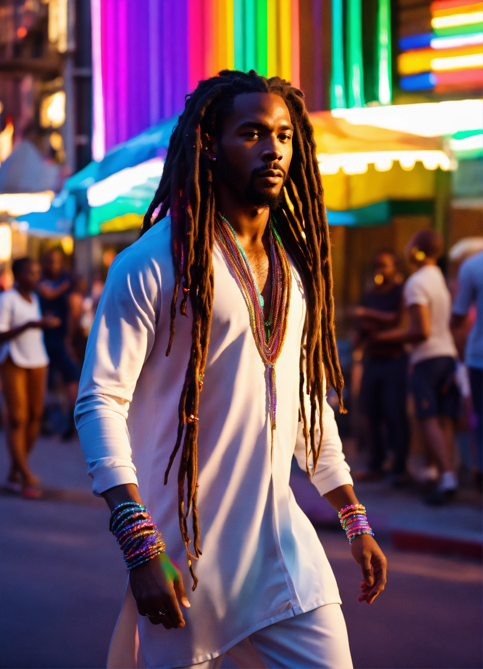 Hologram of a black man with long flowing dreadlocks, well-built, virile, 6' 5" tall, he has iridescent black skin that reflects all the colors of the rainbow, full body shot, striding up the street confidently, looking directly into camera, wearing white iridescent clothing, african style iridescent clothing that reflects all the colors of the rainbow, 3d render