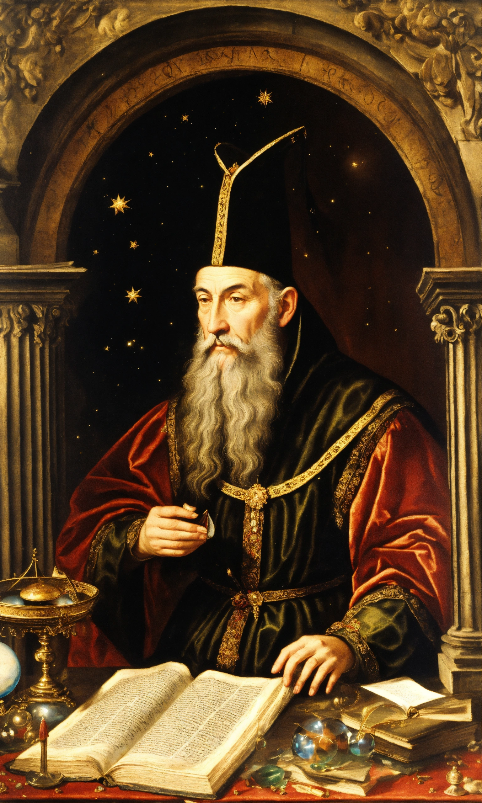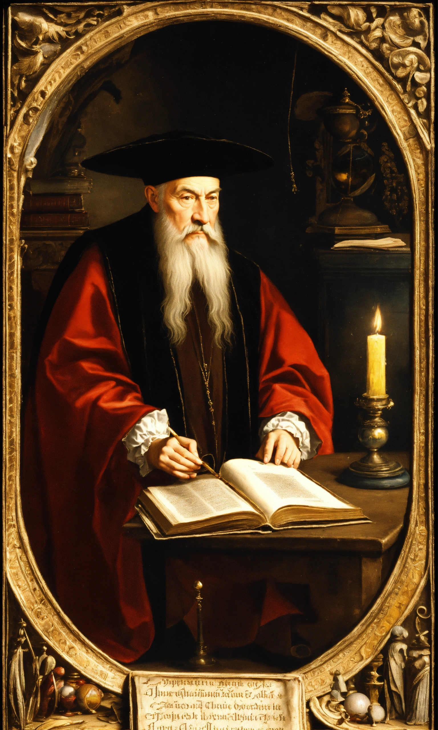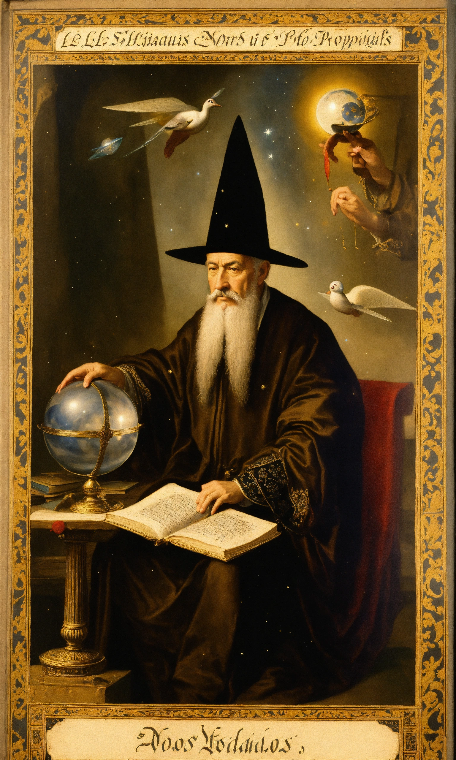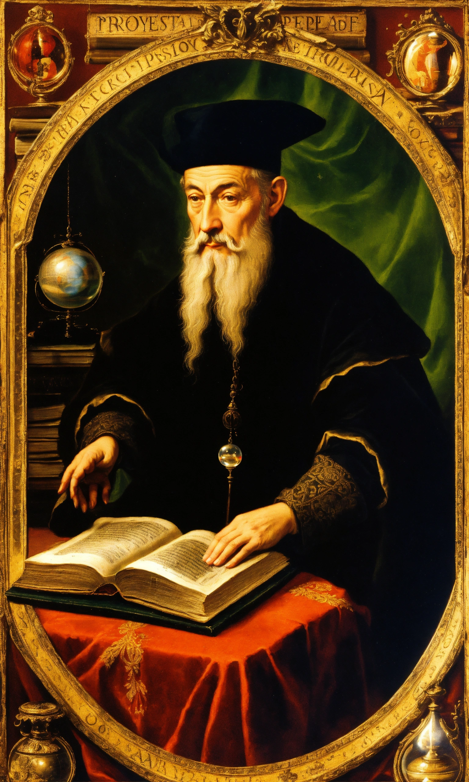 Nostradamus was a 16th-century european french astrologer and physician who is best known for his book “les propheties” show him reading this book in a dark room, library, mess, papers, parchment, scrying, crystal ball with ufo, perfect human hands