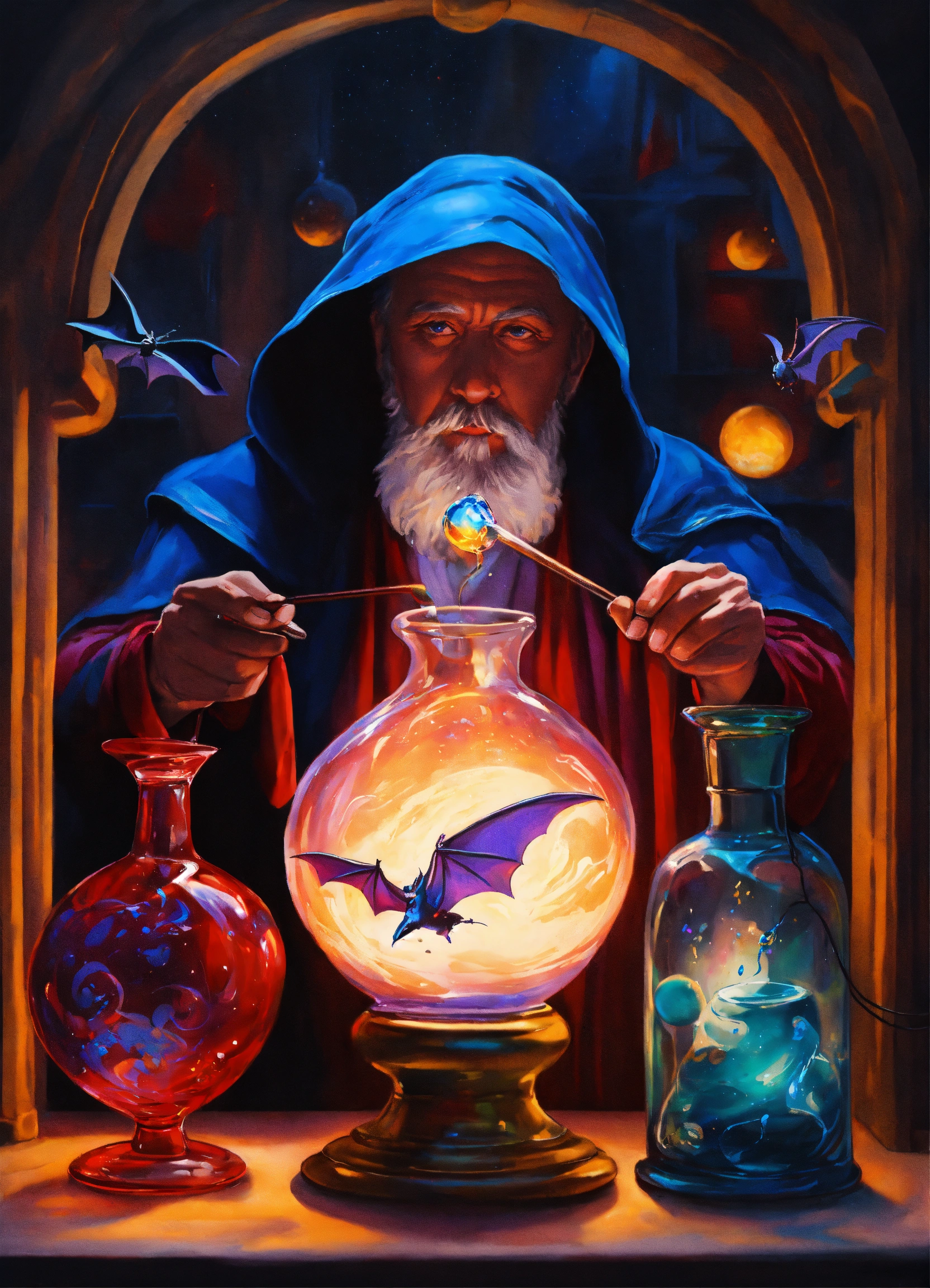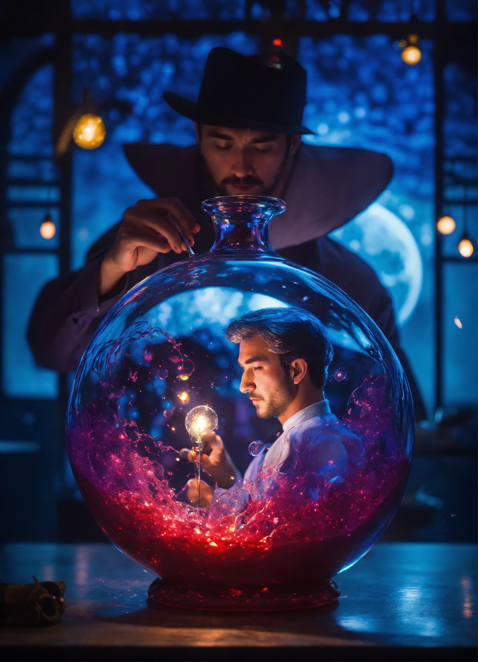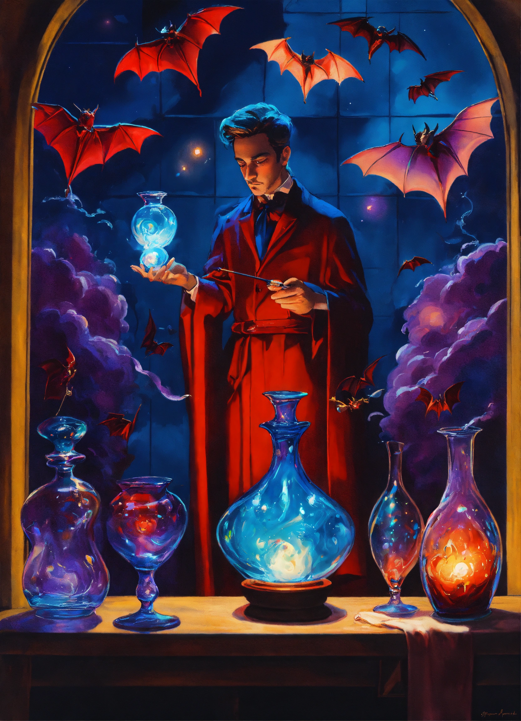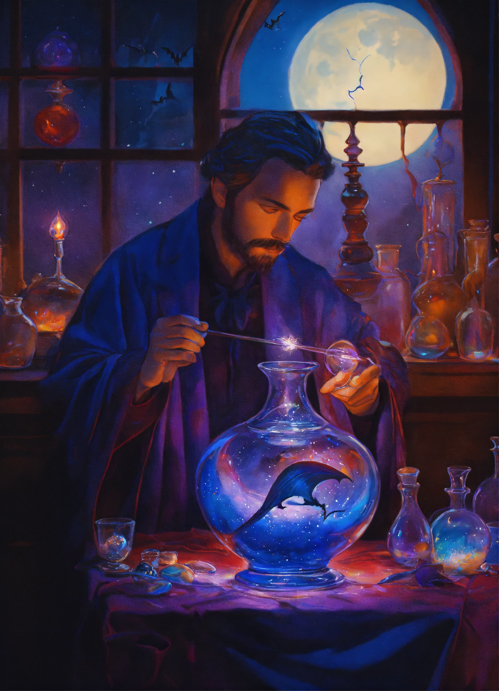 All glassblowing superrealism style man in center wizard magician magic potion fancy night moon spark of blue light bats red purple blue cream