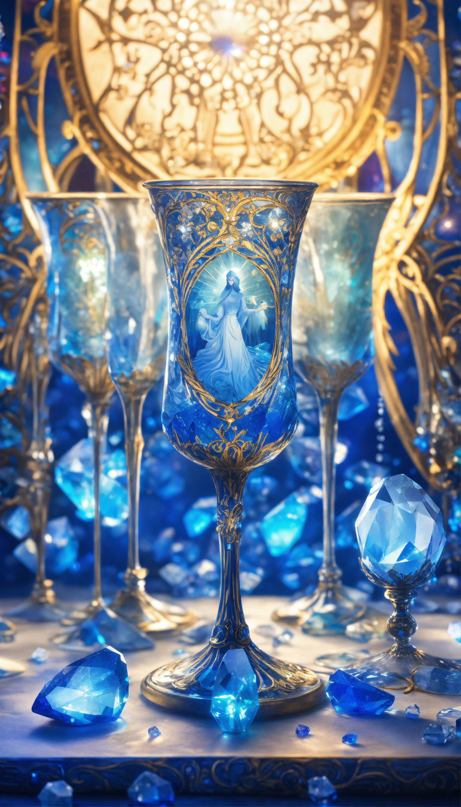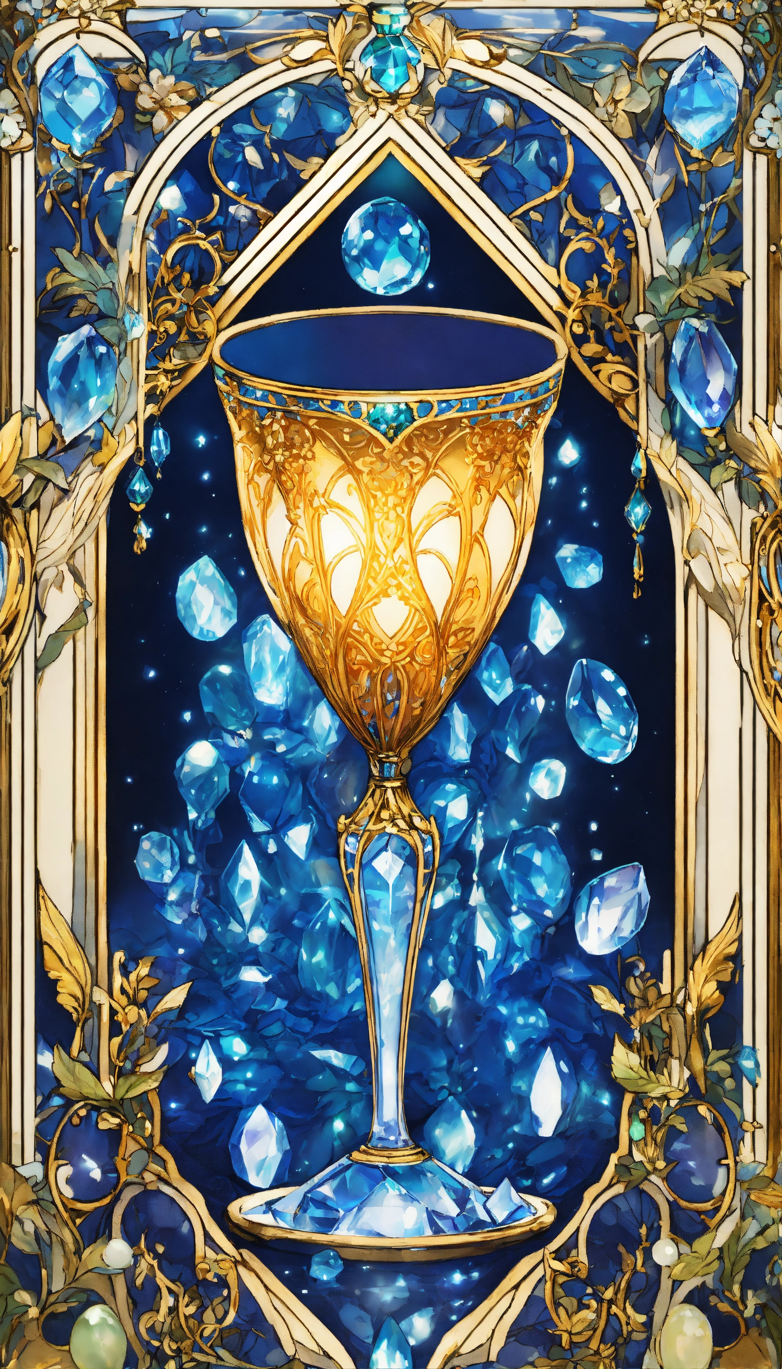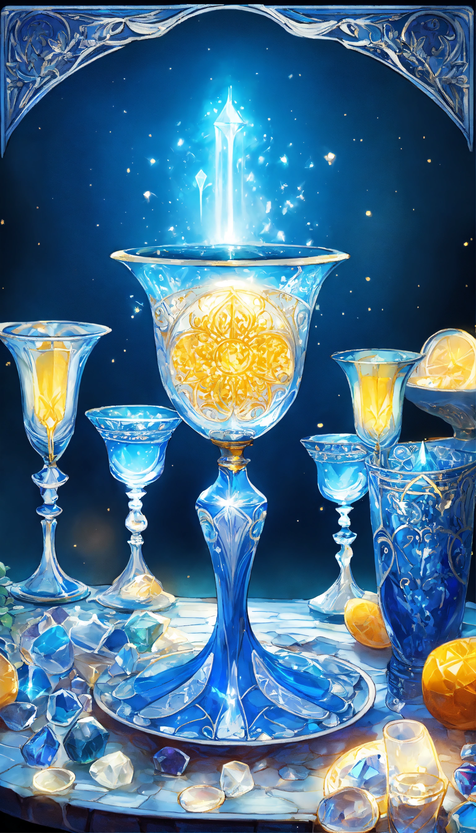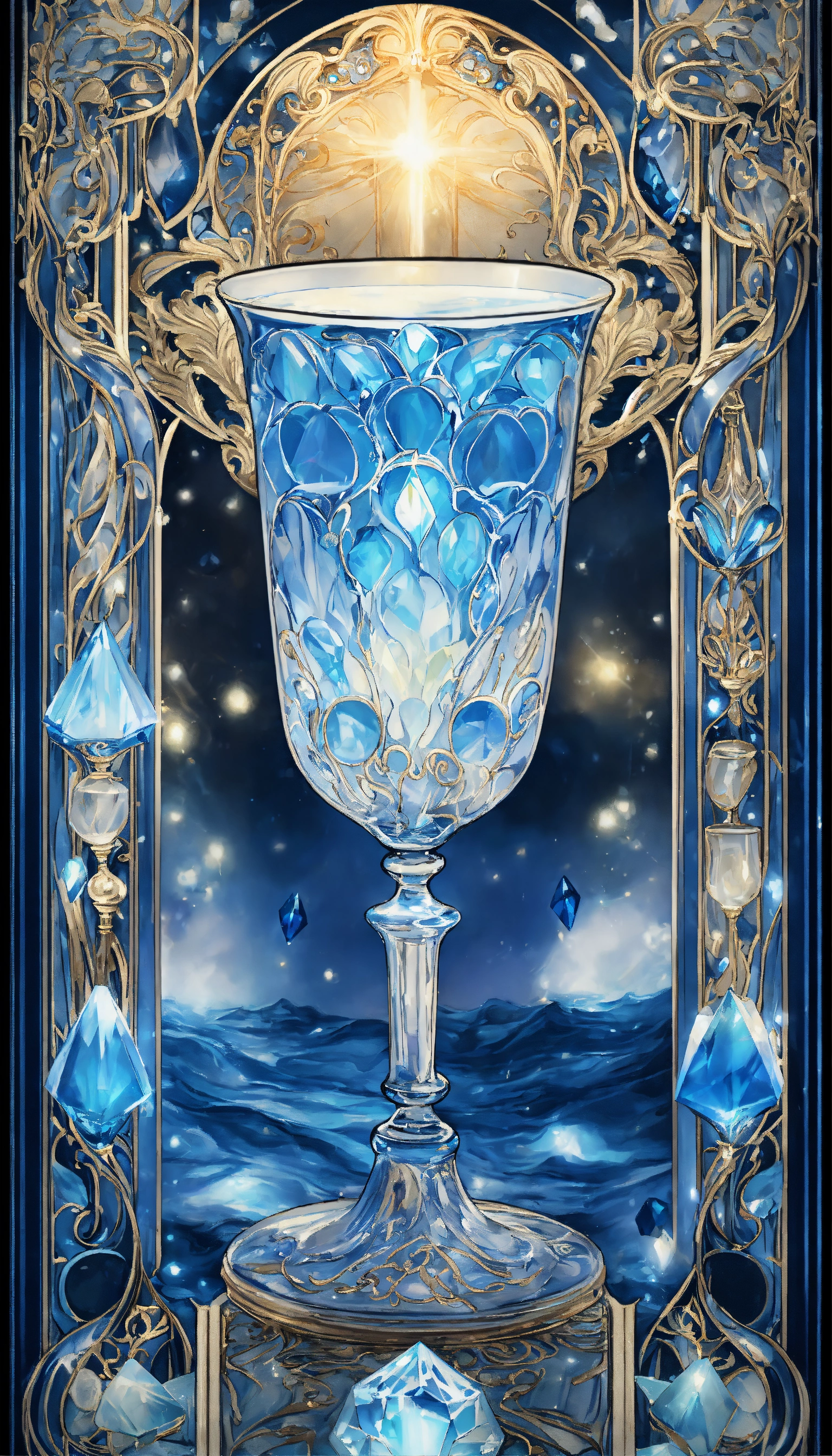 Art nouveau tarot card blue and white glowing many crystal goblets overflow8ng with water