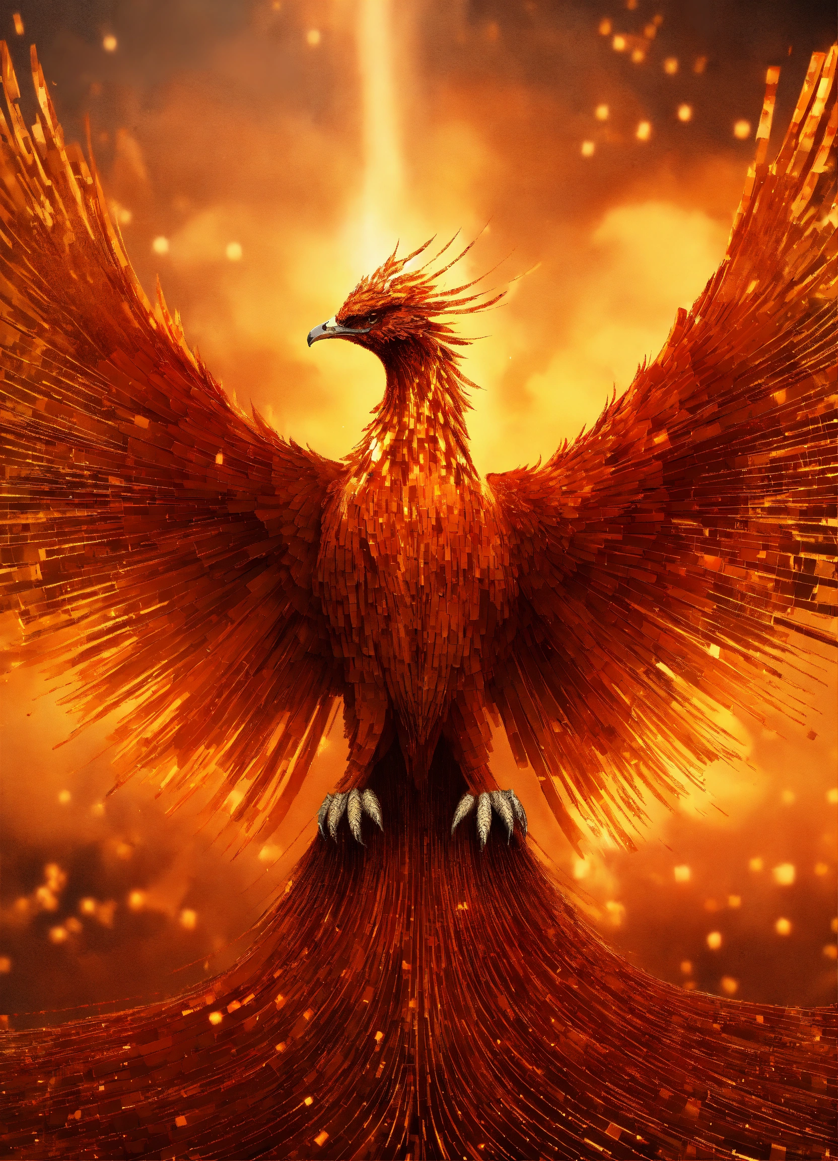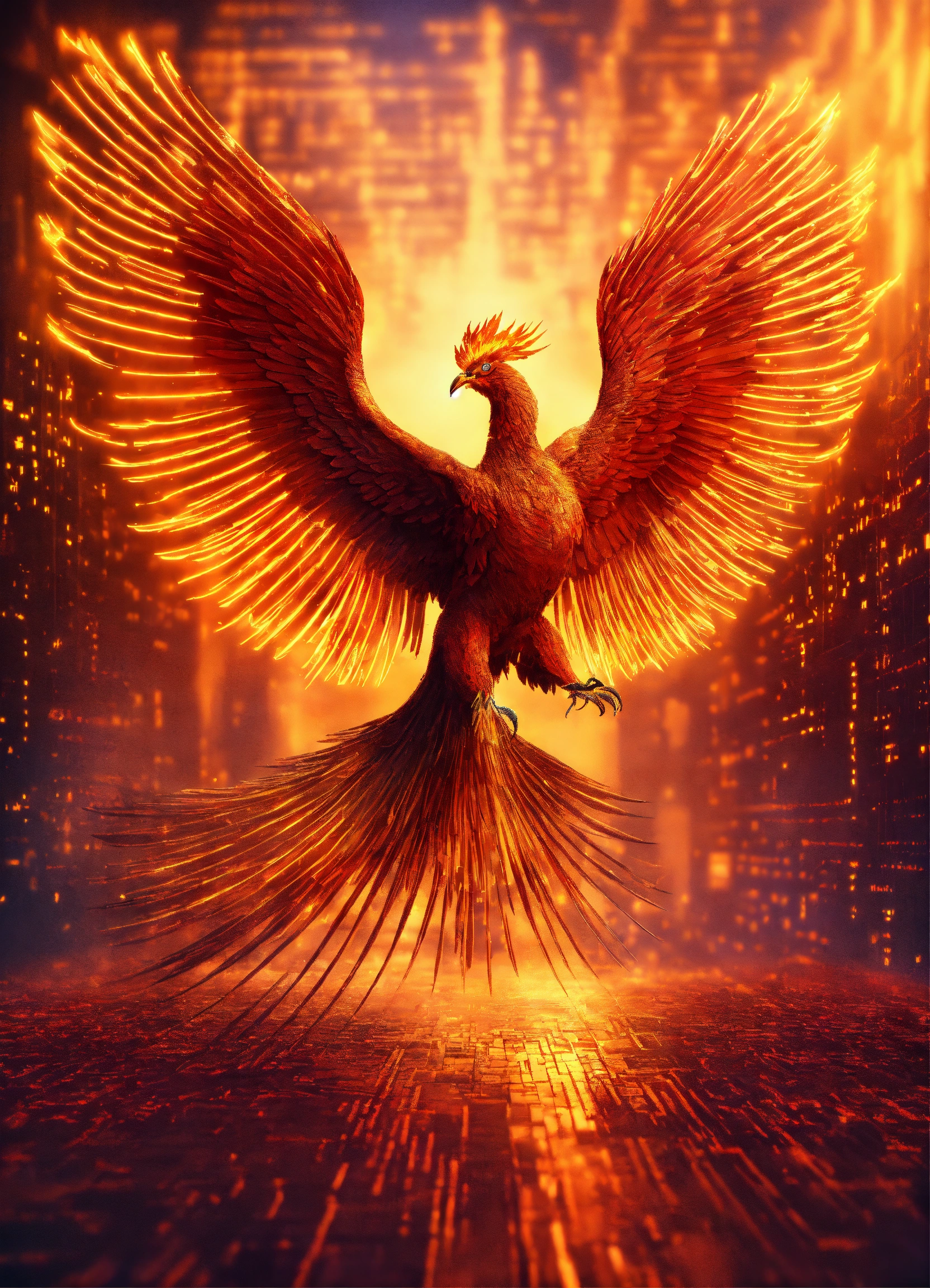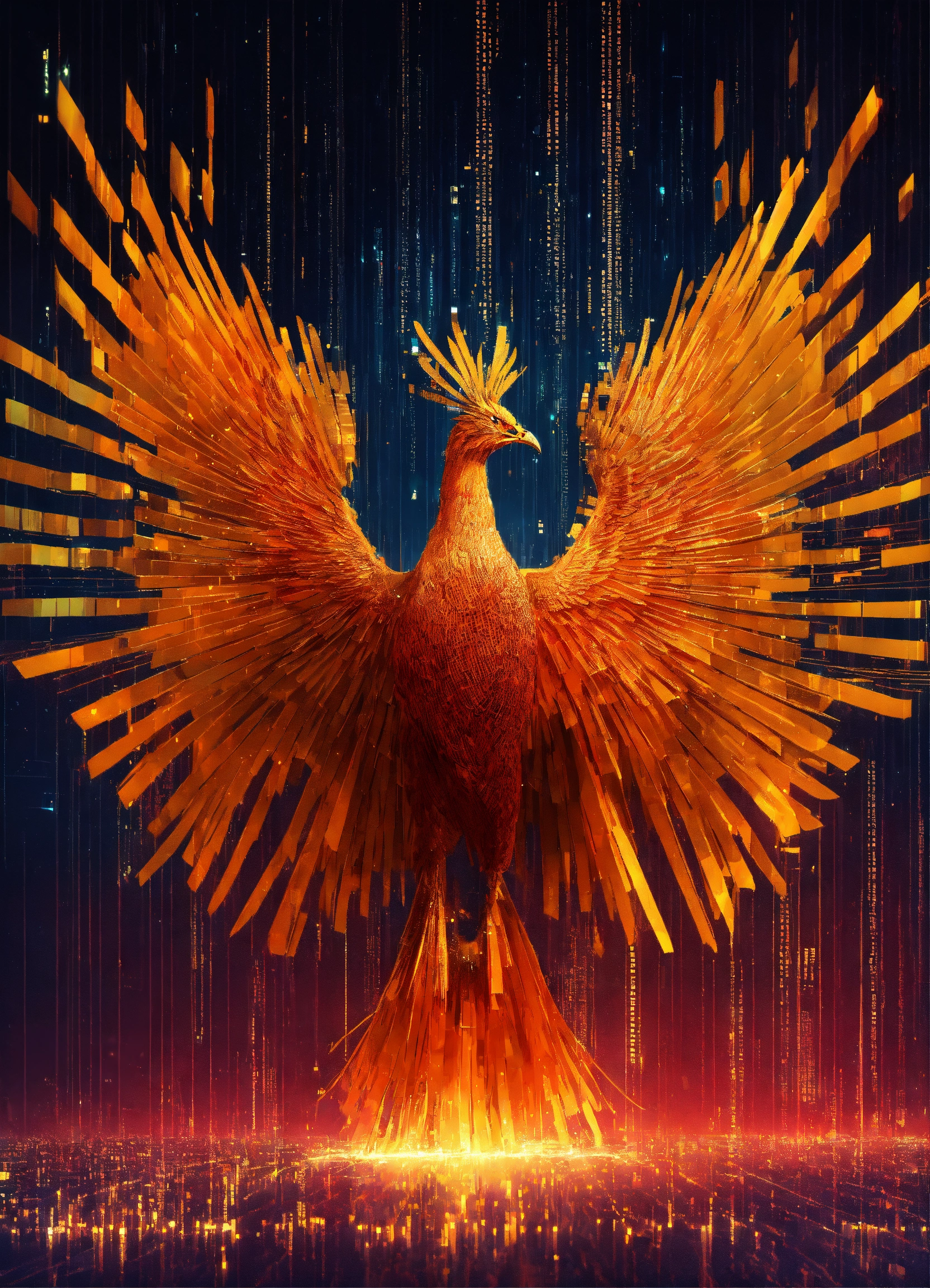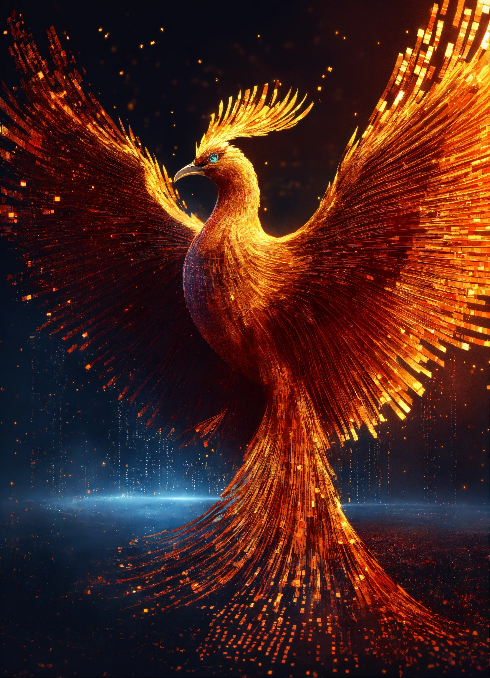 Visualize the concept of a phoenix constructed entirely from binary code, symbolizing the resilience of digital data in the face of challenges.