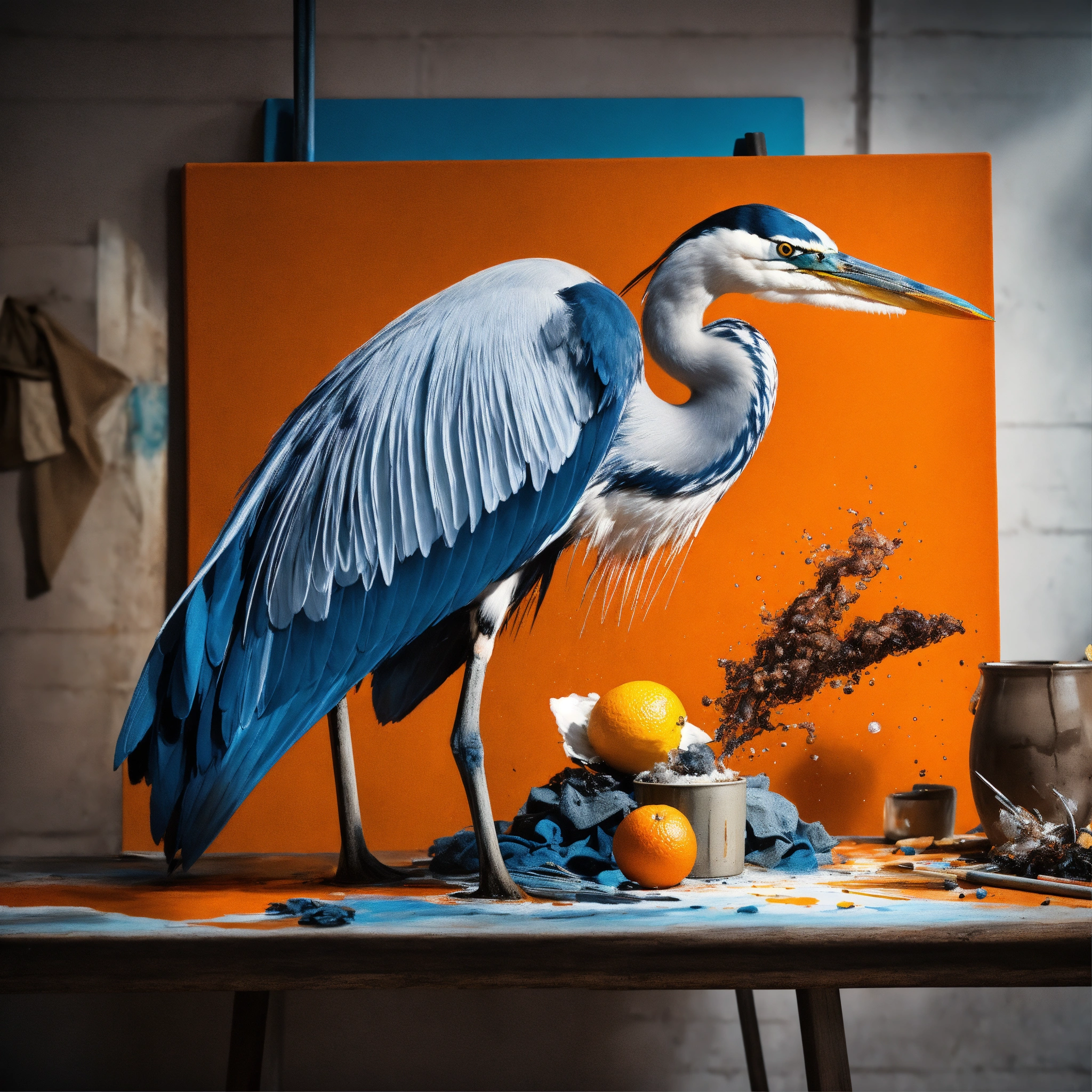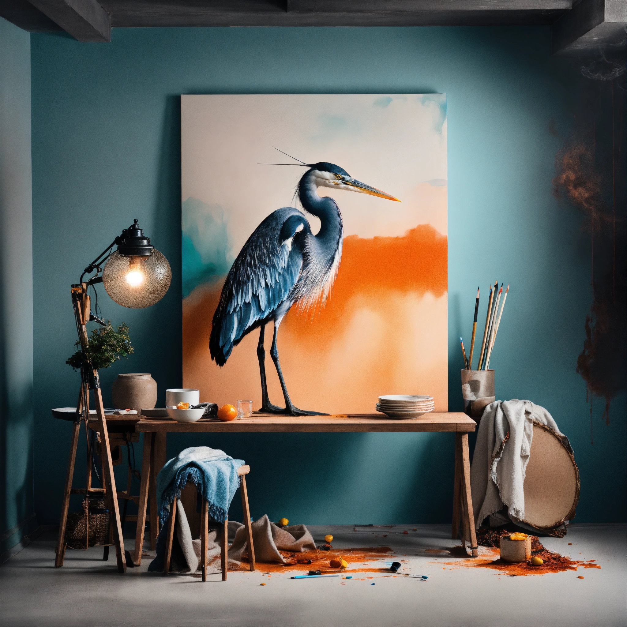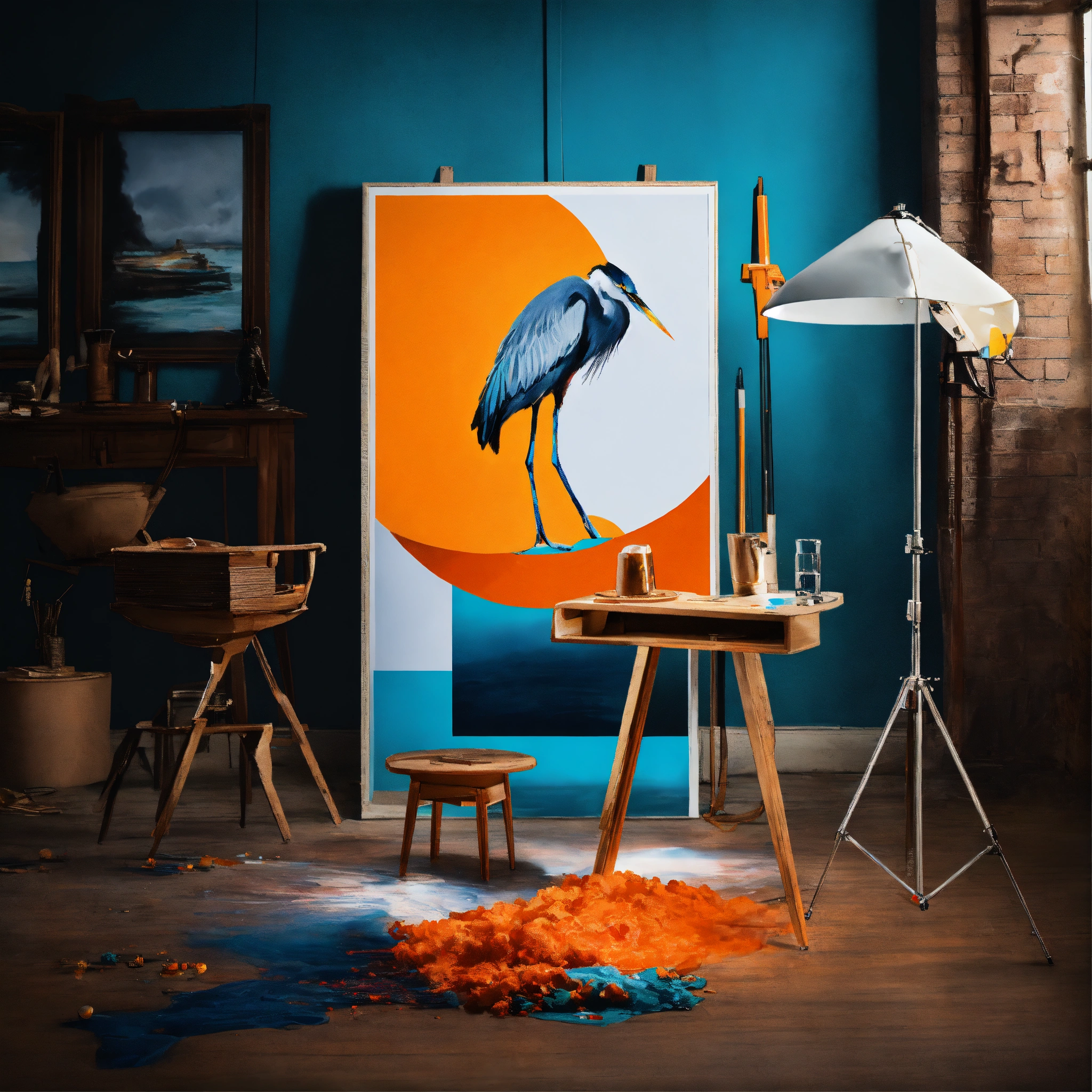 ((("capture dynamic splashes of art in a fashion photography" with canvas as the main subject, showcasing pencil, orange and cyan paint, blue heron, fabric, special model, easel, and intense lighting. utilize high-speed photography for photorealistic surrealism style, with a white background and trending clean minimalist backdrop. include cuware, charcoal, and art medium elements. create an ad posters with pro-grade color grading, studio lighting, rim lights, layered comps, and shot with an eos-1d x mark iii camera. publish on 500px, behance, and consider concept art."), photorealistic images, high-speed photography, surrealism, white background, clean background, minimalist, cuware, table, steam, smoke, ad posters, pro-grade color grading, studio lighting, rim lights, layered comps, eos-1d x mark iii, 500px, behance, concept art), photo
