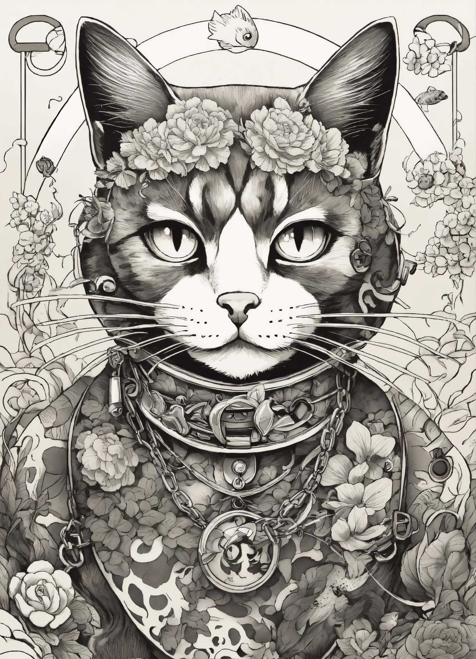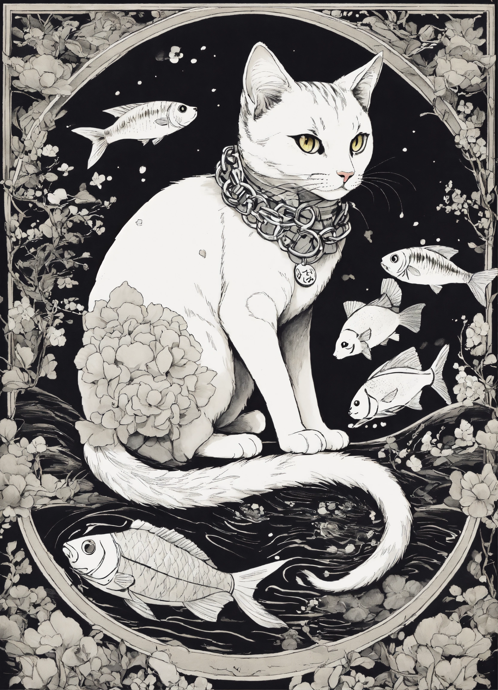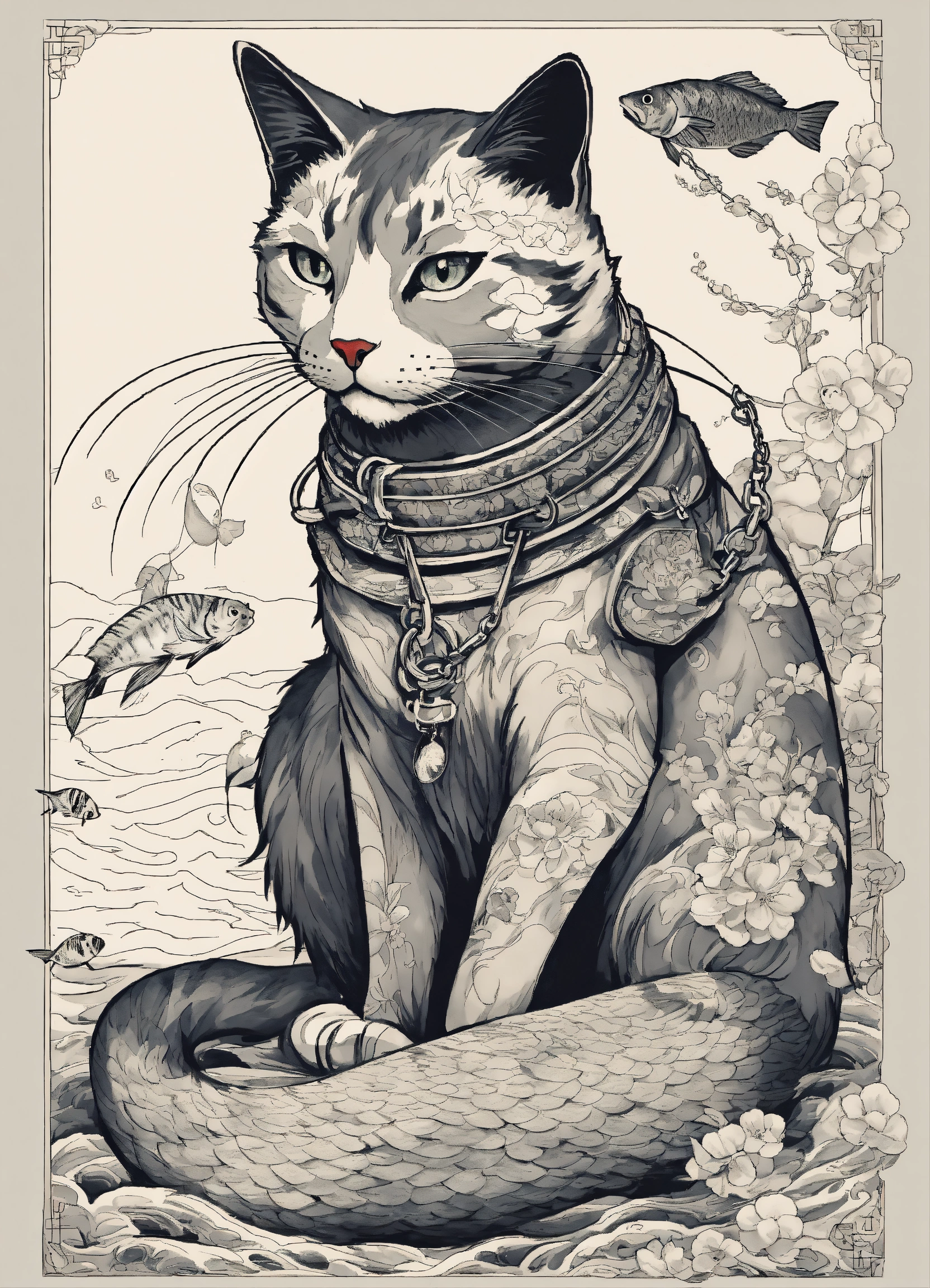 There is a cat with a chain around its neck and a fish tattoo on it, cat design, cat detailed, anime manga robot!! cat tattoo, japanese art style, monochromatic illustration for tattoo, by tawaraya sōtatsu, ukiyoe style, japanese illustration, by tawaraya sōtatsu, line art illustration