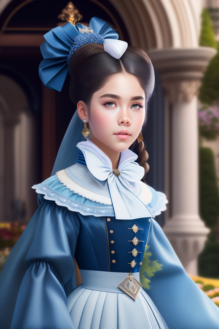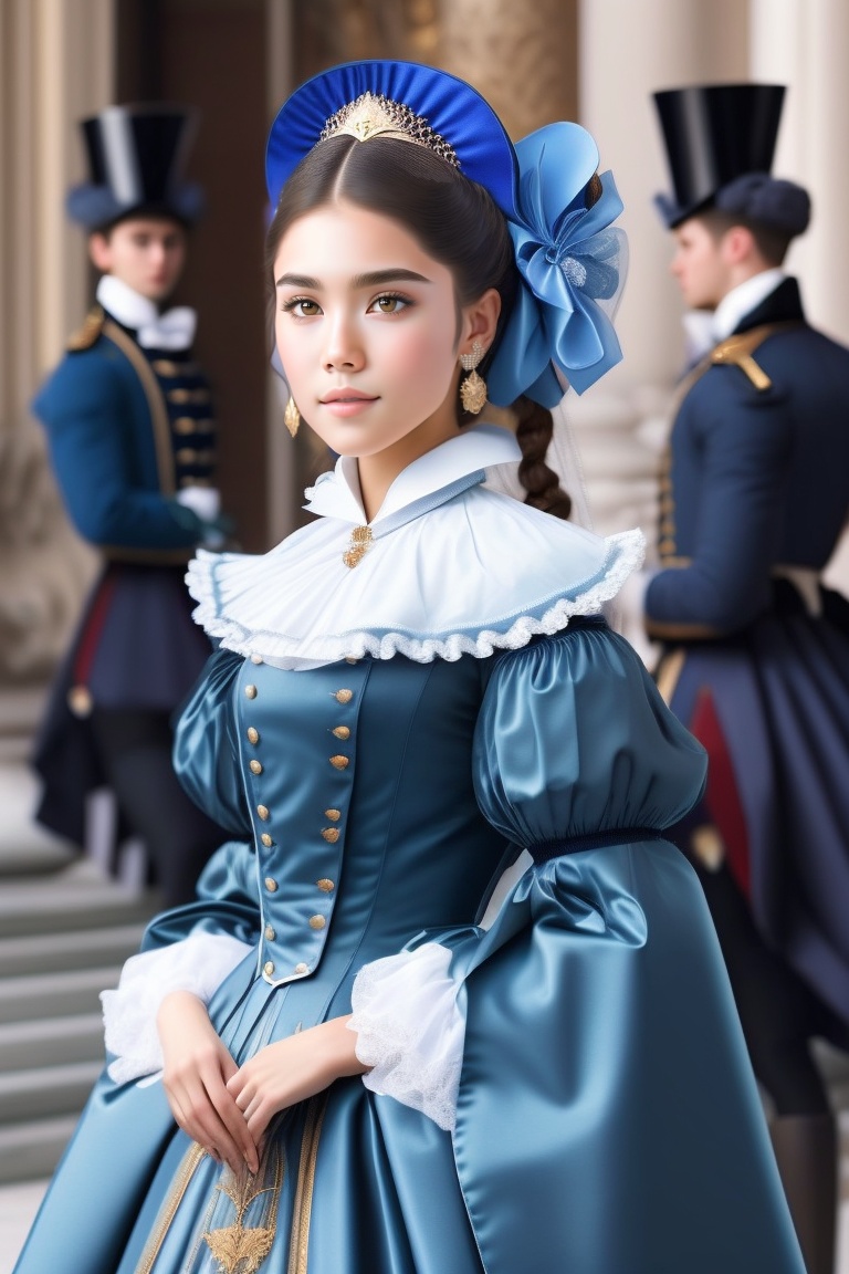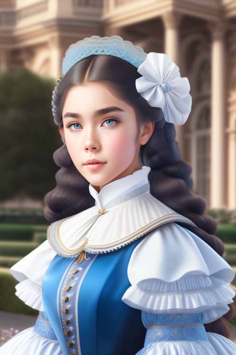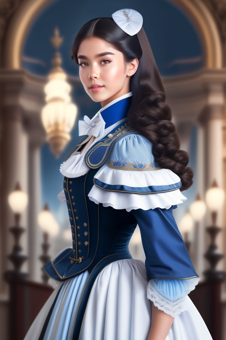 Girl with madison beer's face, blue eyes, is wearing a maid uniform of the 18th century. she is walking in versailles