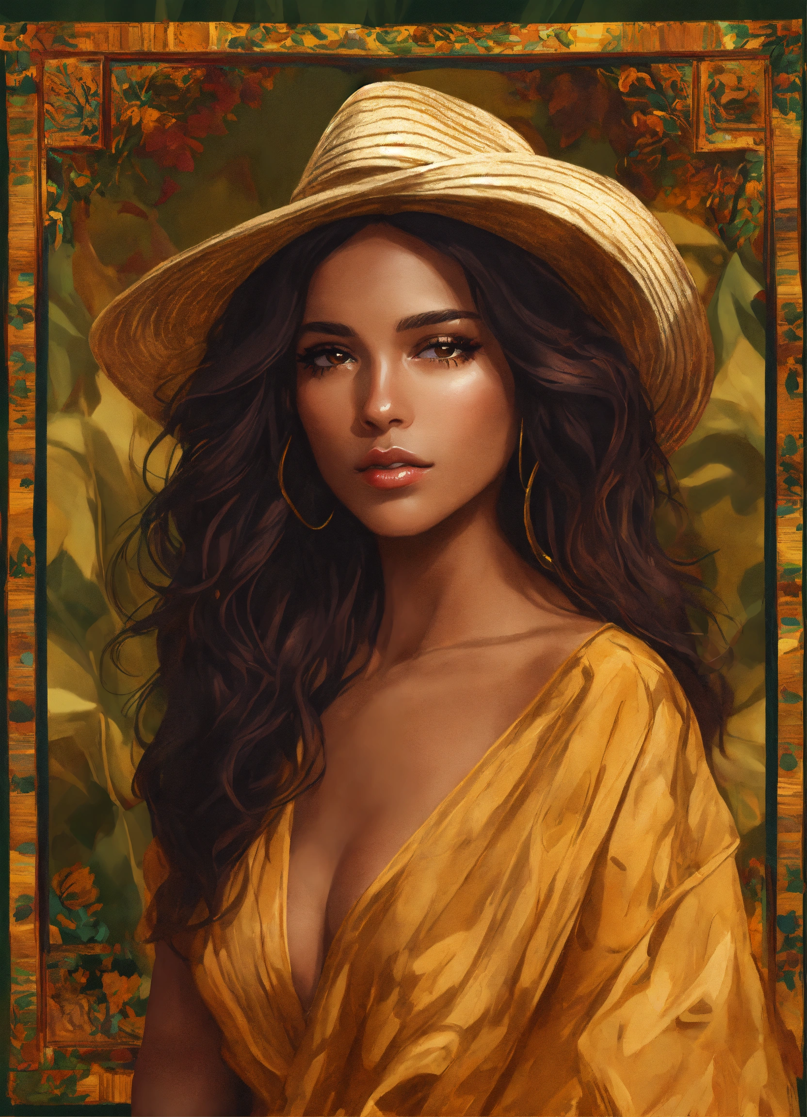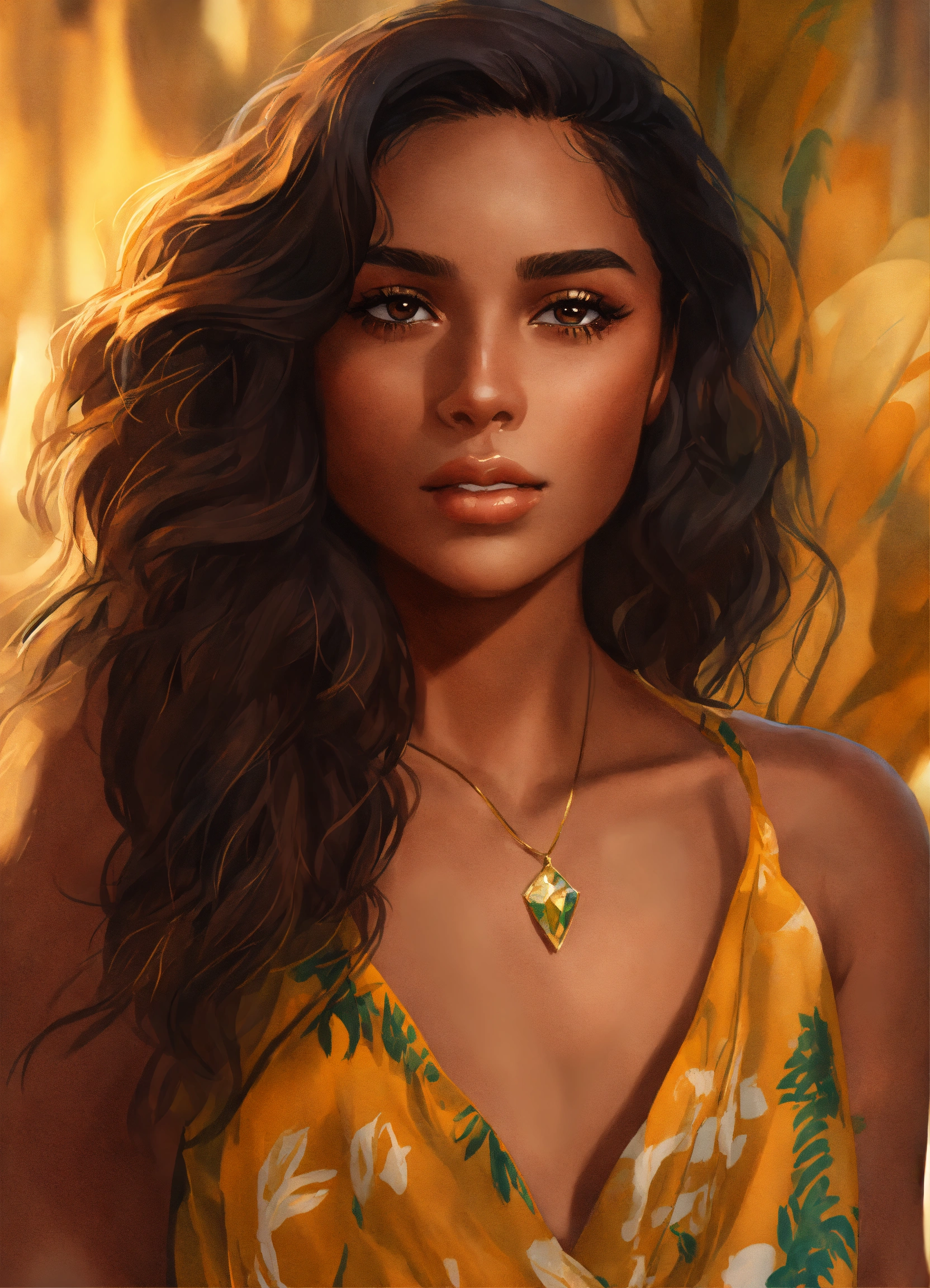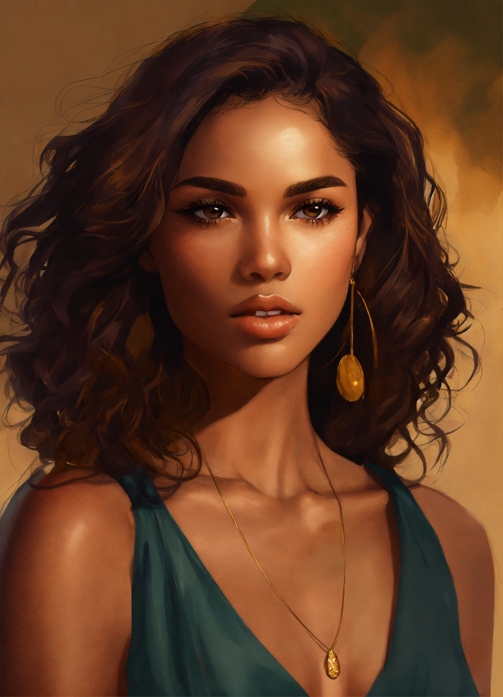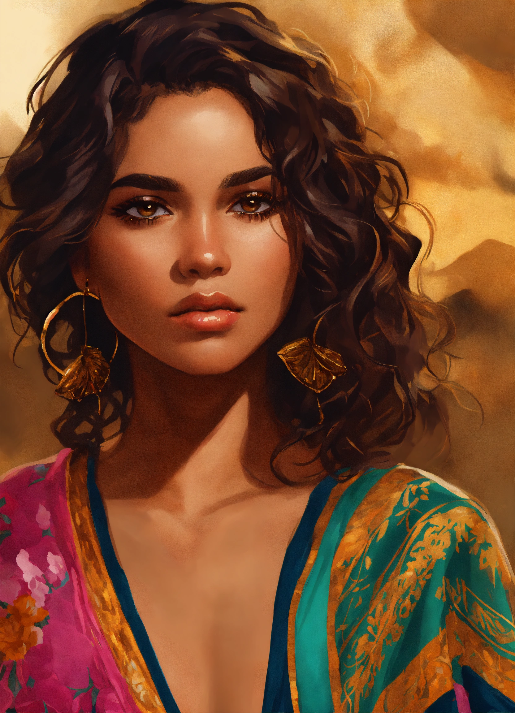 A digital portrait of a brazillian woman with golden tan skin, full lips, and dark brown wavy hair, in a handkerchief top.