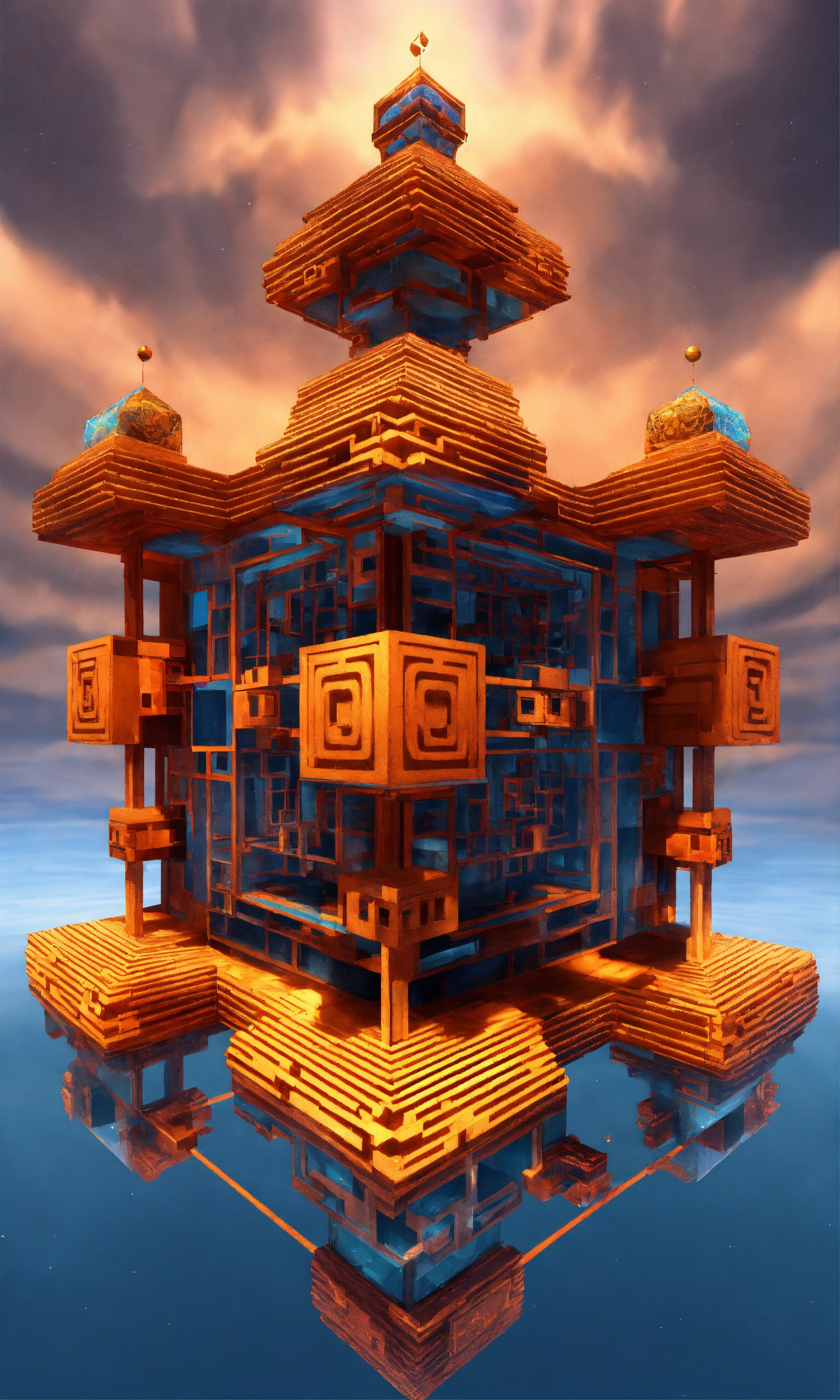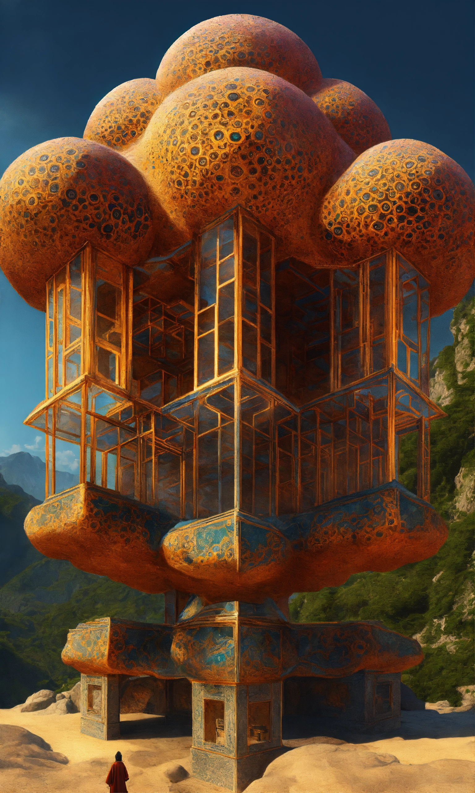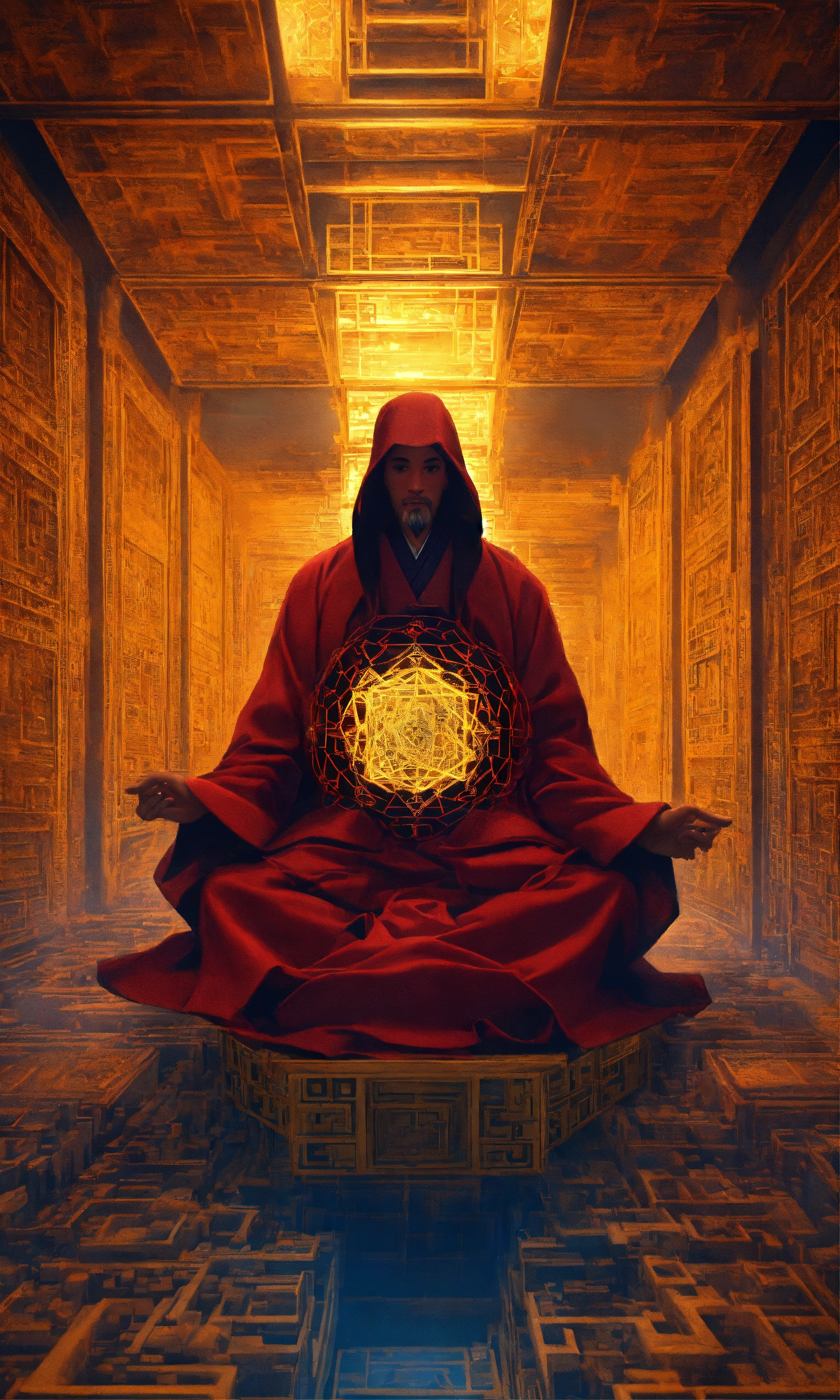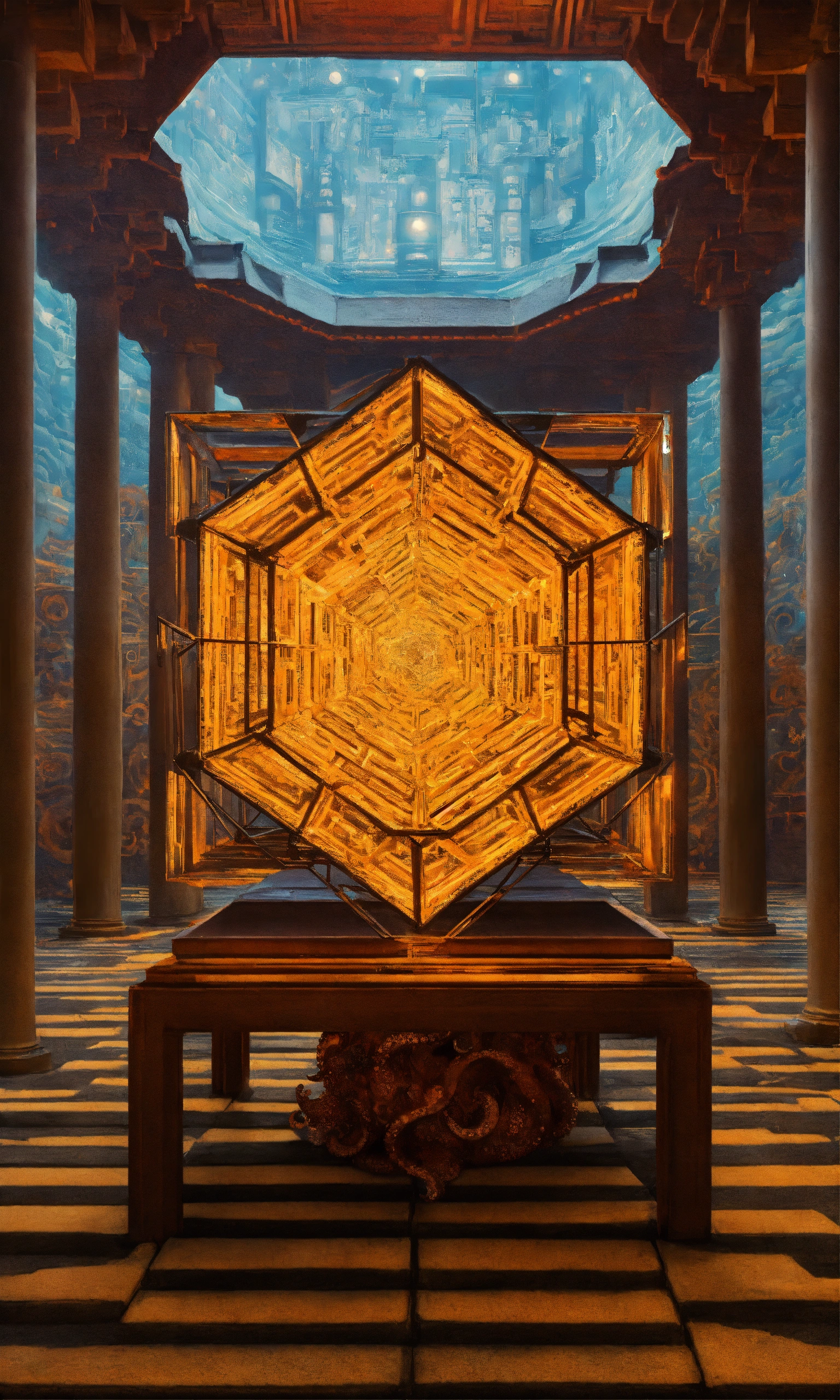 Taoist monk octopus tesseract body fractal three point perspective hypercube melting in each other
