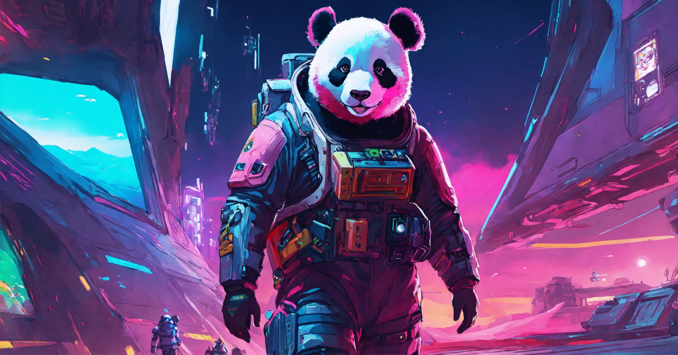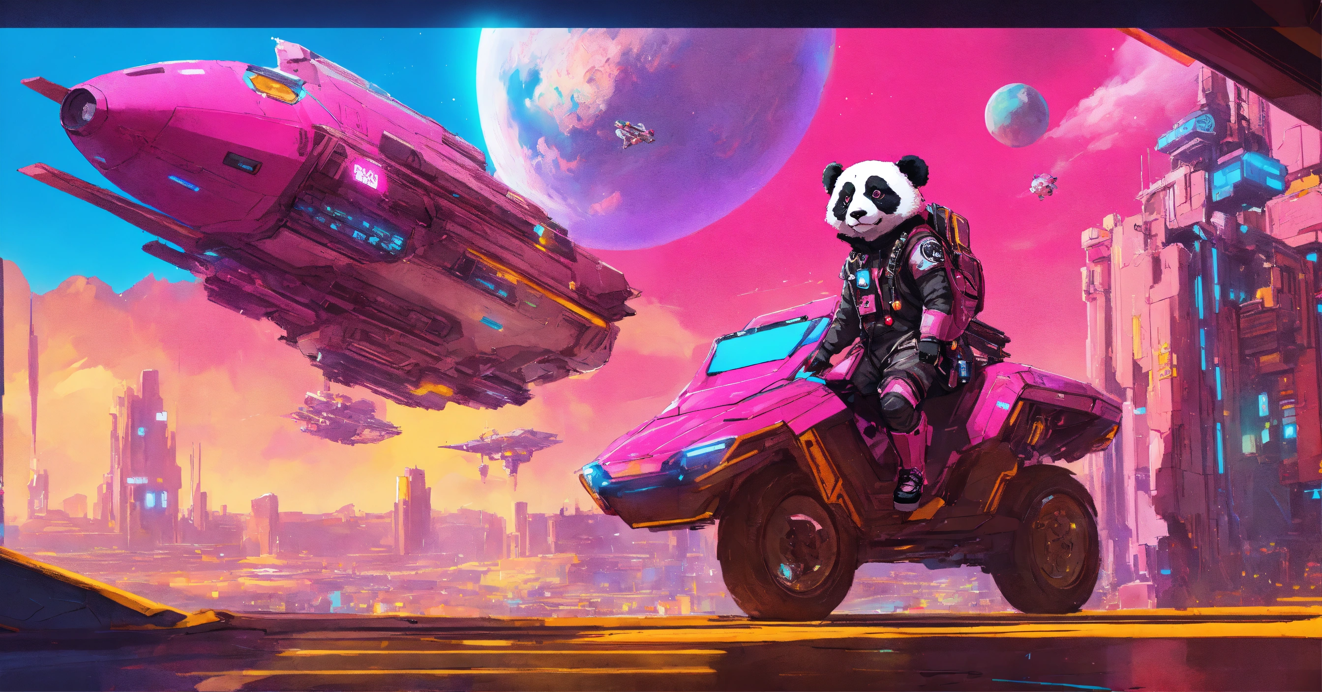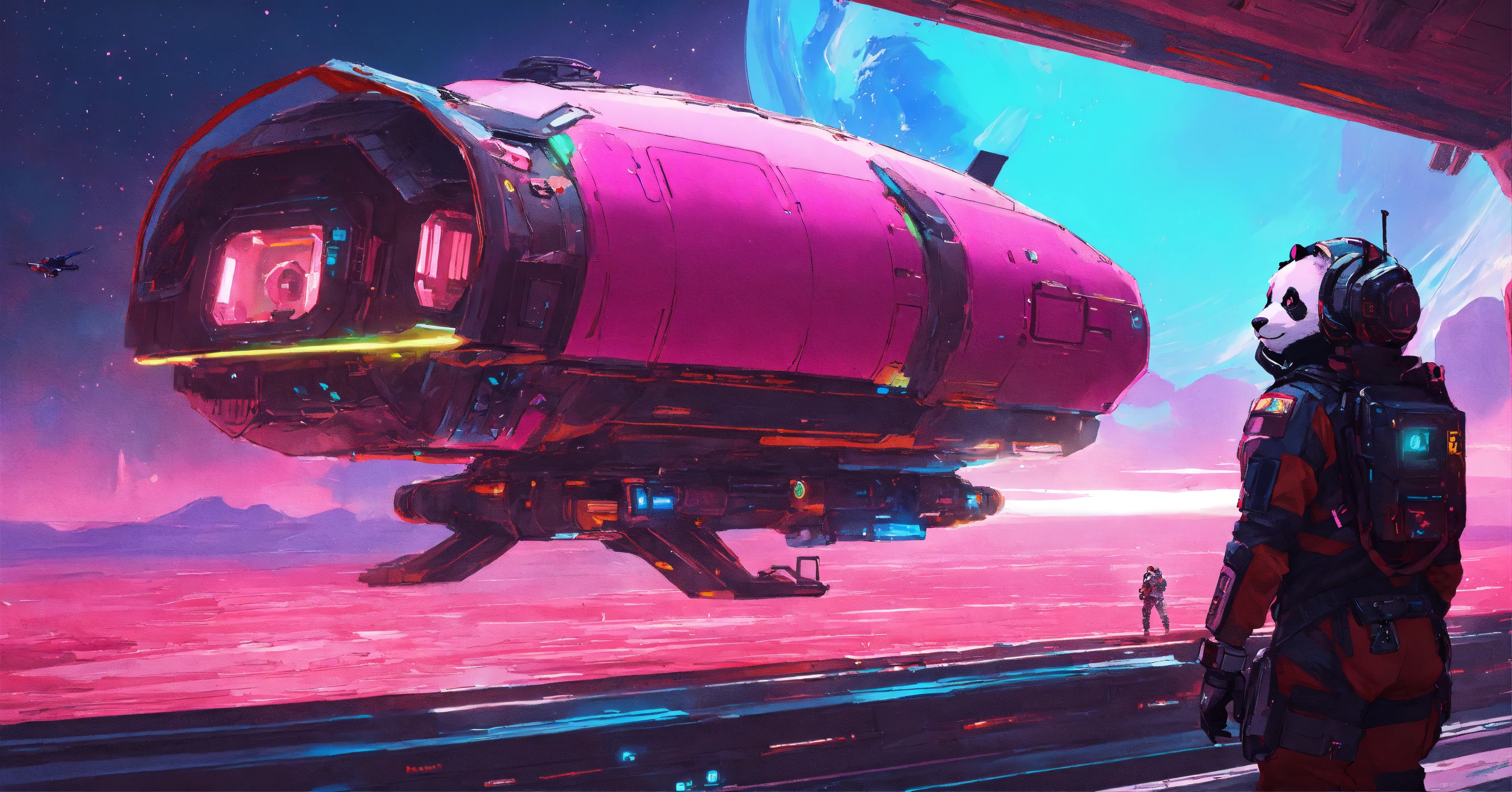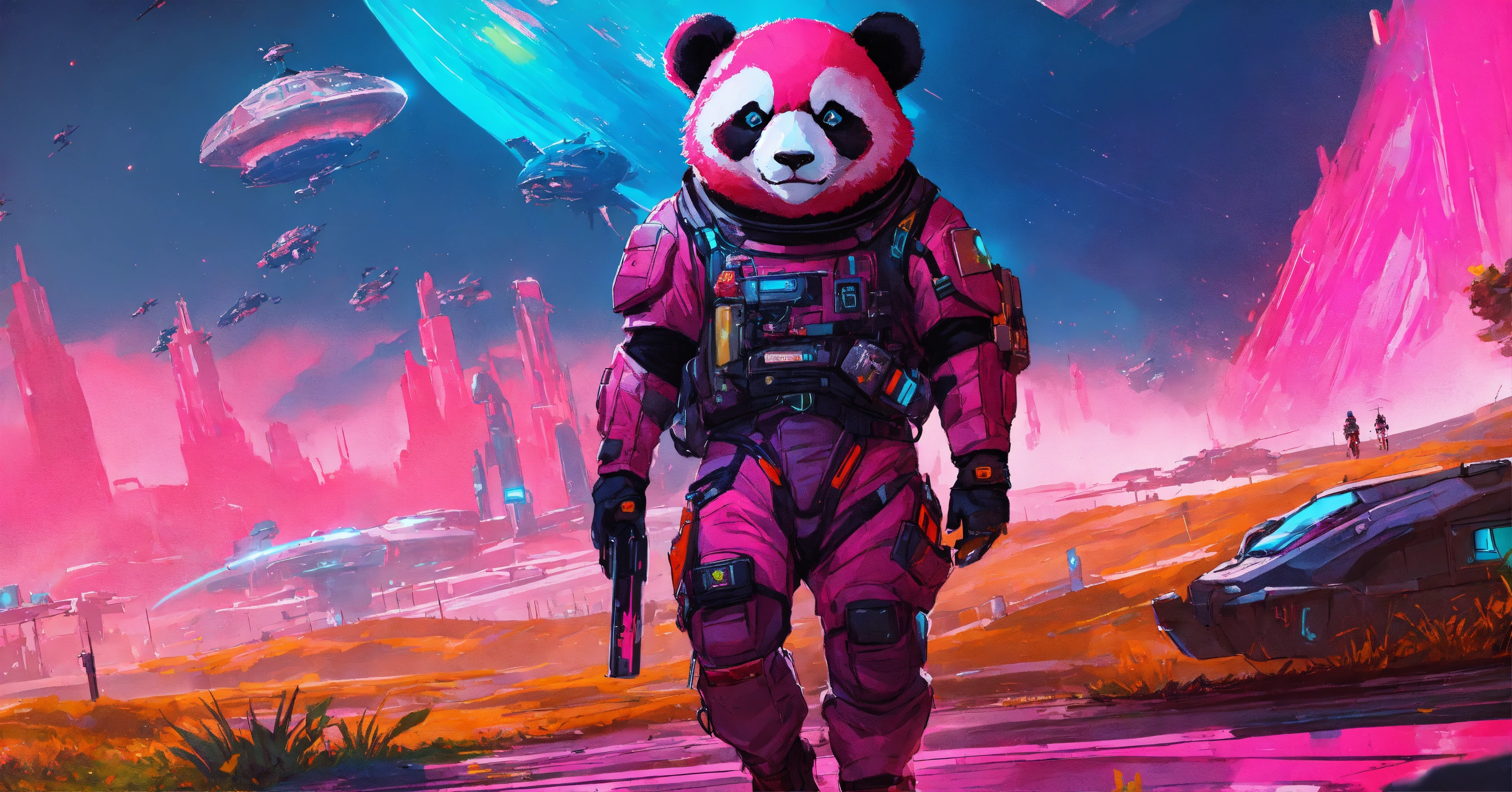 Pink panda in cyberpunk style 2077s, in spacesuit, exiting a spaceship, alien world in the background, character concept design, painting, detailed, vivid, trending on artstation, genshin impact, trending pixiv fanbox, acrylic palette knife, 4k, vibrant colors, devinart, trending on artstation