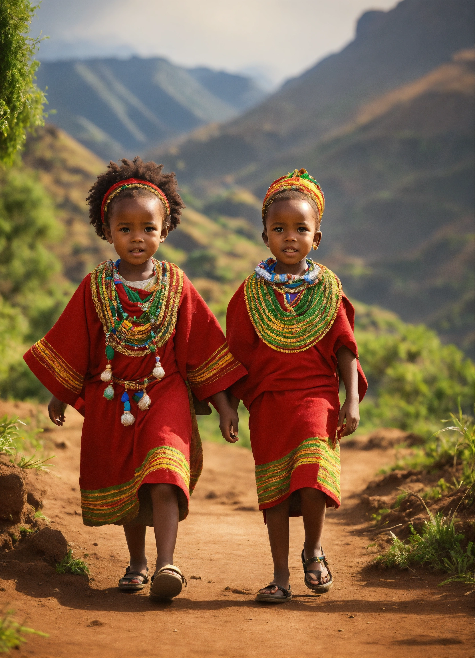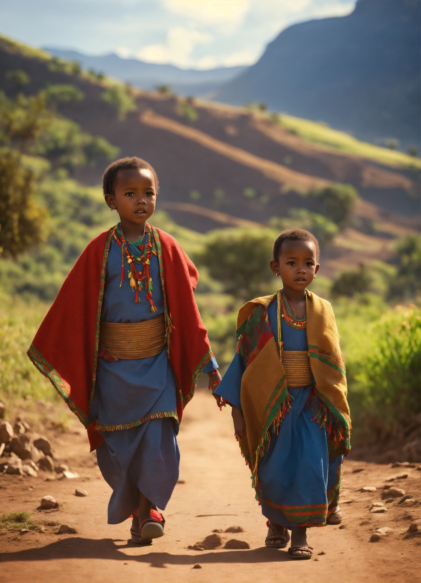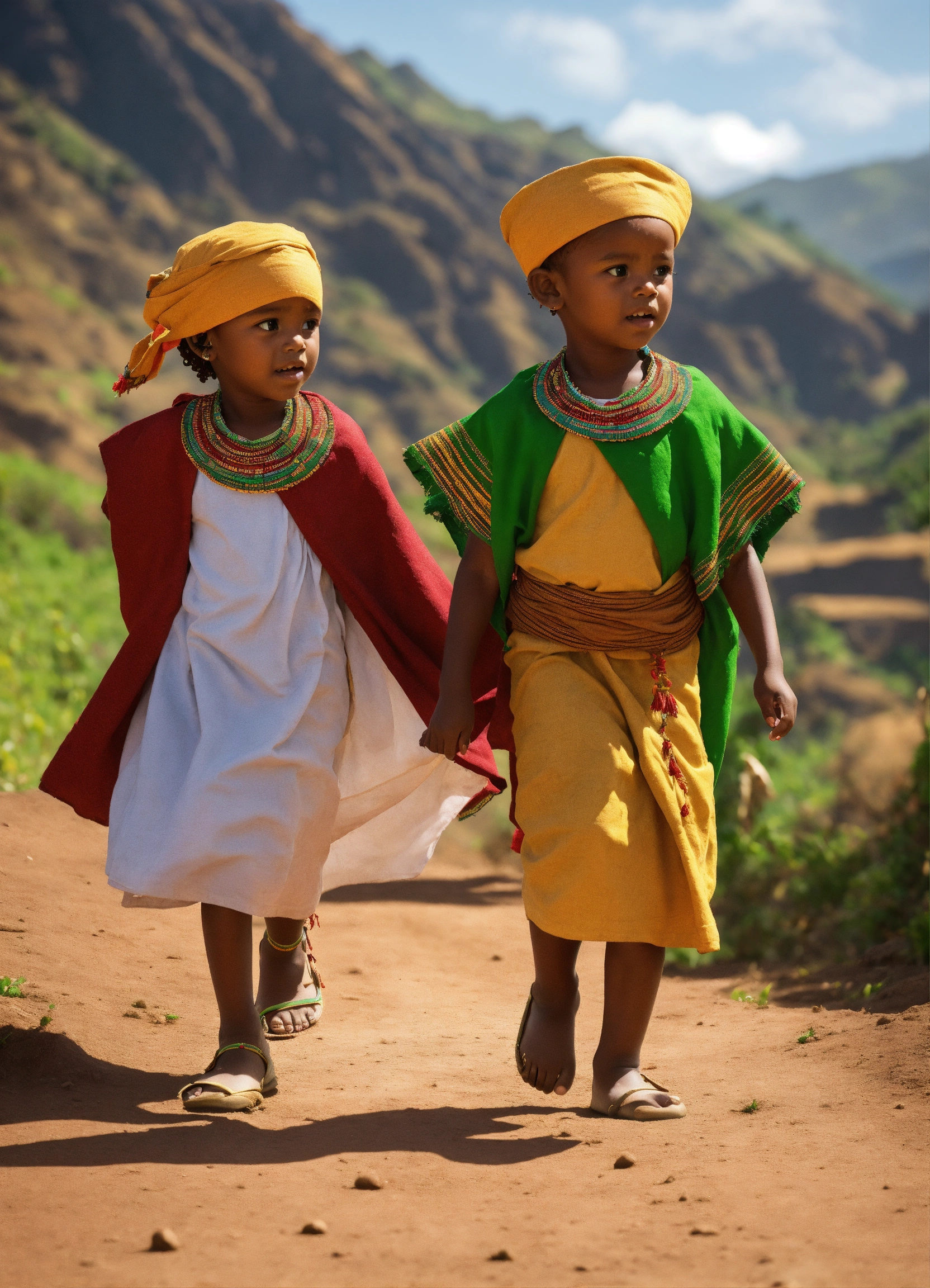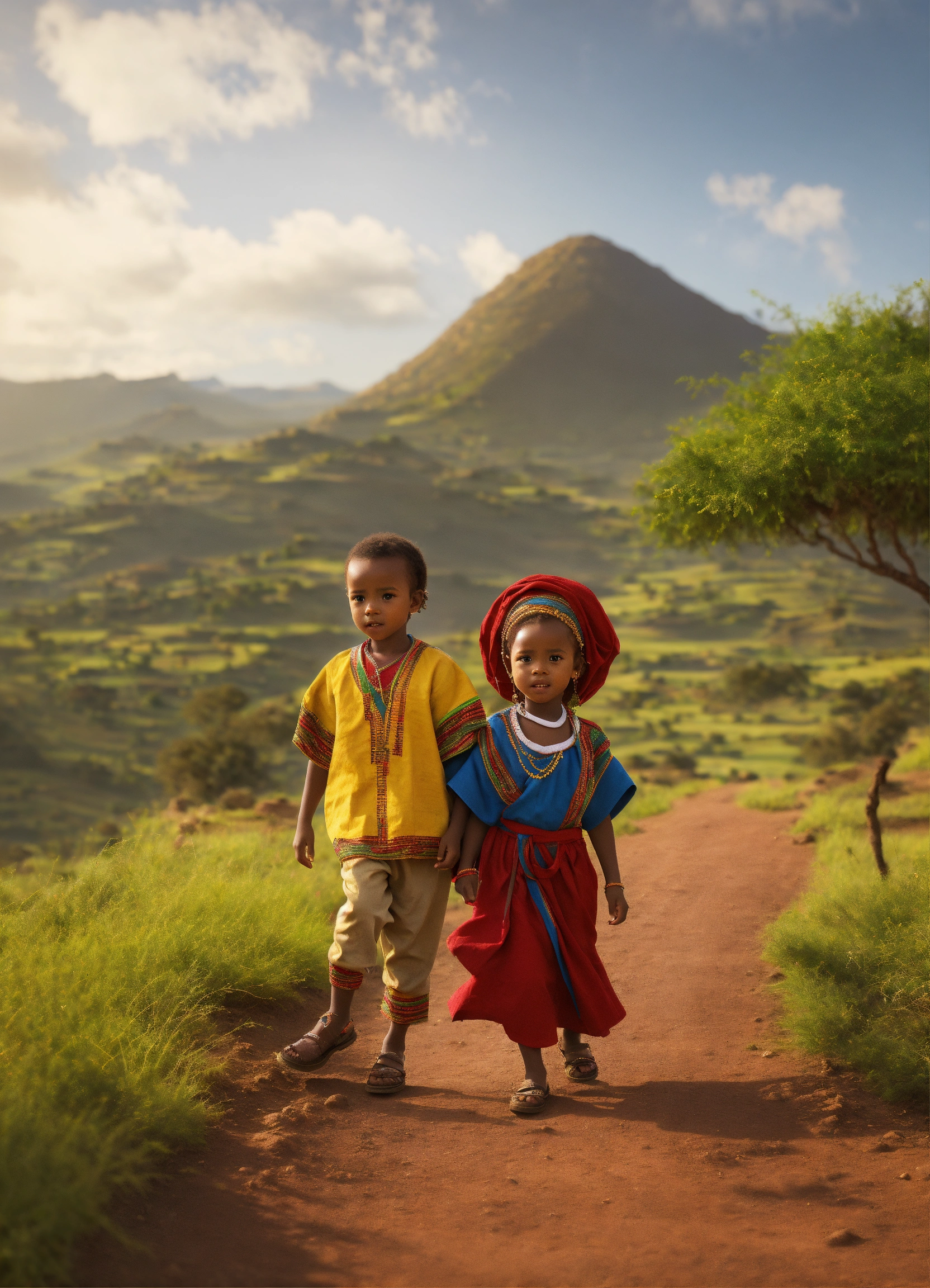 An ethiopian little girl and little boy, wearing ethiopian traditional clothes, walking, located in the majestic mountain range of the ethiopian countryside. hyper-realistic, 8k, ultra hd, pixar style, disney style, cinima 4d, —ar 32