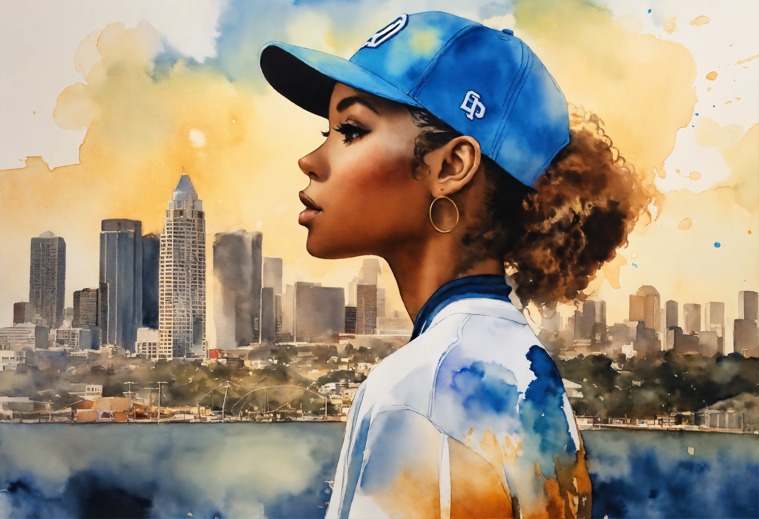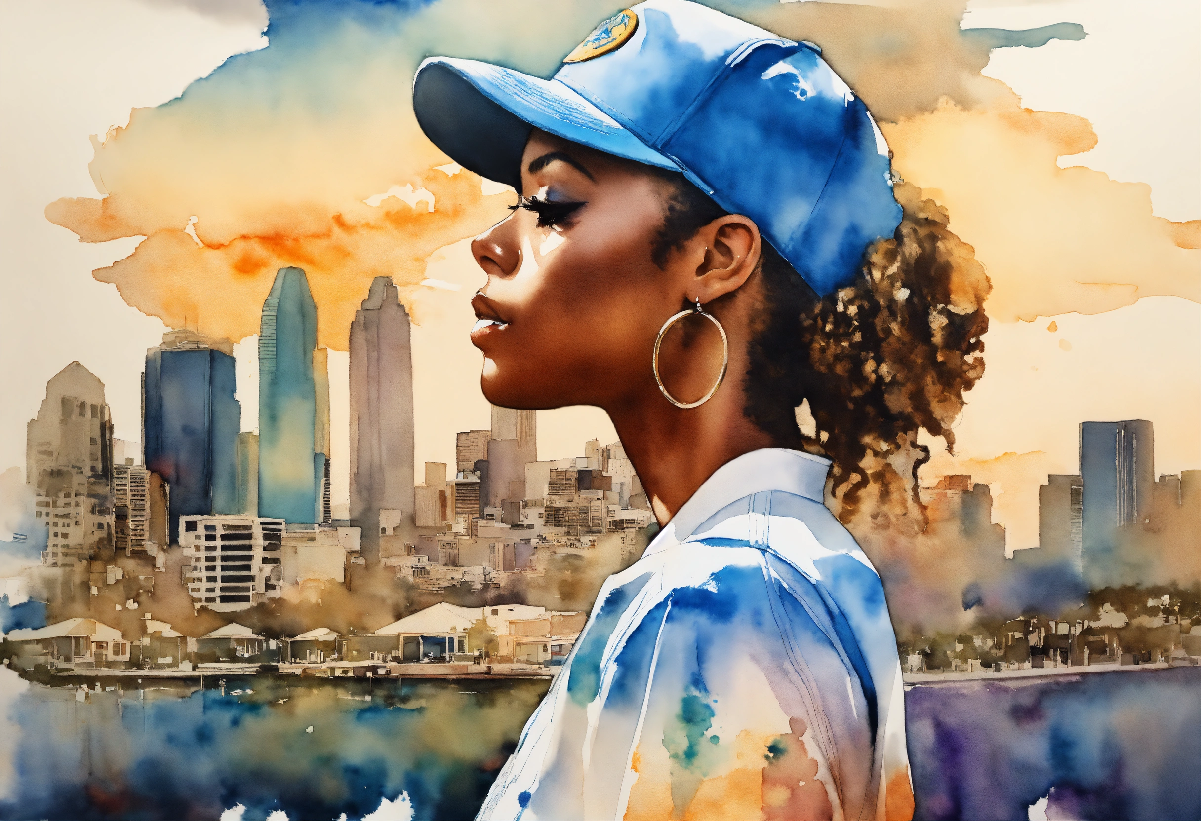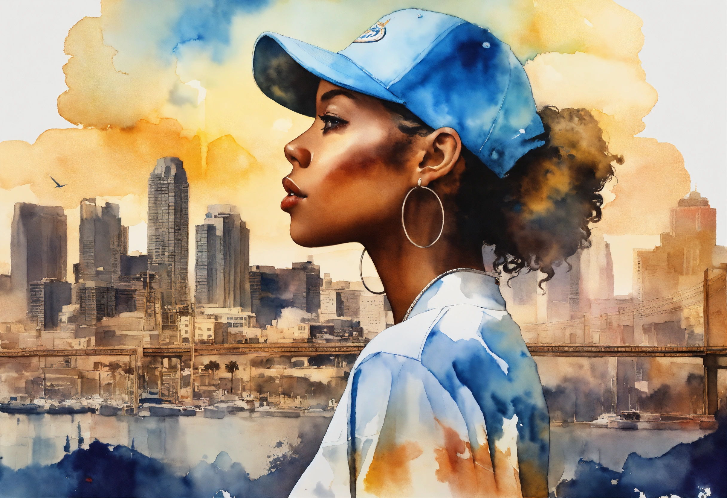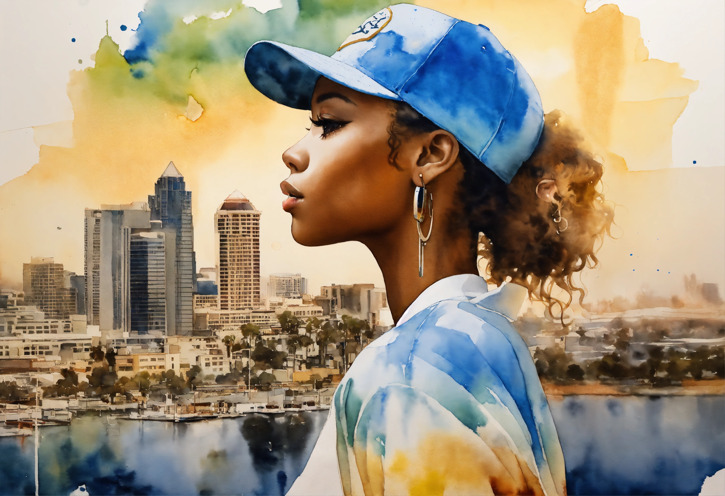 Exquisite watercolor painting on a pure white paper background, where an african american woman with a featureless face, her attire is a double exposure of the san diego, ca sunny skyline. with a snapback baseball hat on over a long low afro puff hairstyle, the city's landmarks become her track suit, merging beautifully double exposed with her clothing with her silhouette at 50% opacity. her silhouette is half the opacity of the background to allow the skyline to be highlighted. the artwork's charm is further enhanced by ethereal colors of the padres current at home uniform represented in the smoke and a dramatic paint splash. double exposure overlay. manga kewpie cartoon style